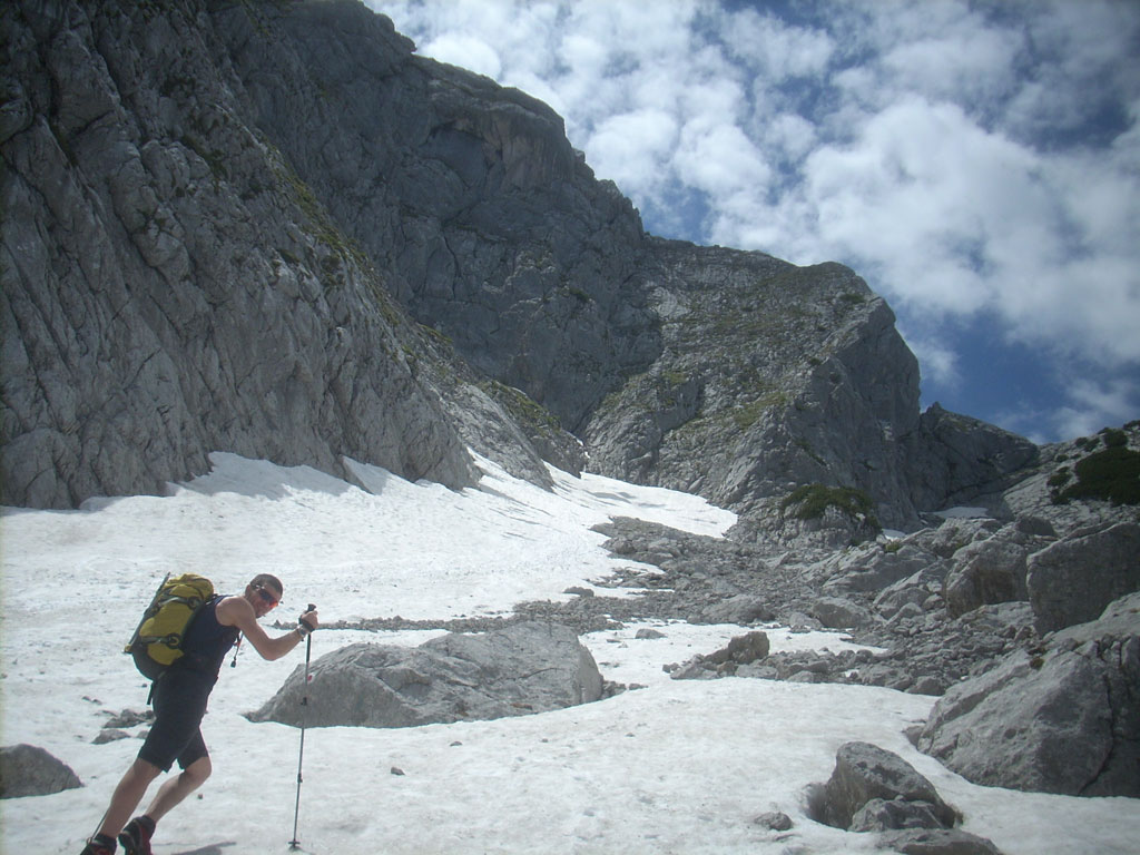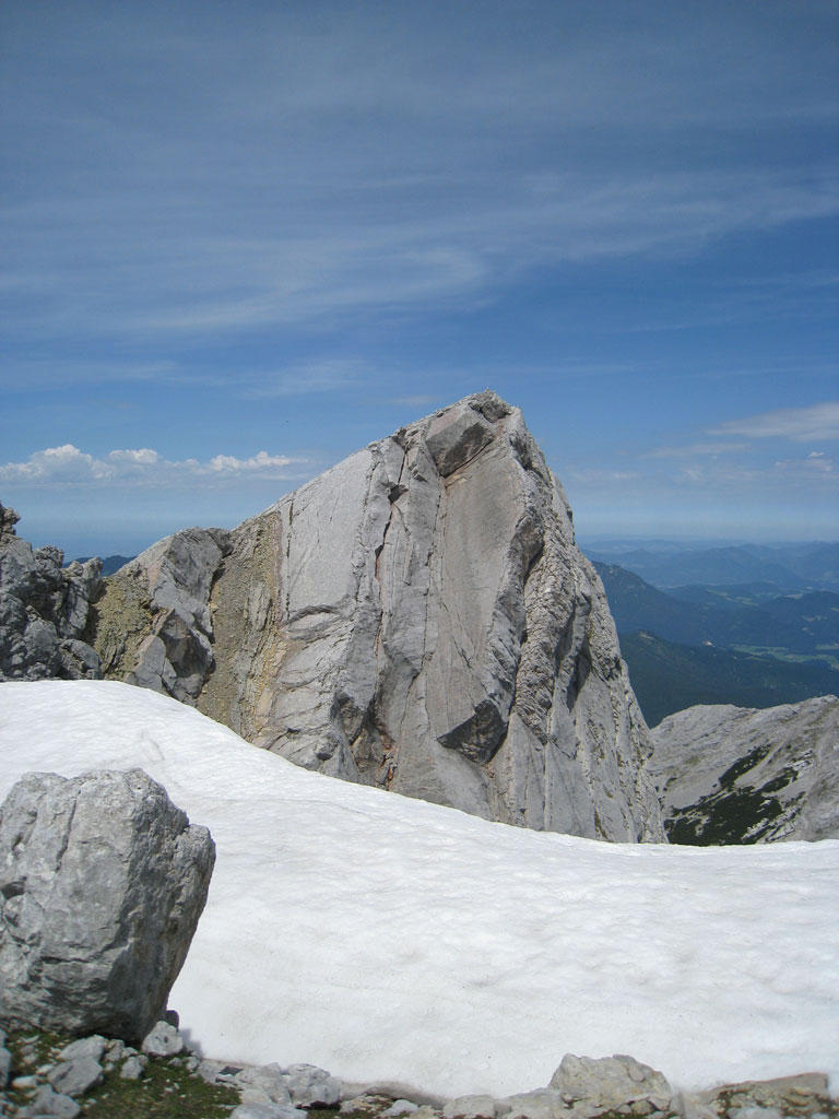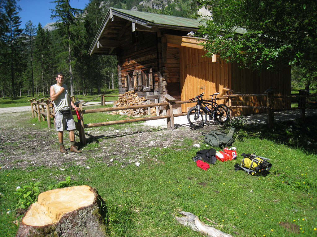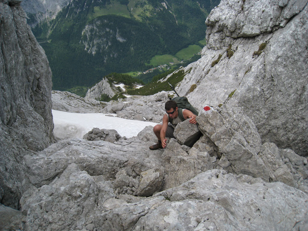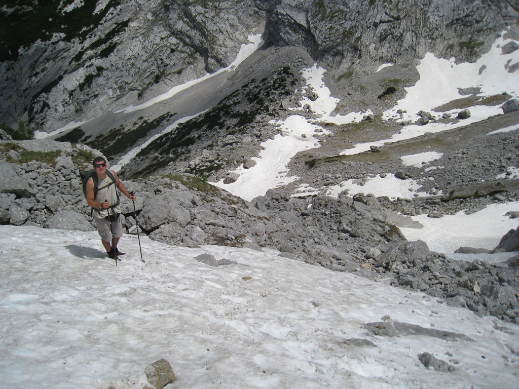 Kombinierte Mountainbike- und Bergtour mit Andi, von Salzburg nach Hintersee auf den Hochkalter via Schönen Fleck, und Abstieg durch das Ofental. Trotz sommerlicher Bedingungen hatten wir uns dazu entschlossen zumindest den Pickel mitzunhemen, um für unangenehme Altschnee- und Firnfelder gut ausgerüstet zu sein. Schlussendlich kamen unsere Pickel zwar nicht zum Einsatz, jedoch fanden wir hin und wieder doch noch ein jede Menge Schnee vor. Aber alles kein Problem, und so genossen wir die herrliche, und an diesem Tag sehr einsame Umgebung.