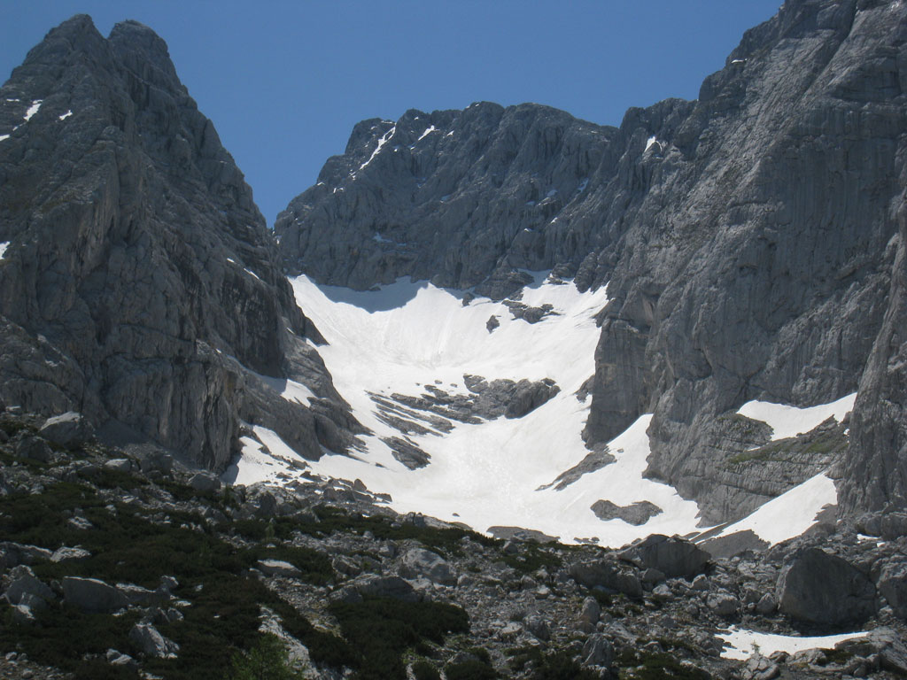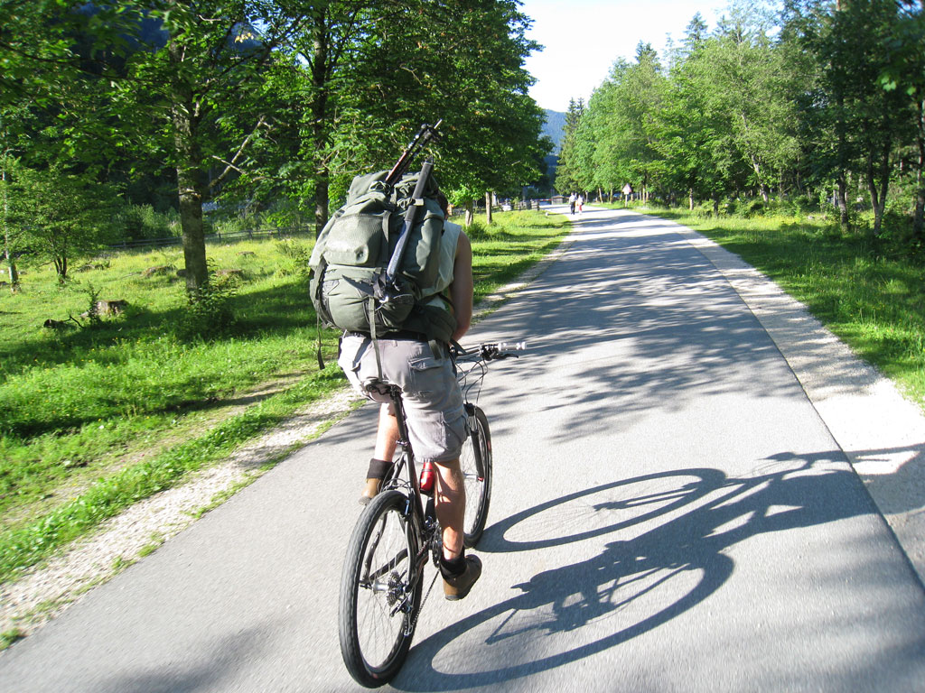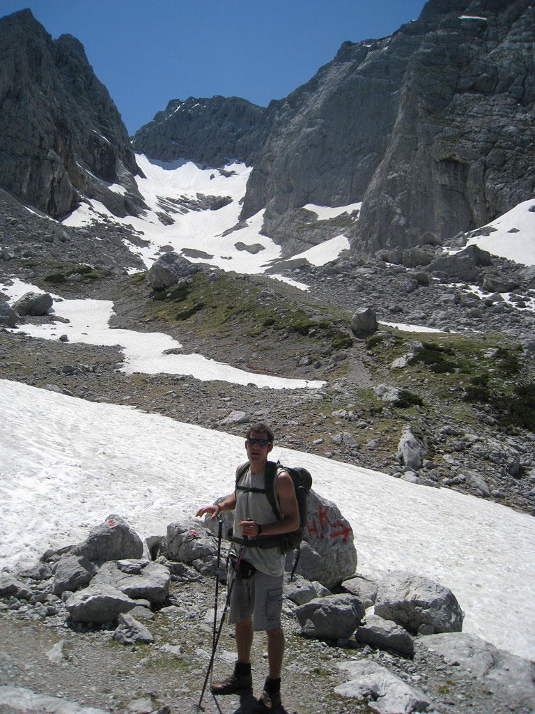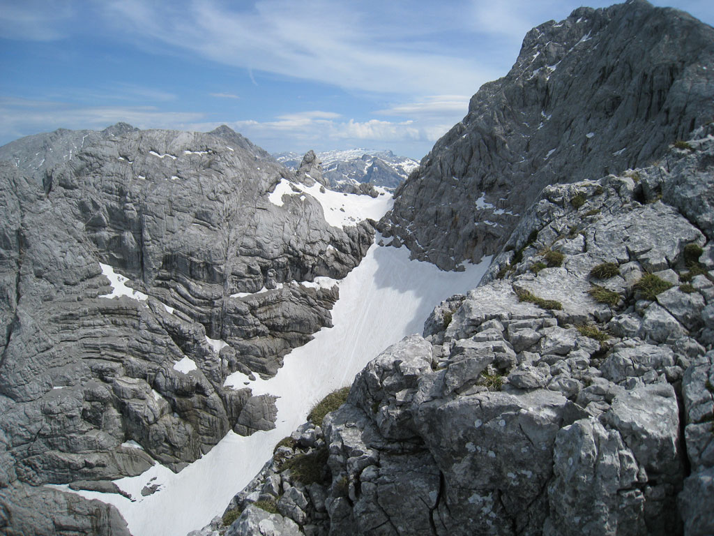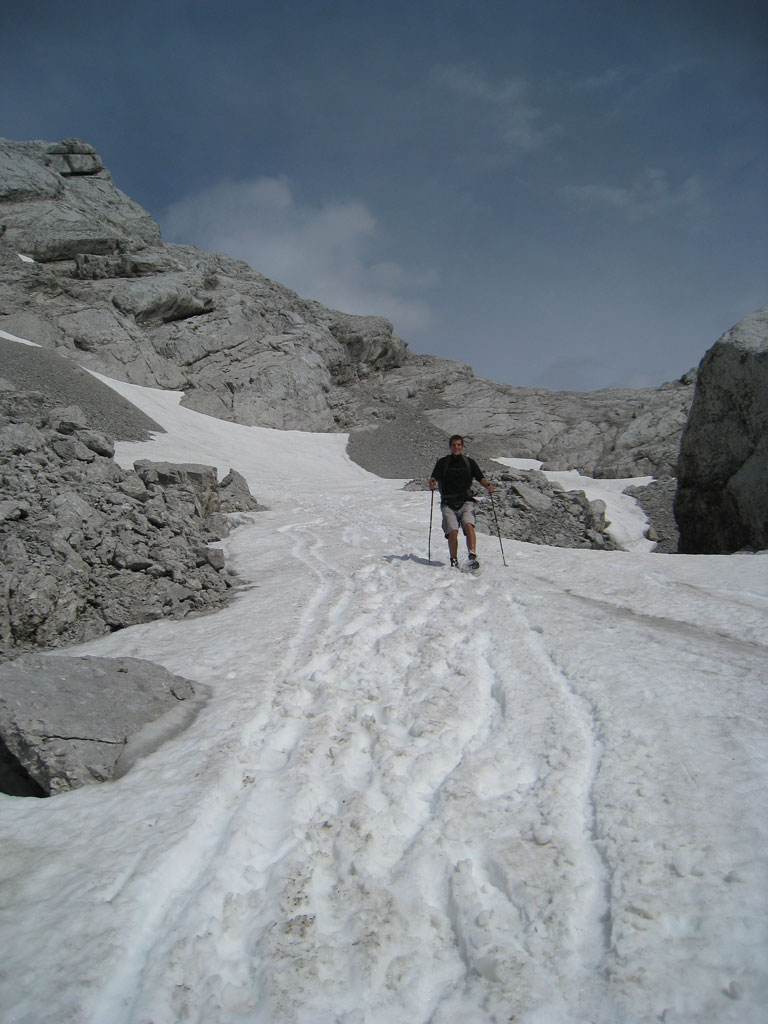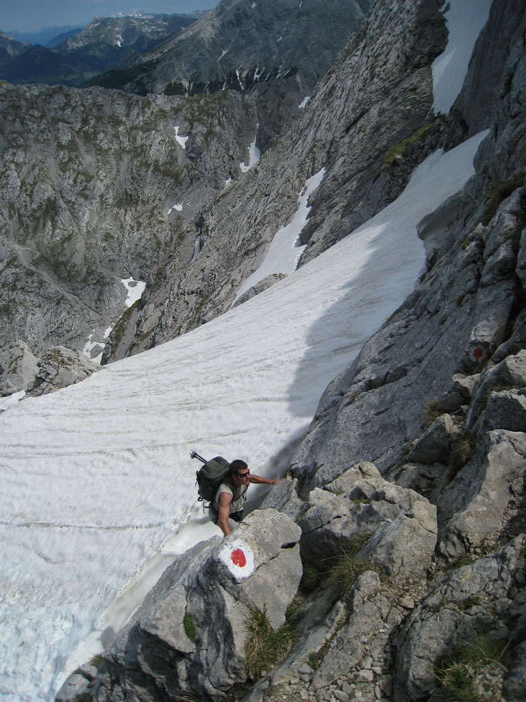 Kombinierte Mountainbike- und Bergtour mit Andi, von Salzburg nach Hintersee auf den Hochkalter via Schönen Fleck, und Abstieg durch das Ofental. Trotz sommerlicher Bedingungen hatten wir uns dazu entschlossen zumindest den Pickel mitzunhemen, um für unangenehme Altschnee- und Firnfelder gut ausgerüstet zu sein. Schlussendlich kamen unsere Pickel zwar nicht zum Einsatz, jedoch fanden wir hin und wieder doch noch ein jede Menge Schnee vor. Aber alles kein Problem, und so genossen wir die herrliche, und an diesem Tag sehr einsame Umgebung.