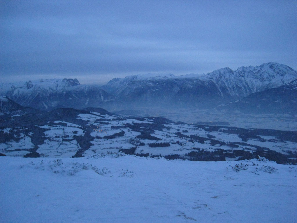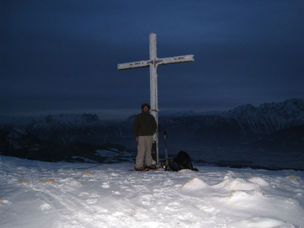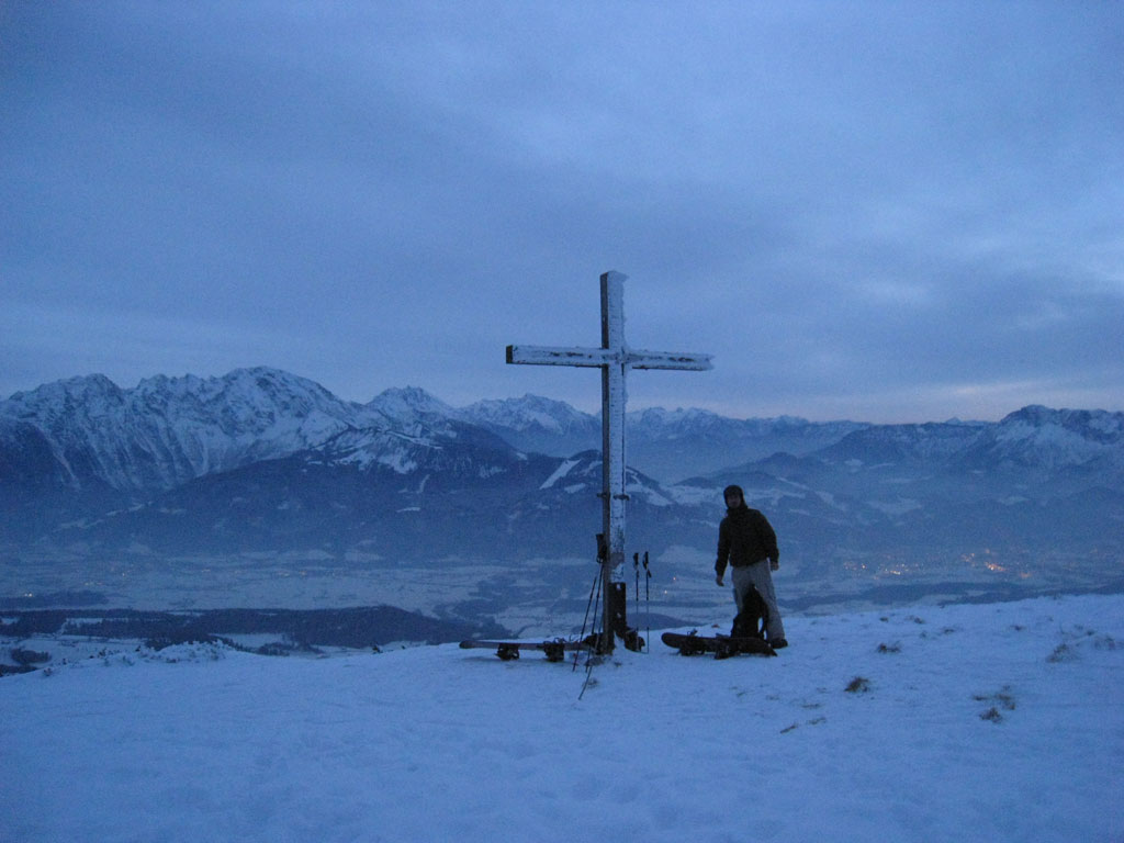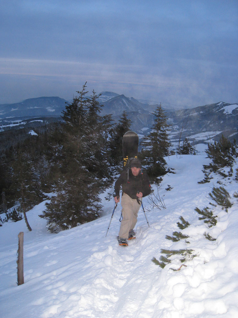 Am späten Nachmittag dieses sehr sonnigen Tages brachen Chris und ich zu einer Schneeschuh/Snowboardtour auf den Schlenken auf. Die durchaus solide Schneedecke beim Aufstieg ließ auf eine vielversprechende Abfahrt hoffen, jedoch rumpelnden wir im Dunklen mit unsern Boards über mehr Steine und Geröll bis zum Ausgangspunkt zurück als uns lieb war. Chris brachte in den darauffolgenden Tagen sein Board zum Service und musste sich einige blöde Fragen wegen der riesigen Löcher und Schrammen im Belag gefallen lassen.