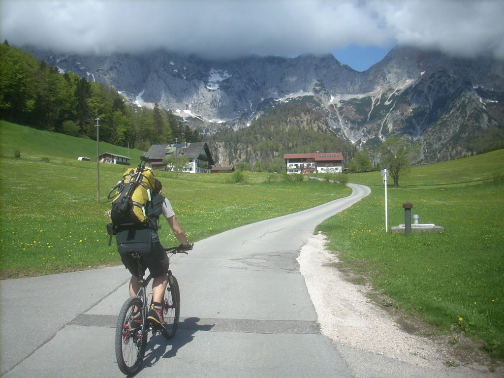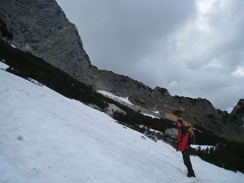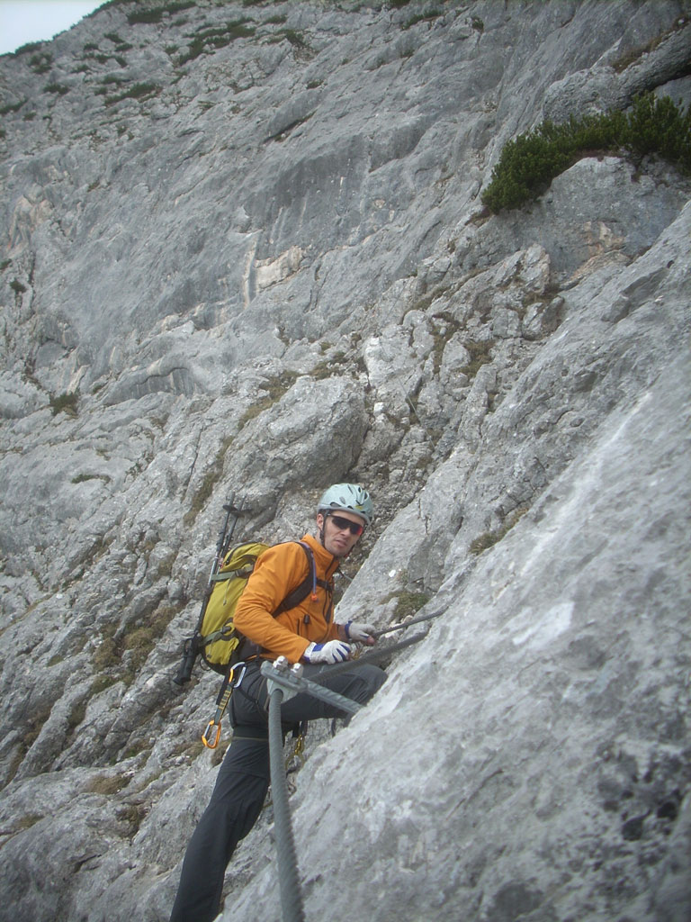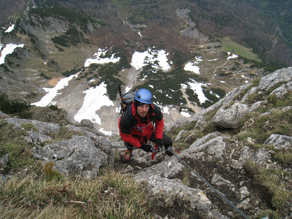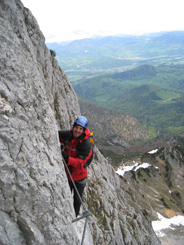 Kombinierte Mountainbike- und Bergtour mit Andi, von Salzburg nach Marktschellenberg und zum Roßboden, weiter über Scheibenkaser und den Hochthron-Klettersteig auf den Berchtesgadener Hochthron, und retour über das Störhaus. Unser zweiter Anlauf auf den Hochthron Klettersteig (nach unserem ersten Versuch im Jahr 2008) gestaltete sich als wahrlich beeindruckend, zumal wir den gesamten Klettersteig, ja scheinbar den ganzen Berg für uns alleine hatten. Diese unerwartete Einsamkeit lässt sich vermutlich auf den Umstand zurückführen, dass an diesem 9. Mai Muttertag war. Außerdem haben die noch etwas frischen Temperaturen und Restschneefelder vermutlich auch das Ihrige dazu getan. Die Kletterei erfüllte unsere Erwartungen voll und ganz, nicht zuletzt weil im oberen Wandteil plötzlich einsetzender Schneefall (!) vermeintlich einfache Passagen innerhalb weniger Minuten in äußerst rutschige und glatte Kletterstellen verwandelte. Nachdem wir schließlich wieder in Salzburg angekommen waren, bildeten einige Kebab und Bier einen angemessenen Abschluss dieser Tour.