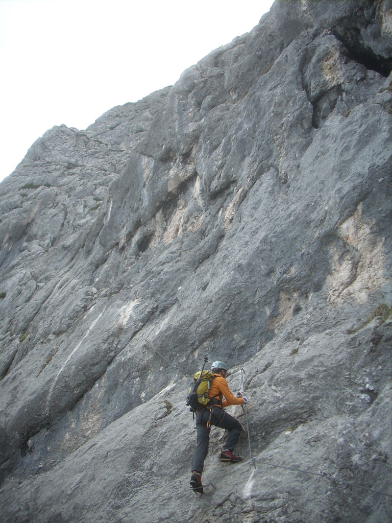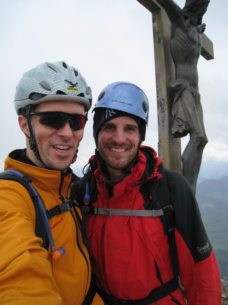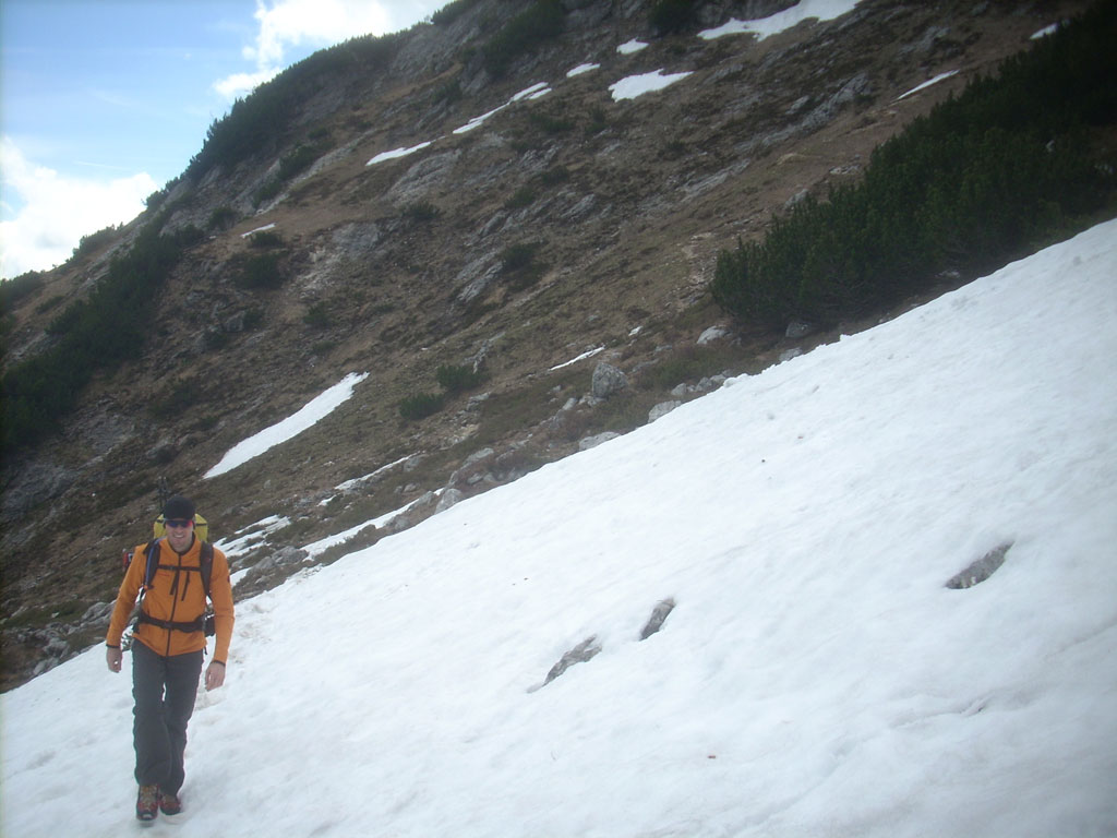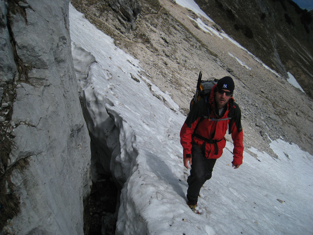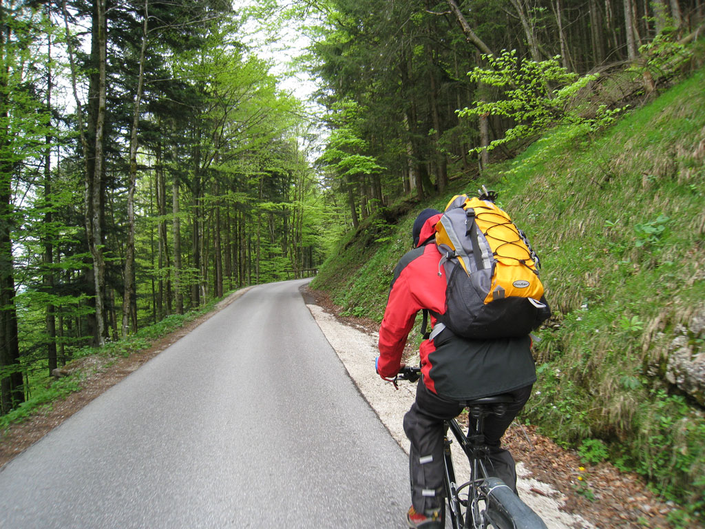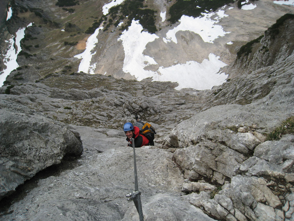 Kombinierte Mountainbike- und Bergtour mit Andi, von Salzburg nach Marktschellenberg und zum Roßboden, weiter über Scheibenkaser und den Hochthron-Klettersteig auf den Berchtesgadener Hochthron, und retour über das Störhaus. Unser zweiter Anlauf auf den Hochthron Klettersteig (nach unserem ersten Versuch im Jahr 2008) gestaltete sich als wahrlich beeindruckend, zumal wir den gesamten Klettersteig, ja scheinbar den ganzen Berg für uns alleine hatten. Diese unerwartete Einsamkeit lässt sich vermutlich auf den Umstand zurückführen, dass an diesem 9. Mai Muttertag war. Außerdem haben die noch etwas frischen Temperaturen und Restschneefelder vermutlich auch das Ihrige dazu getan. Die Kletterei erfüllte unsere Erwartungen voll und ganz, nicht zuletzt weil im oberen Wandteil plötzlich einsetzender Schneefall (!) vermeintlich einfache Passagen innerhalb weniger Minuten in äußerst rutschige und glatte Kletterstellen verwandelte. Nachdem wir schließlich wieder in Salzburg angekommen waren, bildeten einige Kebab und Bier einen angemessenen Abschluss dieser Tour.