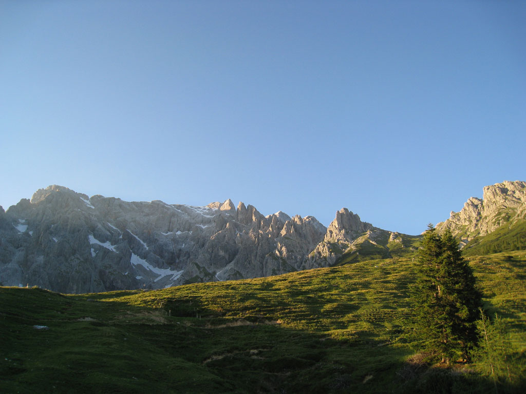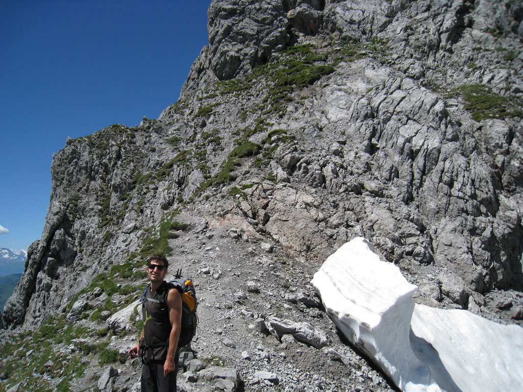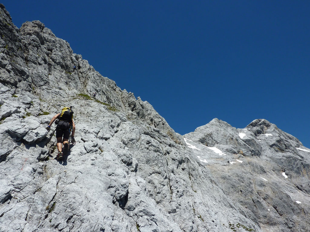 Klettersteig- und Bergtour mit Andi, vom Dientner Sattel über die Erichhütte und den Königjodler-Klettersteig auf das Matrashaus, Abstieg über das Birgkar und zurück zum Parkplatz Dientner Sattel. Der Königsjodler ist mit seiner nahezu 1700 Klettermeter langen Steiganlage eine der spannendsten und schönsten Klettersteige in den Berchtesgadener Alpen. Somit war es nur eine Frage der Zeit, bis wir dem Hochkönig unser Aufwartung machen würden. Trotz kurzer Unentschlossenheit schafften wir es am späten Vormittag mit dem Auto von Andis Mami Richtung Dienten aufzubrechen, wobei uns auf der Tauernautobahn Anne und Chris überholten, die sich an diesem herrlichen Tag der Pilzsuche widmeten. Am frühen Nachmittag stiegen wir nach kurzer Rast und einer lustigen Begegnung mit deutschen ‚Bergkameraden‘ (… geht’s hier noch weiter so zum Hochkönig?) ein und stellten bald fest, dass wir mit Ausnahme einer kleinen Gruppe, den ganzen Steig für uns alleine hatten. Dies, ein wolkenloser Himmel und trockener Fels bescherten uns ein vermeintliches Tourenhighlight in diesem Jahr. Nach einer kleiner Rast am Matrashaus und einem ‚Hubschrauberangriff‘ stiegen wir über das Birgkar ab, was aus Erfahrung ein nicht zu unterschätzendes Unterfangen (Steinschlag!) darstellt. Trotz eines schmerzvollen Ausrutscher auf einem Restschneefeld meinerseits erreichten wir schnell und sicher wieder den Parklatz und traten zufrieden die Heimreise an.