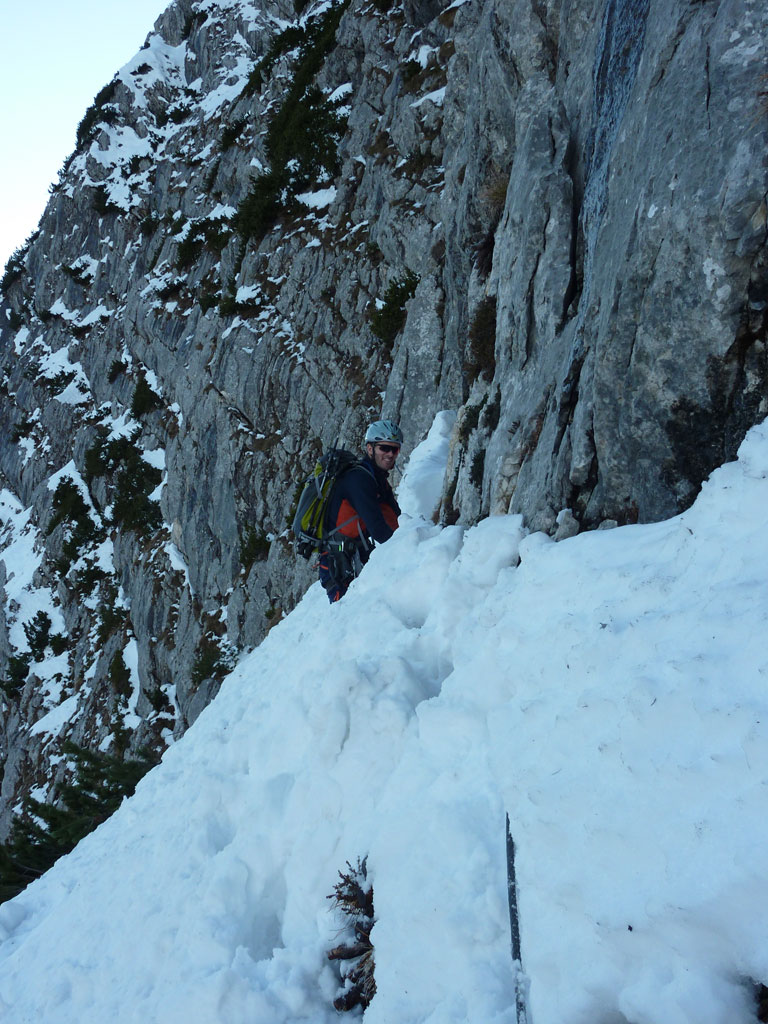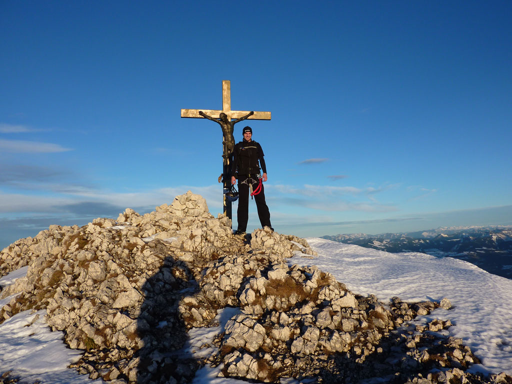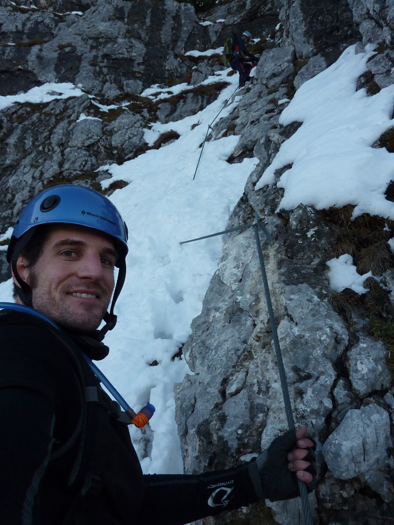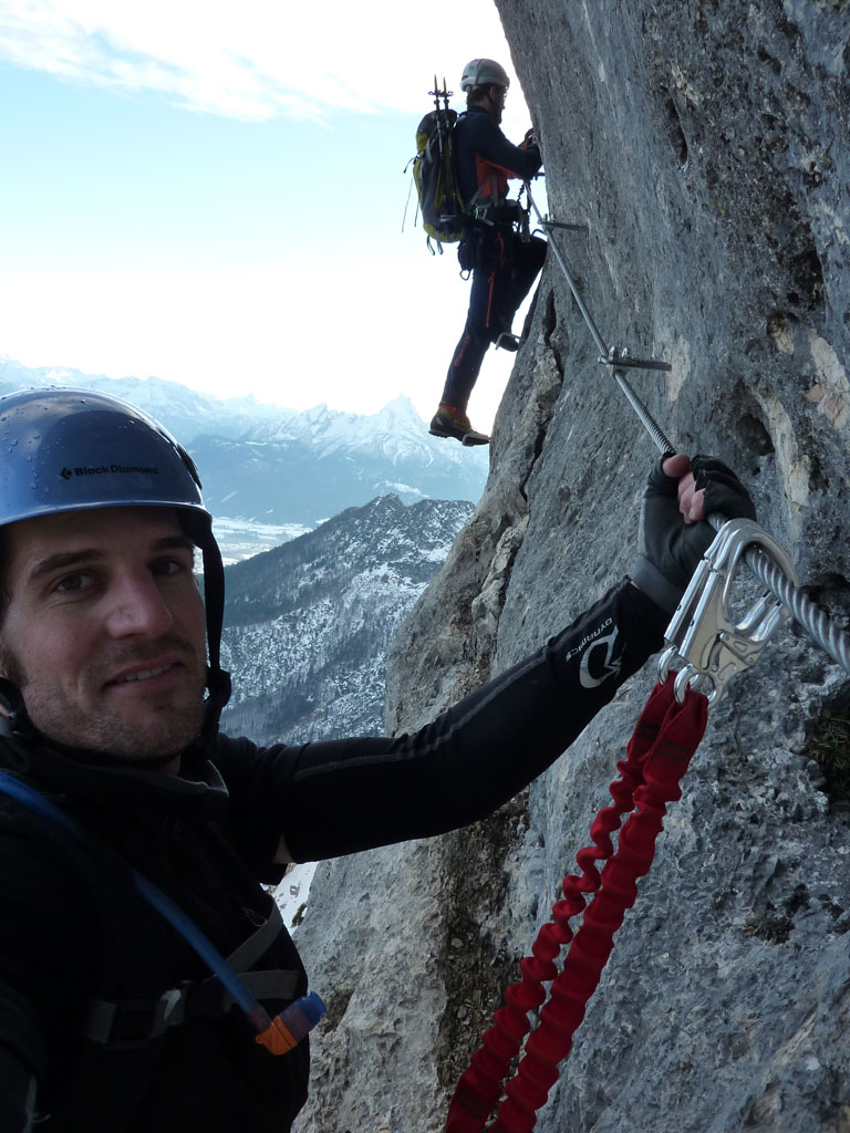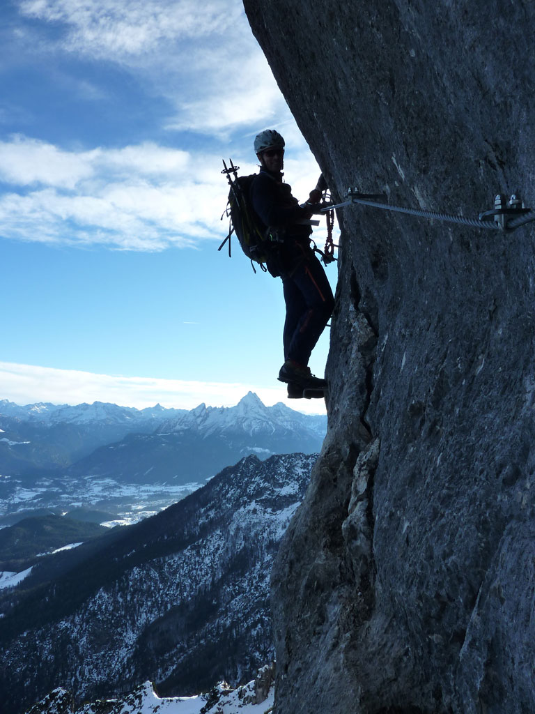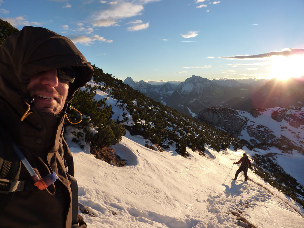 Winterliche Berg- und Klettersteigtour mit Andi vom Roßboden über den Scheibenkaser und den Hochthron-Klettersteig auf den Berchtesgadener Hochthron, retour über das Störhaus. Trotz einer dichten Schneedecke beim Zustieg, war die Wand weitestgehend schneefrei und verhältnismässig trocken. Am Gipfel wurden wir mit einem herrlichen Sonnenuntergang belohnt und traten in der Dämmerung den Rückweg an.