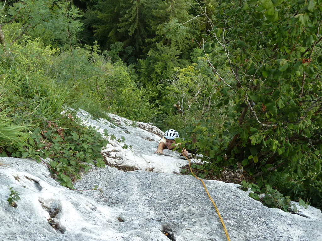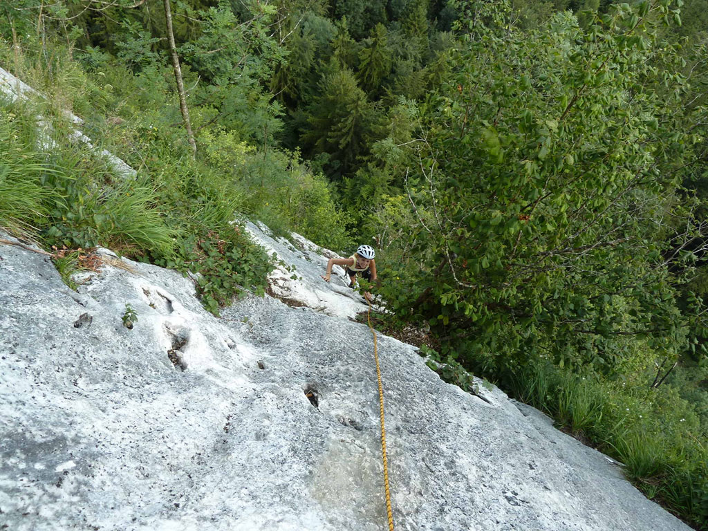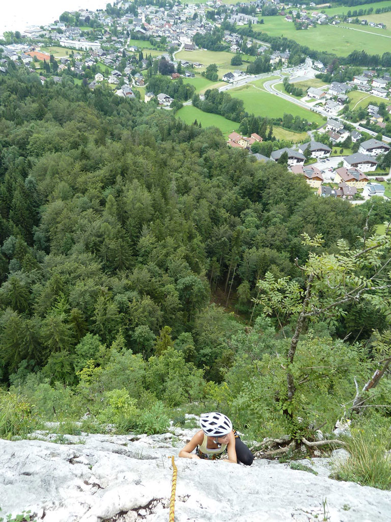 Nach einigen Stunden Badevergnügen am Fuschelsee entschlossen Verena und ich uns zu einer Nachmittags-Klettertour am Plombergstein bei St. Gilgen. Dies sollte für uns beide die erste gemeinsame Mehrseillängentour werden, und wir entschlossen uns die Route Flipperl (V/V+) in Angriff zu nehmen. Wir hatten sehr viel Spaß und Verena meisterte die vermeintliche Schlüsselstelle ohne jegliche Probleme.
