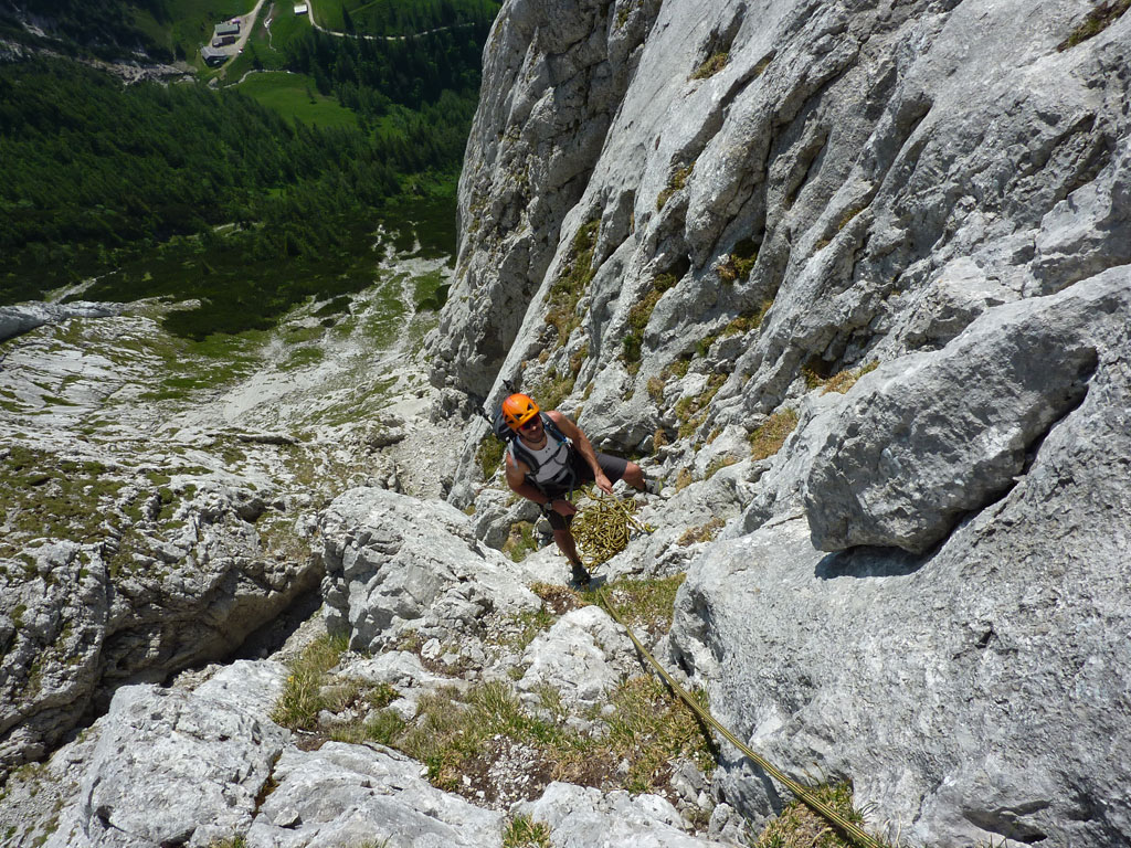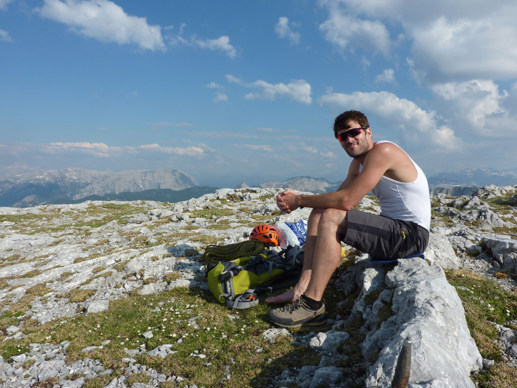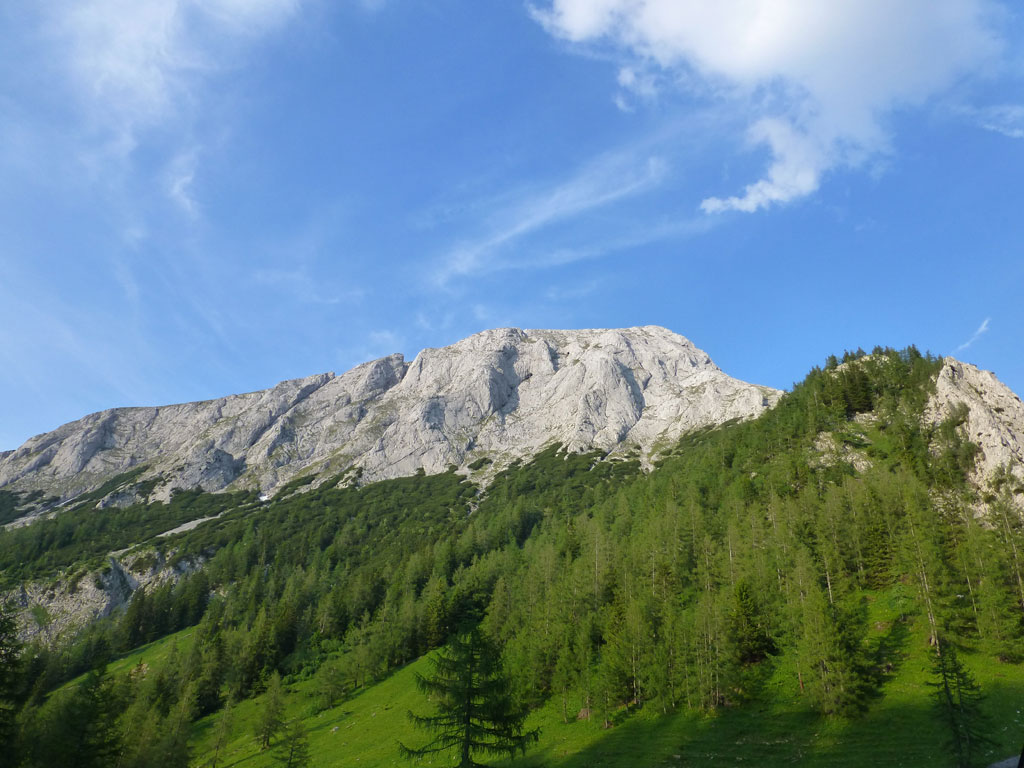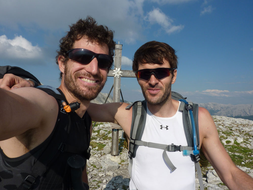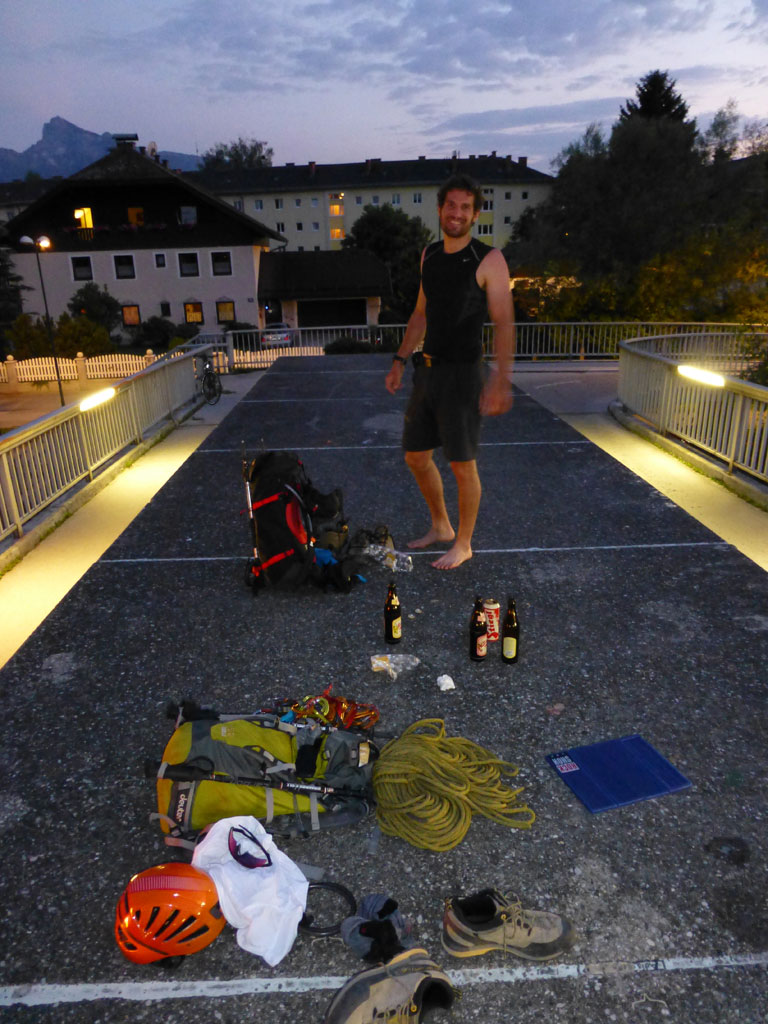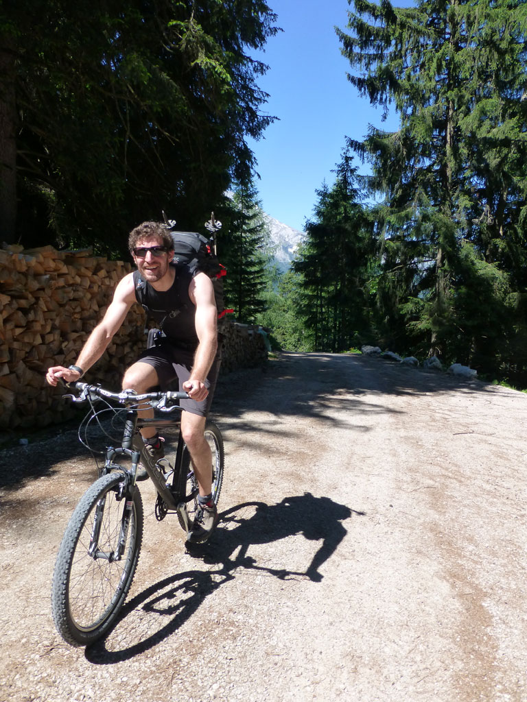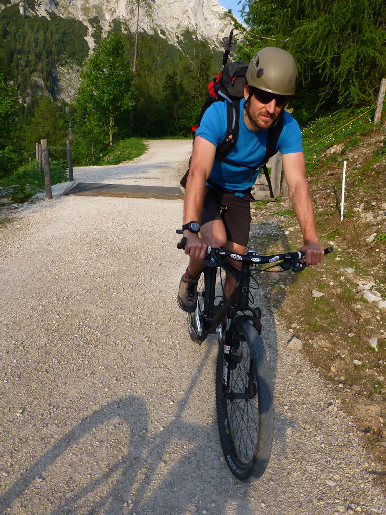 Endlich war es soweit: Unsere erste kombinierte Mountainbike- Kletter- und Bergtour stand am Programm! Das Wetter an diesem Montag war äußerst vielversprechend, Andi und ich kehrten dem beruflichen und privaten Alltag den Rücken zu und brachen mit den beiden „schwarzen Schönheiten“, voller Ausrüstung und großer Motivation in Richtung Berchtesgaden auf. Am Abend zuvor nervte ich Andi noch völlig unnötig und übermotiviert mit blödsinnigen Routenvorschlägen für unser erstes derartiges Unternehmen. Schließlich lenkte ich ein und wir entschieden uns für die Sommer, Sonne, Sonnenschein (IV), die wohl leichteste Route am Hohen Brett, welche Andi letztes Jahr schon mit Chris geklettert ist. So radelten wir am Vormittag bei schon recht ansprechenden Temperaturen vorbei an der Jennerbahn Mittelstation bis hinauf zur Mitterkaseralm, wo wir dann auch die Bikes deponierten. Ohne Umschweife kann man sagen, dass wir zu diesem Zeitpunkt schon recht müde waren, halb verhungert und richtig durstig. Wer hätte gedacht, dass die knapp über 300 Höhenmeter von der Mittelstation bis zur Mitterkaseralm über den Forstweg mit einige steile Rampen kein Spaziergang sind :-(. Somit schlugen wir uns bei der Almhütte den Bauch voll, tranken Radler und waren anschließend eher bereit für ein Nickerchen als für den Zustieg zur Kletterroute. Das Wetter war jedoch viel zu gut um jetzt wieder umzukehren, und nach dieser längeren Mittagspause kehrten die Kräfte stetig zurück, die Müdigkeit wich der Vorfreude. Den Zustieg bis unter die Südwestabbrüche des Hohen Bretts, bzw. in das Kar zwischen linken und rechten Pfeiler brachten wir schnell hinter uns und standen bald am Einstieg der Route Sommer, Sonne, Sonnenschein mit ihren goldenen Bohrhaken. Andi hatte nicht zuviel versprochen, und wir genossen jede Seillänge über den super rauhen Fels, die Platten und Wasserrillen. Übrigens macht die Route ihrem Namen bei einem solchen Wetter alle Ehre. Abgesehen davon, dass eine Zweierseilschaft über die Route abseilte, und dies offensichtlich zum ersten Mal, dabei Steinschlag ohne Ende auslöste, sodass wir vorübergehend aus der „Schusslinie“ gingen, kamen wir zügig voran und freuten uns beim Ausstieg über die gelungene Tour. Der niemals ausgesprochene Plan nach einer kurzen Pause noch bis zum Hohen Göll zu gehen, wurde dann beim Gipfelkreuz am Hohen Brett stillschweigend begraben. Irgendwie erleichtert aber abermals auch resignierend blickten wir hinüber zu Andis ‚Schicksalsberg‘, wohlwissend von unserem letzten gemeinsamen Versuch aus dem Jahr 2008, dass der Weg entlang des Grates bis zum Hohen Göll und zurück lang und zeitintensiv ist. Trotz allem genossen wir unsere Jause in der warmen Nachmittagssonne, wanderten dann zufrieden über das Jägerkreuz hinab zur Mitterkaseralm und rollten mit den Bikes zurück nach Salzburg. Und es war klar, dass so ein toller Start in die neue (Arbeits-??)Woche mit Bier und Kebab am Überfuhrsteg ausklingen sollte…