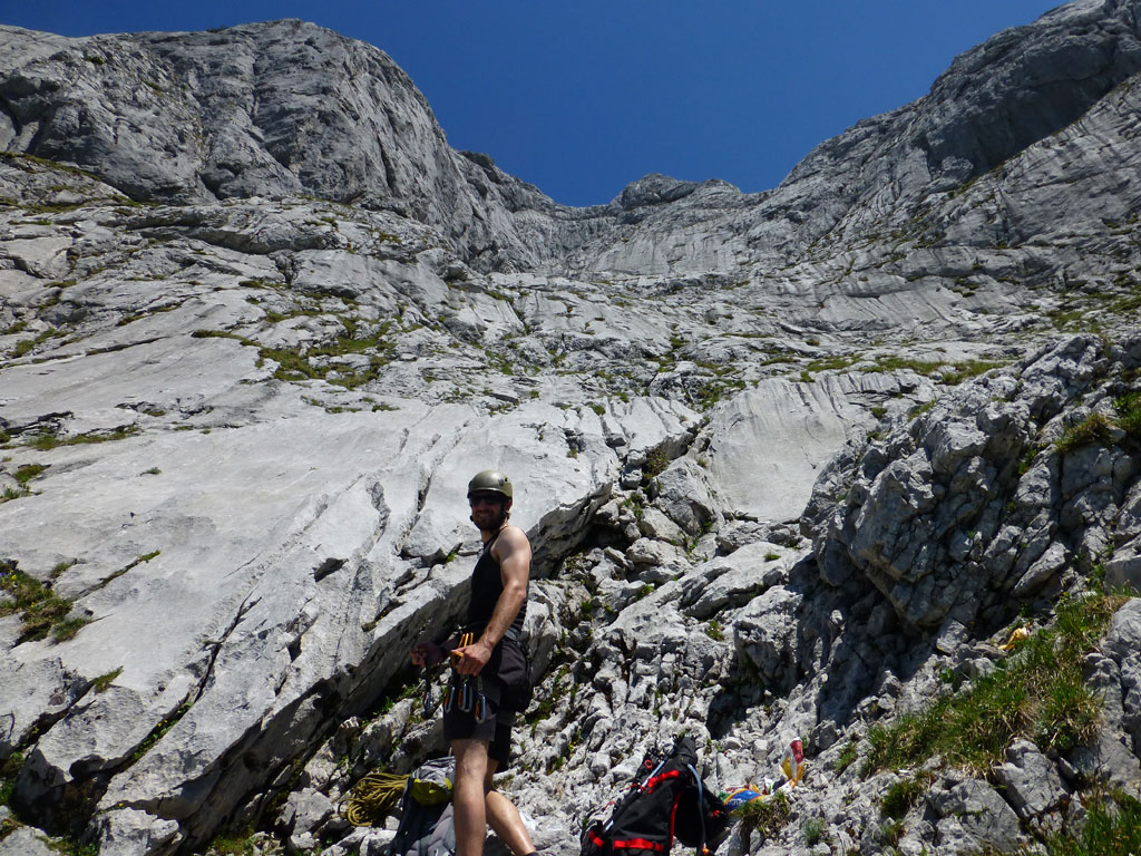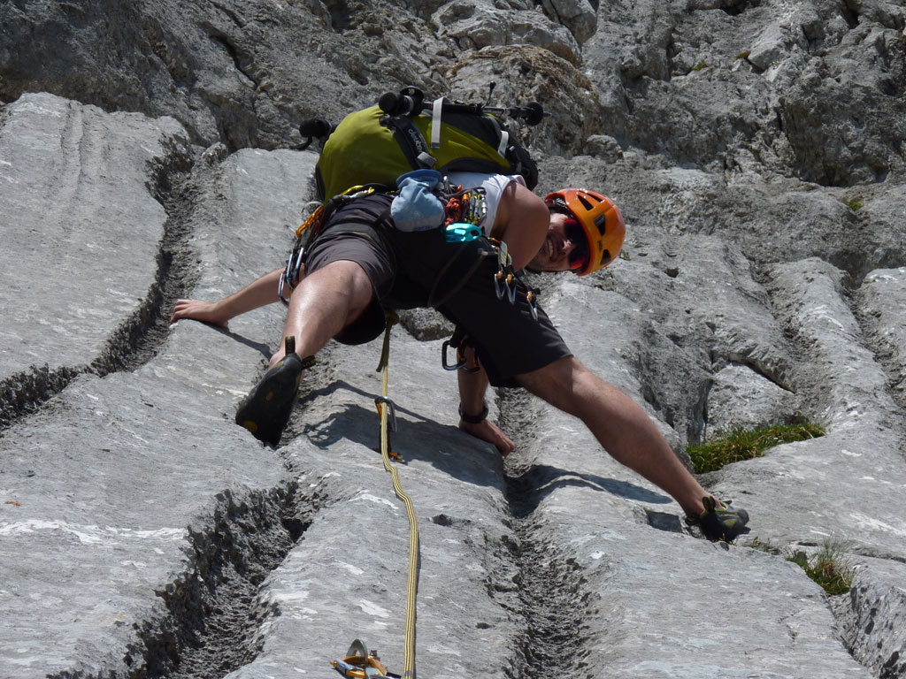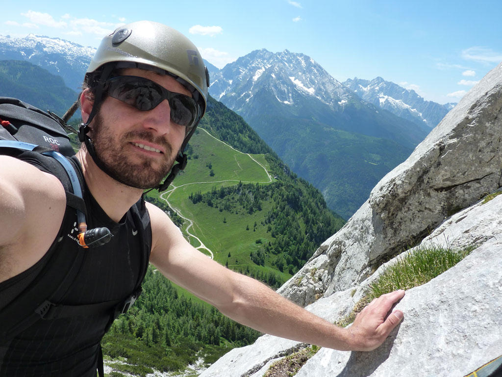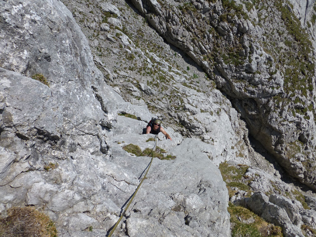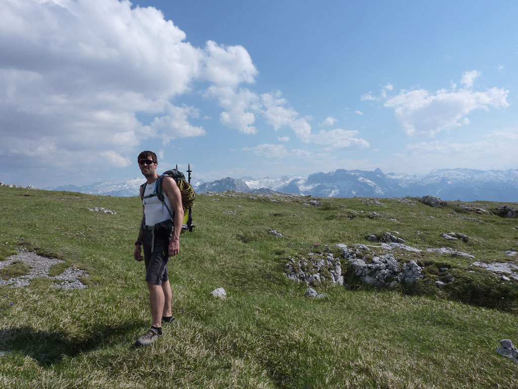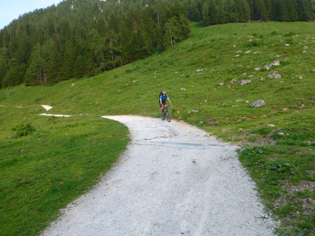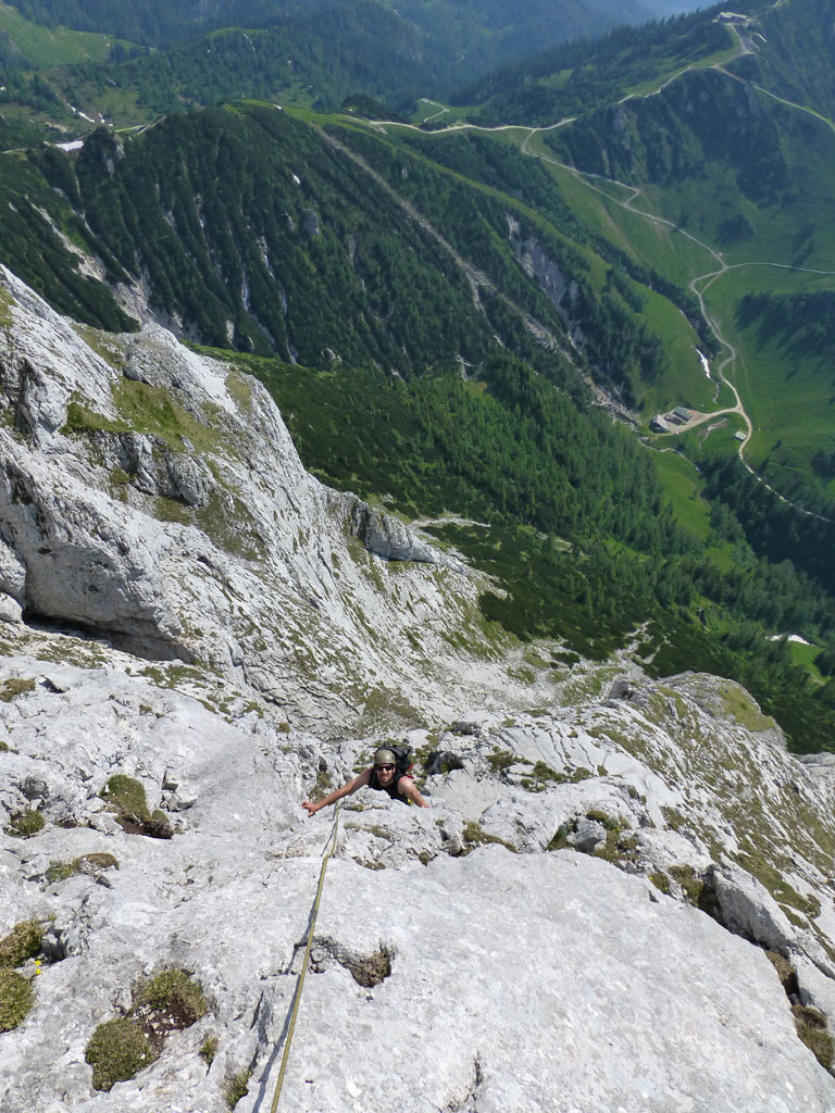 Endlich war es soweit: Unsere erste kombinierte Mountainbike- Kletter- und Bergtour stand am Programm! Das Wetter an diesem Montag war äußerst vielversprechend, Andi und ich kehrten dem beruflichen und privaten Alltag den Rücken zu und brachen mit den beiden „schwarzen Schönheiten“, voller Ausrüstung und großer Motivation in Richtung Berchtesgaden auf. Am Abend zuvor nervte ich Andi noch völlig unnötig und übermotiviert mit blödsinnigen Routenvorschlägen für unser erstes derartiges Unternehmen. Schließlich lenkte ich ein und wir entschieden uns für die Sommer, Sonne, Sonnenschein (IV), die wohl leichteste Route am Hohen Brett, welche Andi letztes Jahr schon mit Chris geklettert ist. So radelten wir am Vormittag bei schon recht ansprechenden Temperaturen vorbei an der Jennerbahn Mittelstation bis hinauf zur Mitterkaseralm, wo wir dann auch die Bikes deponierten. Ohne Umschweife kann man sagen, dass wir zu diesem Zeitpunkt schon recht müde waren, halb verhungert und richtig durstig. Wer hätte gedacht, dass die knapp über 300 Höhenmeter von der Mittelstation bis zur Mitterkaseralm über den Forstweg mit einige steile Rampen kein Spaziergang sind :-(. Somit schlugen wir uns bei der Almhütte den Bauch voll, tranken Radler und waren anschließend eher bereit für ein Nickerchen als für den Zustieg zur Kletterroute. Das Wetter war jedoch viel zu gut um jetzt wieder umzukehren, und nach dieser längeren Mittagspause kehrten die Kräfte stetig zurück, die Müdigkeit wich der Vorfreude. Den Zustieg bis unter die Südwestabbrüche des Hohen Bretts, bzw. in das Kar zwischen linken und rechten Pfeiler brachten wir schnell hinter uns und standen bald am Einstieg der Route Sommer, Sonne, Sonnenschein mit ihren goldenen Bohrhaken. Andi hatte nicht zuviel versprochen, und wir genossen jede Seillänge über den super rauhen Fels, die Platten und Wasserrillen. Übrigens macht die Route ihrem Namen bei einem solchen Wetter alle Ehre. Abgesehen davon, dass eine Zweierseilschaft über die Route abseilte, und dies offensichtlich zum ersten Mal, dabei Steinschlag ohne Ende auslöste, sodass wir vorübergehend aus der „Schusslinie“ gingen, kamen wir zügig voran und freuten uns beim Ausstieg über die gelungene Tour. Der niemals ausgesprochene Plan nach einer kurzen Pause noch bis zum Hohen Göll zu gehen, wurde dann beim Gipfelkreuz am Hohen Brett stillschweigend begraben. Irgendwie erleichtert aber abermals auch resignierend blickten wir hinüber zu Andis ‚Schicksalsberg‘, wohlwissend von unserem letzten gemeinsamen Versuch aus dem Jahr 2008, dass der Weg entlang des Grates bis zum Hohen Göll und zurück lang und zeitintensiv ist. Trotz allem genossen wir unsere Jause in der warmen Nachmittagssonne, wanderten dann zufrieden über das Jägerkreuz hinab zur Mitterkaseralm und rollten mit den Bikes zurück nach Salzburg. Und es war klar, dass so ein toller Start in die neue (Arbeits-??)Woche mit Bier und Kebab am Überfuhrsteg ausklingen sollte…