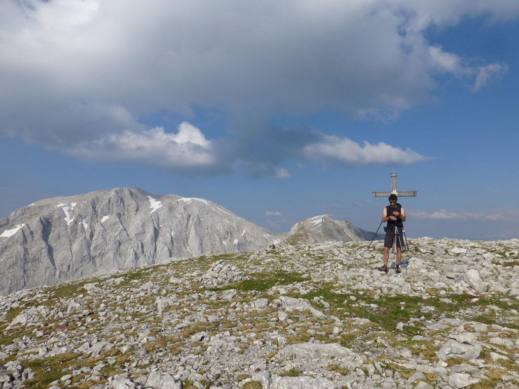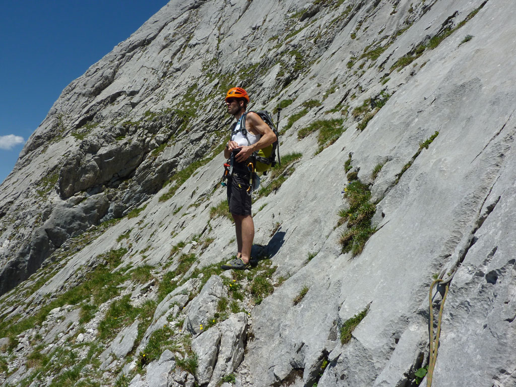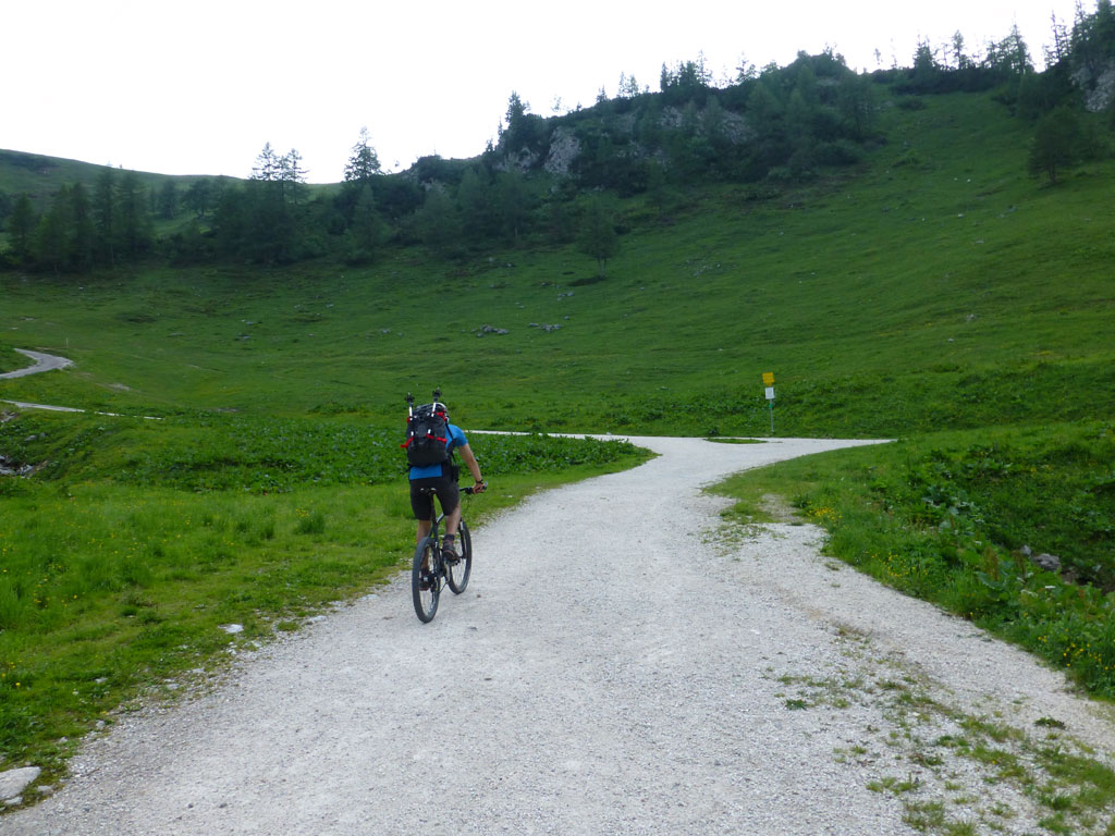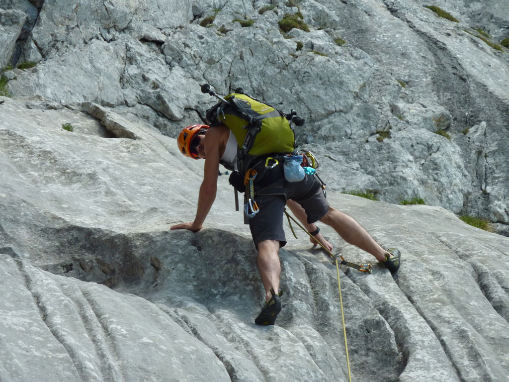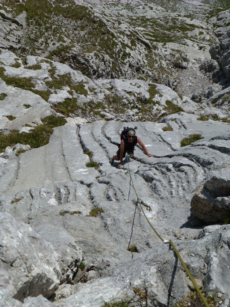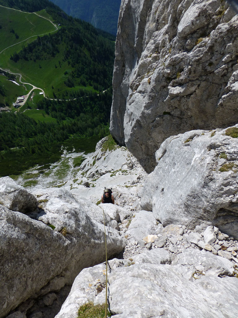 Endlich war es soweit: Unsere erste kombinierte Mountainbike- Kletter- und Bergtour stand am Programm! Das Wetter an diesem Montag war äußerst vielversprechend, Andi und ich kehrten dem beruflichen und privaten Alltag den Rücken zu und brachen mit den beiden „schwarzen Schönheiten“, voller Ausrüstung und großer Motivation in Richtung Berchtesgaden auf. Am Abend zuvor nervte ich Andi noch völlig unnötig und übermotiviert mit blödsinnigen Routenvorschlägen für unser erstes derartiges Unternehmen. Schließlich lenkte ich ein und wir entschieden uns für die Sommer, Sonne, Sonnenschein (IV), die wohl leichteste Route am Hohen Brett, welche Andi letztes Jahr schon mit Chris geklettert ist. So radelten wir am Vormittag bei schon recht ansprechenden Temperaturen vorbei an der Jennerbahn Mittelstation bis hinauf zur Mitterkaseralm, wo wir dann auch die Bikes deponierten. Ohne Umschweife kann man sagen, dass wir zu diesem Zeitpunkt schon recht müde waren, halb verhungert und richtig durstig. Wer hätte gedacht, dass die knapp über 300 Höhenmeter von der Mittelstation bis zur Mitterkaseralm über den Forstweg mit einige steile Rampen kein Spaziergang sind :-(. Somit schlugen wir uns bei der Almhütte den Bauch voll, tranken Radler und waren anschließend eher bereit für ein Nickerchen als für den Zustieg zur Kletterroute. Das Wetter war jedoch viel zu gut um jetzt wieder umzukehren, und nach dieser längeren Mittagspause kehrten die Kräfte stetig zurück, die Müdigkeit wich der Vorfreude. Den Zustieg bis unter die Südwestabbrüche des Hohen Bretts, bzw. in das Kar zwischen linken und rechten Pfeiler brachten wir schnell hinter uns und standen bald am Einstieg der Route Sommer, Sonne, Sonnenschein mit ihren goldenen Bohrhaken. Andi hatte nicht zuviel versprochen, und wir genossen jede Seillänge über den super rauhen Fels, die Platten und Wasserrillen. Übrigens macht die Route ihrem Namen bei einem solchen Wetter alle Ehre. Abgesehen davon, dass eine Zweierseilschaft über die Route abseilte, und dies offensichtlich zum ersten Mal, dabei Steinschlag ohne Ende auslöste, sodass wir vorübergehend aus der „Schusslinie“ gingen, kamen wir zügig voran und freuten uns beim Ausstieg über die gelungene Tour. Der niemals ausgesprochene Plan nach einer kurzen Pause noch bis zum Hohen Göll zu gehen, wurde dann beim Gipfelkreuz am Hohen Brett stillschweigend begraben. Irgendwie erleichtert aber abermals auch resignierend blickten wir hinüber zu Andis ‚Schicksalsberg‘, wohlwissend von unserem letzten gemeinsamen Versuch aus dem Jahr 2008, dass der Weg entlang des Grates bis zum Hohen Göll und zurück lang und zeitintensiv ist. Trotz allem genossen wir unsere Jause in der warmen Nachmittagssonne, wanderten dann zufrieden über das Jägerkreuz hinab zur Mitterkaseralm und rollten mit den Bikes zurück nach Salzburg. Und es war klar, dass so ein toller Start in die neue (Arbeits-??)Woche mit Bier und Kebab am Überfuhrsteg ausklingen sollte…