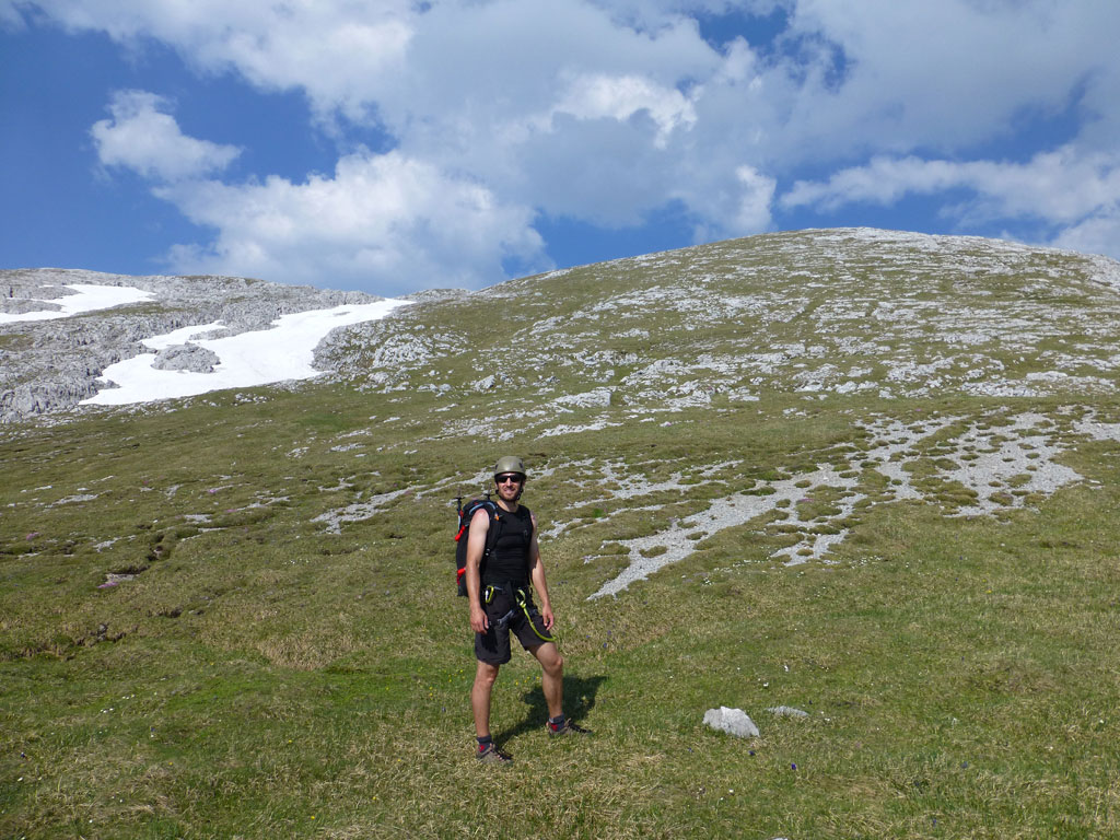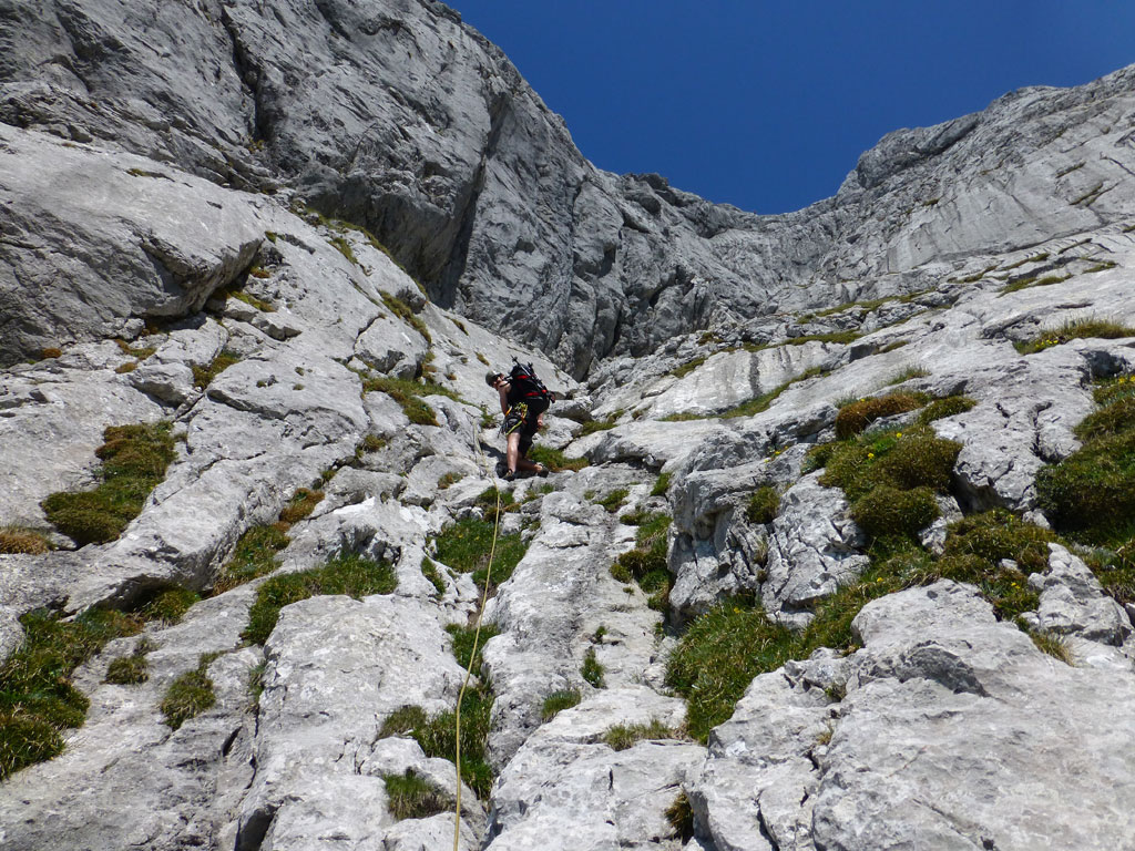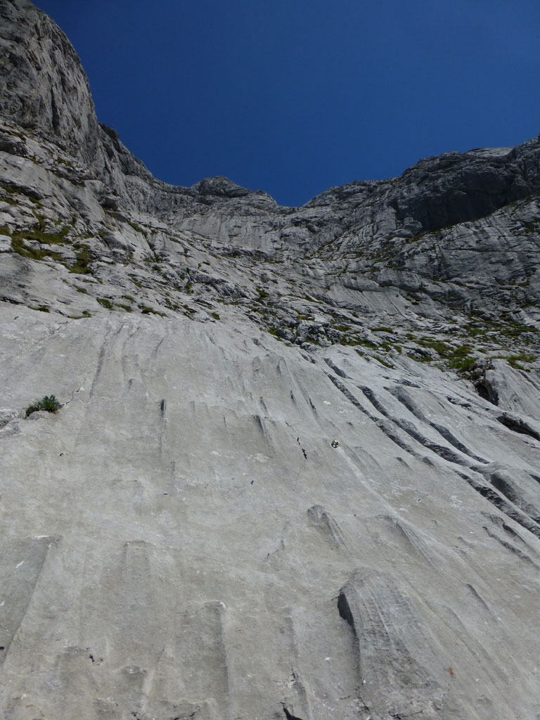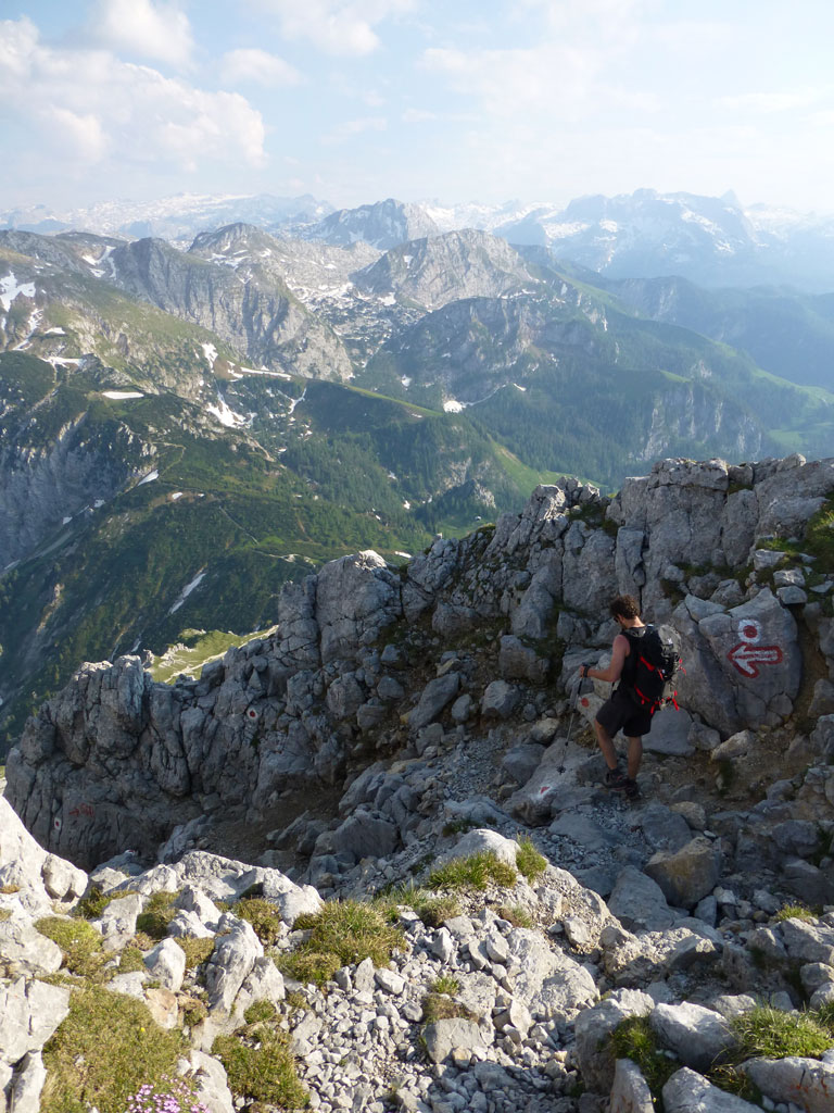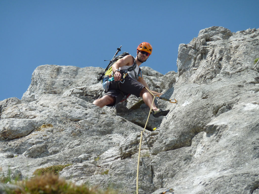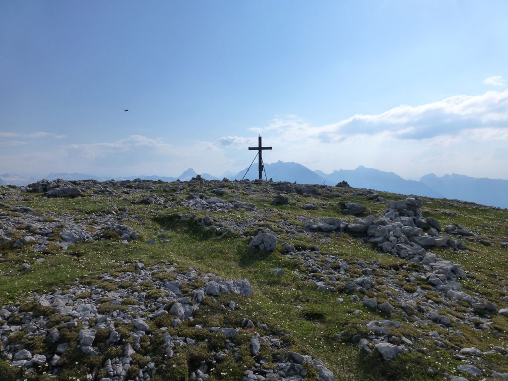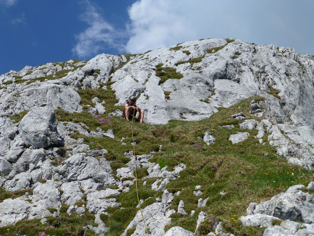 Endlich war es soweit: Unsere erste kombinierte Mountainbike- Kletter- und Bergtour stand am Programm! Das Wetter an diesem Montag war äußerst vielversprechend, Andi und ich kehrten dem beruflichen und privaten Alltag den Rücken zu und brachen mit den beiden „schwarzen Schönheiten“, voller Ausrüstung und großer Motivation in Richtung Berchtesgaden auf. Am Abend zuvor nervte ich Andi noch völlig unnötig und übermotiviert mit blödsinnigen Routenvorschlägen für unser erstes derartiges Unternehmen. Schließlich lenkte ich ein und wir entschieden uns für die Sommer, Sonne, Sonnenschein (IV), die wohl leichteste Route am Hohen Brett, welche Andi letztes Jahr schon mit Chris geklettert ist. So radelten wir am Vormittag bei schon recht ansprechenden Temperaturen vorbei an der Jennerbahn Mittelstation bis hinauf zur Mitterkaseralm, wo wir dann auch die Bikes deponierten. Ohne Umschweife kann man sagen, dass wir zu diesem Zeitpunkt schon recht müde waren, halb verhungert und richtig durstig. Wer hätte gedacht, dass die knapp über 300 Höhenmeter von der Mittelstation bis zur Mitterkaseralm über den Forstweg mit einige steile Rampen kein Spaziergang sind :-(. Somit schlugen wir uns bei der Almhütte den Bauch voll, tranken Radler und waren anschließend eher bereit für ein Nickerchen als für den Zustieg zur Kletterroute. Das Wetter war jedoch viel zu gut um jetzt wieder umzukehren, und nach dieser längeren Mittagspause kehrten die Kräfte stetig zurück, die Müdigkeit wich der Vorfreude. Den Zustieg bis unter die Südwestabbrüche des Hohen Bretts, bzw. in das Kar zwischen linken und rechten Pfeiler brachten wir schnell hinter uns und standen bald am Einstieg der Route Sommer, Sonne, Sonnenschein mit ihren goldenen Bohrhaken. Andi hatte nicht zuviel versprochen, und wir genossen jede Seillänge über den super rauhen Fels, die Platten und Wasserrillen. Übrigens macht die Route ihrem Namen bei einem solchen Wetter alle Ehre. Abgesehen davon, dass eine Zweierseilschaft über die Route abseilte, und dies offensichtlich zum ersten Mal, dabei Steinschlag ohne Ende auslöste, sodass wir vorübergehend aus der „Schusslinie“ gingen, kamen wir zügig voran und freuten uns beim Ausstieg über die gelungene Tour. Der niemals ausgesprochene Plan nach einer kurzen Pause noch bis zum Hohen Göll zu gehen, wurde dann beim Gipfelkreuz am Hohen Brett stillschweigend begraben. Irgendwie erleichtert aber abermals auch resignierend blickten wir hinüber zu Andis ‚Schicksalsberg‘, wohlwissend von unserem letzten gemeinsamen Versuch aus dem Jahr 2008, dass der Weg entlang des Grates bis zum Hohen Göll und zurück lang und zeitintensiv ist. Trotz allem genossen wir unsere Jause in der warmen Nachmittagssonne, wanderten dann zufrieden über das Jägerkreuz hinab zur Mitterkaseralm und rollten mit den Bikes zurück nach Salzburg. Und es war klar, dass so ein toller Start in die neue (Arbeits-??)Woche mit Bier und Kebab am Überfuhrsteg ausklingen sollte…