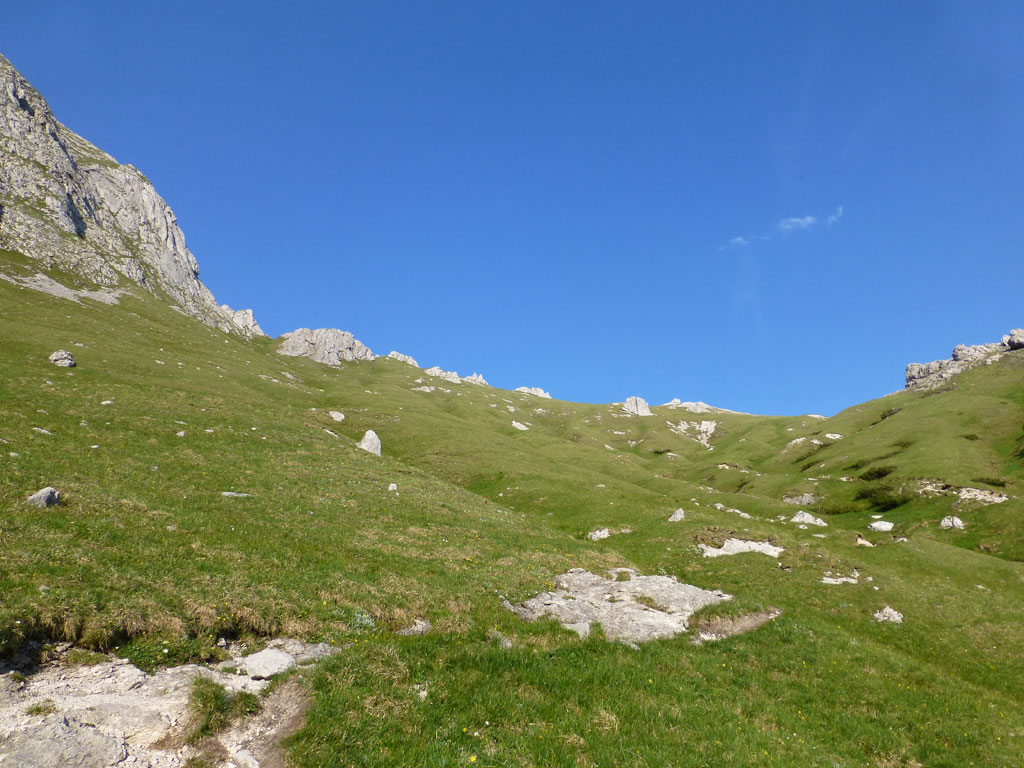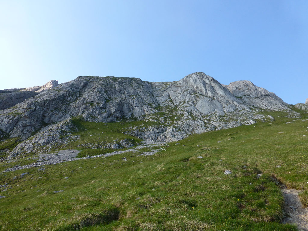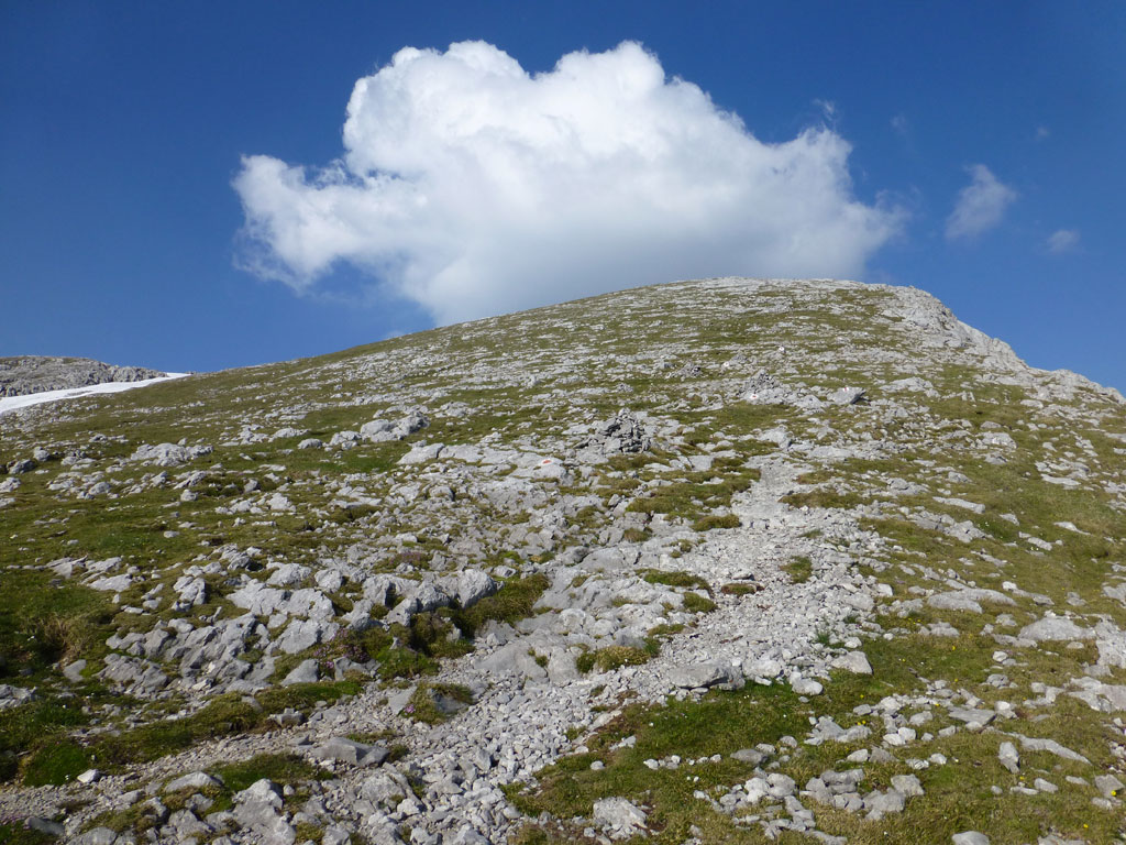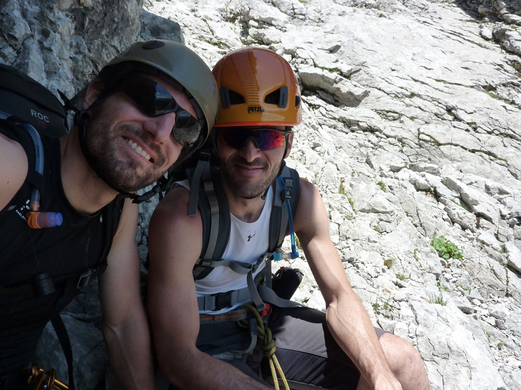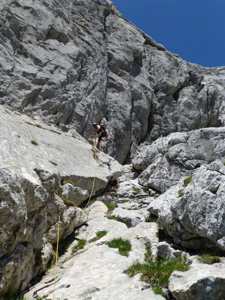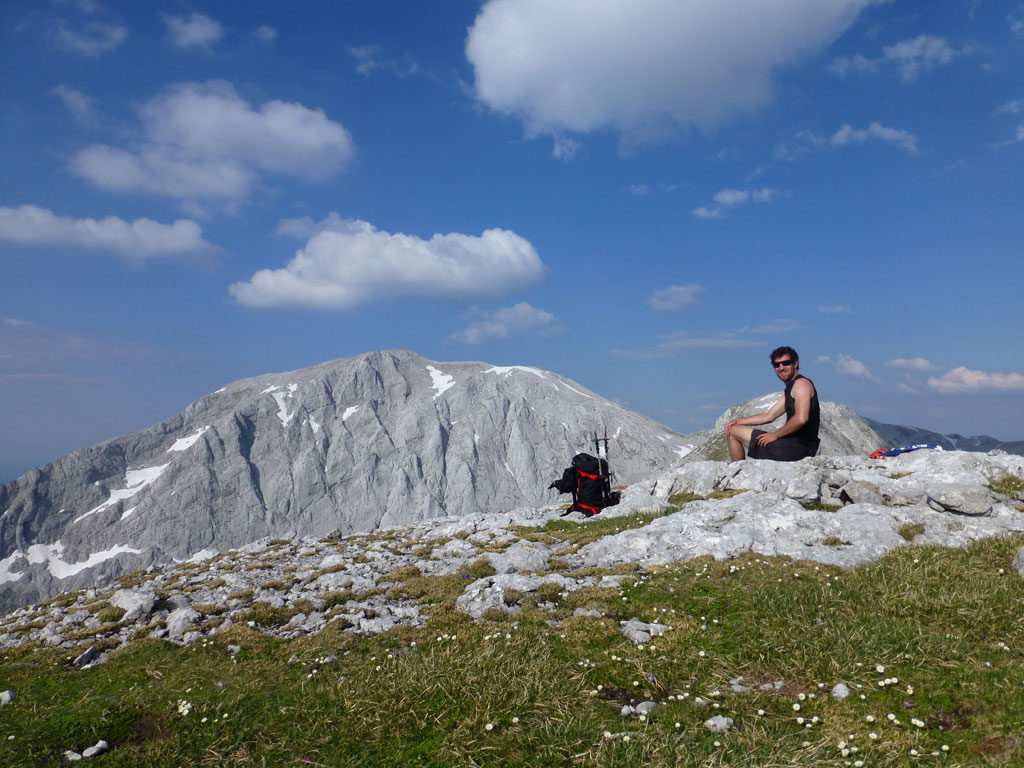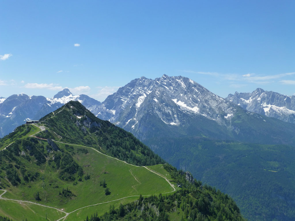 Endlich war es soweit: Unsere erste kombinierte Mountainbike- Kletter- und Bergtour stand am Programm! Das Wetter an diesem Montag war äußerst vielversprechend, Andi und ich kehrten dem beruflichen und privaten Alltag den Rücken zu und brachen mit den beiden „schwarzen Schönheiten“, voller Ausrüstung und großer Motivation in Richtung Berchtesgaden auf. Am Abend zuvor nervte ich Andi noch völlig unnötig und übermotiviert mit blödsinnigen Routenvorschlägen für unser erstes derartiges Unternehmen. Schließlich lenkte ich ein und wir entschieden uns für die Sommer, Sonne, Sonnenschein (IV), die wohl leichteste Route am Hohen Brett, welche Andi letztes Jahr schon mit Chris geklettert ist. So radelten wir am Vormittag bei schon recht ansprechenden Temperaturen vorbei an der Jennerbahn Mittelstation bis hinauf zur Mitterkaseralm, wo wir dann auch die Bikes deponierten. Ohne Umschweife kann man sagen, dass wir zu diesem Zeitpunkt schon recht müde waren, halb verhungert und richtig durstig. Wer hätte gedacht, dass die knapp über 300 Höhenmeter von der Mittelstation bis zur Mitterkaseralm über den Forstweg mit einige steile Rampen kein Spaziergang sind :-(. Somit schlugen wir uns bei der Almhütte den Bauch voll, tranken Radler und waren anschließend eher bereit für ein Nickerchen als für den Zustieg zur Kletterroute. Das Wetter war jedoch viel zu gut um jetzt wieder umzukehren, und nach dieser längeren Mittagspause kehrten die Kräfte stetig zurück, die Müdigkeit wich der Vorfreude. Den Zustieg bis unter die Südwestabbrüche des Hohen Bretts, bzw. in das Kar zwischen linken und rechten Pfeiler brachten wir schnell hinter uns und standen bald am Einstieg der Route Sommer, Sonne, Sonnenschein mit ihren goldenen Bohrhaken. Andi hatte nicht zuviel versprochen, und wir genossen jede Seillänge über den super rauhen Fels, die Platten und Wasserrillen. Übrigens macht die Route ihrem Namen bei einem solchen Wetter alle Ehre. Abgesehen davon, dass eine Zweierseilschaft über die Route abseilte, und dies offensichtlich zum ersten Mal, dabei Steinschlag ohne Ende auslöste, sodass wir vorübergehend aus der „Schusslinie“ gingen, kamen wir zügig voran und freuten uns beim Ausstieg über die gelungene Tour. Der niemals ausgesprochene Plan nach einer kurzen Pause noch bis zum Hohen Göll zu gehen, wurde dann beim Gipfelkreuz am Hohen Brett stillschweigend begraben. Irgendwie erleichtert aber abermals auch resignierend blickten wir hinüber zu Andis ‚Schicksalsberg‘, wohlwissend von unserem letzten gemeinsamen Versuch aus dem Jahr 2008, dass der Weg entlang des Grates bis zum Hohen Göll und zurück lang und zeitintensiv ist. Trotz allem genossen wir unsere Jause in der warmen Nachmittagssonne, wanderten dann zufrieden über das Jägerkreuz hinab zur Mitterkaseralm und rollten mit den Bikes zurück nach Salzburg. Und es war klar, dass so ein toller Start in die neue (Arbeits-??)Woche mit Bier und Kebab am Überfuhrsteg ausklingen sollte…