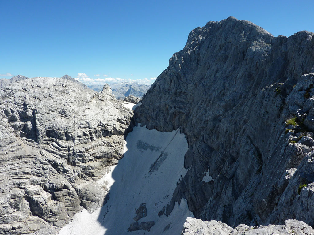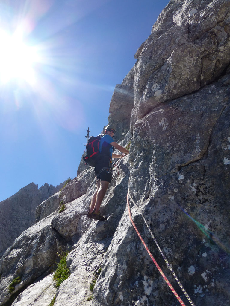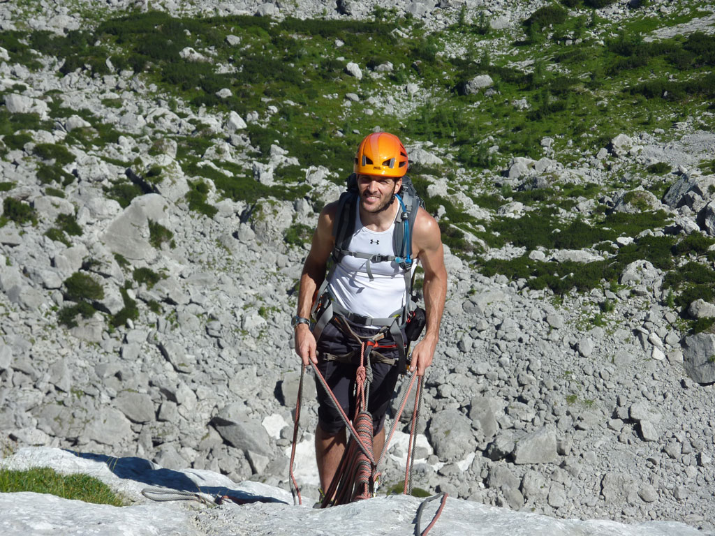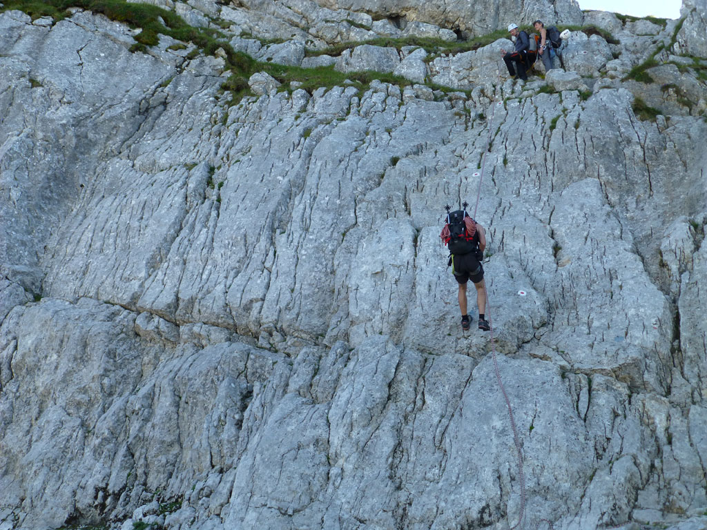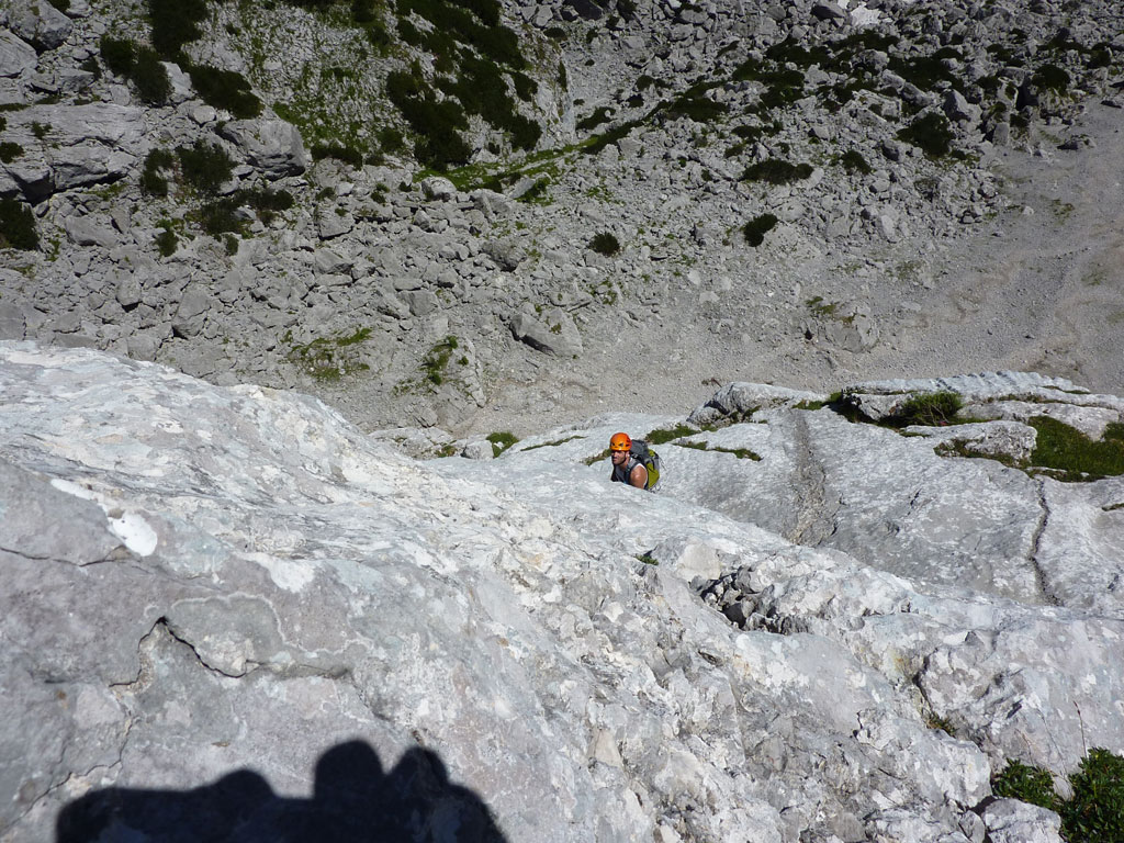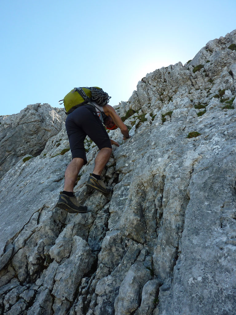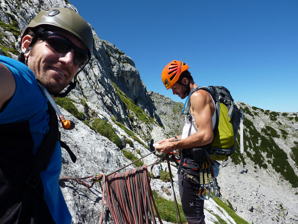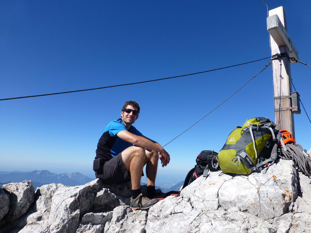 Eine Woche nach unserer letzten Tour am Berchtesgadener Hochthron war das Wetter abermals ausgezeichnet, also wieder ab zum Klettern, diesmal am Hochkalter. Also marschierten wir am frühen Morgen an der Blaueshütte vorbei in Richtung Blaueisgletscher, dann rechts am Normnalweg zum Hochkalter bis zum Einstieg der Eisbär-Tour (V/V+). Die Route ist ausgezeichnet abgesichert, verfügt über leichte, schöne Platten und namenskonform über Eisbären (?!). Ab dem letzten Stand war vorerst Wegsuche angesagt, aber nach einigen Höhenmetern über Schrofen stießen wir auf den Normalweg und stiegen weiter zum Hochkalter auf. Relativ einsam genossen wir bei einer verdienten Rast den herrlichen Sommertag auf einem unserer Lieblingsgipfel, bis wir von einem älteren Kletterpärchen Gesellschaft bekamen, das gerade von der Schulter aufgestiegen war, und die Blaueisumrahmung kletterte. Gemeinsam traten wir den Rückweg zur Blaueishütte an, wo wir uns Speis und Trank gönnten. Wie sich noch herausstellte, widmet sich das illustre Pärchen der Kletterei schon länger als Andi unter uns weilt, d.h. wir haben noch einige Jahre Zeit, damit wir endlich mal besser werden… 🙂 !!