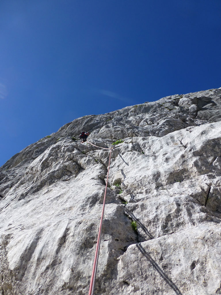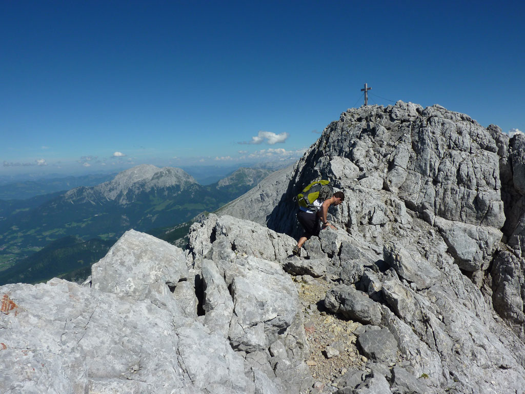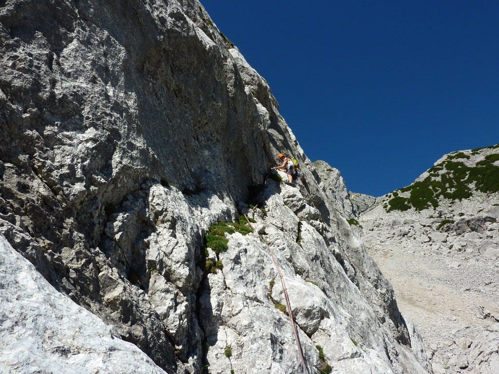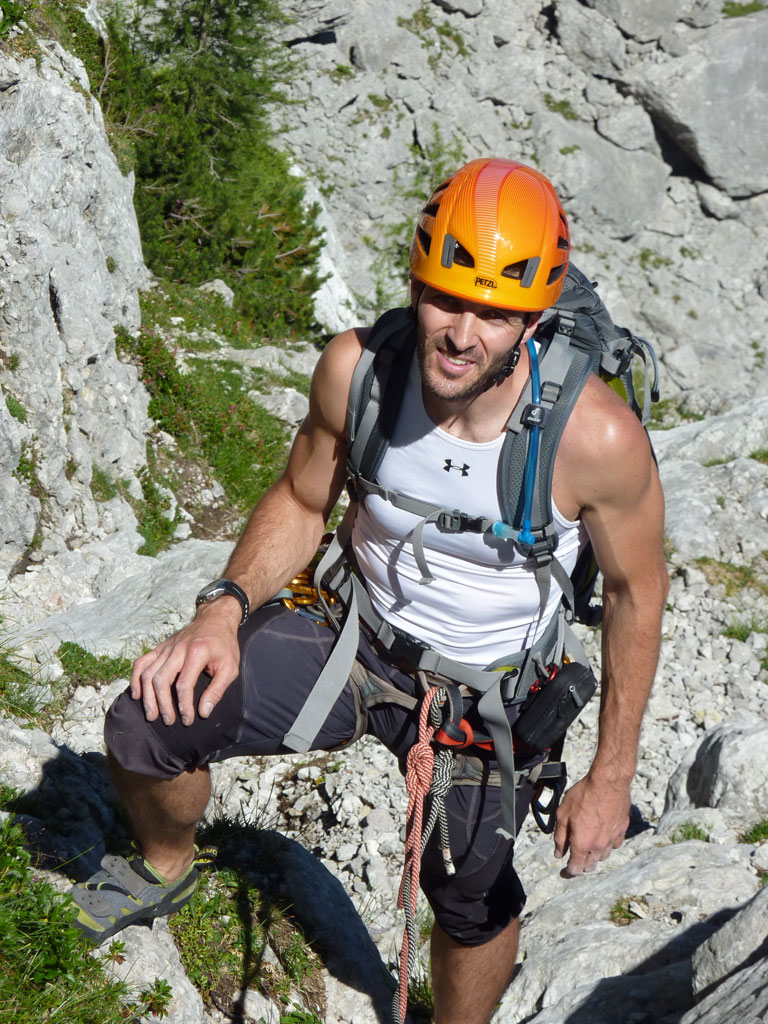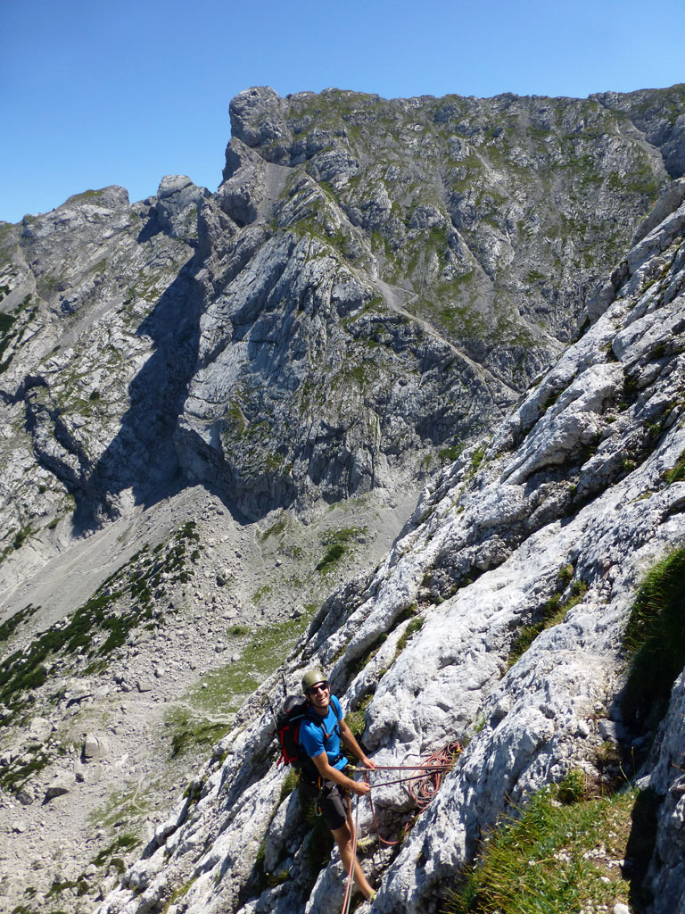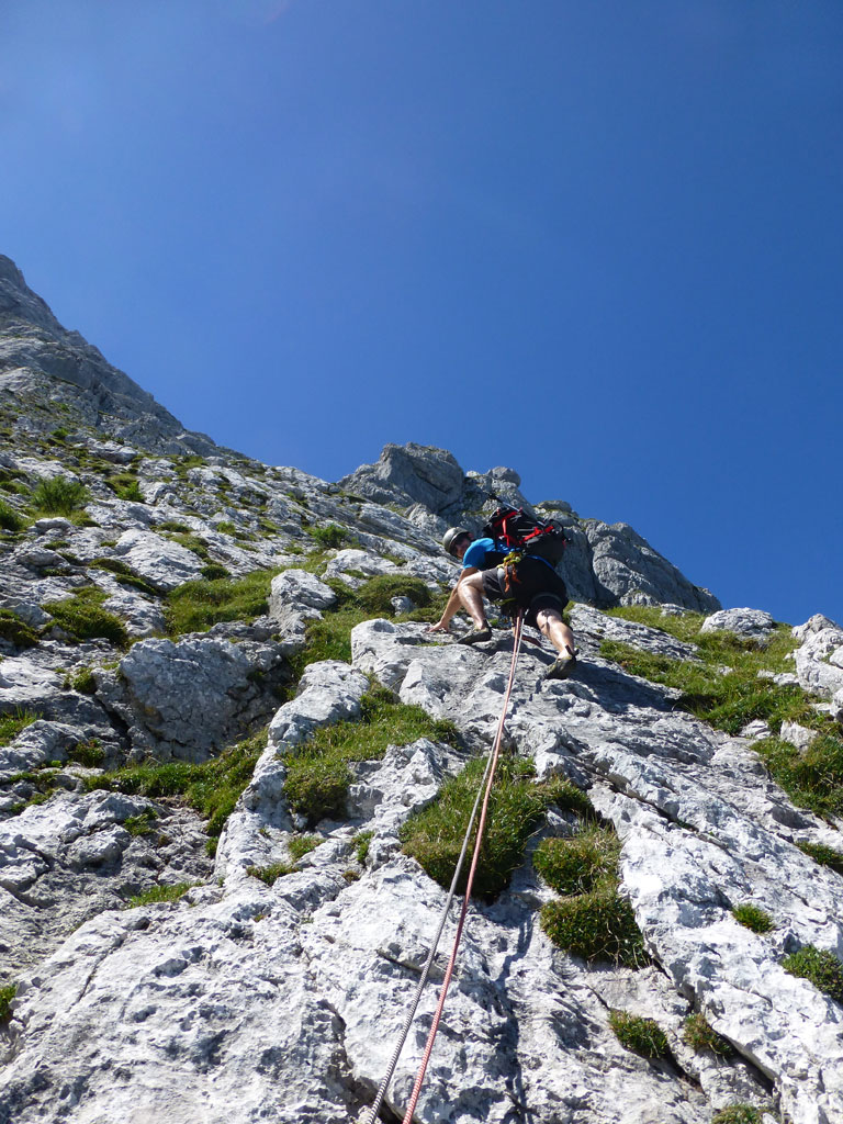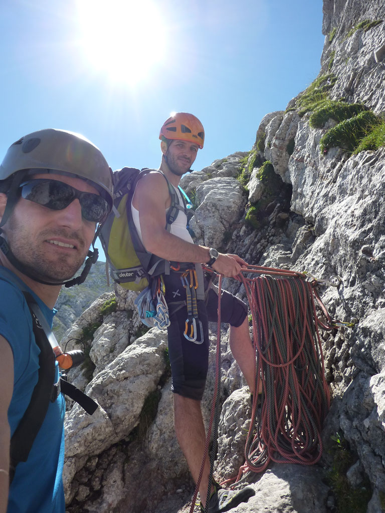 Eine Woche nach unserer letzten Tour am Berchtesgadener Hochthron war das Wetter abermals ausgezeichnet, also wieder ab zum Klettern, diesmal am Hochkalter. Also marschierten wir am frühen Morgen an der Blaueshütte vorbei in Richtung Blaueisgletscher, dann rechts am Normnalweg zum Hochkalter bis zum Einstieg der Eisbär-Tour (V/V+). Die Route ist ausgezeichnet abgesichert, verfügt über leichte, schöne Platten und namenskonform über Eisbären (?!). Ab dem letzten Stand war vorerst Wegsuche angesagt, aber nach einigen Höhenmetern über Schrofen stießen wir auf den Normalweg und stiegen weiter zum Hochkalter auf. Relativ einsam genossen wir bei einer verdienten Rast den herrlichen Sommertag auf einem unserer Lieblingsgipfel, bis wir von einem älteren Kletterpärchen Gesellschaft bekamen, das gerade von der Schulter aufgestiegen war, und die Blaueisumrahmung kletterte. Gemeinsam traten wir den Rückweg zur Blaueishütte an, wo wir uns Speis und Trank gönnten. Wie sich noch herausstellte, widmet sich das illustre Pärchen der Kletterei schon länger als Andi unter uns weilt, d.h. wir haben noch einige Jahre Zeit, damit wir endlich mal besser werden… 🙂 !!