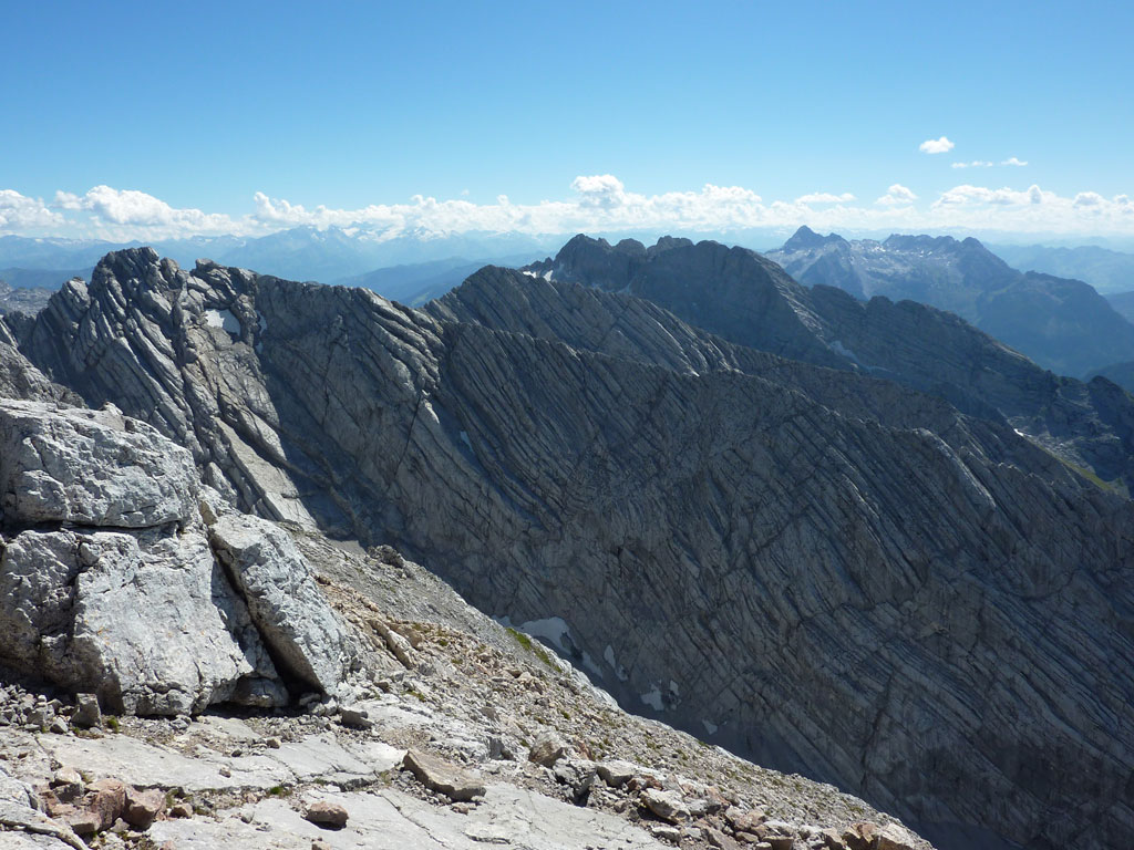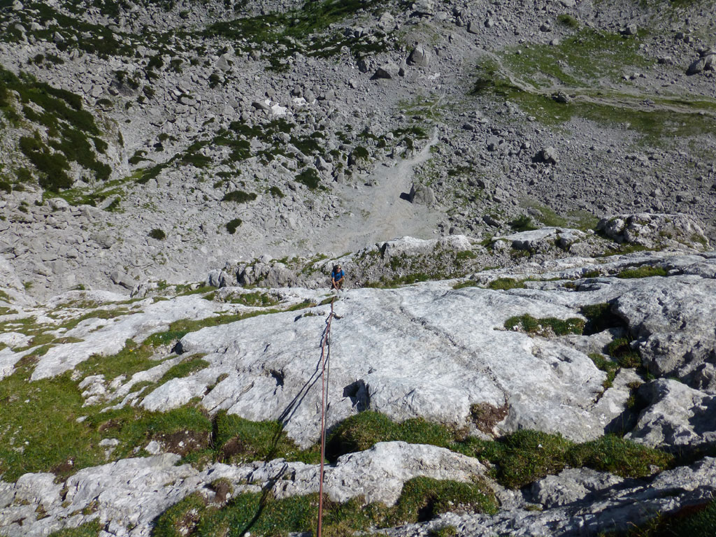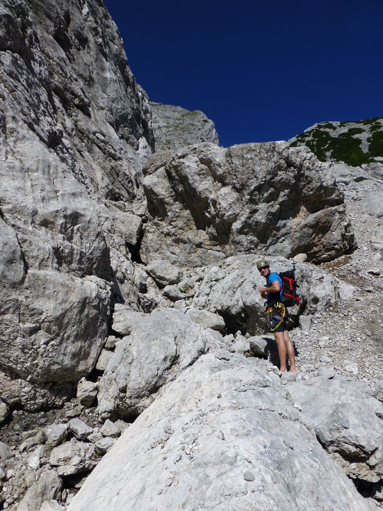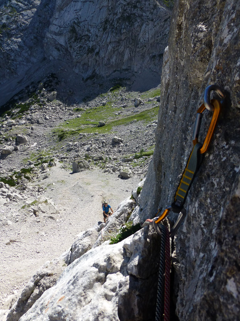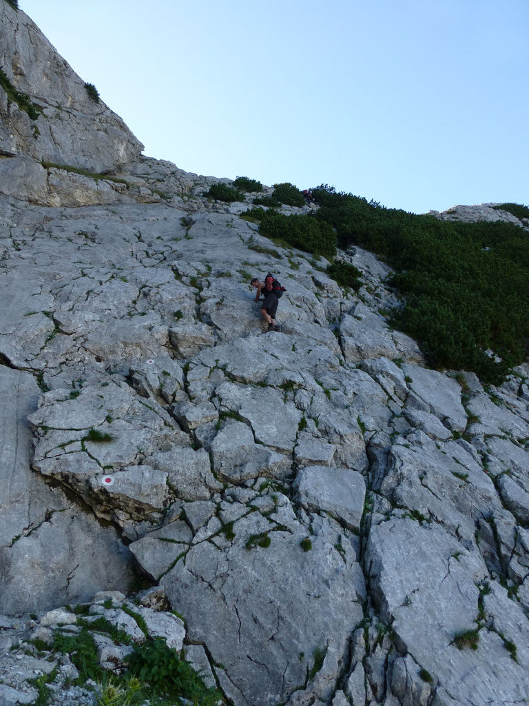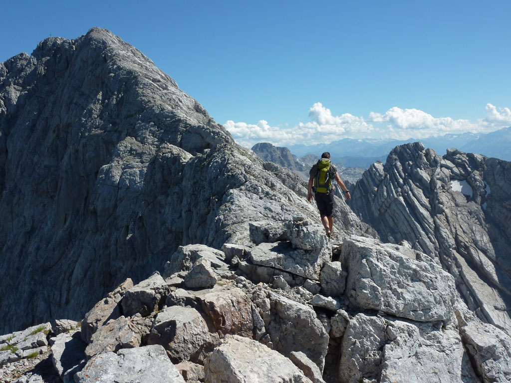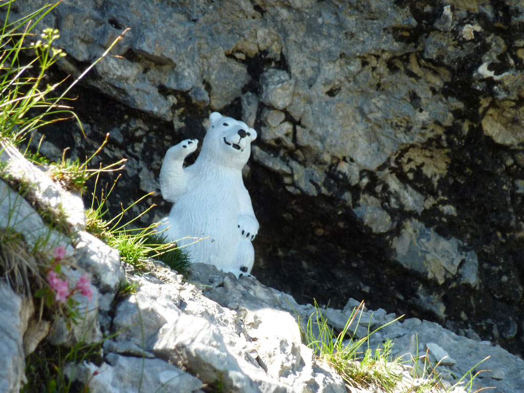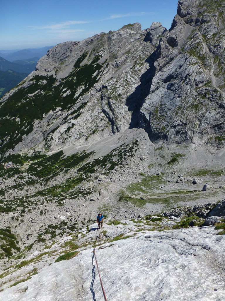 Eine Woche nach unserer letzten Tour am Berchtesgadener Hochthron war das Wetter abermals ausgezeichnet, also wieder ab zum Klettern, diesmal am Hochkalter. Also marschierten wir am frühen Morgen an der Blaueshütte vorbei in Richtung Blaueisgletscher, dann rechts am Normnalweg zum Hochkalter bis zum Einstieg der Eisbär-Tour (V/V+). Die Route ist ausgezeichnet abgesichert, verfügt über leichte, schöne Platten und namenskonform über Eisbären (?!). Ab dem letzten Stand war vorerst Wegsuche angesagt, aber nach einigen Höhenmetern über Schrofen stießen wir auf den Normalweg und stiegen weiter zum Hochkalter auf. Relativ einsam genossen wir bei einer verdienten Rast den herrlichen Sommertag auf einem unserer Lieblingsgipfel, bis wir von einem älteren Kletterpärchen Gesellschaft bekamen, das gerade von der Schulter aufgestiegen war, und die Blaueisumrahmung kletterte. Gemeinsam traten wir den Rückweg zur Blaueishütte an, wo wir uns Speis und Trank gönnten. Wie sich noch herausstellte, widmet sich das illustre Pärchen der Kletterei schon länger als Andi unter uns weilt, d.h. wir haben noch einige Jahre Zeit, damit wir endlich mal besser werden… 🙂 !!