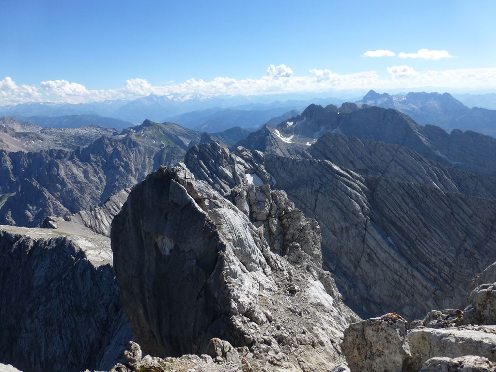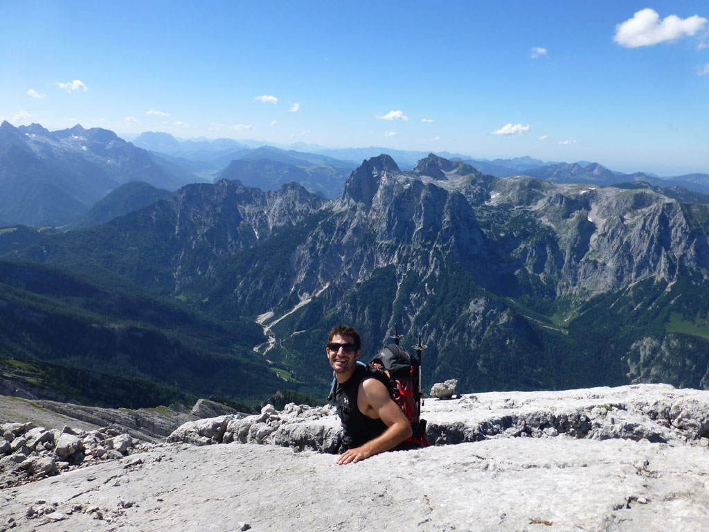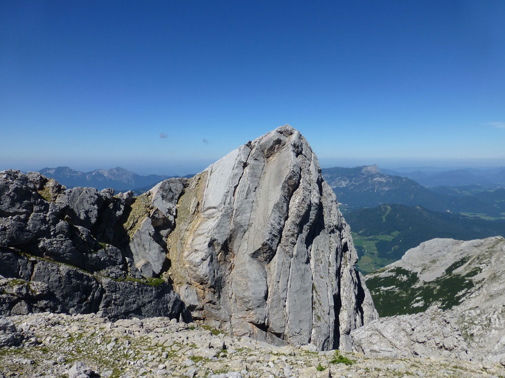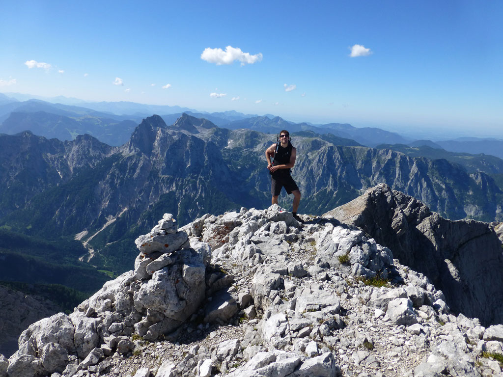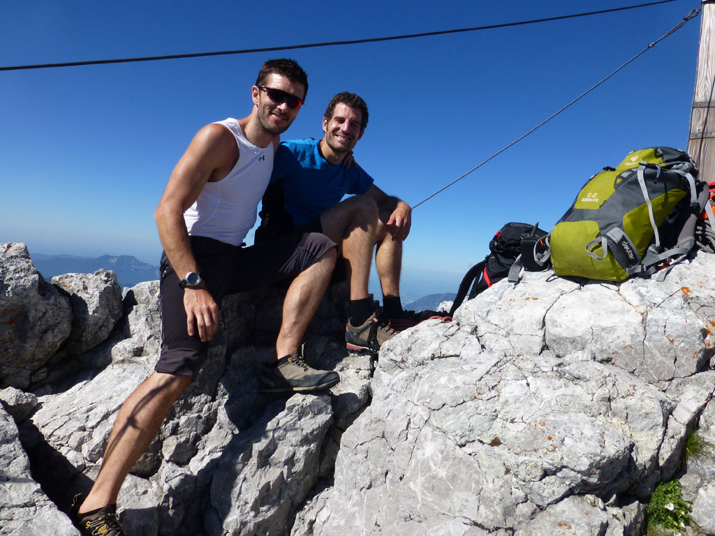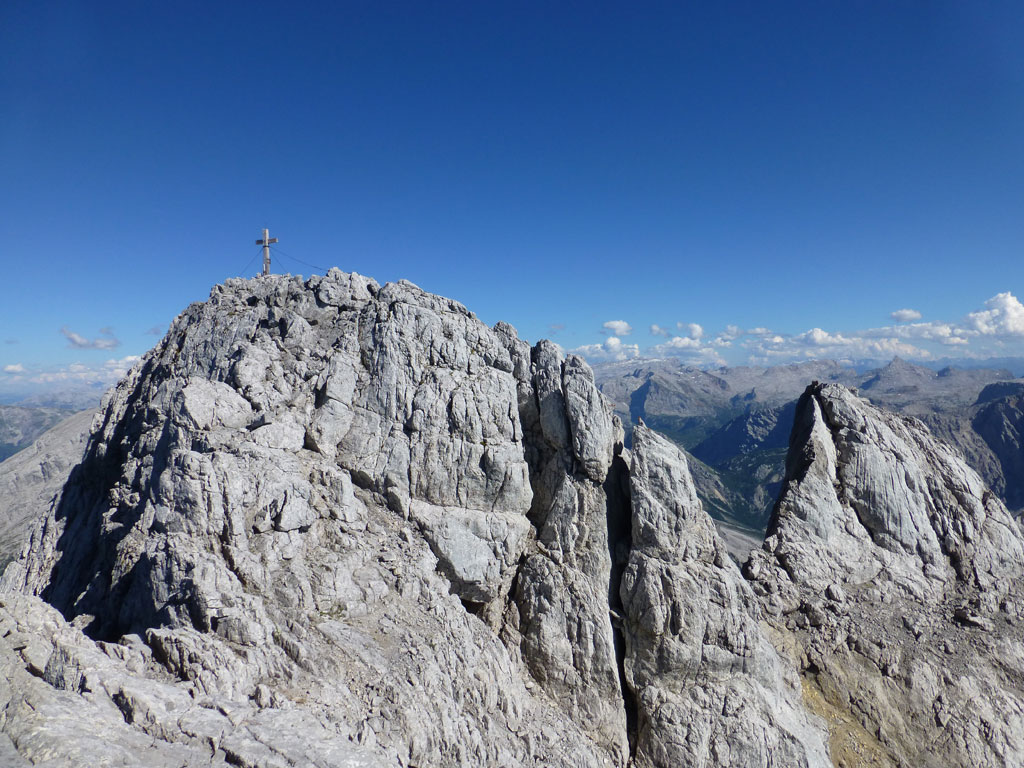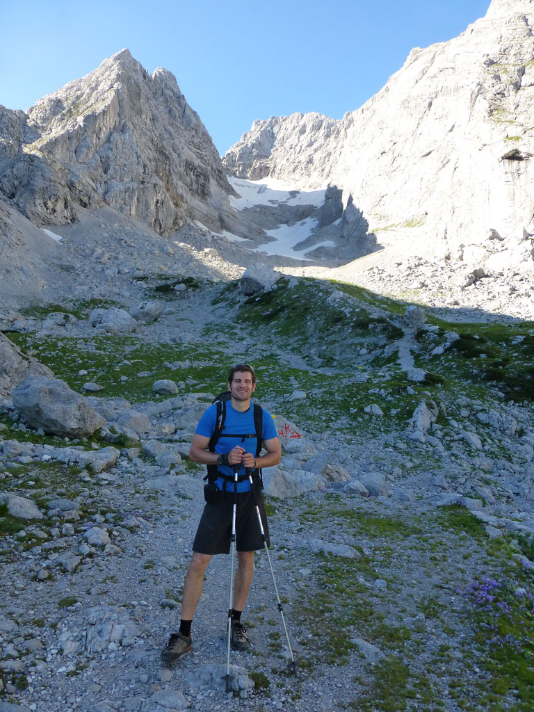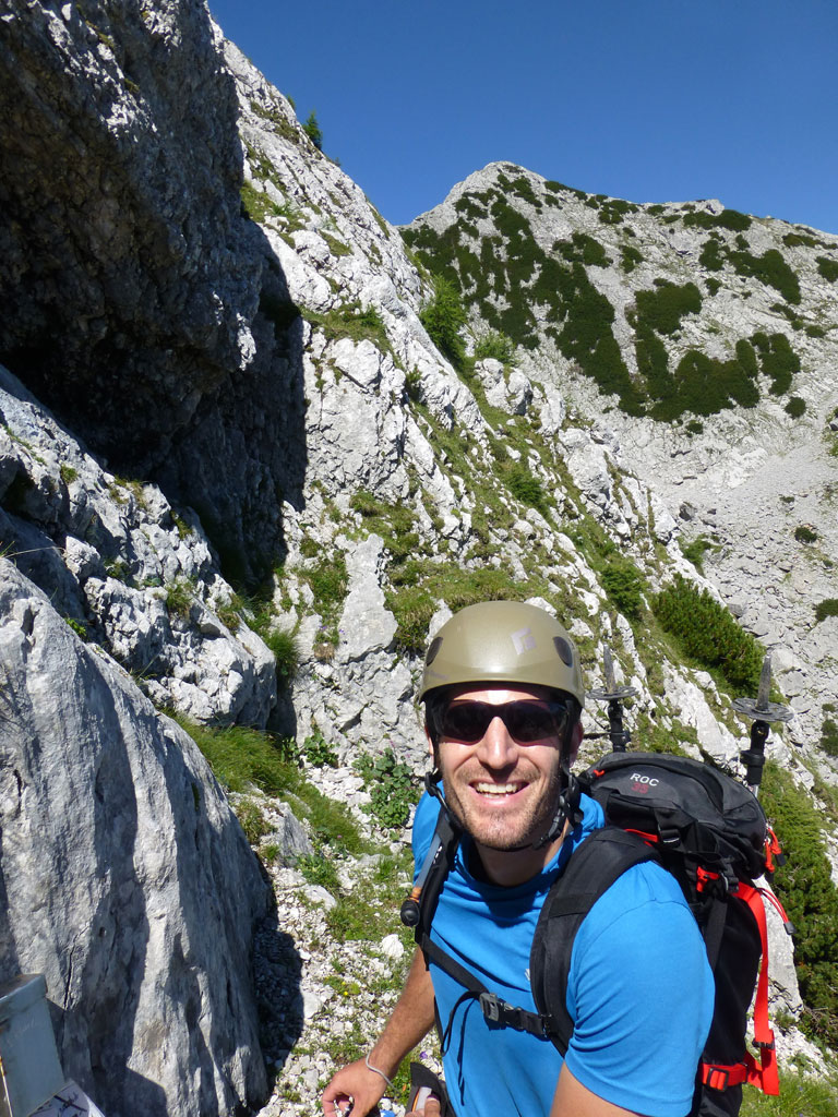 Eine Woche nach unserer letzten Tour am Berchtesgadener Hochthron war das Wetter abermals ausgezeichnet, also wieder ab zum Klettern, diesmal am Hochkalter. Also marschierten wir am frühen Morgen an der Blaueshütte vorbei in Richtung Blaueisgletscher, dann rechts am Normnalweg zum Hochkalter bis zum Einstieg der Eisbär-Tour (V/V+). Die Route ist ausgezeichnet abgesichert, verfügt über leichte, schöne Platten und namenskonform über Eisbären (?!). Ab dem letzten Stand war vorerst Wegsuche angesagt, aber nach einigen Höhenmetern über Schrofen stießen wir auf den Normalweg und stiegen weiter zum Hochkalter auf. Relativ einsam genossen wir bei einer verdienten Rast den herrlichen Sommertag auf einem unserer Lieblingsgipfel, bis wir von einem älteren Kletterpärchen Gesellschaft bekamen, das gerade von der Schulter aufgestiegen war, und die Blaueisumrahmung kletterte. Gemeinsam traten wir den Rückweg zur Blaueishütte an, wo wir uns Speis und Trank gönnten. Wie sich noch herausstellte, widmet sich das illustre Pärchen der Kletterei schon länger als Andi unter uns weilt, d.h. wir haben noch einige Jahre Zeit, damit wir endlich mal besser werden… 🙂 !!