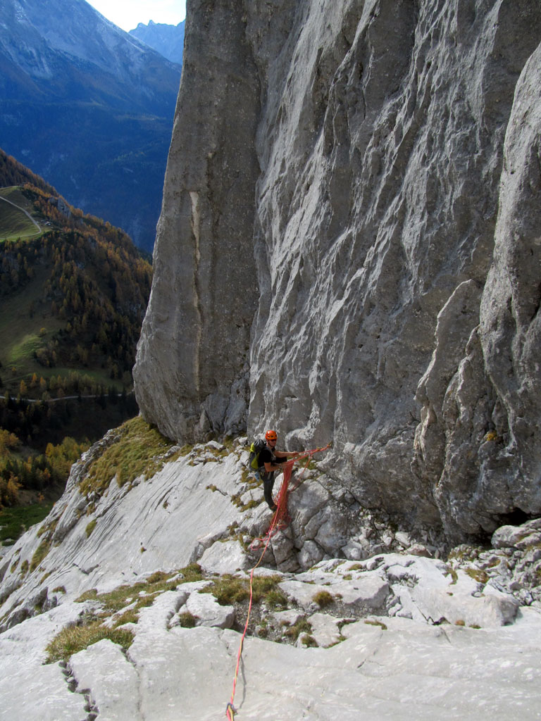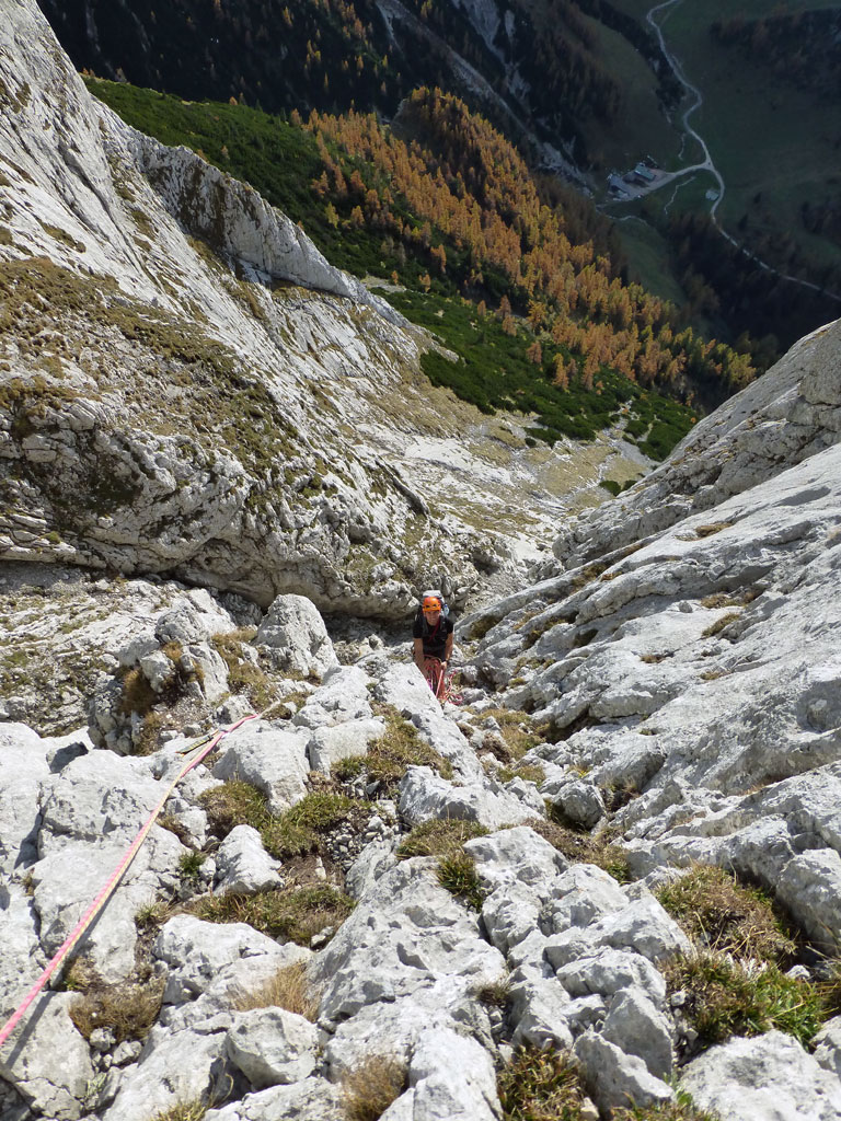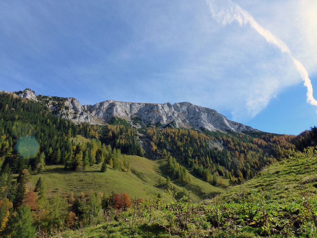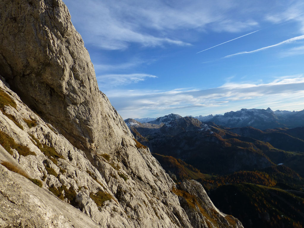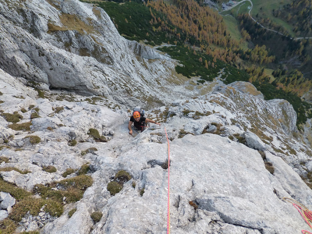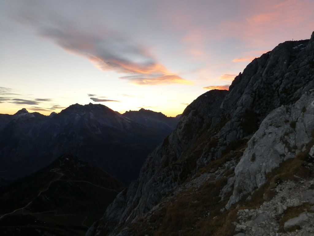 Herbstliche Nachmittags-Klettertour mit Markus vom Parkplatz Hinterbrand über die Mitterkaseralm zu den Südwestabbrüche des Hohen Bretts. Der ursprünglich Plan war eigentlich die Jägerlatein (V) zu klettern, welche Andi, Chris und ich im Frühjahr aufgrund von Schneeregen nicht durchsteigen konnten. Doch trotz einer mehr als einstündigen Suche nach dem Einstieg war ich nicht mehr in der Lage, diesen schließlich zu finden. Somit wanderten wir unterhalb des rechten Pfeilers hinüber zum Kar und stiegen etwas genervt in die Sommer, Sonne, Sonnenschein (IV) mit den unverkennbaren goldenen Bohrhaken ein. Nach den ersten Seillängen war dann der Ärger der eigenen Unfähigkeit wegen komplett verflogen und wir genossen den warmen Herbsttag und die wunderschöne Route. Im Abendlicht gings dann wieder über das Jägerkreuz hinunter zur Mitterkaseralm und im Laufschritt zum Parkplatz.
