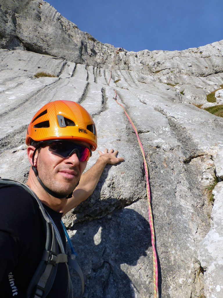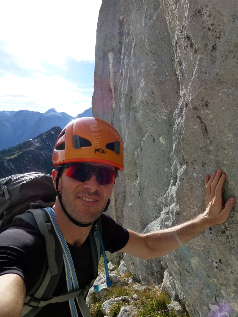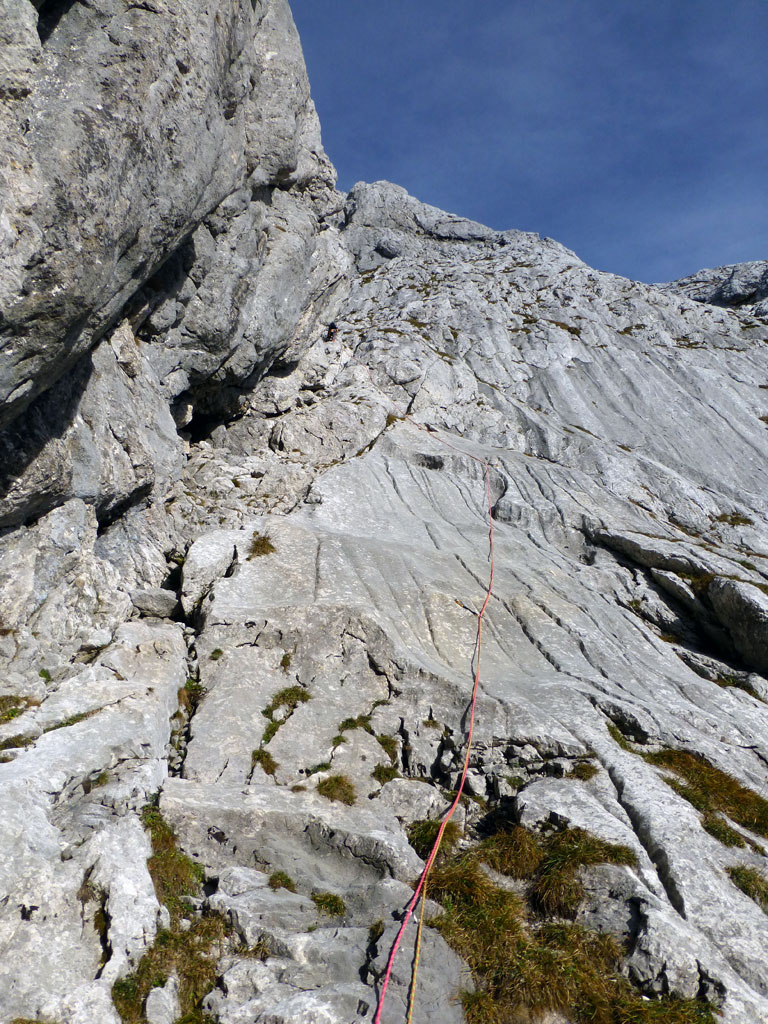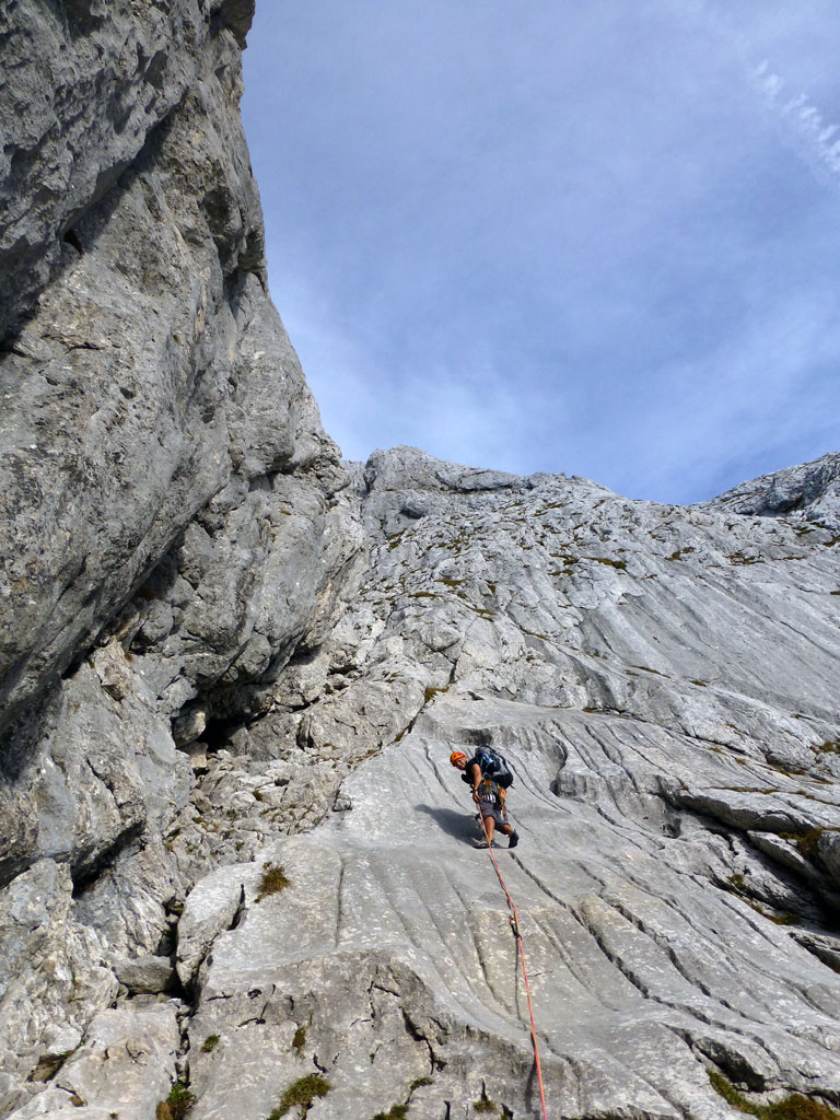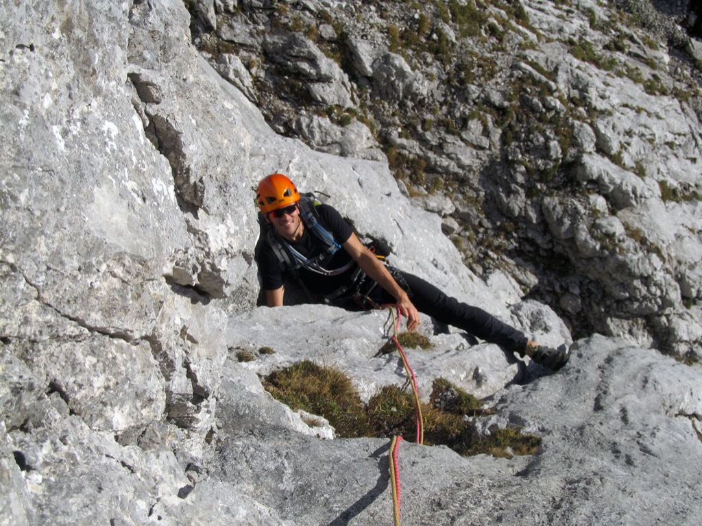 Herbstliche Nachmittags-Klettertour mit Markus vom Parkplatz Hinterbrand über die Mitterkaseralm zu den Südwestabbrüche des Hohen Bretts. Der ursprünglich Plan war eigentlich die Jägerlatein (V) zu klettern, welche Andi, Chris und ich im Frühjahr aufgrund von Schneeregen nicht durchsteigen konnten. Doch trotz einer mehr als einstündigen Suche nach dem Einstieg war ich nicht mehr in der Lage, diesen schließlich zu finden. Somit wanderten wir unterhalb des rechten Pfeilers hinüber zum Kar und stiegen etwas genervt in die Sommer, Sonne, Sonnenschein (IV) mit den unverkennbaren goldenen Bohrhaken ein. Nach den ersten Seillängen war dann der Ärger der eigenen Unfähigkeit wegen komplett verflogen und wir genossen den warmen Herbsttag und die wunderschöne Route. Im Abendlicht gings dann wieder über das Jägerkreuz hinunter zur Mitterkaseralm und im Laufschritt zum Parkplatz.