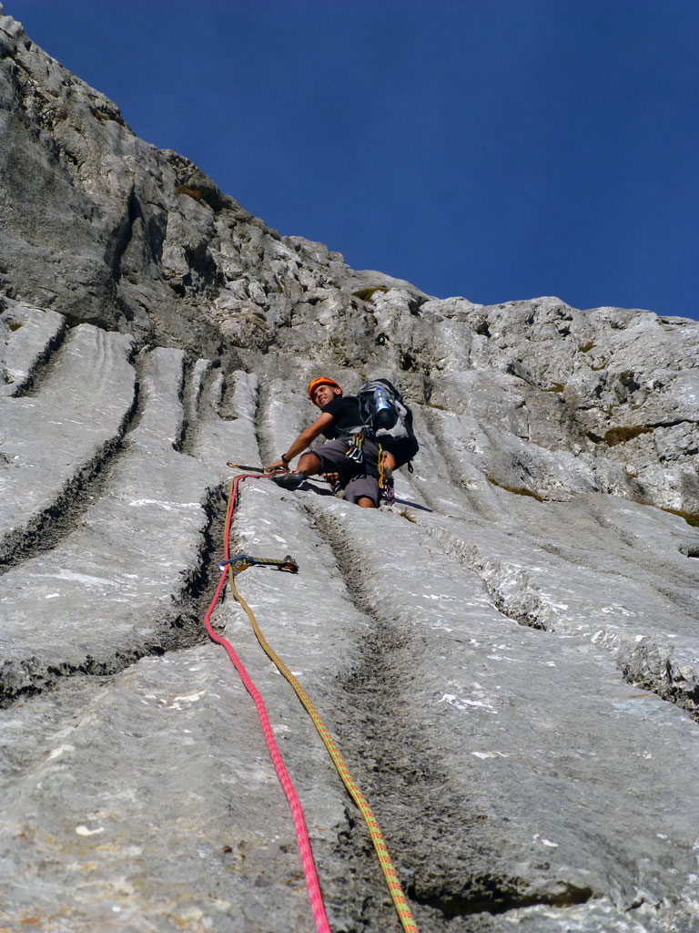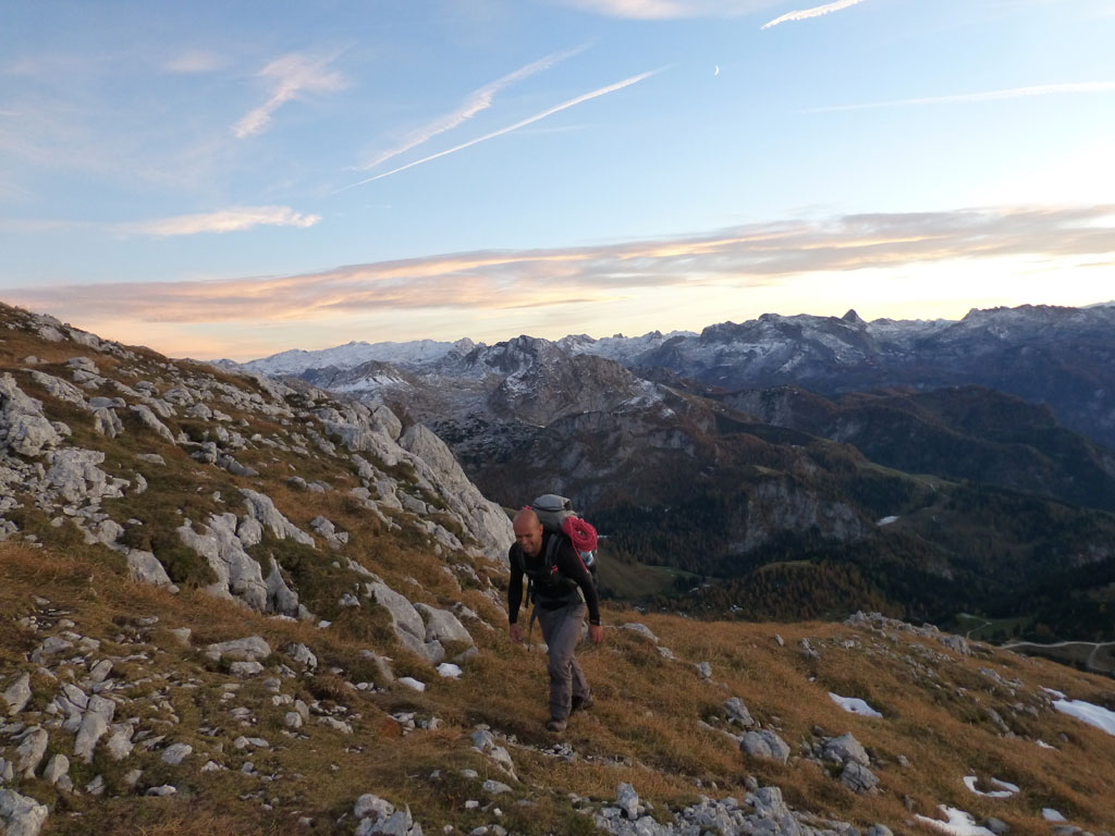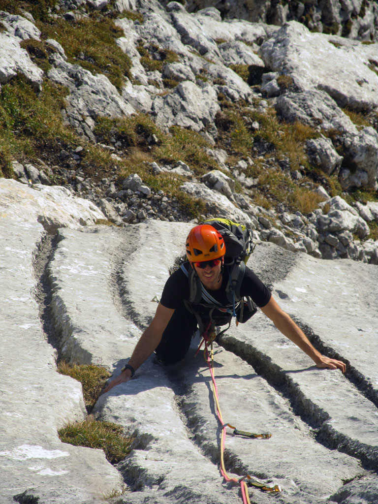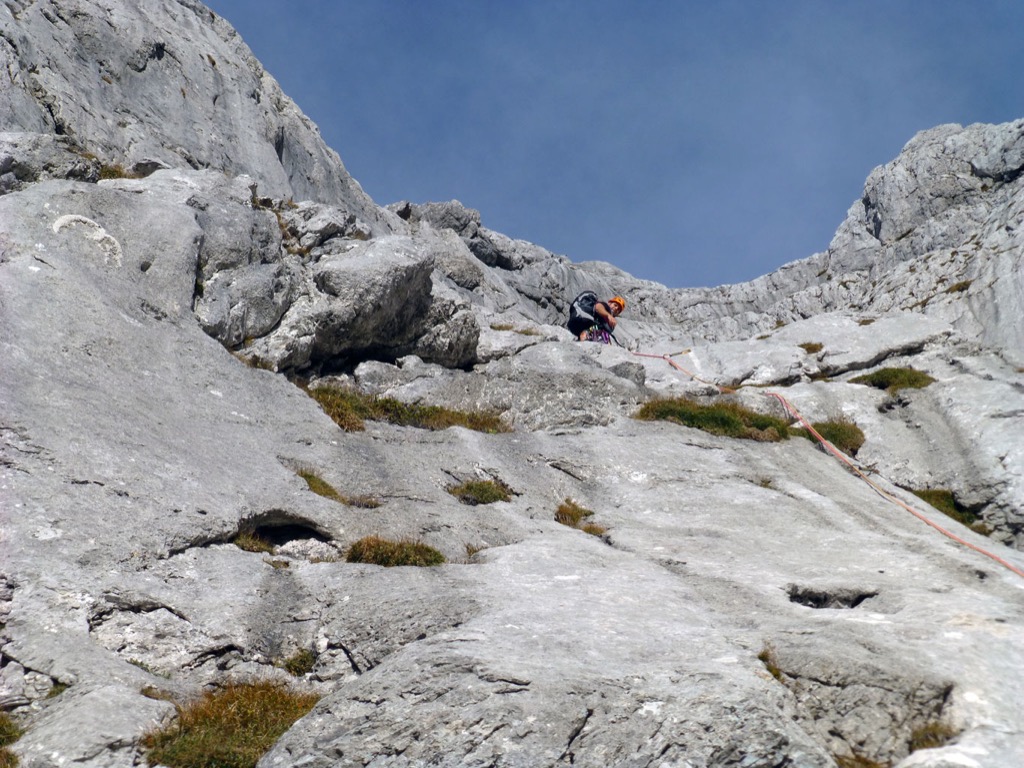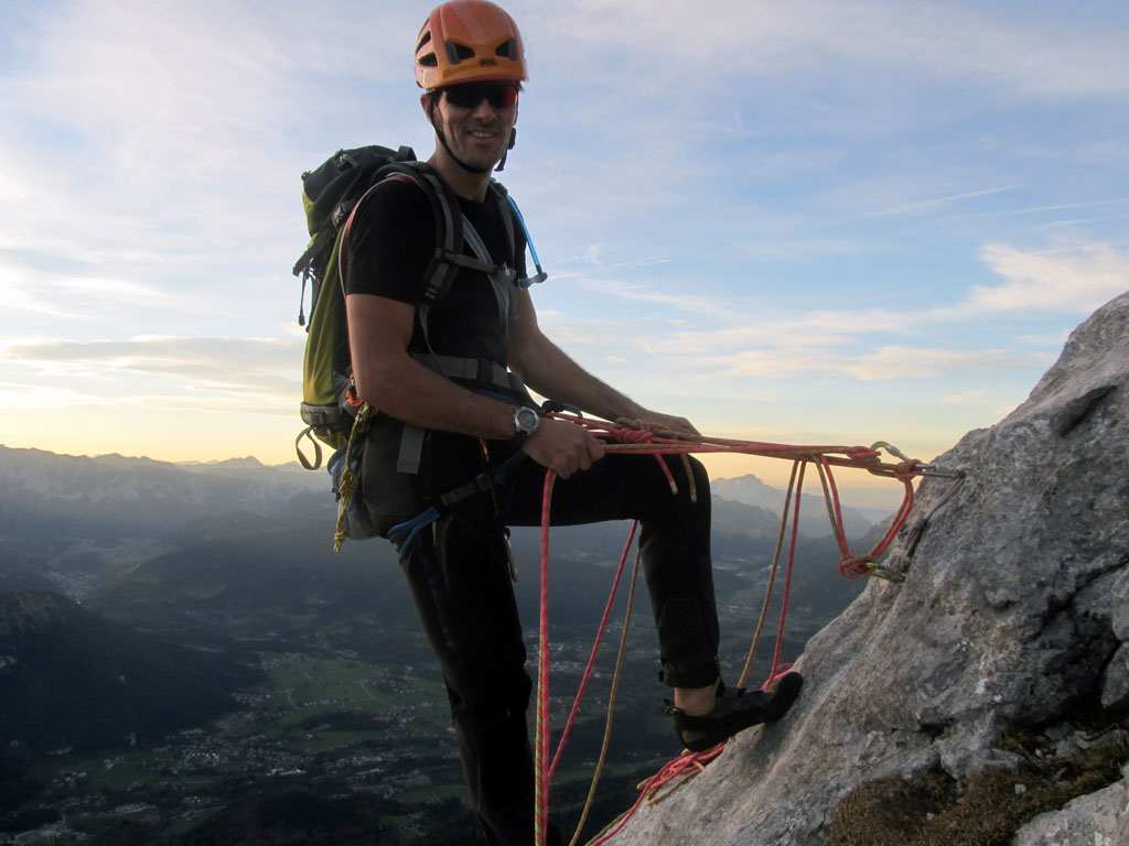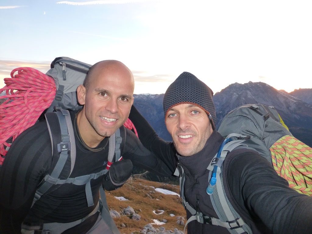 Herbstliche Nachmittags-Klettertour mit Markus vom Parkplatz Hinterbrand über die Mitterkaseralm zu den Südwestabbrüche des Hohen Bretts. Der ursprünglich Plan war eigentlich die Jägerlatein (V) zu klettern, welche Andi, Chris und ich im Frühjahr aufgrund von Schneeregen nicht durchsteigen konnten. Doch trotz einer mehr als einstündigen Suche nach dem Einstieg war ich nicht mehr in der Lage, diesen schließlich zu finden. Somit wanderten wir unterhalb des rechten Pfeilers hinüber zum Kar und stiegen etwas genervt in die Sommer, Sonne, Sonnenschein (IV) mit den unverkennbaren goldenen Bohrhaken ein. Nach den ersten Seillängen war dann der Ärger der eigenen Unfähigkeit wegen komplett verflogen und wir genossen den warmen Herbsttag und die wunderschöne Route. Im Abendlicht gings dann wieder über das Jägerkreuz hinunter zur Mitterkaseralm und im Laufschritt zum Parkplatz.