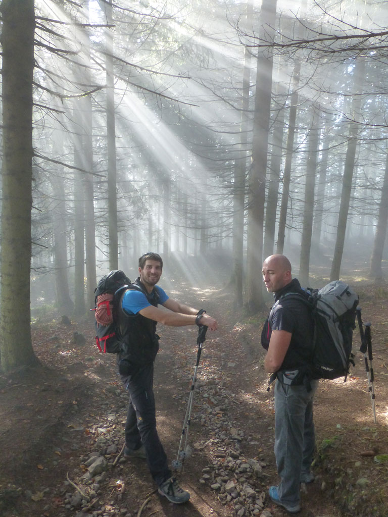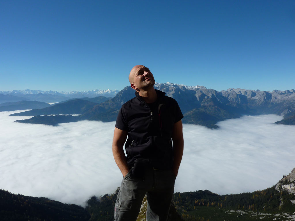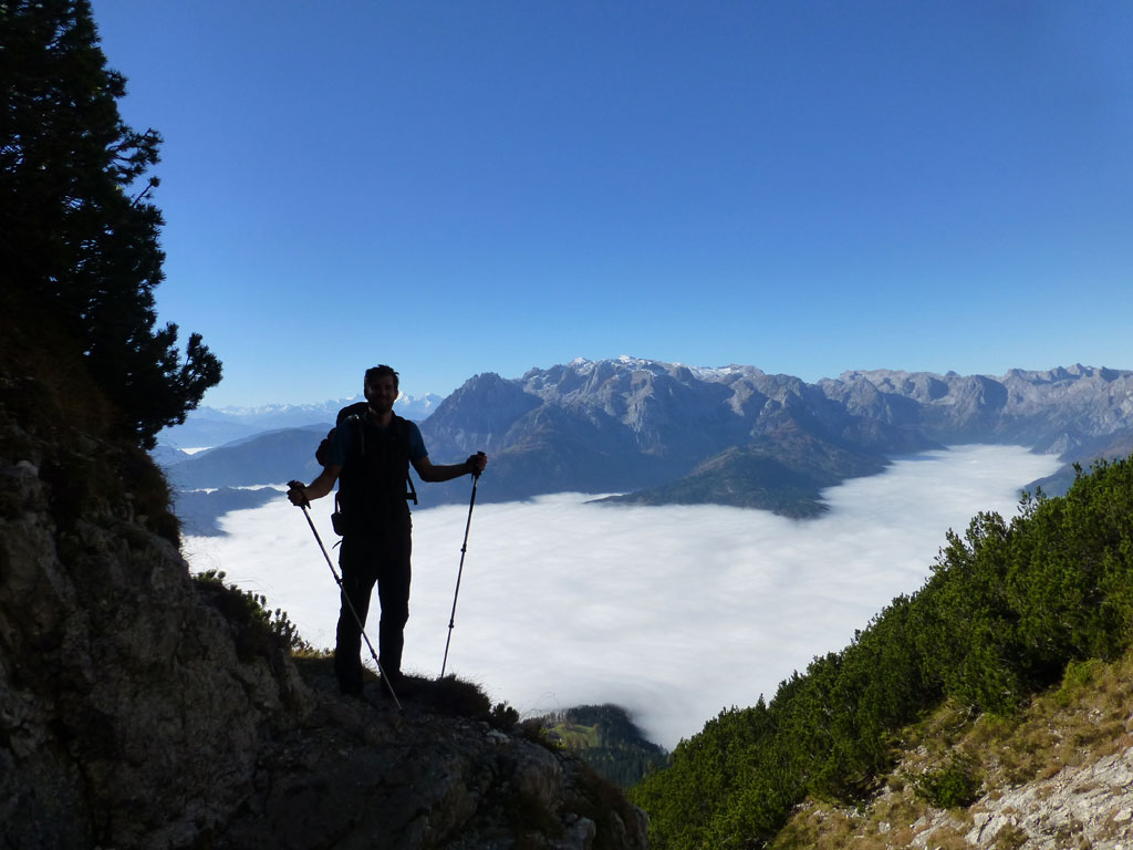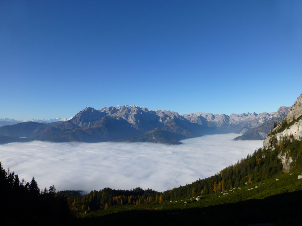 Marschierten wir vom Parkplatz weg in Richtung Mahdegg Alm noch im tiefen Nebel, so strahlte oberhalb von etwa 1200 Meter Seehöhe die Sonne, und wir freuten uns schon wie kleine Kinder auf diese Klettertour, die wir schon im letzten Jahr als Dreierseilschaft am Programm hatten. Schließlich am Einstieg zur Route angekommen, war uns allen die Ernüchterung ins Gesicht geschrieben, zumal sich bereits eine Seilschaft in der ersten Seillänge herumplagte, aber schon ein weiteres Kletterduo sich für den Aufstieg vorbereitete. Der Rest ist Geschichte, und ich erspare es mir hier irgendwelche Details über versch…. Pensionisten, die unter der Woche nichts besseres zu tun haben, als auf Bergen umherzueiern, anzuführen. Fakt ist, das Klettern konnten wir uns sonst wo hinstecken, die zweite Seilschaft kämpft wahrscheinlich immer noch in der dritten oder vierten Seillänge mit dem Fels, und die Werfenerhütte verkauft Bier und Apfelsaft…