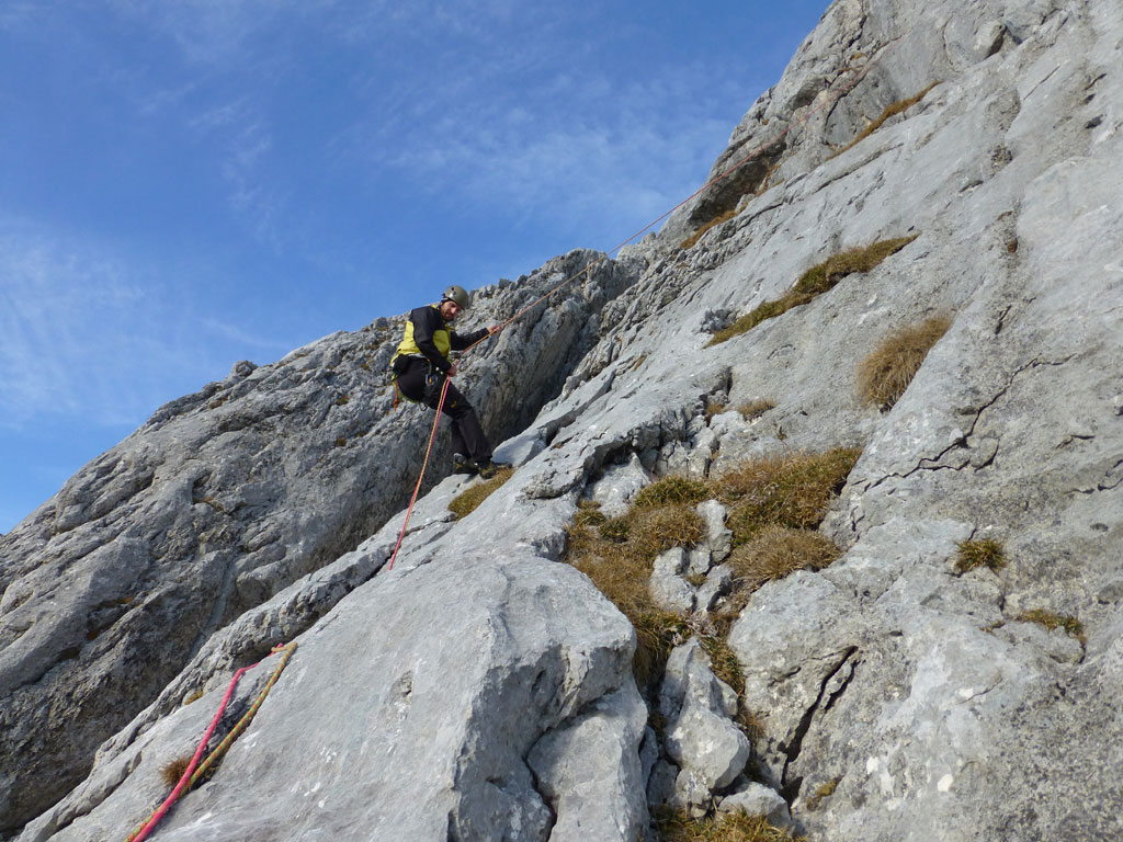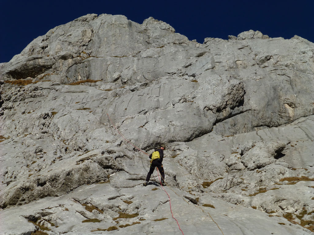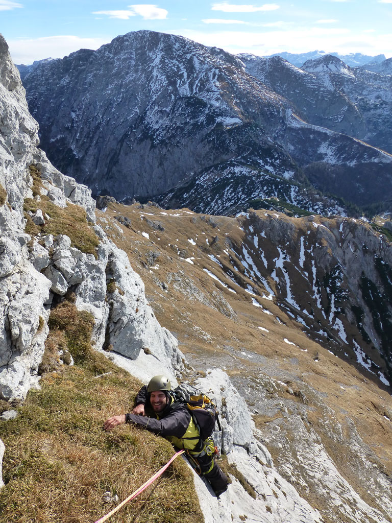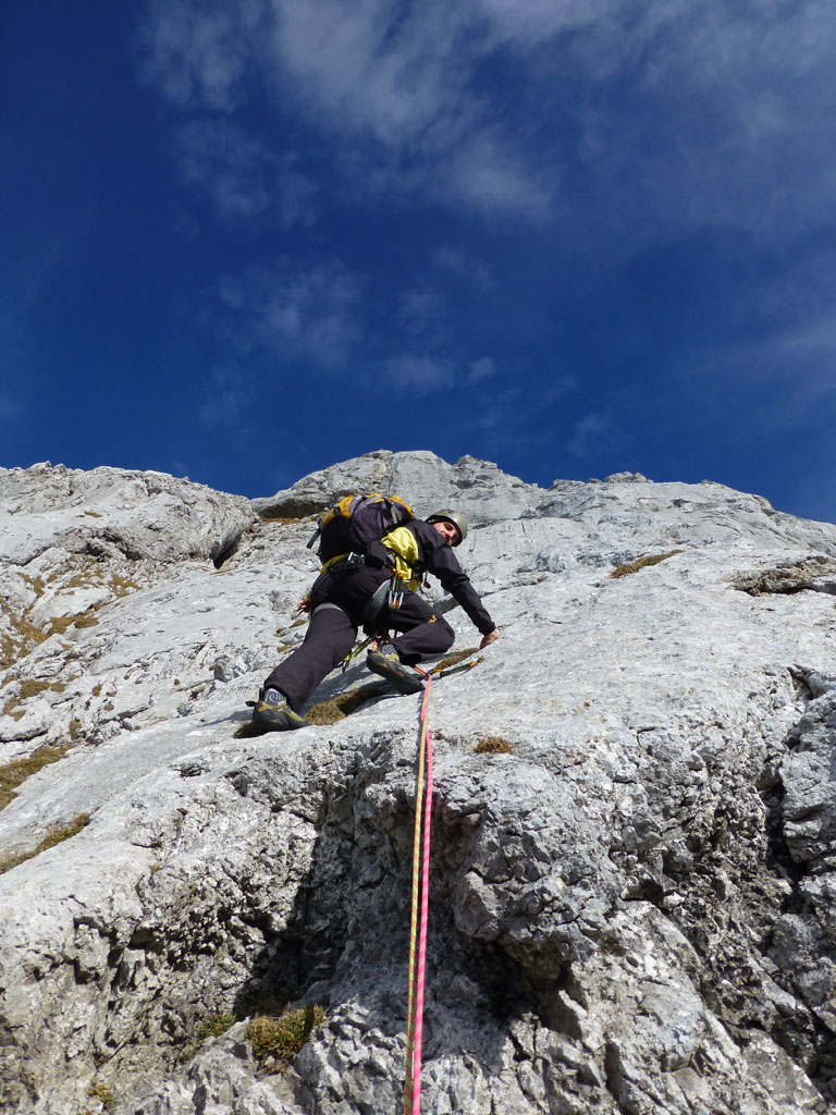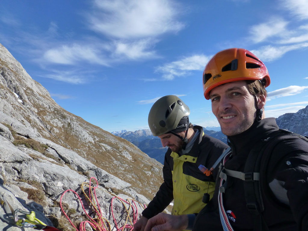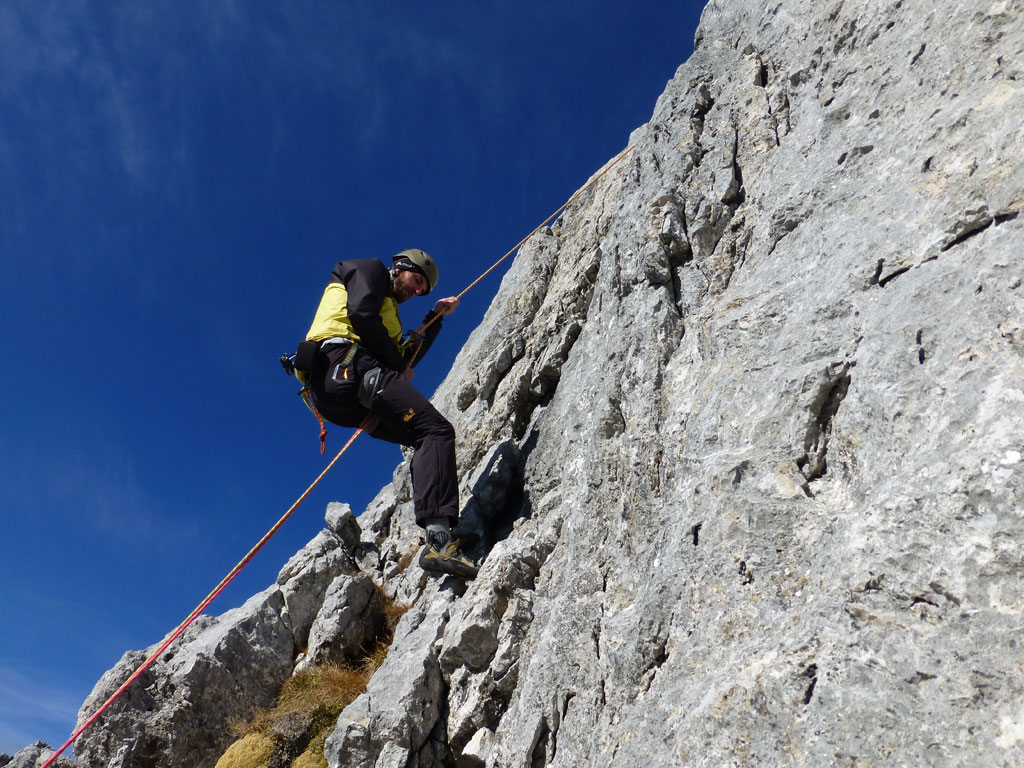 Klettertour mit Andi über die Route Herbsttraum (VI) zum Jägerkreuz am Hohen Brett. Das anhaltend schöne Herbstwetter motivierte uns nach zwei Tagen den Südwestabbrüche am Hohen Brett wieder unsere Aufwartung zu machen, und nach der Made in Austria nun auch die Herbsttraum zu klettern. Alles in allem eine wunderschöne Route mit bester Absicherung, über die wir dieses Mal abseilten und dabei beschlossen, bei nächster Gelegenheit, aber zumindest im nächsten Jahr die schönsten Seillängen aller Routen am Jägerkreuz zu kombinieren.