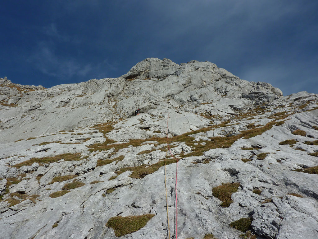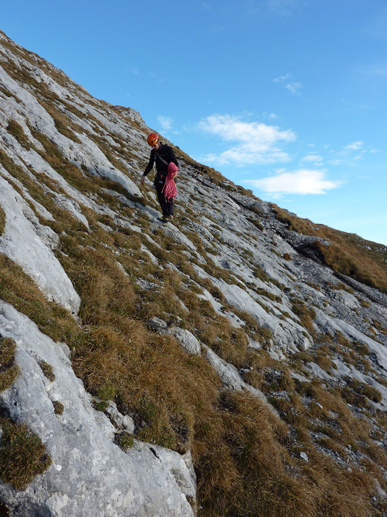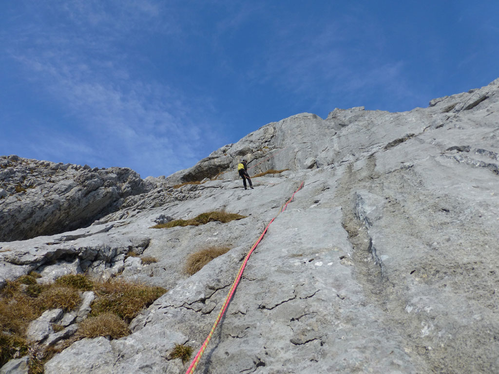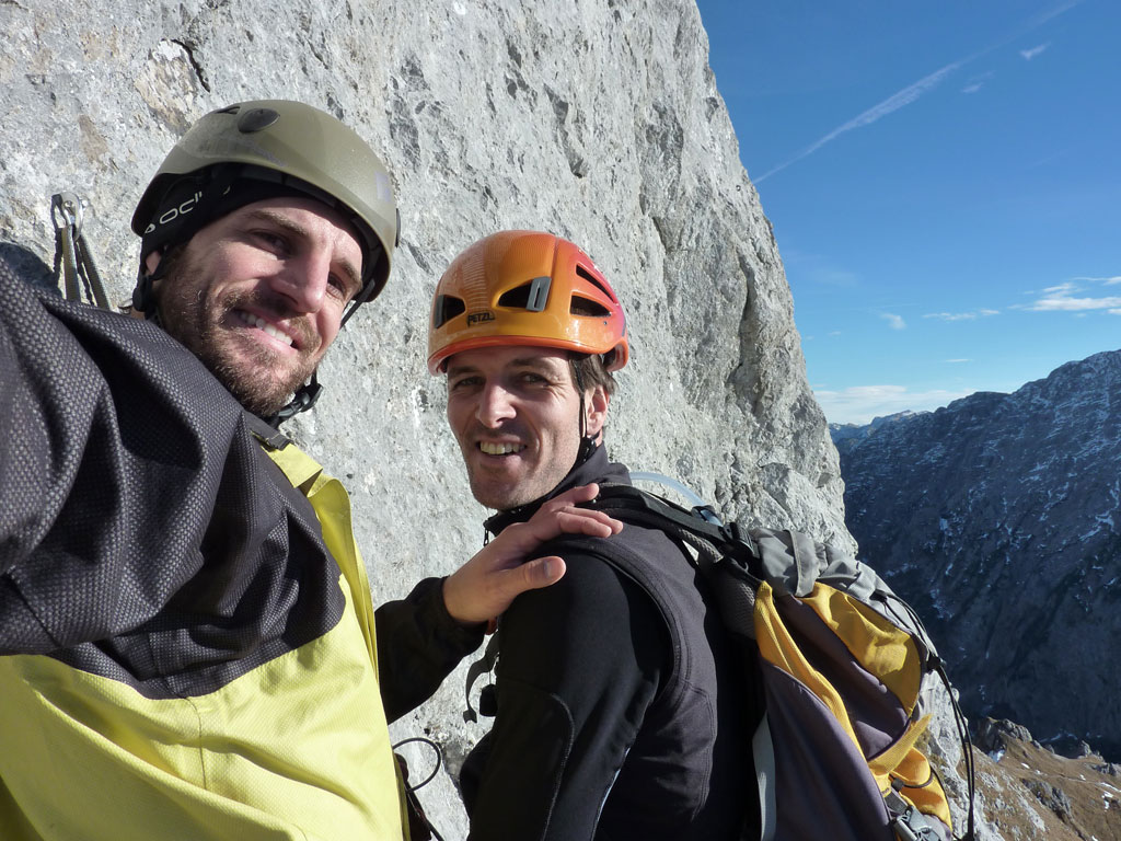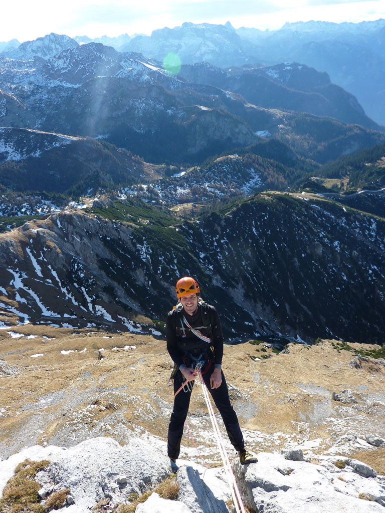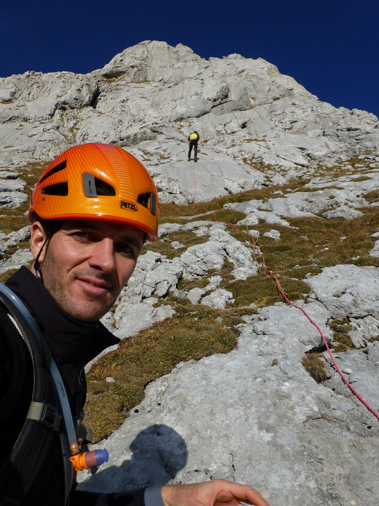 Klettertour mit Andi über die Route Herbsttraum (VI) zum Jägerkreuz am Hohen Brett. Das anhaltend schöne Herbstwetter motivierte uns nach zwei Tagen den Südwestabbrüche am Hohen Brett wieder unsere Aufwartung zu machen, und nach der Made in Austria nun auch die Herbsttraum zu klettern. Alles in allem eine wunderschöne Route mit bester Absicherung, über die wir dieses Mal abseilten und dabei beschlossen, bei nächster Gelegenheit, aber zumindest im nächsten Jahr die schönsten Seillängen aller Routen am Jägerkreuz zu kombinieren.