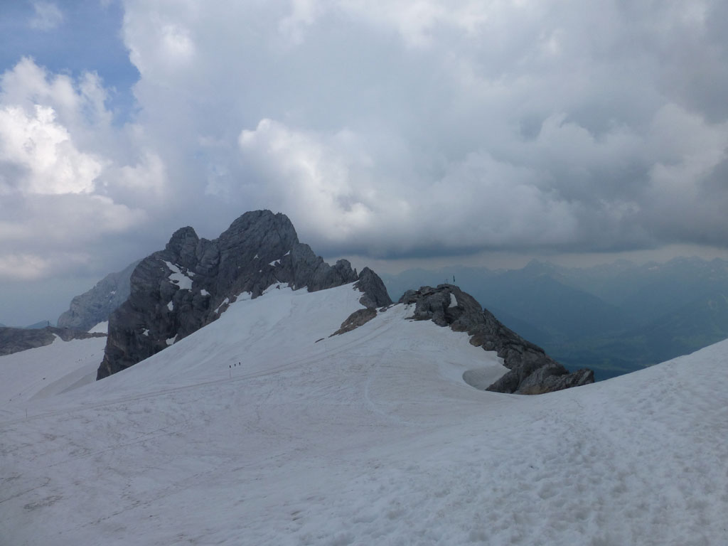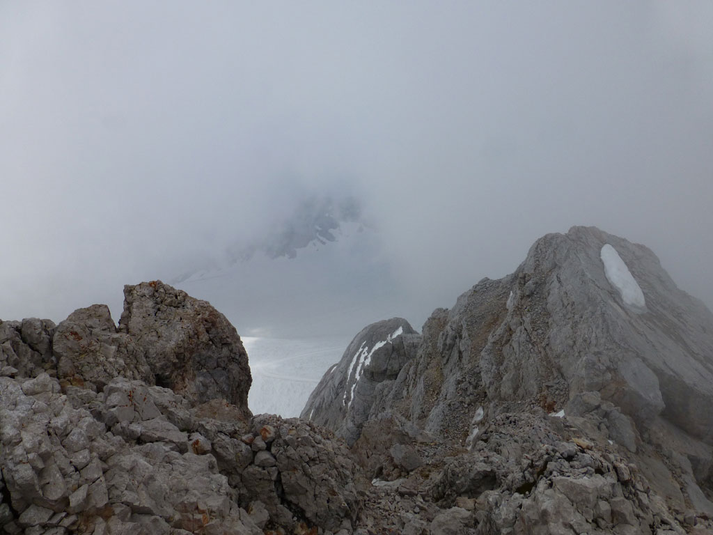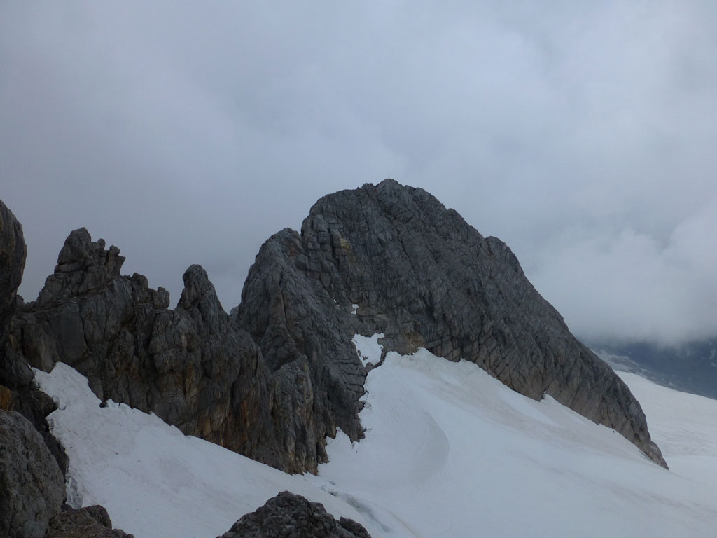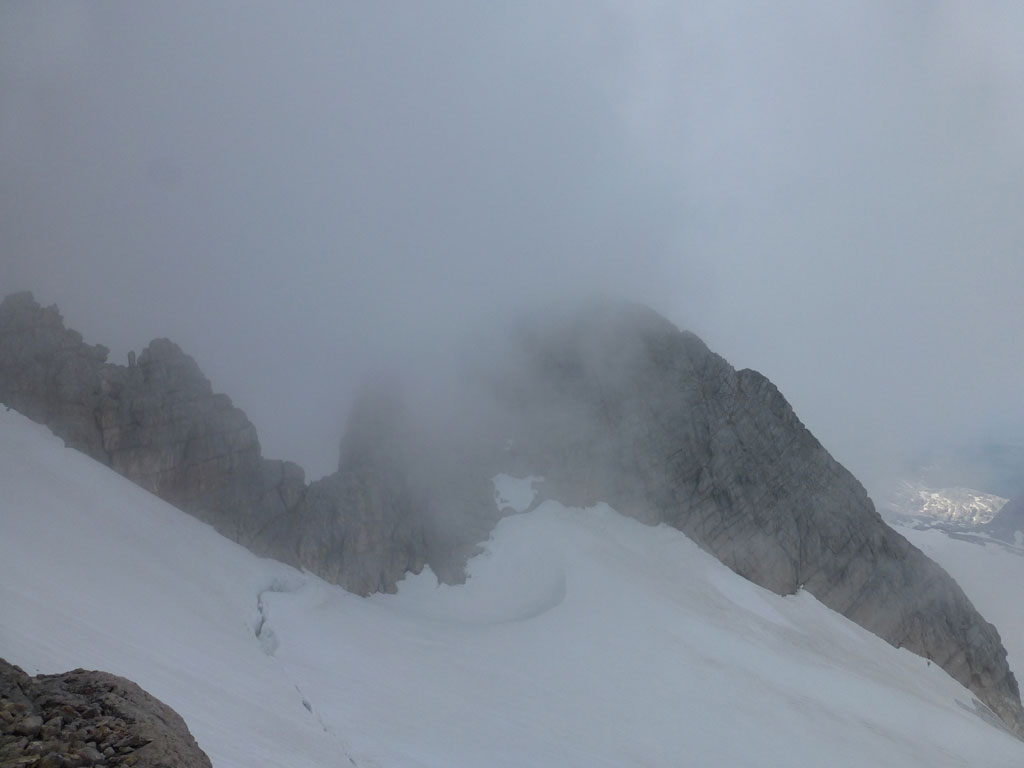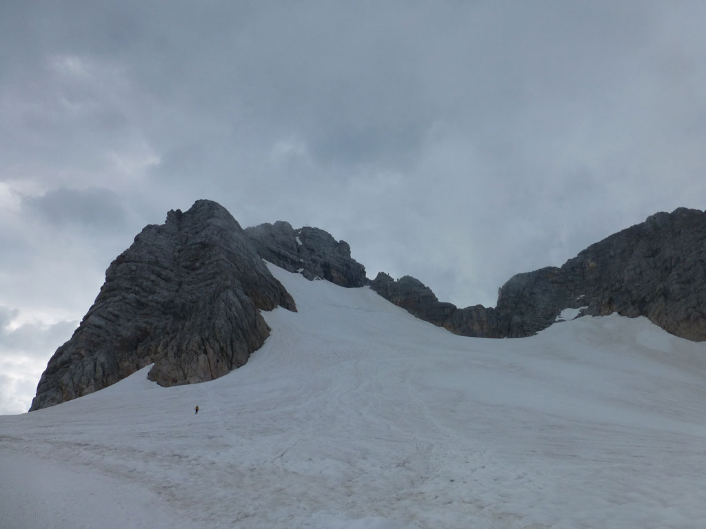 Die wirklich gelungene und durchaus sinnvolle Kombination der drei versicherten Anstiege bis zum Gipfel des Hohen Dachsteins lässt keine Wünsche offen. Vor allem die perfekten Einblicke in die mächtige Südwand mit den unter anderem klassischen Kletterouten wie Steiner- und Pichlweg sind Grund genug, früher oder später auch diese Wand einmal zu besteigen. Nach dem Johann Klettersteig verdichtete sich ab der Seethalerhütte die Bewölkung deutlich, und es begann leicht zu nieseln. Somit blieben mir die sonst üblichen Menschenmassen am Schulteranstieg zum, und in erster Linie auch am Gipfel erspart. Am Rückweg über den Hallstätter Gletscher entschloss ich mich für die Variante ‚Schnellabstieg‘ und leistete mir den Luxus einer Seilbahnfahrt.