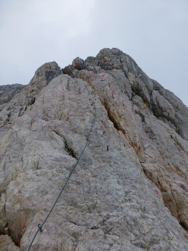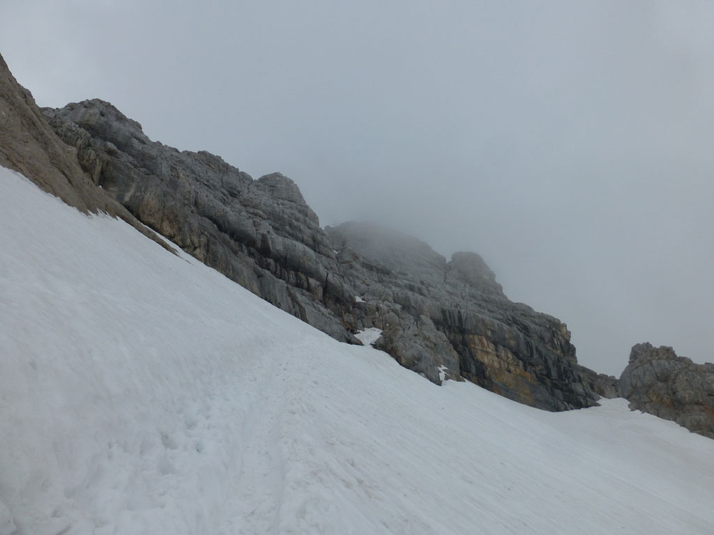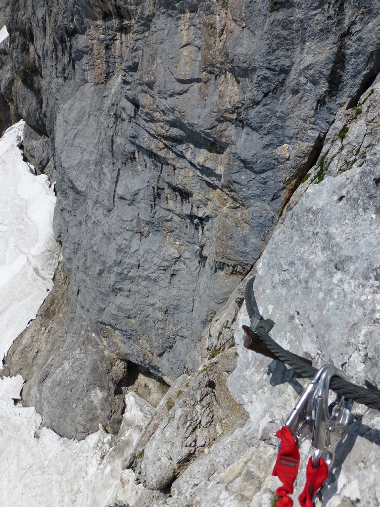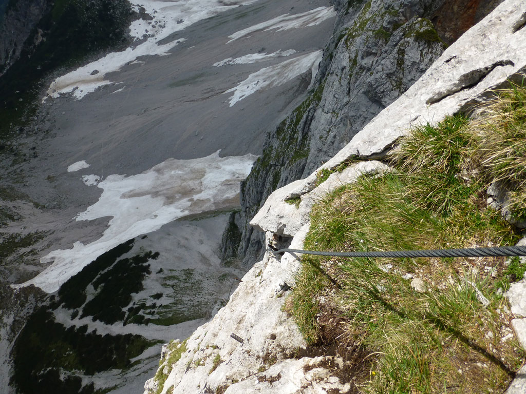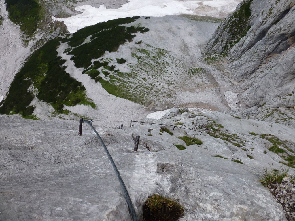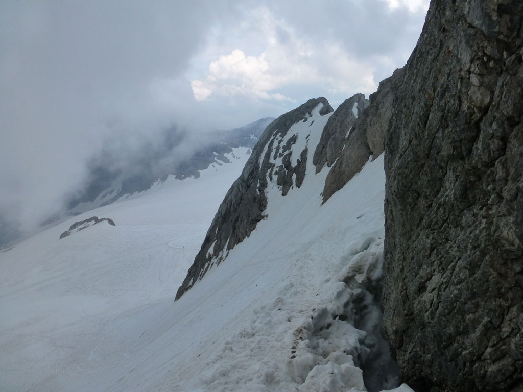 Die wirklich gelungene und durchaus sinnvolle Kombination der drei versicherten Anstiege bis zum Gipfel des Hohen Dachsteins lässt keine Wünsche offen. Vor allem die perfekten Einblicke in die mächtige Südwand mit den unter anderem klassischen Kletterouten wie Steiner- und Pichlweg sind Grund genug, früher oder später auch diese Wand einmal zu besteigen. Nach dem Johann Klettersteig verdichtete sich ab der Seethalerhütte die Bewölkung deutlich, und es begann leicht zu nieseln. Somit blieben mir die sonst üblichen Menschenmassen am Schulteranstieg zum, und in erster Linie auch am Gipfel erspart. Am Rückweg über den Hallstätter Gletscher entschloss ich mich für die Variante ‚Schnellabstieg‘ und leistete mir den Luxus einer Seilbahnfahrt.