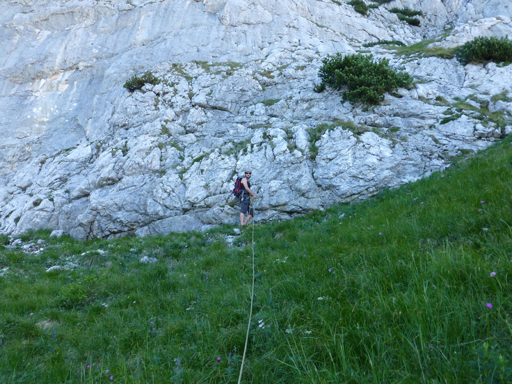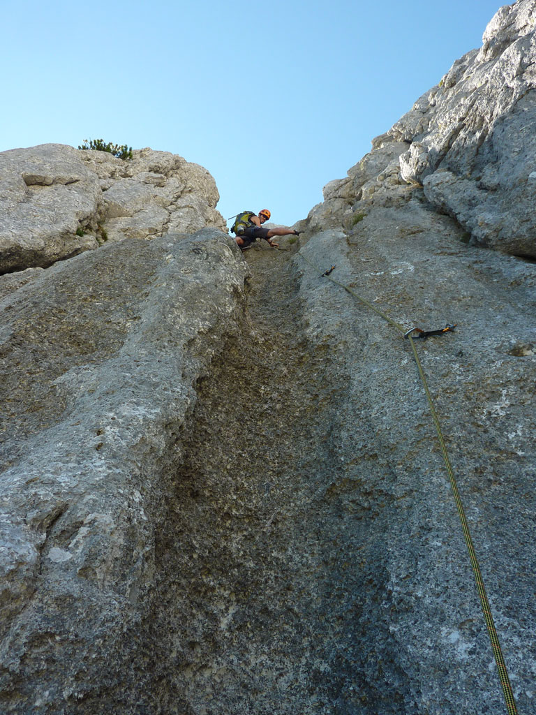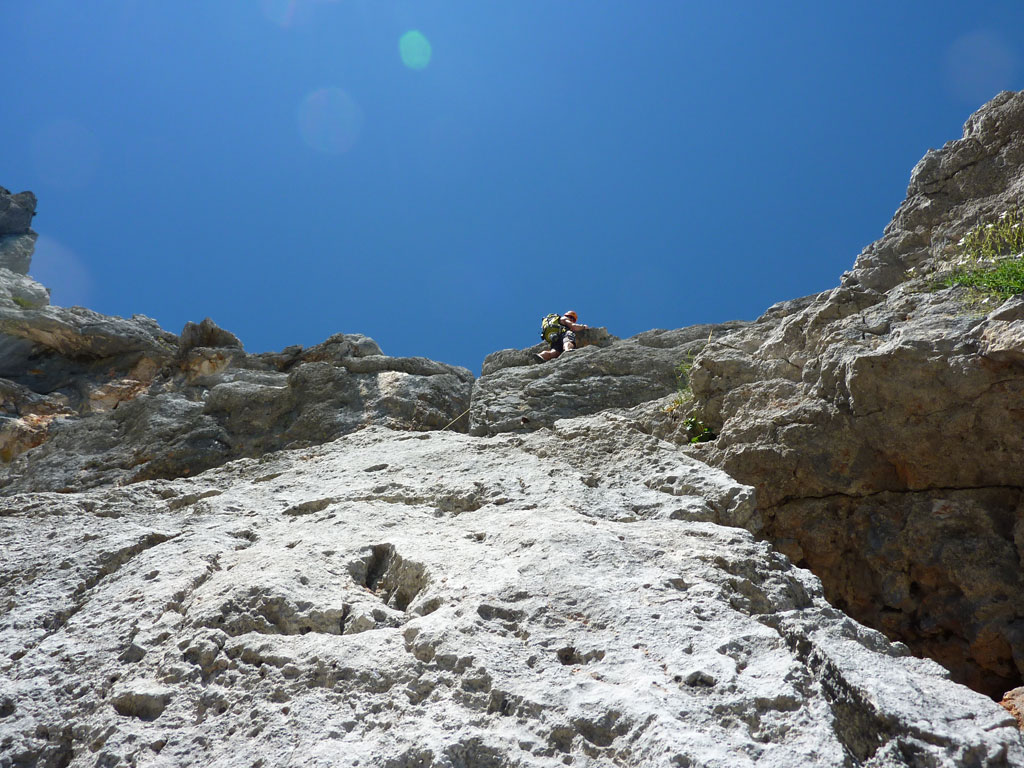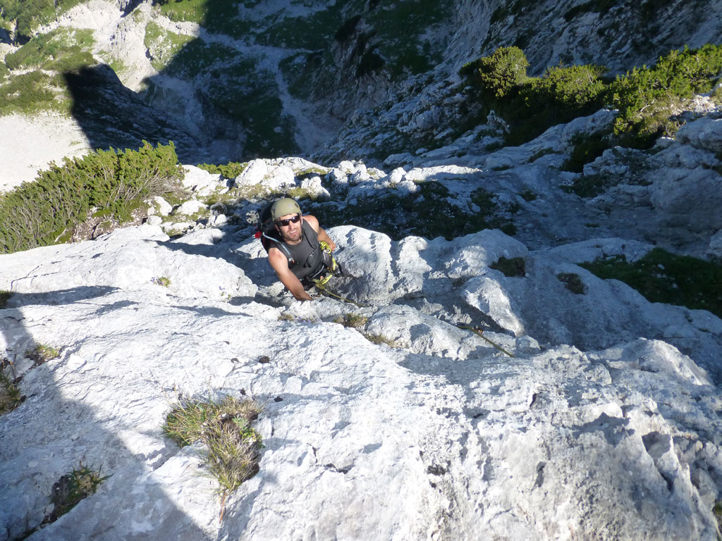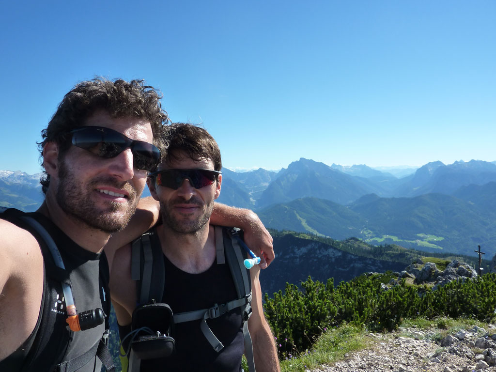 Endlich ergibt sich wieder einmal eine Klettertour mit Andi, und das an einem makellosen Sommertag. Wir entschieden uns für eine leichte Route am Untersberg, konkret dem Doriweg (V+) zwischen Berchtesgadener Hochthron und Gamsalmkopf. Mit dem Mountainbike ging es von Salzburg nach Marktschellenberg, weiter zum Roßboden, und schließlich zu Fuß über den direkten Zustieg via Hochkampschneid und Grubenalm zum Wandfuss. Die Route kann mit rauem, kompaktem Fels aufwarten und ist bestens, eigentlich schon etwas übertrieben abgesichert. Die Riesenwasserrille in der fünften Seillänge ist in der Tat vom Feinsten, und stellt in dieser Route vielleicht die schönste Kletterstelle dar. Wir verzichteten dann am Grubenpfad auf die letzten beiden Seillängen, wanderten dafür zum Gipfel des Berchtesgadener Hochthrons und schließlich zum Störhaus. Nach einer ausgiebigen Rast mit Bier und Kuchen, Schmöckern in der hiesigen Toposammlung ging es über Mittagsloch und Scheibenkaser zurück zu unseren Bikes. In der lauen Abendsonne fuhren wir entspannt zurück nach Salzburg und ließen den gelungen Tag noch einmal Revue passieren.