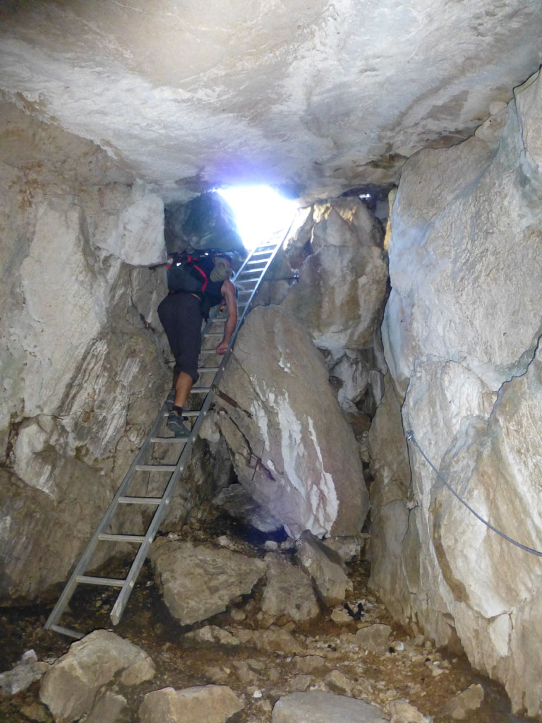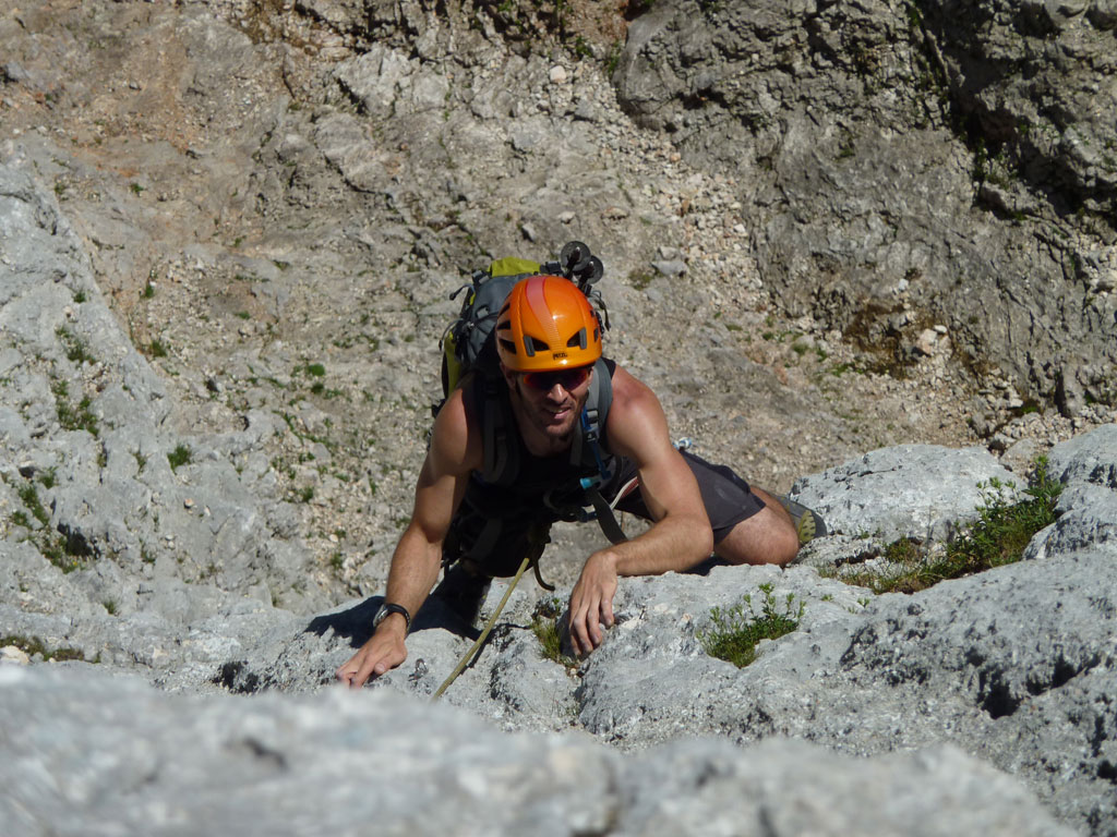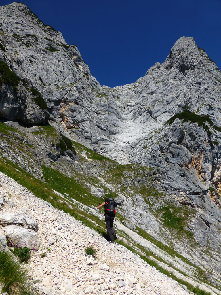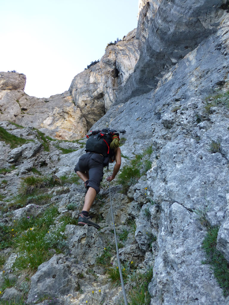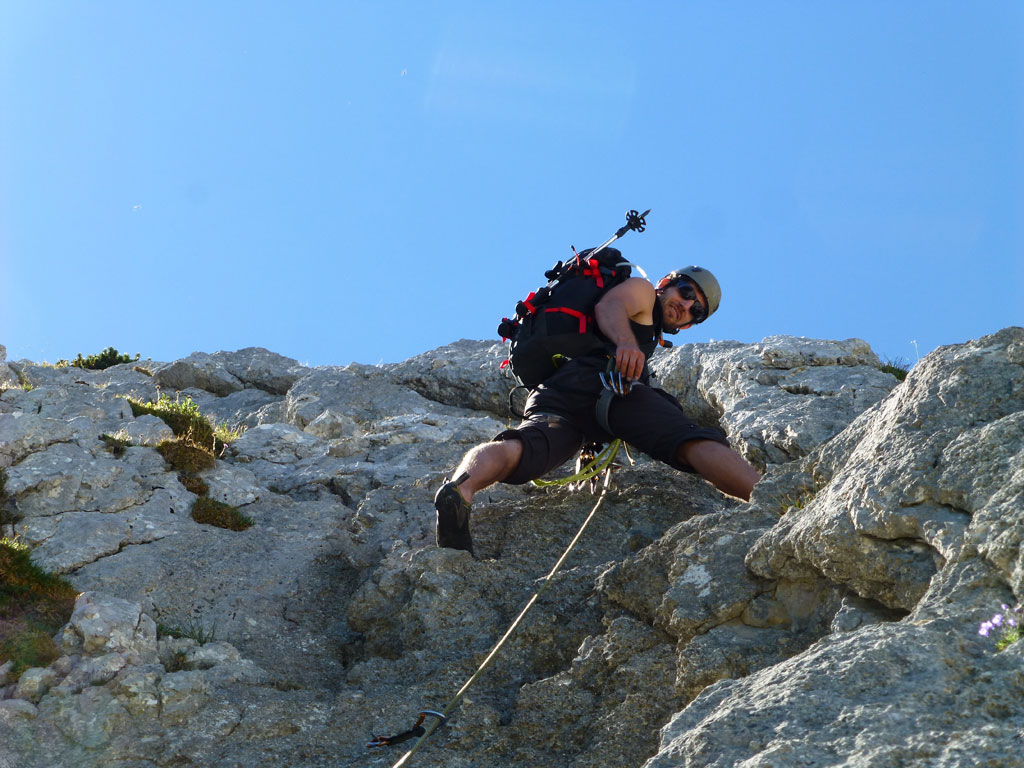 Endlich ergibt sich wieder einmal eine Klettertour mit Andi, und das an einem makellosen Sommertag. Wir entschieden uns für eine leichte Route am Untersberg, konkret dem Doriweg (V+) zwischen Berchtesgadener Hochthron und Gamsalmkopf. Mit dem Mountainbike ging es von Salzburg nach Marktschellenberg, weiter zum Roßboden, und schließlich zu Fuß über den direkten Zustieg via Hochkampschneid und Grubenalm zum Wandfuss. Die Route kann mit rauem, kompaktem Fels aufwarten und ist bestens, eigentlich schon etwas übertrieben abgesichert. Die Riesenwasserrille in der fünften Seillänge ist in der Tat vom Feinsten, und stellt in dieser Route vielleicht die schönste Kletterstelle dar. Wir verzichteten dann am Grubenpfad auf die letzten beiden Seillängen, wanderten dafür zum Gipfel des Berchtesgadener Hochthrons und schließlich zum Störhaus. Nach einer ausgiebigen Rast mit Bier und Kuchen, Schmöckern in der hiesigen Toposammlung ging es über Mittagsloch und Scheibenkaser zurück zu unseren Bikes. In der lauen Abendsonne fuhren wir entspannt zurück nach Salzburg und ließen den gelungen Tag noch einmal Revue passieren.
