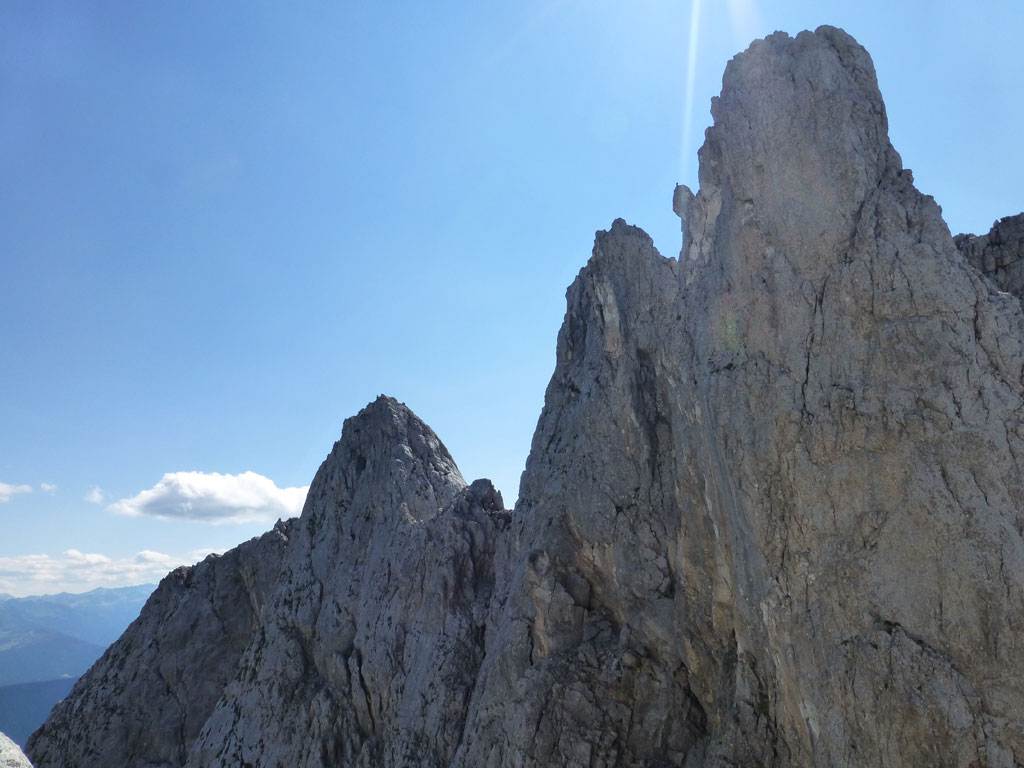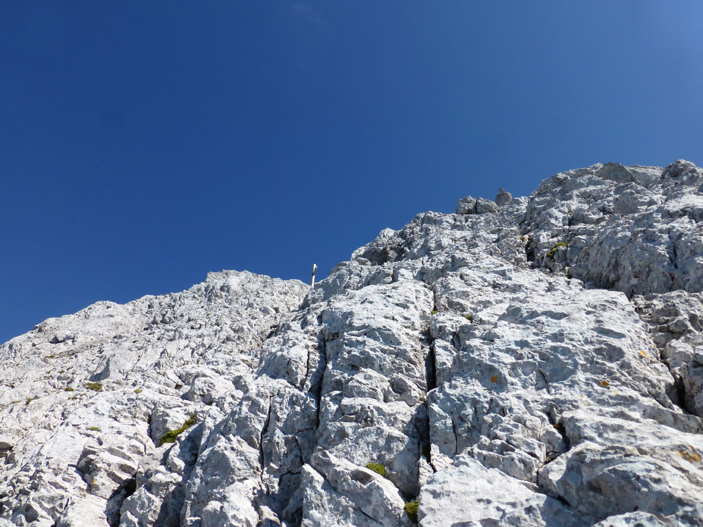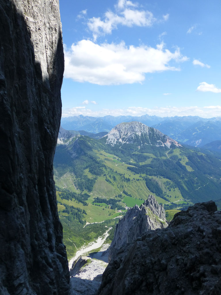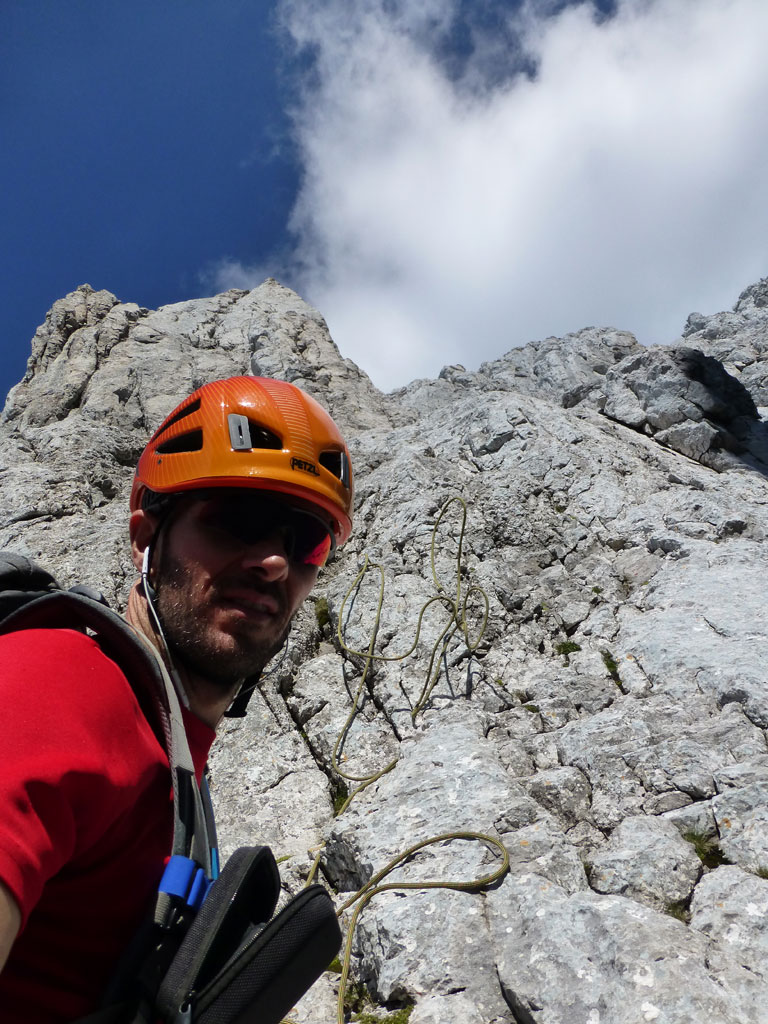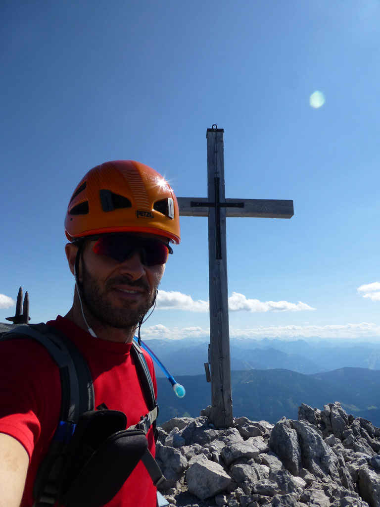 Extrem motiviert vom Klettern auf der Hofpürgelhütte am Vortag wollte ich den sonnigen Urlaubstag dazu nutzen, um der Bischofsmütze einen Besuch abzustatten. Den langwierigen Zustieg über die Forststrasse vom Parkplatz nahe Filzmoos legte ich mit dem Bike zurück, das ich auf Höhe der Kirchgasshütte deponierte und mich dann auf den Aufstieg zur Hofpürgelhütte machte. Knapp vor der Hütte zweigt der eigentliche Steig zur Bischofsmütze ab, der sich zunehmends aufsteilt, und knapp unter dem Einstieg zur Route zwischen kleiner und großer Bischofsmütze mit grünen Punkten den Weg weist. Am Einsteig angekommen, ist man gleich einmal mit einer extrem abgespeckten Kletterstelle konfrontiert, die ich gleich links umgangen bin, bevor man in leichter Kletterei die Scharte erreicht. Von dort gehts nochmals einige Höhenmeter mit mehr oder minder festem Gestein nach oben, bevor das Gipfelkreuz zum Vorschein kommt. Die Aussicht am Gipfel auf Gosaukamm und Dachstein war einmalig, doch viel mehr noch genoss ich das Privileg, heute ganz alleine auf diesem Berg sein zu dürfen… 🙂