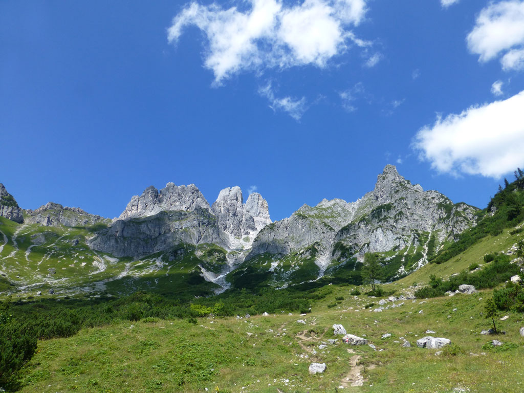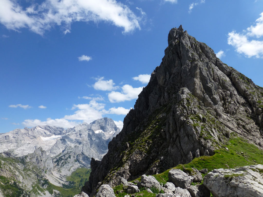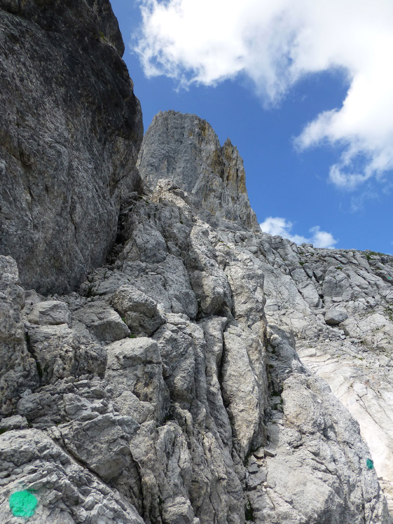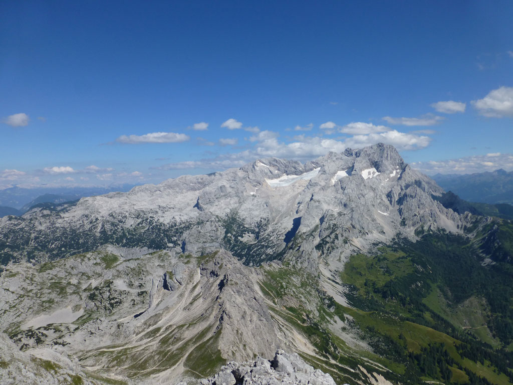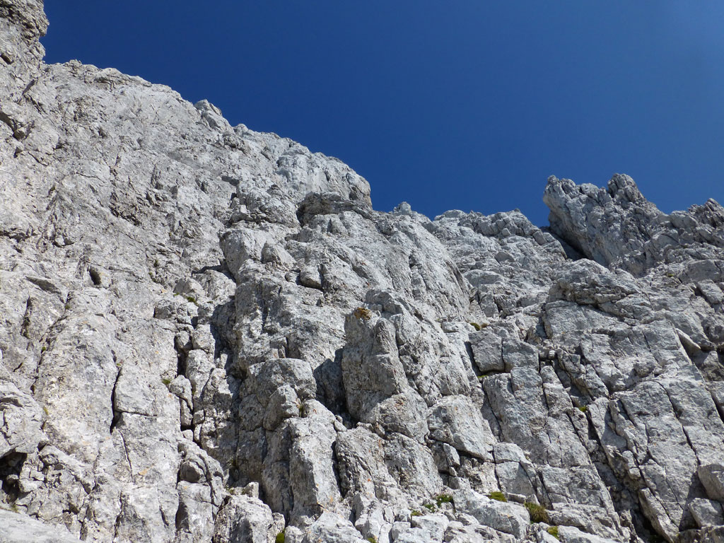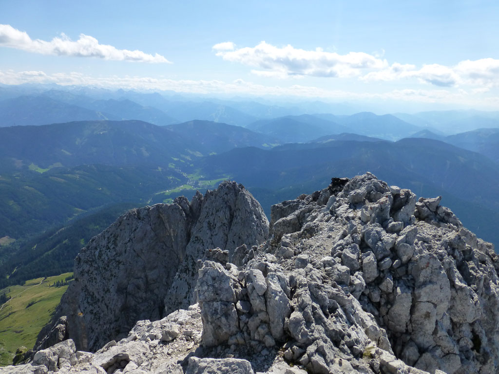 Extrem motiviert vom Klettern auf der Hofpürgelhütte am Vortag wollte ich den sonnigen Urlaubstag dazu nutzen, um der Bischofsmütze einen Besuch abzustatten. Den langwierigen Zustieg über die Forststrasse vom Parkplatz nahe Filzmoos legte ich mit dem Bike zurück, das ich auf Höhe der Kirchgasshütte deponierte und mich dann auf den Aufstieg zur Hofpürgelhütte machte. Knapp vor der Hütte zweigt der eigentliche Steig zur Bischofsmütze ab, der sich zunehmends aufsteilt, und knapp unter dem Einstieg zur Route zwischen kleiner und großer Bischofsmütze mit grünen Punkten den Weg weist. Am Einsteig angekommen, ist man gleich einmal mit einer extrem abgespeckten Kletterstelle konfrontiert, die ich gleich links umgangen bin, bevor man in leichter Kletterei die Scharte erreicht. Von dort gehts nochmals einige Höhenmeter mit mehr oder minder festem Gestein nach oben, bevor das Gipfelkreuz zum Vorschein kommt. Die Aussicht am Gipfel auf Gosaukamm und Dachstein war einmalig, doch viel mehr noch genoss ich das Privileg, heute ganz alleine auf diesem Berg sein zu dürfen… 🙂