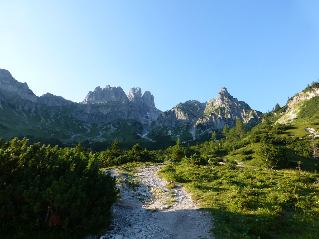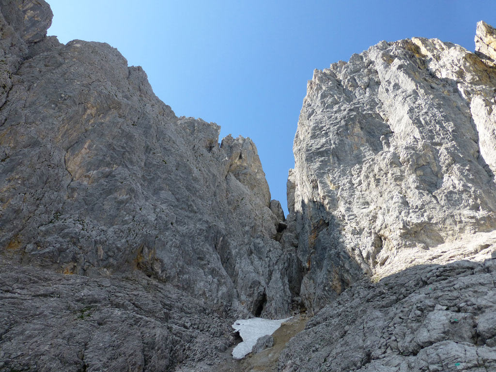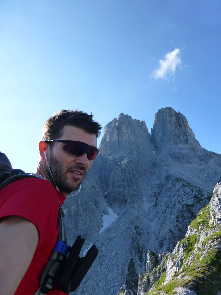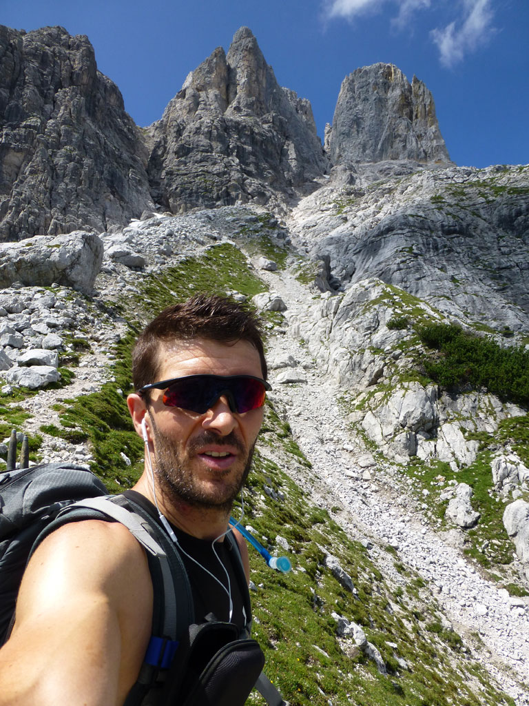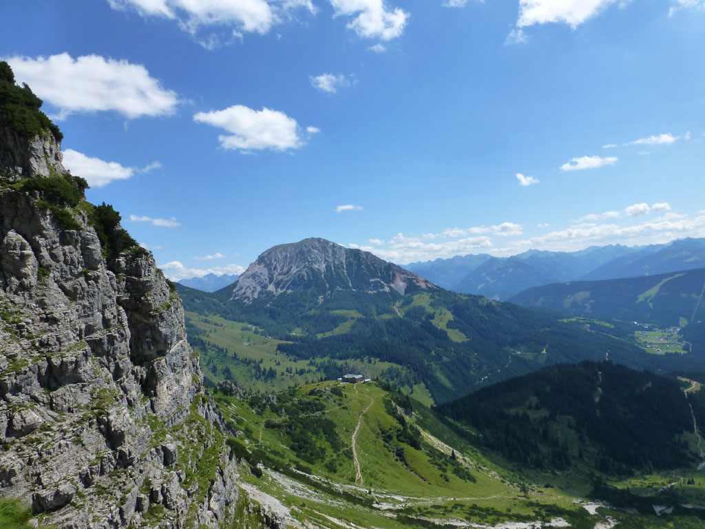 Extrem motiviert vom Klettern auf der Hofpürgelhütte am Vortag wollte ich den sonnigen Urlaubstag dazu nutzen, um der Bischofsmütze einen Besuch abzustatten. Den langwierigen Zustieg über die Forststrasse vom Parkplatz nahe Filzmoos legte ich mit dem Bike zurück, das ich auf Höhe der Kirchgasshütte deponierte und mich dann auf den Aufstieg zur Hofpürgelhütte machte. Knapp vor der Hütte zweigt der eigentliche Steig zur Bischofsmütze ab, der sich zunehmends aufsteilt, und knapp unter dem Einstieg zur Route zwischen kleiner und großer Bischofsmütze mit grünen Punkten den Weg weist. Am Einsteig angekommen, ist man gleich einmal mit einer extrem abgespeckten Kletterstelle konfrontiert, die ich gleich links umgangen bin, bevor man in leichter Kletterei die Scharte erreicht. Von dort gehts nochmals einige Höhenmeter mit mehr oder minder festem Gestein nach oben, bevor das Gipfelkreuz zum Vorschein kommt. Die Aussicht am Gipfel auf Gosaukamm und Dachstein war einmalig, doch viel mehr noch genoss ich das Privileg, heute ganz alleine auf diesem Berg sein zu dürfen… 🙂
