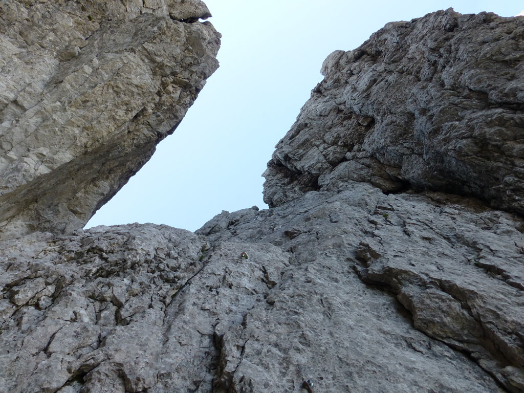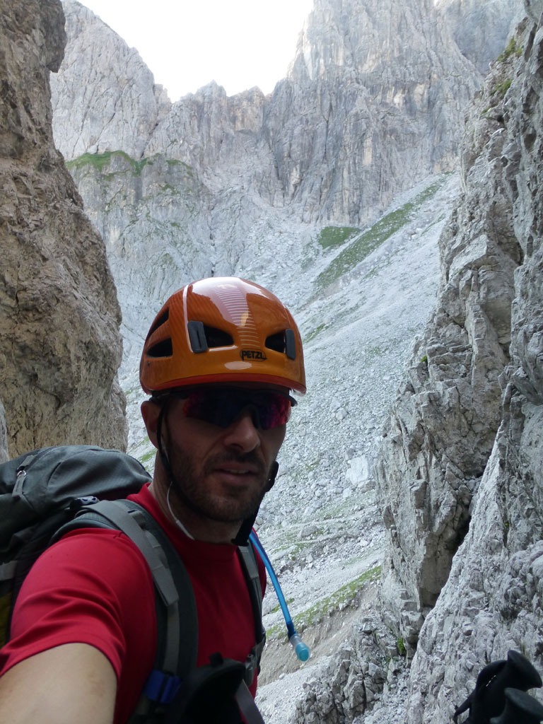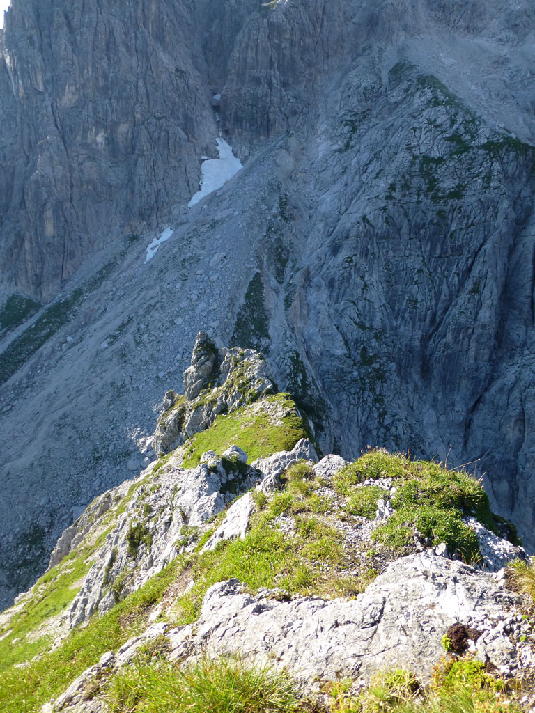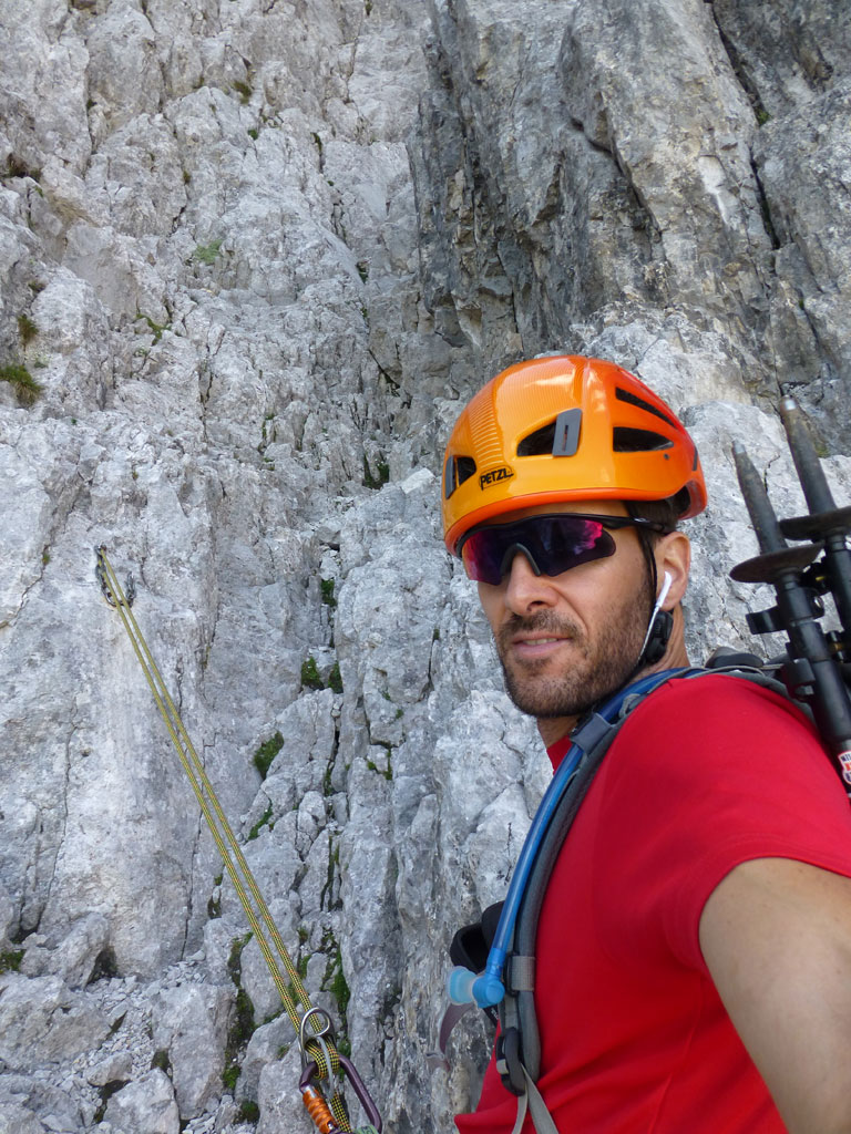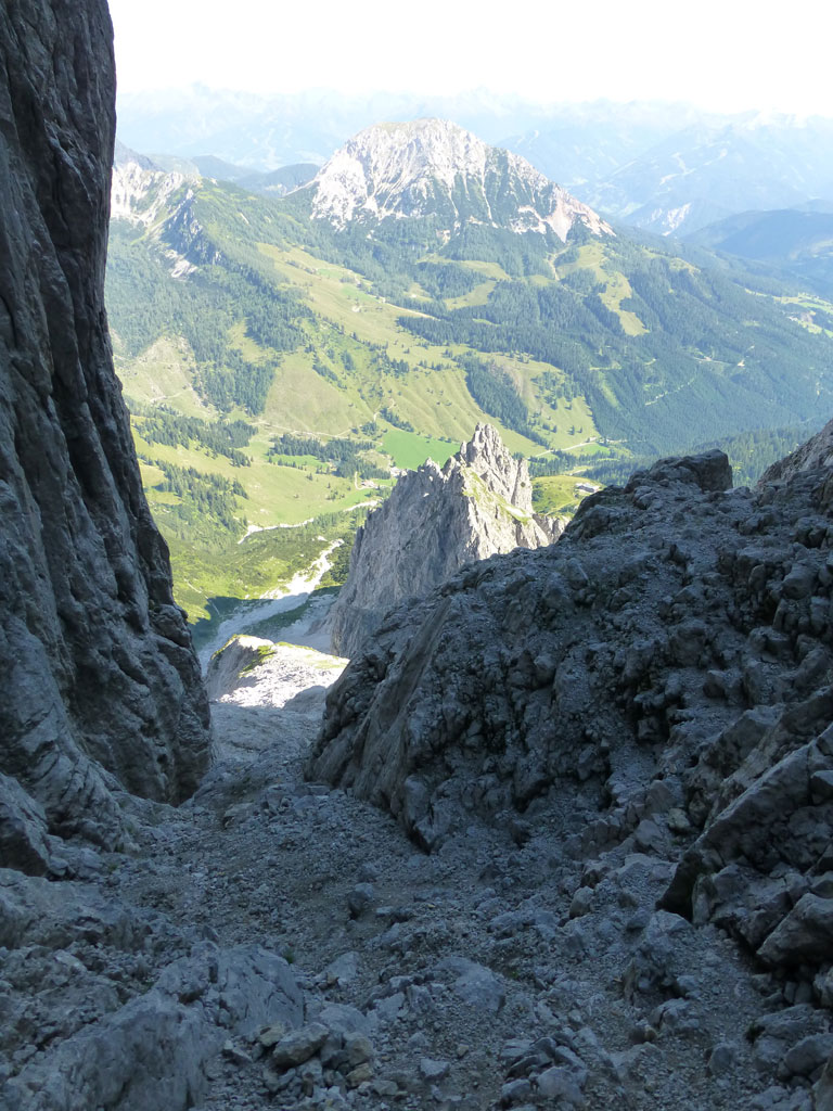Nach einer Trink- und Essenspause machte ich mich zuerst abkletternd, dann mittles Abseilen an den Abstieg. Um ehrlich zu sein war ich recht froh, dass ich mein 50-Meter Einfachseil vorsorglich mitgeschlepp hatte, denn es machte den Weg nach unten viel angenehmer, und auch schneller. Vor allem nachdem fast jeder Stand auch als orderlicher Abseilstand eingerichtet ist, geht das ganze relativ schnell, bevor man wieder beim Einstieg steht. Es war zwar schon etwas später als ich mich wieder am Steig in Richtung Hofpürgelhütte befand, doch als ich so neben dem Mosermandl nach unten wanderte, viel mir eine nicht zu steile Rinne auf den Rücken zum Gipfel auf. Also warum nicht noch schnell aufs Mosermandl, wenn man schon mal da ist? Vorweg gesagt, das ganze war schwachsinnig, die Rinne eine bröselige Katastrophe, doch das merkt man dann leider erst am Weg nach unten… Irgendwie gings dann schon mit viel Schwitzen und Hoffen, dass alles was man anrührt nicht gleich herausbricht. Die letzten Höhenmeter nach unten zum Einstieg der Rinne hab ich sogar noch mittels Abseilen an einem, sagen wir „brauchbaren“, Abseilstand zurückgelegt. Jedenfalls war ich zurück am Steig recht erleichtert, dass nix passiert ist, und werde mir zukünftig solche „Abstecher“ dreimal überlegen. Trotzdem war es eine super Tour in einer tollen Umgebung mit einem spannendem Gipfel, den ich im Winter sicherlich auch mal besteigen werde.