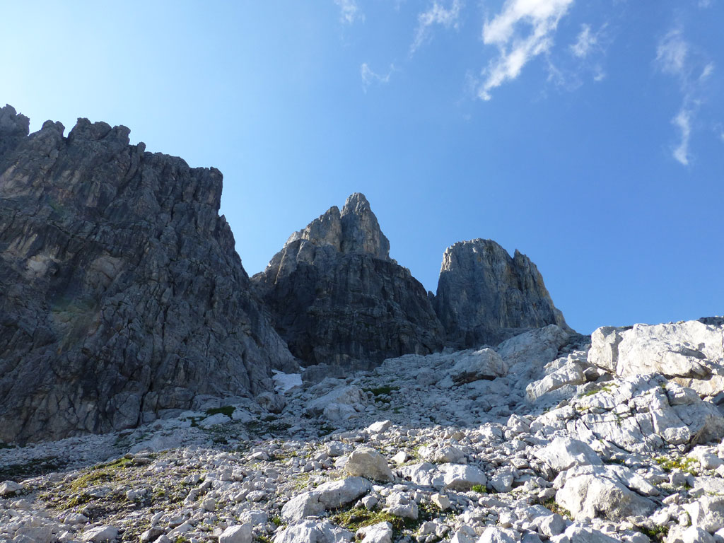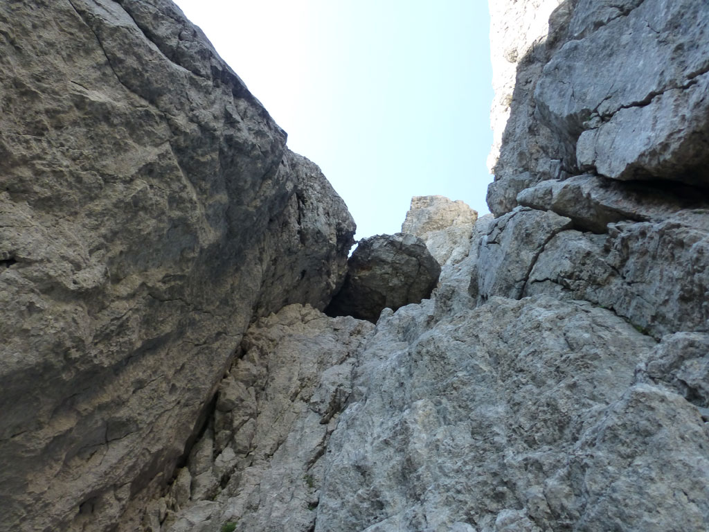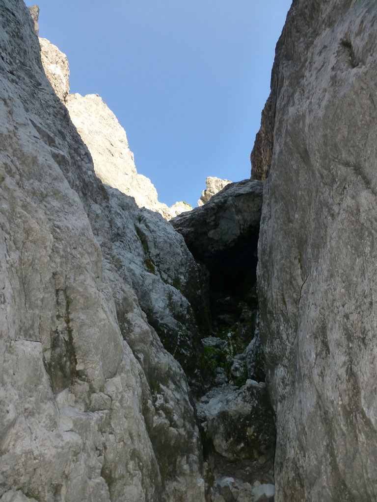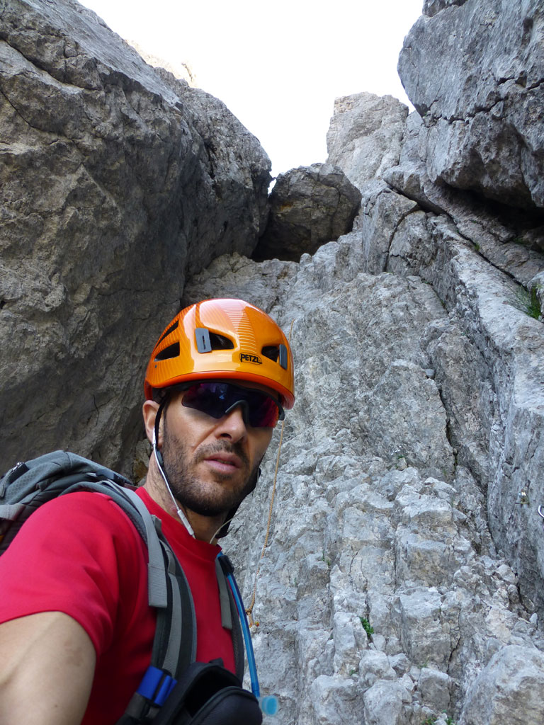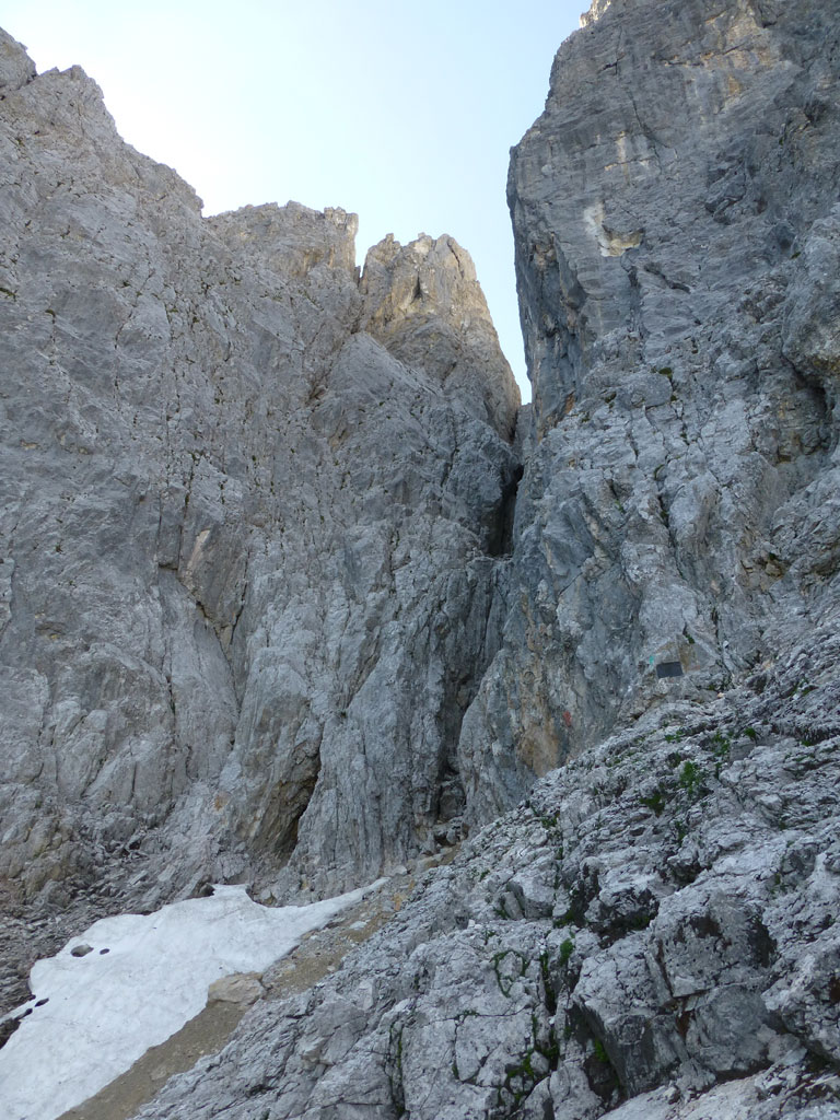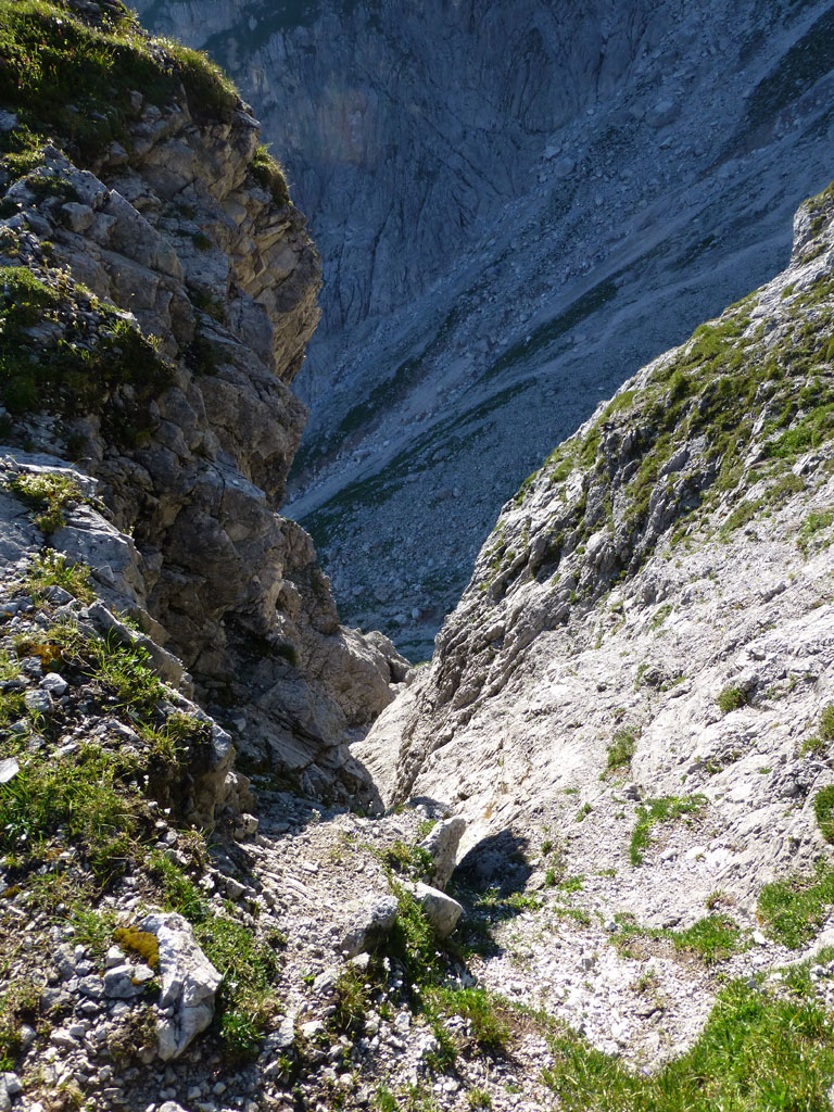 Nach einer Trink- und Essenspause machte ich mich zuerst abkletternd, dann mittles Abseilen an den Abstieg. Um ehrlich zu sein war ich recht froh, dass ich mein 50-Meter Einfachseil vorsorglich mitgeschlepp hatte, denn es machte den Weg nach unten viel angenehmer, und auch schneller. Vor allem nachdem fast jeder Stand auch als orderlicher Abseilstand eingerichtet ist, geht das ganze relativ schnell, bevor man wieder beim Einstieg steht. Es war zwar schon etwas später als ich mich wieder am Steig in Richtung Hofpürgelhütte befand, doch als ich so neben dem Mosermandl nach unten wanderte, viel mir eine nicht zu steile Rinne auf den Rücken zum Gipfel auf. Also warum nicht noch schnell aufs Mosermandl, wenn man schon mal da ist? Vorweg gesagt, das ganze war schwachsinnig, die Rinne eine bröselige Katastrophe, doch das merkt man dann leider erst am Weg nach unten… Irgendwie gings dann schon mit viel Schwitzen und Hoffen, dass alles was man anrührt nicht gleich herausbricht. Die letzten Höhenmeter nach unten zum Einstieg der Rinne hab ich sogar noch mittels Abseilen an einem, sagen wir „brauchbaren“, Abseilstand zurückgelegt. Jedenfalls war ich zurück am Steig recht erleichtert, dass nix passiert ist, und werde mir zukünftig solche „Abstecher“ dreimal überlegen. Trotzdem war es eine super Tour in einer tollen Umgebung mit einem spannendem Gipfel, den ich im Winter sicherlich auch mal besteigen werde.
