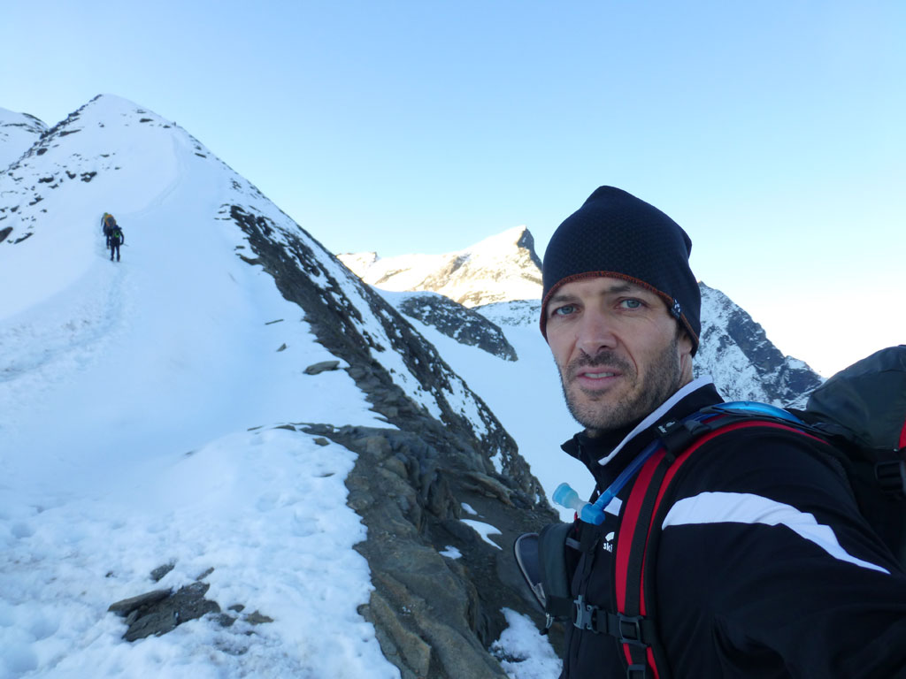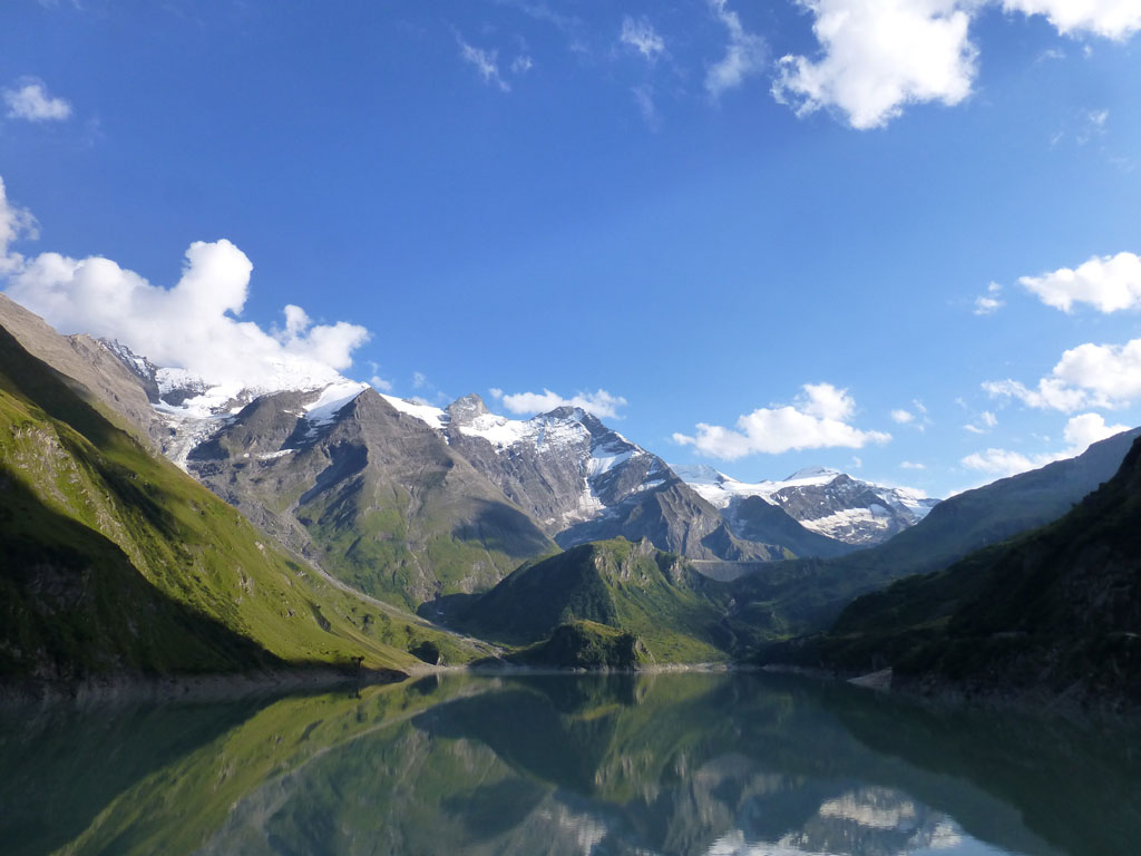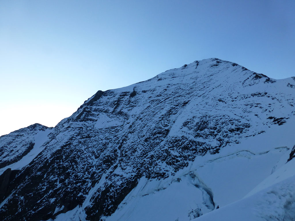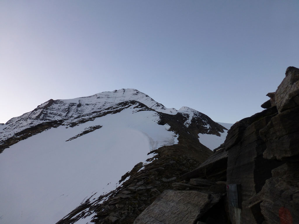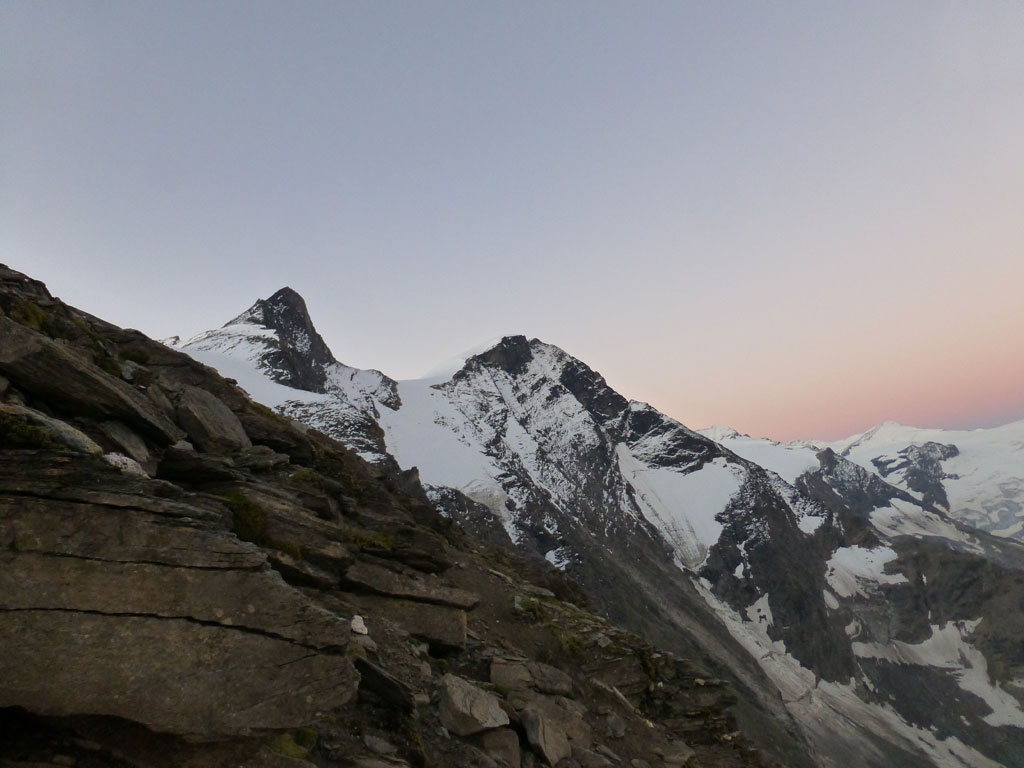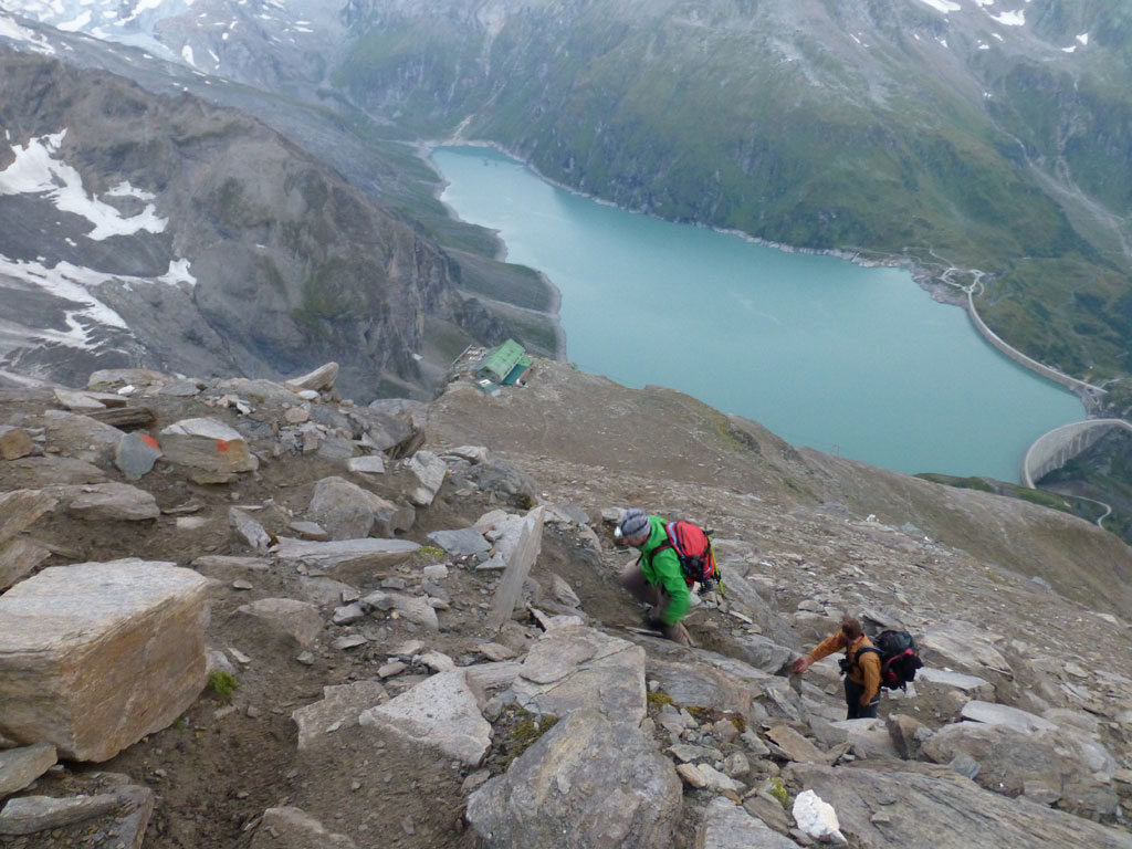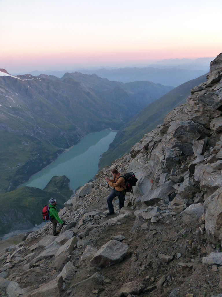 Der Wetterbericht für das ganze Wochenende war sehr vielversprechend und ich war hochmotiviert für eine längere Bergtour. Schon öfters bin ich beim Recherchieren über den Kaindlgrat und das Große Wiesbachhorn gestossen, und so war der Plan schnell klar. Am Freitagnachmittag fuhr ich nach der Arbeit eilig ins Kapruner Tal bis zum Kesselfallhaus, um dort den letzten Bus zum Stausee Mooserboden zu erreichen. Das hat dann durch den regen Verkehr nicht ganz funktioniert, also machte ich mich zu Fuss auf den Aufstieg zum Mooserboden. Dort angekommen gings dann noch über einen steilen Steig hinauf zum Heinrich-Schwaiger-Haus, wo ich sichtich müde und verschwitzt rechtzeitig zum Abendessen eintrudelte. Nach dem Abendessen erkundigte ich mich noch bei einem hiesigen Bergführer über den Zustand des Kaindl- und Bratschenkopfkees, bevor ich mich ins Matratzenlager verzog und versuchte, ein wenig zu schlafen. Am morgen war ich mit zwei anderen Gipfelaspiranten als Erster beim Frühstück und wunderte mich über die Ruhe im Vergleich zum lauten Treiben am Vorabend. Die beiden anderen Bergsteiger erkundigten sich bei mir, über die Aufstiegsroute und Anderes, wodurch sich schnell herausstellte, dass einer der beiden noch nie auf einem Gletscher unterwegs war, keine Steigeisen dabei hatte, und der andere hatte keinen Pickel…