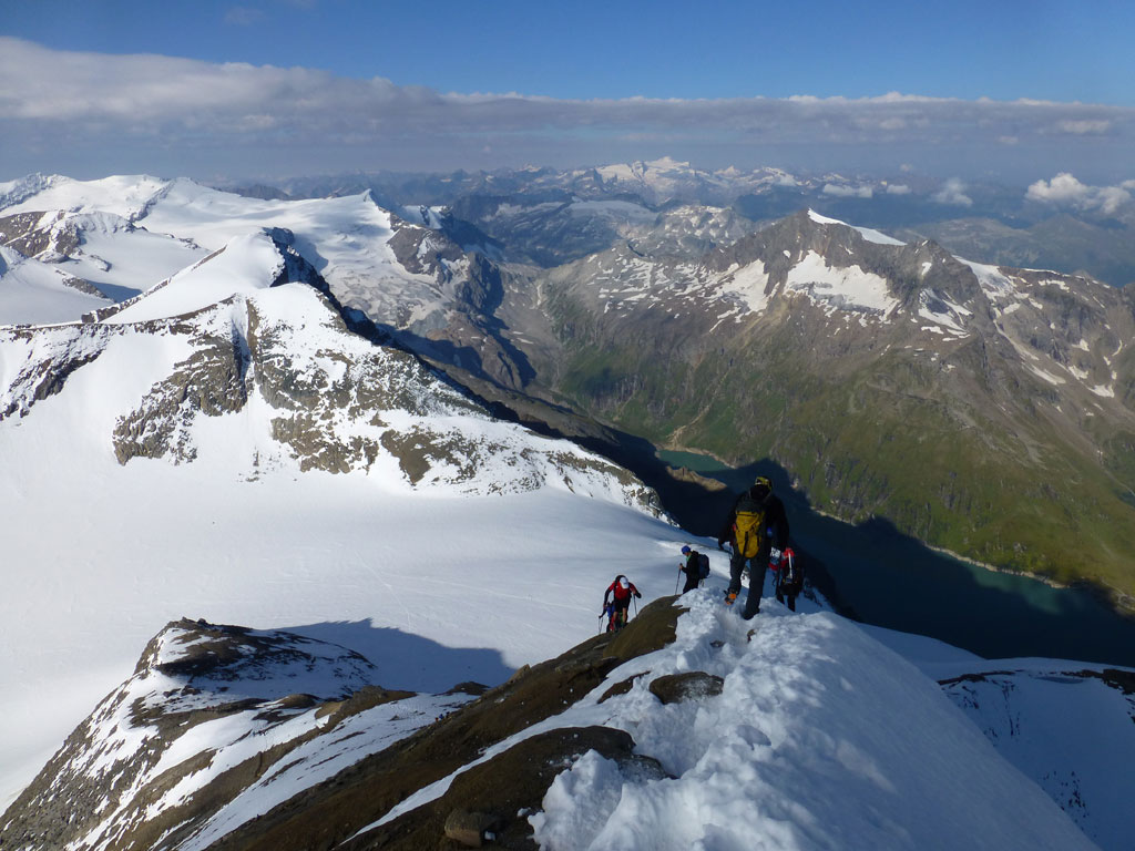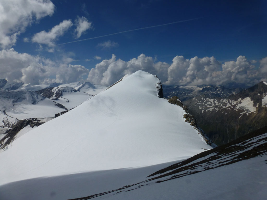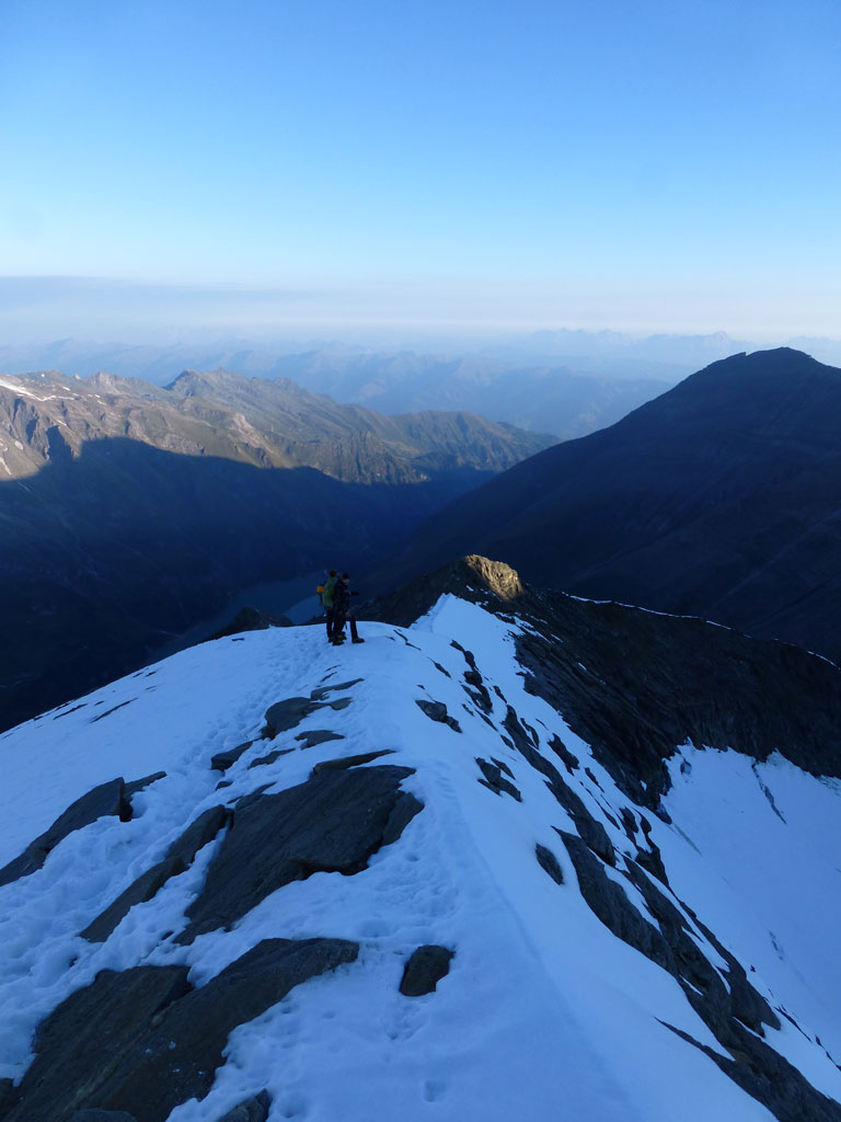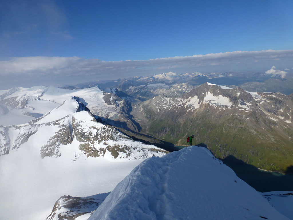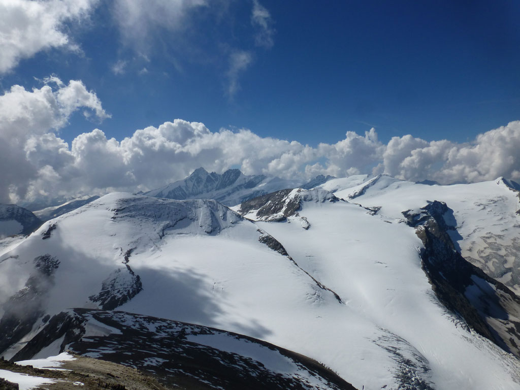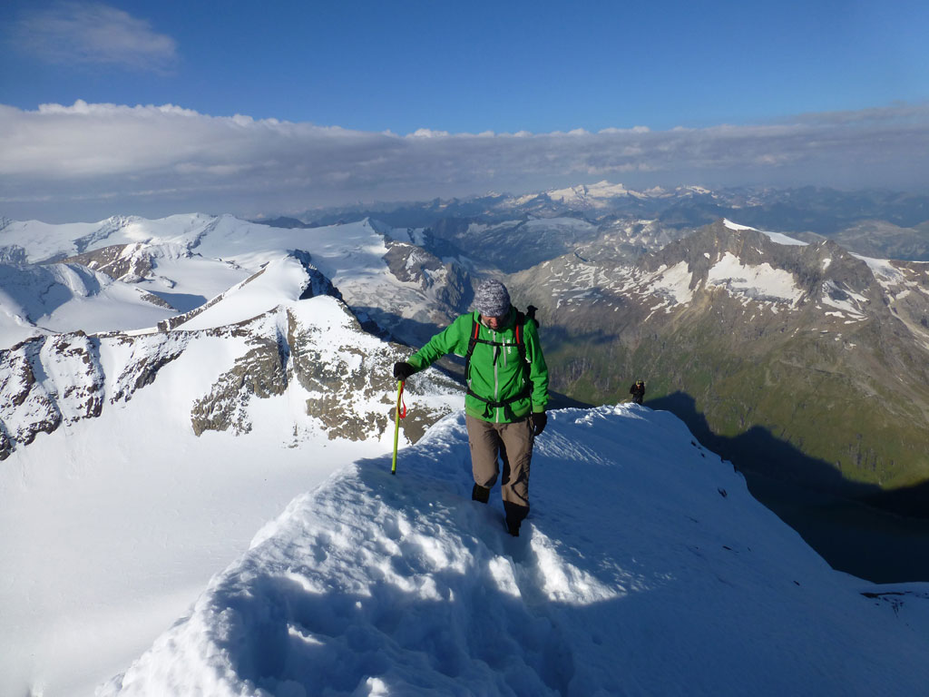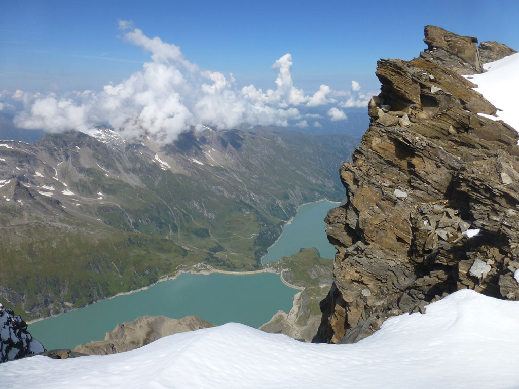 Ich bote den beiden also an, mit mir den Aufstieg zum Wiesbachhorn zu machen, und hoffte, dass die Bedingungen nicht zu schwierig sind. Gemeinsam brachen wir somit als erste „Seilschaft“ im Schein der aufgehenden Sonne über das versicherte Felsgelände auf zum Kaindlgrat, der sich dann später als schöner Firngrat präsentierte. Nach einer kurzen Einführung über das Anlegen von Steigeisen, arbeiteten wir uns langsam aber stetig über den Grat hinauf zum Gipfel. Und gegen 9:00 Uhr standen wir mit einer Horde anderer Bergsteiger, die uns vorher überholten am Gipfel des Großen Wiesbachhorn. Wir legten nur eine kurze Pause zum Essen und Trinken ein, bevor wir uns an den Abstieg machten. Der Tag war ja noch jung und vom Gipfel aus schwelgte mein Blick in Richtung Großglockner und die benachbarten Gipfel. Mein Plan sah vor über den Hinteren Bratschenkopf bis zur Klockerin und wieder retour zu gehen. Folglich verabschiedete ich mich von einem der beiden Bergkameraden, während der zweite mich noch bis zum Gipfel des Hintern Bratschenkopfs begleitete. Der Aufstieg über die äußere Felsflanke war mehr als brüchig, alles schien unter den Füssen zu zerbröseln, bzw. fast alles was man anfasste, brach heraus. Doch nach einigen mühevollen Höhenmeter standen wir beim Gipfelkreuz des Hinteren Bratschenkopfs. Dann verabschiedete ich mich auch von meinem zweiten Begleiter und brach in Richtung Klockerin auf. Es war schon Mittag und die Sonne brannte erbarmungslos auf mich herunter. Am Gipfel der Klockerin machte ich eine Pause, genoss den Ausblick auf die ganze Glocknergruppe, während die aufkommenden Wolken das Wiesbachhorn einhüllten. Schließlich wanderte ich meinen Spuren folgend zurück zum Bratschenkopf, wo ich über eine Schneeflanke schnell wieder am Kaindlkees ankam. Über den Gletscher erreichte ich wieder den Kaindlgrat und stieg zufrieden aber schon mit etwas schweren Beinen ab zum Heinrich-Schwaiger-Haus. Dort gönnte ich mir noch schnell einen kühlen Radler um schließlich über Steig zum Stausee zu gelangen. Heute war mein Timing besser, will heißen ich zog die Busfahrt zum Parkplatz dem weiteren Abstieg zu Fuss vor. Jedenfalls war es eine gelungene Bergtour auf das Große Wiesbachhorn, den Hinteren Bratschenkopf und die Klockerin mit bleibenden Eindrücken von dieser Region der Hohen Tauern.
