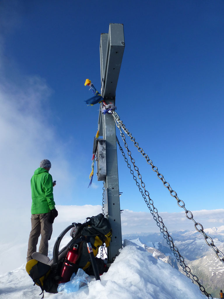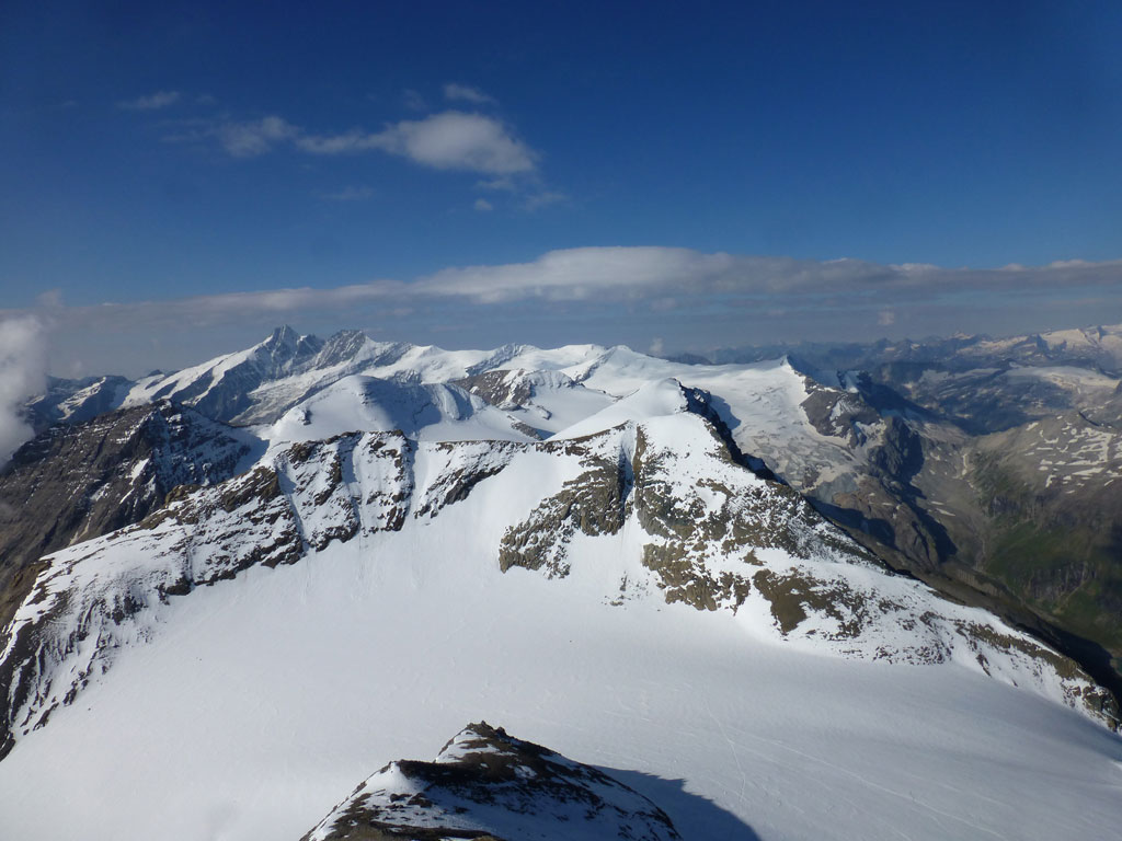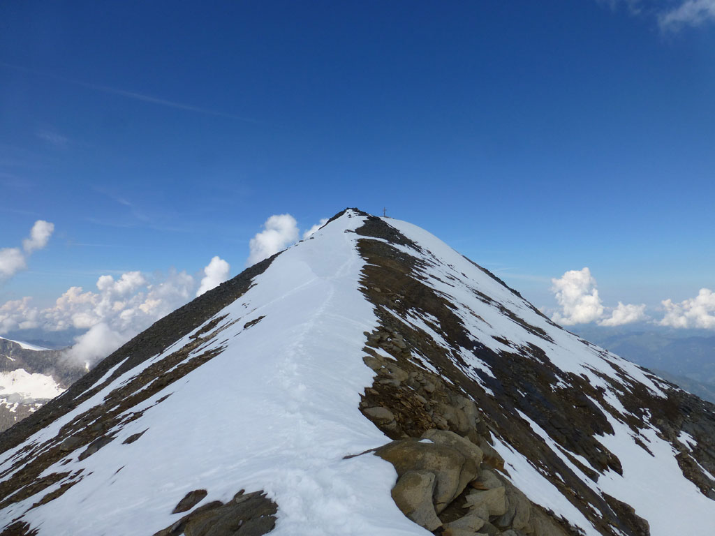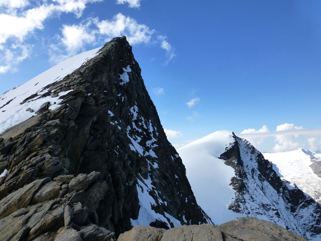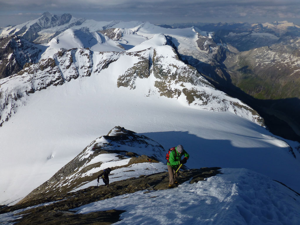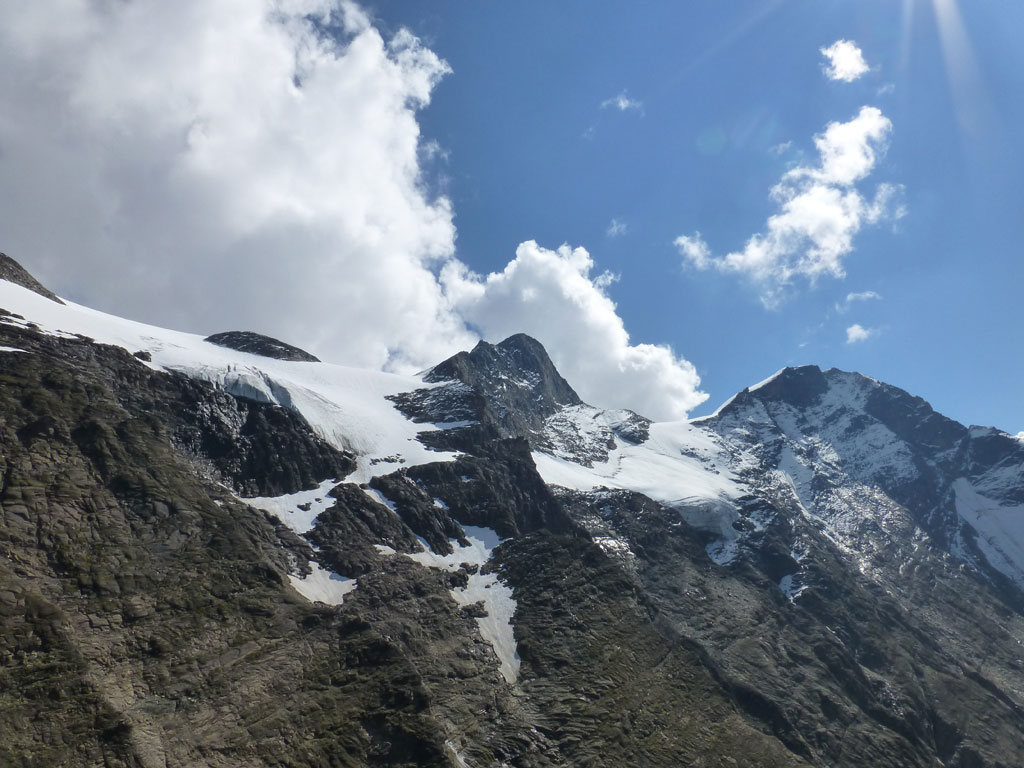 Ich bote den beiden also an, mit mir den Aufstieg zum Wiesbachhorn zu machen, und hoffte, dass die Bedingungen nicht zu schwierig sind. Gemeinsam brachen wir somit als erste „Seilschaft“ im Schein der aufgehenden Sonne über das versicherte Felsgelände auf zum Kaindlgrat, der sich dann später als schöner Firngrat präsentierte. Nach einer kurzen Einführung über das Anlegen von Steigeisen, arbeiteten wir uns langsam aber stetig über den Grat hinauf zum Gipfel. Und gegen 9:00 Uhr standen wir mit einer Horde anderer Bergsteiger, die uns vorher überholten am Gipfel des Großen Wiesbachhorn. Wir legten nur eine kurze Pause zum Essen und Trinken ein, bevor wir uns an den Abstieg machten. Der Tag war ja noch jung und vom Gipfel aus schwelgte mein Blick in Richtung Großglockner und die benachbarten Gipfel. Mein Plan sah vor über den Hinteren Bratschenkopf bis zur Klockerin und wieder retour zu gehen. Folglich verabschiedete ich mich von einem der beiden Bergkameraden, während der zweite mich noch bis zum Gipfel des Hintern Bratschenkopfs begleitete. Der Aufstieg über die äußere Felsflanke war mehr als brüchig, alles schien unter den Füssen zu zerbröseln, bzw. fast alles was man anfasste, brach heraus. Doch nach einigen mühevollen Höhenmeter standen wir beim Gipfelkreuz des Hinteren Bratschenkopfs. Dann verabschiedete ich mich auch von meinem zweiten Begleiter und brach in Richtung Klockerin auf. Es war schon Mittag und die Sonne brannte erbarmungslos auf mich herunter. Am Gipfel der Klockerin machte ich eine Pause, genoss den Ausblick auf die ganze Glocknergruppe, während die aufkommenden Wolken das Wiesbachhorn einhüllten. Schließlich wanderte ich meinen Spuren folgend zurück zum Bratschenkopf, wo ich über eine Schneeflanke schnell wieder am Kaindlkees ankam. Über den Gletscher erreichte ich wieder den Kaindlgrat und stieg zufrieden aber schon mit etwas schweren Beinen ab zum Heinrich-Schwaiger-Haus. Dort gönnte ich mir noch schnell einen kühlen Radler um schließlich über Steig zum Stausee zu gelangen. Heute war mein Timing besser, will heißen ich zog die Busfahrt zum Parkplatz dem weiteren Abstieg zu Fuss vor. Jedenfalls war es eine gelungene Bergtour auf das Große Wiesbachhorn, den Hinteren Bratschenkopf und die Klockerin mit bleibenden Eindrücken von dieser Region der Hohen Tauern.
