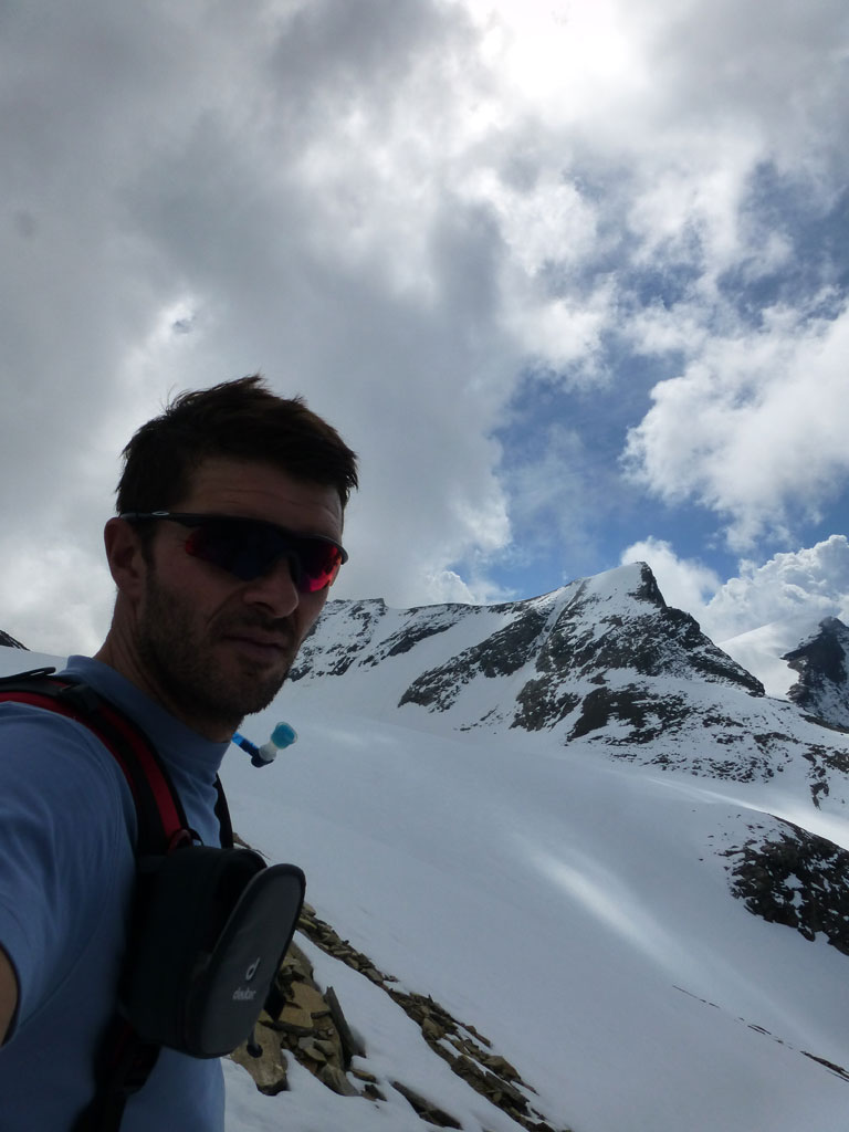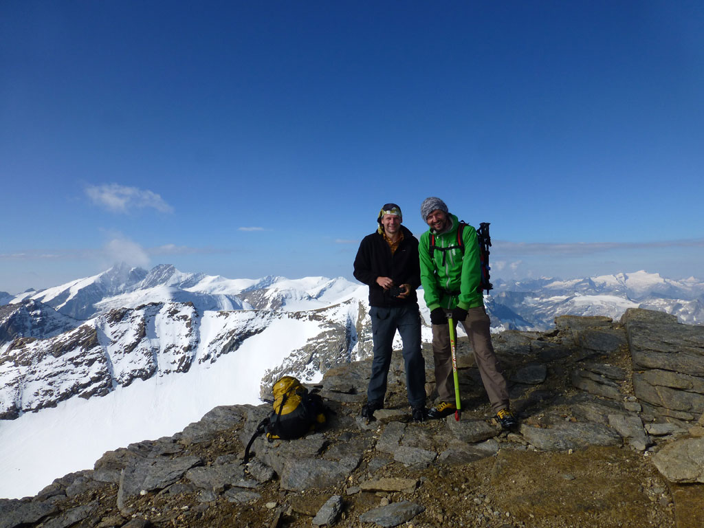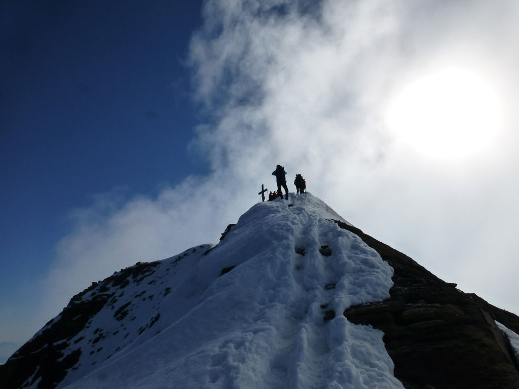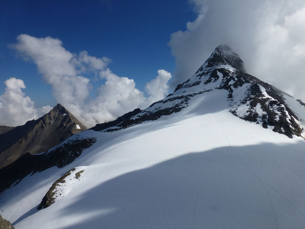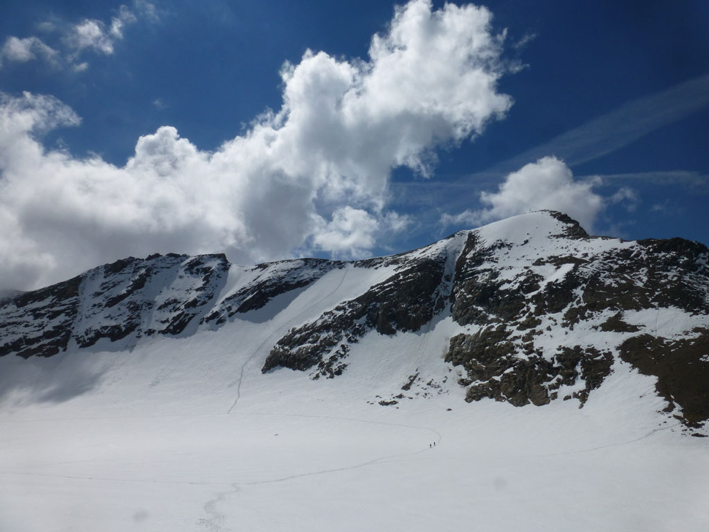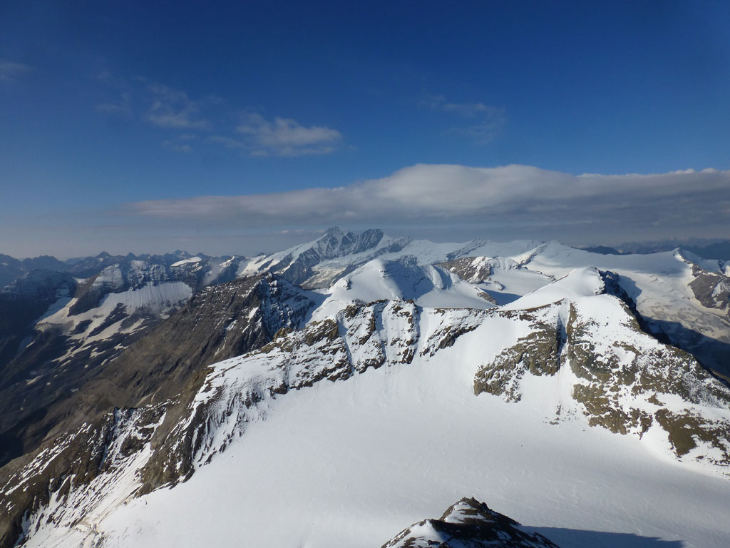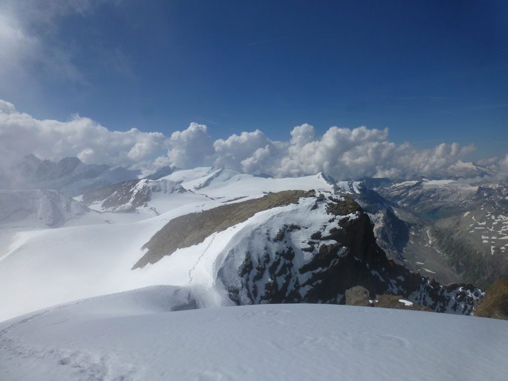 Ich bote den beiden also an, mit mir den Aufstieg zum Wiesbachhorn zu machen, und hoffte, dass die Bedingungen nicht zu schwierig sind. Gemeinsam brachen wir somit als erste „Seilschaft“ im Schein der aufgehenden Sonne über das versicherte Felsgelände auf zum Kaindlgrat, der sich dann später als schöner Firngrat präsentierte. Nach einer kurzen Einführung über das Anlegen von Steigeisen, arbeiteten wir uns langsam aber stetig über den Grat hinauf zum Gipfel. Und gegen 9:00 Uhr standen wir mit einer Horde anderer Bergsteiger, die uns vorher überholten am Gipfel des Großen Wiesbachhorn. Wir legten nur eine kurze Pause zum Essen und Trinken ein, bevor wir uns an den Abstieg machten. Der Tag war ja noch jung und vom Gipfel aus schwelgte mein Blick in Richtung Großglockner und die benachbarten Gipfel. Mein Plan sah vor über den Hinteren Bratschenkopf bis zur Klockerin und wieder retour zu gehen. Folglich verabschiedete ich mich von einem der beiden Bergkameraden, während der zweite mich noch bis zum Gipfel des Hintern Bratschenkopfs begleitete. Der Aufstieg über die äußere Felsflanke war mehr als brüchig, alles schien unter den Füssen zu zerbröseln, bzw. fast alles was man anfasste, brach heraus. Doch nach einigen mühevollen Höhenmeter standen wir beim Gipfelkreuz des Hinteren Bratschenkopfs. Dann verabschiedete ich mich auch von meinem zweiten Begleiter und brach in Richtung Klockerin auf. Es war schon Mittag und die Sonne brannte erbarmungslos auf mich herunter. Am Gipfel der Klockerin machte ich eine Pause, genoss den Ausblick auf die ganze Glocknergruppe, während die aufkommenden Wolken das Wiesbachhorn einhüllten. Schließlich wanderte ich meinen Spuren folgend zurück zum Bratschenkopf, wo ich über eine Schneeflanke schnell wieder am Kaindlkees ankam. Über den Gletscher erreichte ich wieder den Kaindlgrat und stieg zufrieden aber schon mit etwas schweren Beinen ab zum Heinrich-Schwaiger-Haus. Dort gönnte ich mir noch schnell einen kühlen Radler um schließlich über Steig zum Stausee zu gelangen. Heute war mein Timing besser, will heißen ich zog die Busfahrt zum Parkplatz dem weiteren Abstieg zu Fuss vor. Jedenfalls war es eine gelungene Bergtour auf das Große Wiesbachhorn, den Hinteren Bratschenkopf und die Klockerin mit bleibenden Eindrücken von dieser Region der Hohen Tauern.