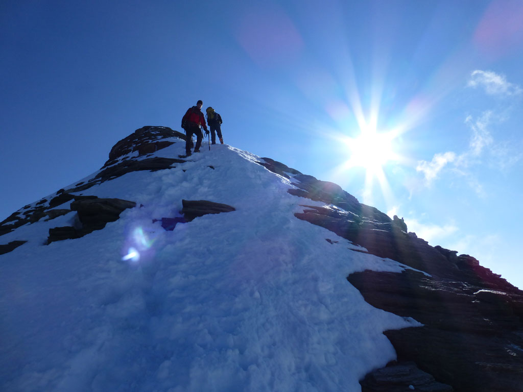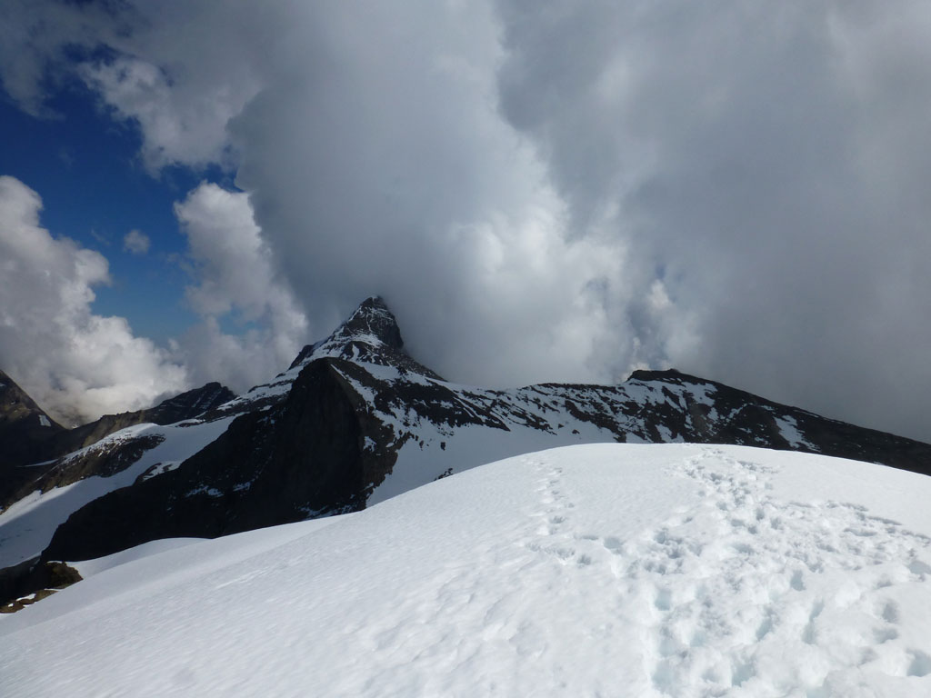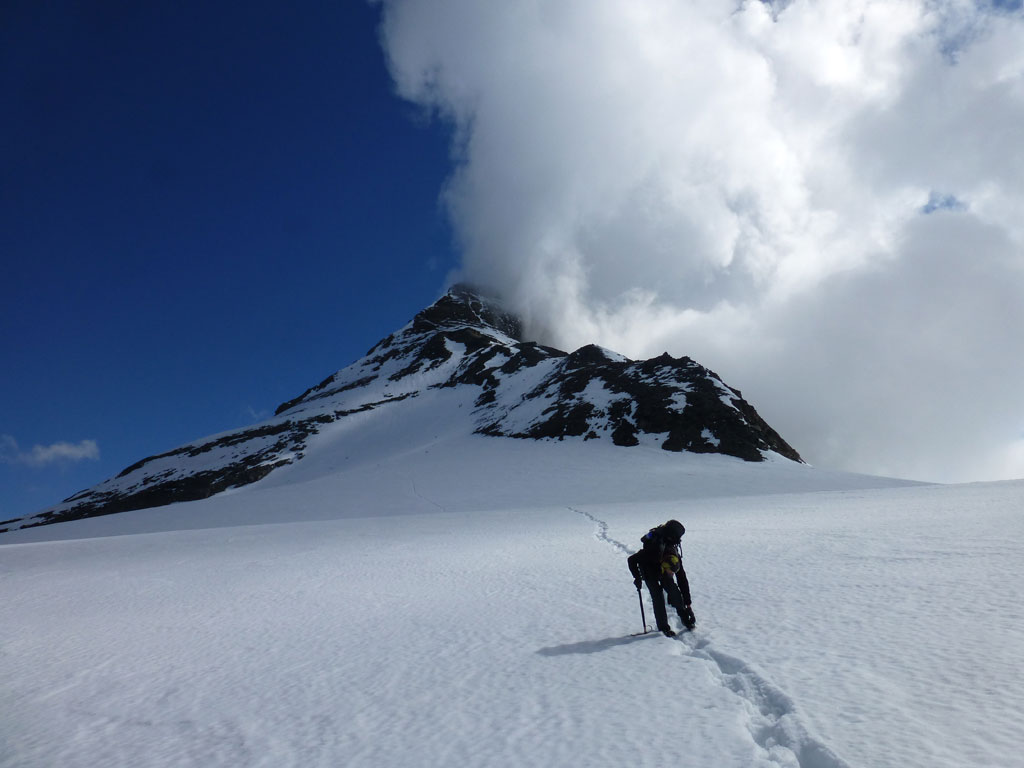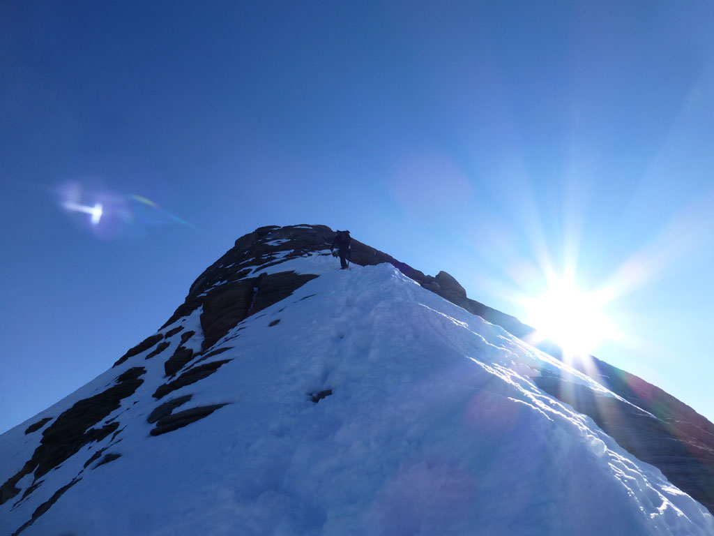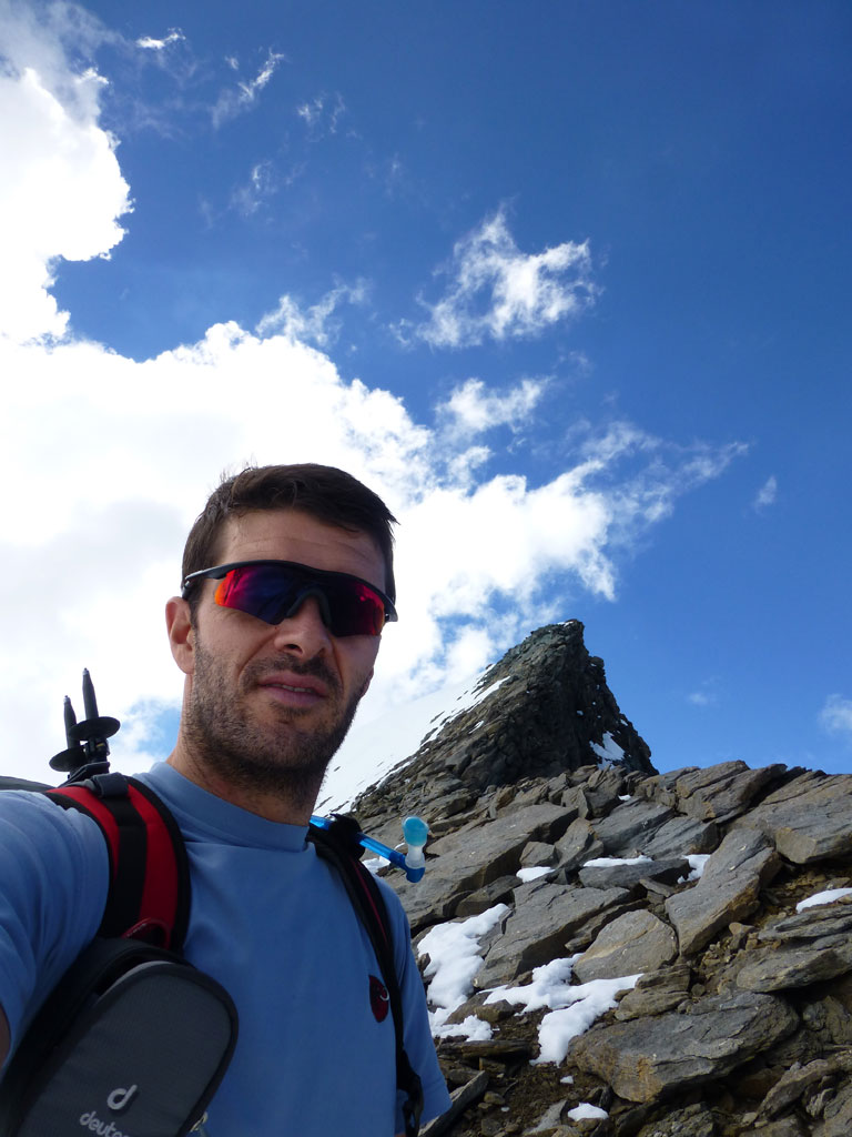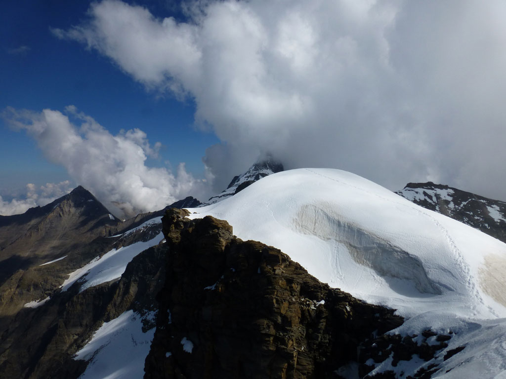 Ich bote den beiden also an, mit mir den Aufstieg zum Wiesbachhorn zu machen, und hoffte, dass die Bedingungen nicht zu schwierig sind. Gemeinsam brachen wir somit als erste „Seilschaft“ im Schein der aufgehenden Sonne über das versicherte Felsgelände auf zum Kaindlgrat, der sich dann später als schöner Firngrat präsentierte. Nach einer kurzen Einführung über das Anlegen von Steigeisen, arbeiteten wir uns langsam aber stetig über den Grat hinauf zum Gipfel. Und gegen 9:00 Uhr standen wir mit einer Horde anderer Bergsteiger, die uns vorher überholten am Gipfel des Großen Wiesbachhorn. Wir legten nur eine kurze Pause zum Essen und Trinken ein, bevor wir uns an den Abstieg machten. Der Tag war ja noch jung und vom Gipfel aus schwelgte mein Blick in Richtung Großglockner und die benachbarten Gipfel. Mein Plan sah vor über den Hinteren Bratschenkopf bis zur Klockerin und wieder retour zu gehen. Folglich verabschiedete ich mich von einem der beiden Bergkameraden, während der zweite mich noch bis zum Gipfel des Hintern Bratschenkopfs begleitete. Der Aufstieg über die äußere Felsflanke war mehr als brüchig, alles schien unter den Füssen zu zerbröseln, bzw. fast alles was man anfasste, brach heraus. Doch nach einigen mühevollen Höhenmeter standen wir beim Gipfelkreuz des Hinteren Bratschenkopfs. Dann verabschiedete ich mich auch von meinem zweiten Begleiter und brach in Richtung Klockerin auf. Es war schon Mittag und die Sonne brannte erbarmungslos auf mich herunter. Am Gipfel der Klockerin machte ich eine Pause, genoss den Ausblick auf die ganze Glocknergruppe, während die aufkommenden Wolken das Wiesbachhorn einhüllten. Schließlich wanderte ich meinen Spuren folgend zurück zum Bratschenkopf, wo ich über eine Schneeflanke schnell wieder am Kaindlkees ankam. Über den Gletscher erreichte ich wieder den Kaindlgrat und stieg zufrieden aber schon mit etwas schweren Beinen ab zum Heinrich-Schwaiger-Haus. Dort gönnte ich mir noch schnell einen kühlen Radler um schließlich über Steig zum Stausee zu gelangen. Heute war mein Timing besser, will heißen ich zog die Busfahrt zum Parkplatz dem weiteren Abstieg zu Fuss vor. Jedenfalls war es eine gelungene Bergtour auf das Große Wiesbachhorn, den Hinteren Bratschenkopf und die Klockerin mit bleibenden Eindrücken von dieser Region der Hohen Tauern.