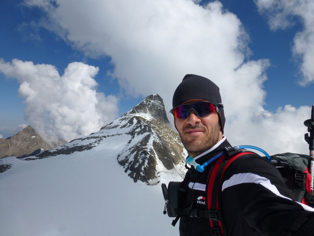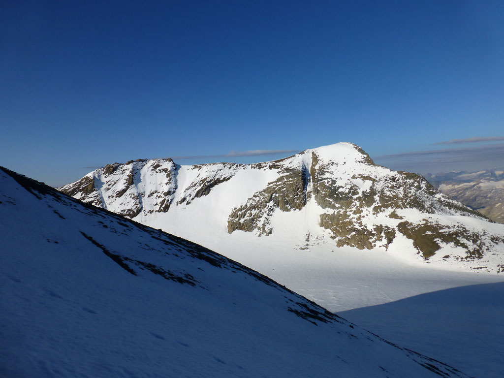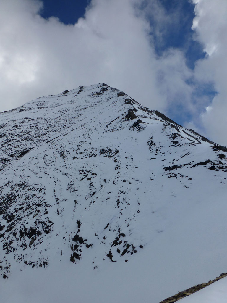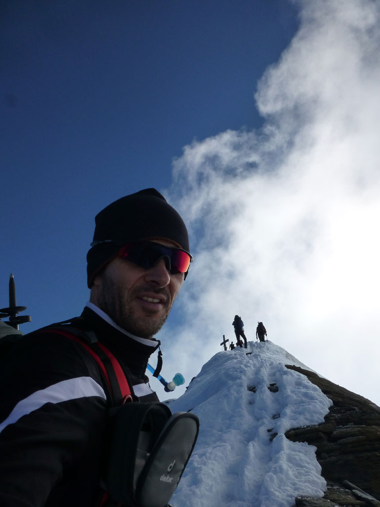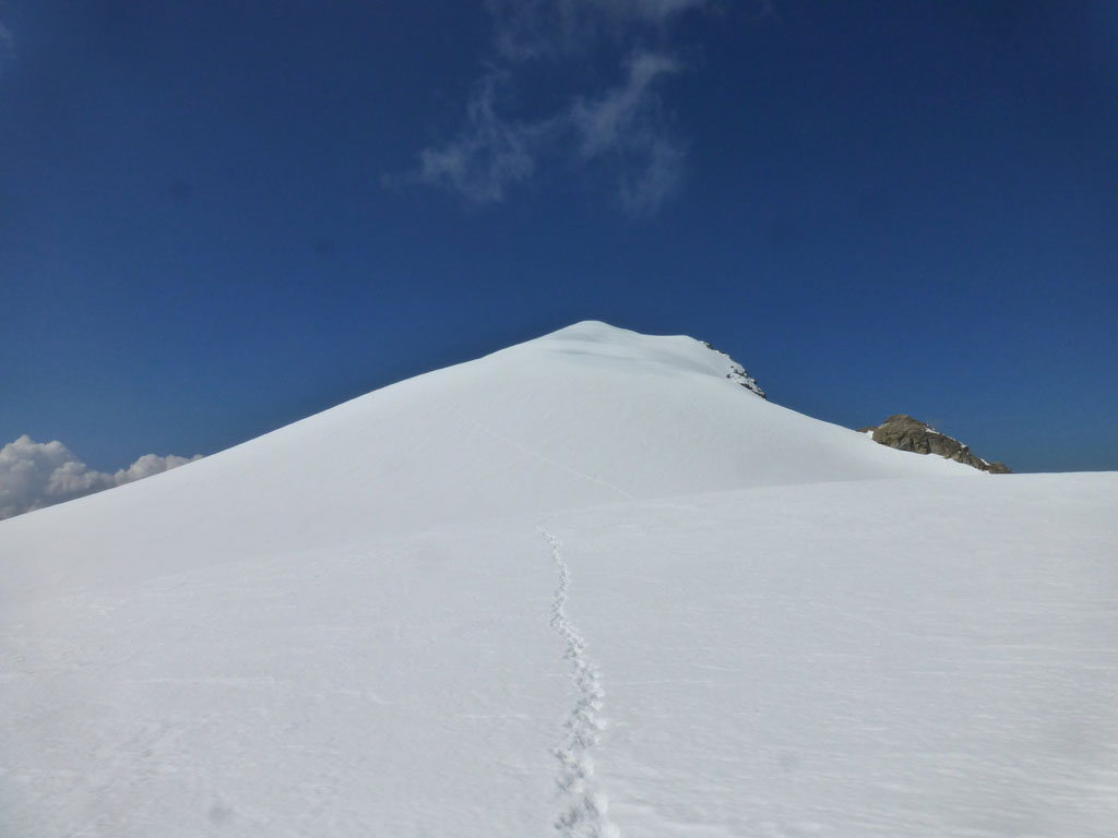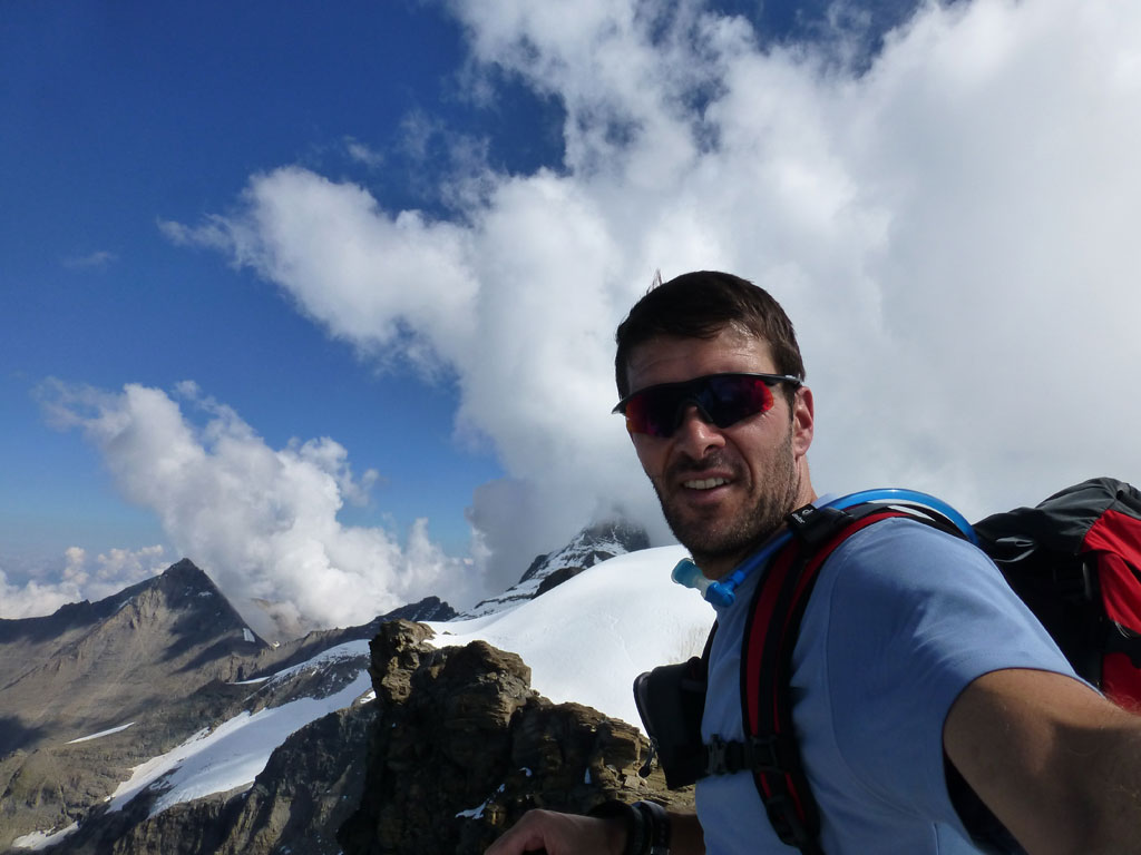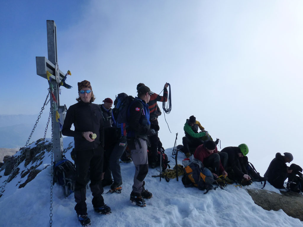 Ich bote den beiden also an, mit mir den Aufstieg zum Wiesbachhorn zu machen, und hoffte, dass die Bedingungen nicht zu schwierig sind. Gemeinsam brachen wir somit als erste „Seilschaft“ im Schein der aufgehenden Sonne über das versicherte Felsgelände auf zum Kaindlgrat, der sich dann später als schöner Firngrat präsentierte. Nach einer kurzen Einführung über das Anlegen von Steigeisen, arbeiteten wir uns langsam aber stetig über den Grat hinauf zum Gipfel. Und gegen 9:00 Uhr standen wir mit einer Horde anderer Bergsteiger, die uns vorher überholten am Gipfel des Großen Wiesbachhorn. Wir legten nur eine kurze Pause zum Essen und Trinken ein, bevor wir uns an den Abstieg machten. Der Tag war ja noch jung und vom Gipfel aus schwelgte mein Blick in Richtung Großglockner und die benachbarten Gipfel. Mein Plan sah vor über den Hinteren Bratschenkopf bis zur Klockerin und wieder retour zu gehen. Folglich verabschiedete ich mich von einem der beiden Bergkameraden, während der zweite mich noch bis zum Gipfel des Hintern Bratschenkopfs begleitete. Der Aufstieg über die äußere Felsflanke war mehr als brüchig, alles schien unter den Füssen zu zerbröseln, bzw. fast alles was man anfasste, brach heraus. Doch nach einigen mühevollen Höhenmeter standen wir beim Gipfelkreuz des Hinteren Bratschenkopfs. Dann verabschiedete ich mich auch von meinem zweiten Begleiter und brach in Richtung Klockerin auf. Es war schon Mittag und die Sonne brannte erbarmungslos auf mich herunter. Am Gipfel der Klockerin machte ich eine Pause, genoss den Ausblick auf die ganze Glocknergruppe, während die aufkommenden Wolken das Wiesbachhorn einhüllten. Schließlich wanderte ich meinen Spuren folgend zurück zum Bratschenkopf, wo ich über eine Schneeflanke schnell wieder am Kaindlkees ankam. Über den Gletscher erreichte ich wieder den Kaindlgrat und stieg zufrieden aber schon mit etwas schweren Beinen ab zum Heinrich-Schwaiger-Haus. Dort gönnte ich mir noch schnell einen kühlen Radler um schließlich über Steig zum Stausee zu gelangen. Heute war mein Timing besser, will heißen ich zog die Busfahrt zum Parkplatz dem weiteren Abstieg zu Fuss vor. Jedenfalls war es eine gelungene Bergtour auf das Große Wiesbachhorn, den Hinteren Bratschenkopf und die Klockerin mit bleibenden Eindrücken von dieser Region der Hohen Tauern.