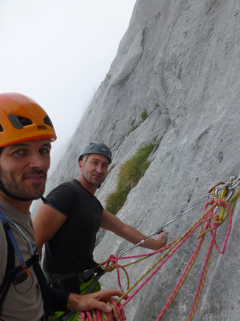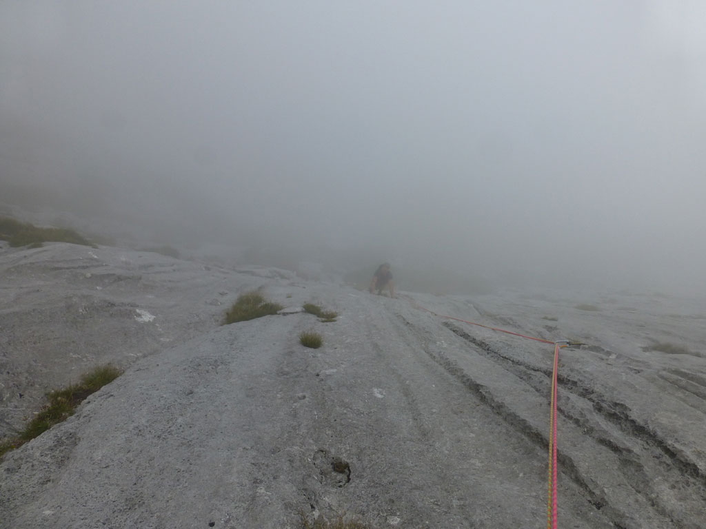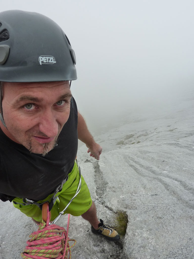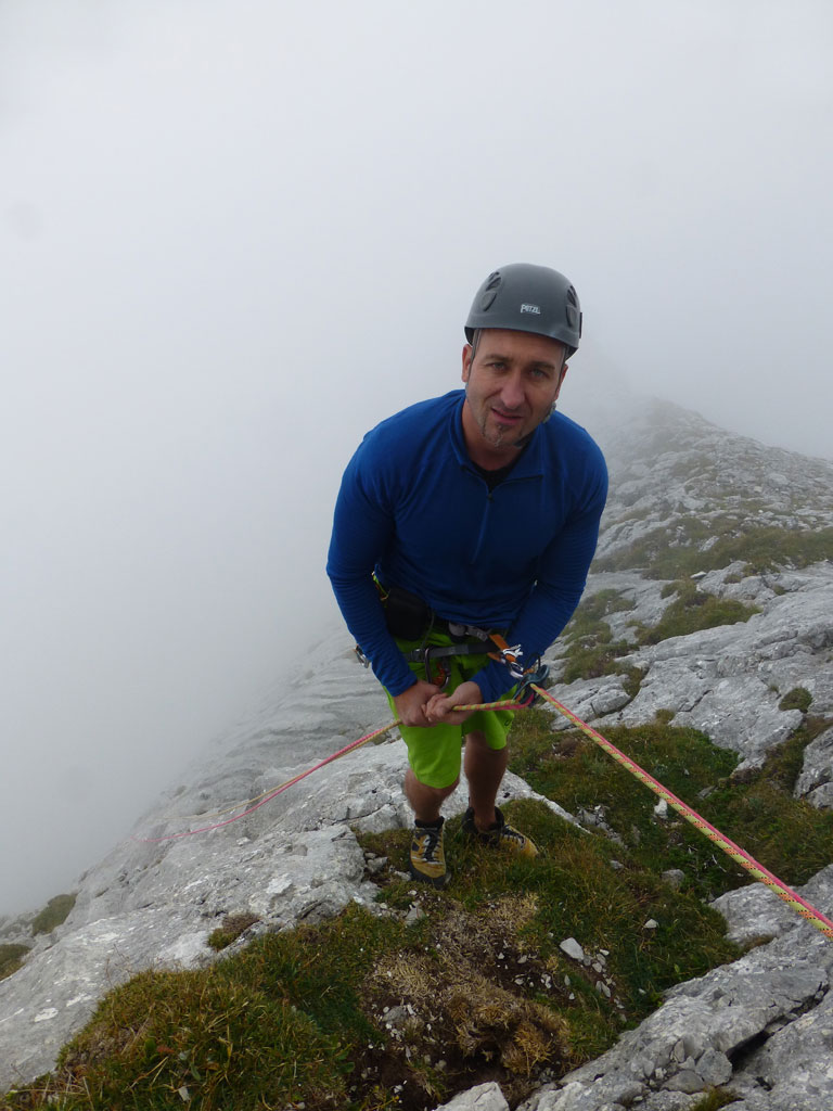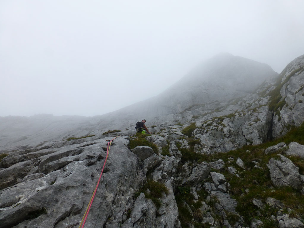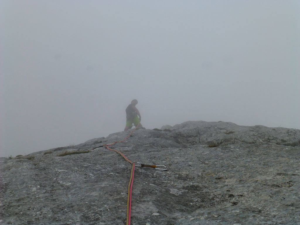 Steil ist diesem Fall wirklich geil, aber dazu später mehr. Chris und ich wollten den (eigentlich) schönen Sonntag für eine kurze Kletterei am Brett nutzen. Doch am Zustieg via Mitterkaseralm war schon klar, dass die aufkommenden Wolken sich nicht mehr verziehen werden. Am Einstieg zur Route Steil ist geil (6+) war’s dann natürlich nicht sonderlich warm und keiner wusste mehr, was uns geritten hatte eine kurze Hose anzuziehen. Nach ein paar Bissen und den üblichen Vorbereitungen stiegen wir in die ersten beiden Seillängen ein, bevor die eigentliche Kletterei beginnt. Die dritte Seillänge ist zwar nicht schwer, aber man muss schon einen Gang raufschalten, bevor’s dann in der nächsten schon zur Sache geht. Chris hatte die Ehre und das Vergnügen zugleich diese Schlüsselseillänge vorzusteigen, und ja, steil ist geil! Durch den dichten Nebel in mystischer Umgebung wirkte das Ganze noch etwas kniffeliger, aber Chris meisterte die schwierigen Züge auf der kleingriffigen Platte. Nun war ich an der Reihe, was im Nachstieg stets keine so großer Herausforderung mehr ist. Trotzdem muss man die Züge auch auflösen und in der glatten Platte darauf vertrauen, dass die Reibung der Kletterschuhe bis zur nächsten größeren Leiste ausreicht. Aber alles hat gut geklappt, und nach zwei weiteren Seillängen machten wir uns ans Abseilen vom letzten Stand der Route. Die Route ist mit redundante Abseilständen eingerichtet und nach vier Abseilmanövern steht man wieder beim Einstieg.