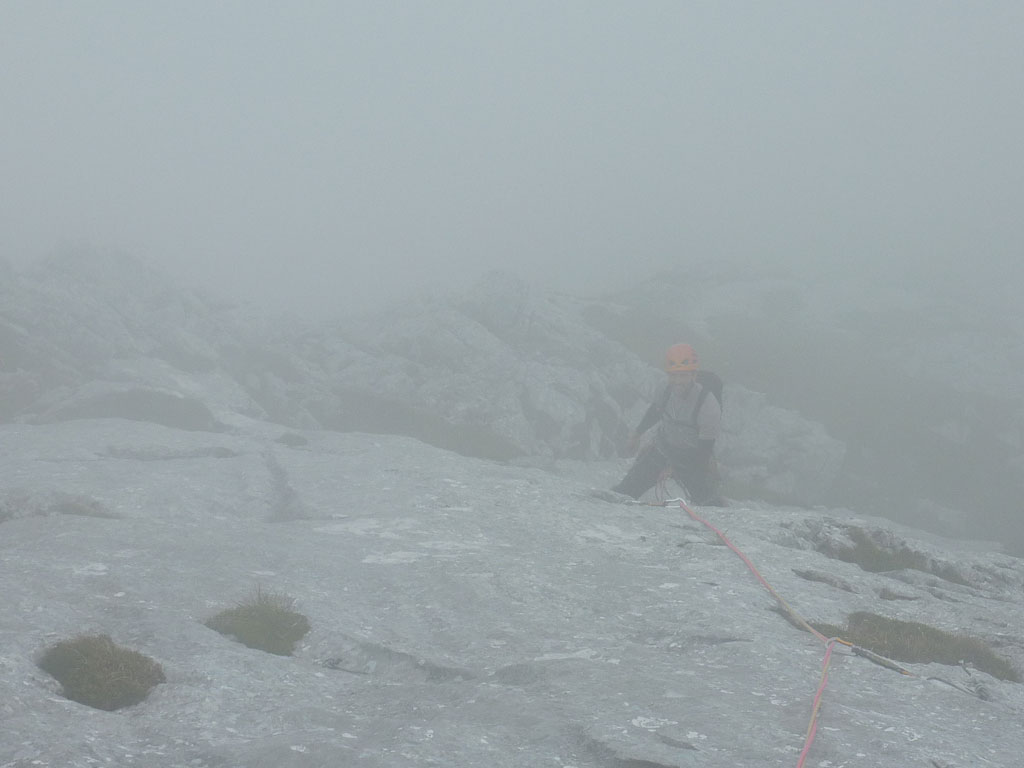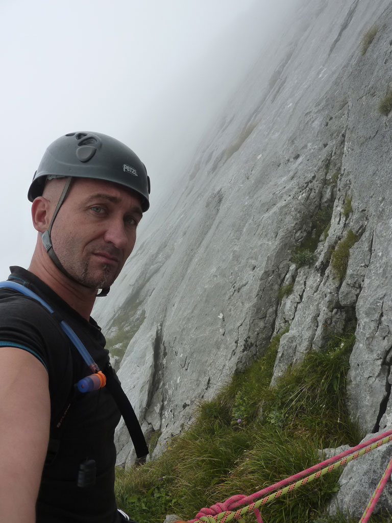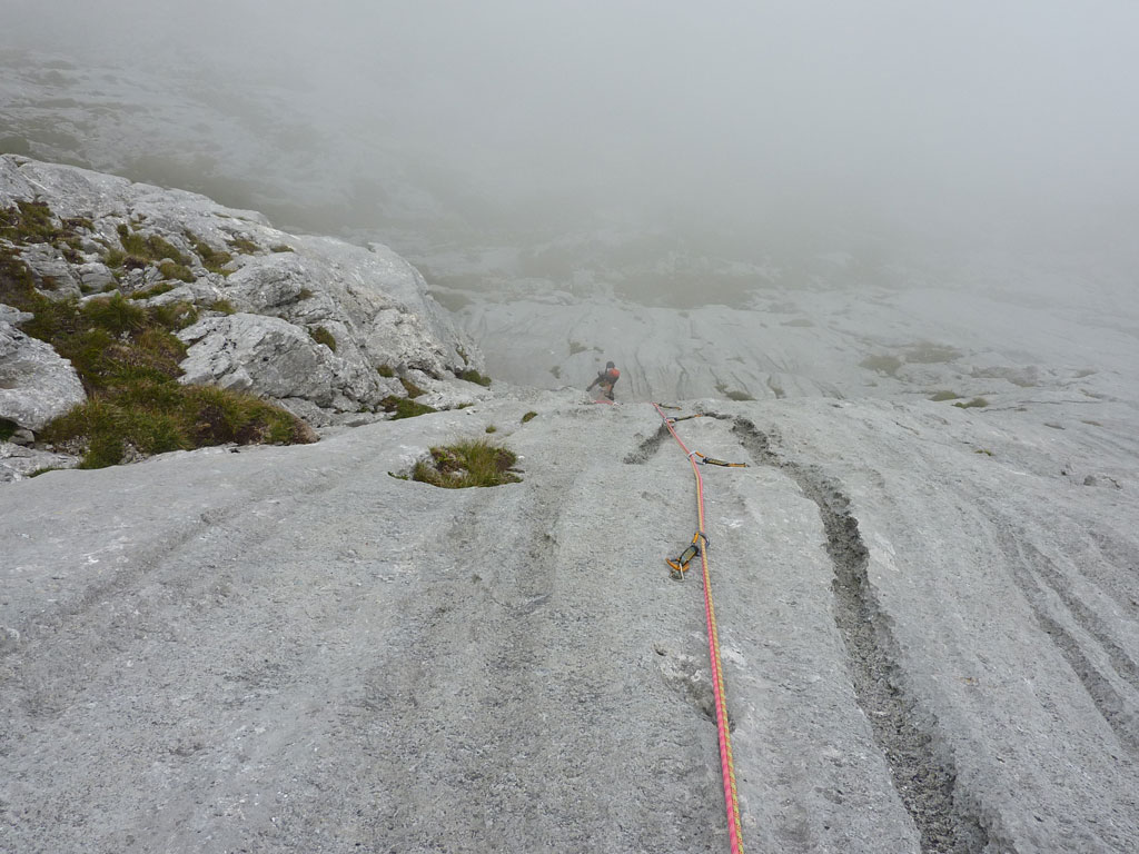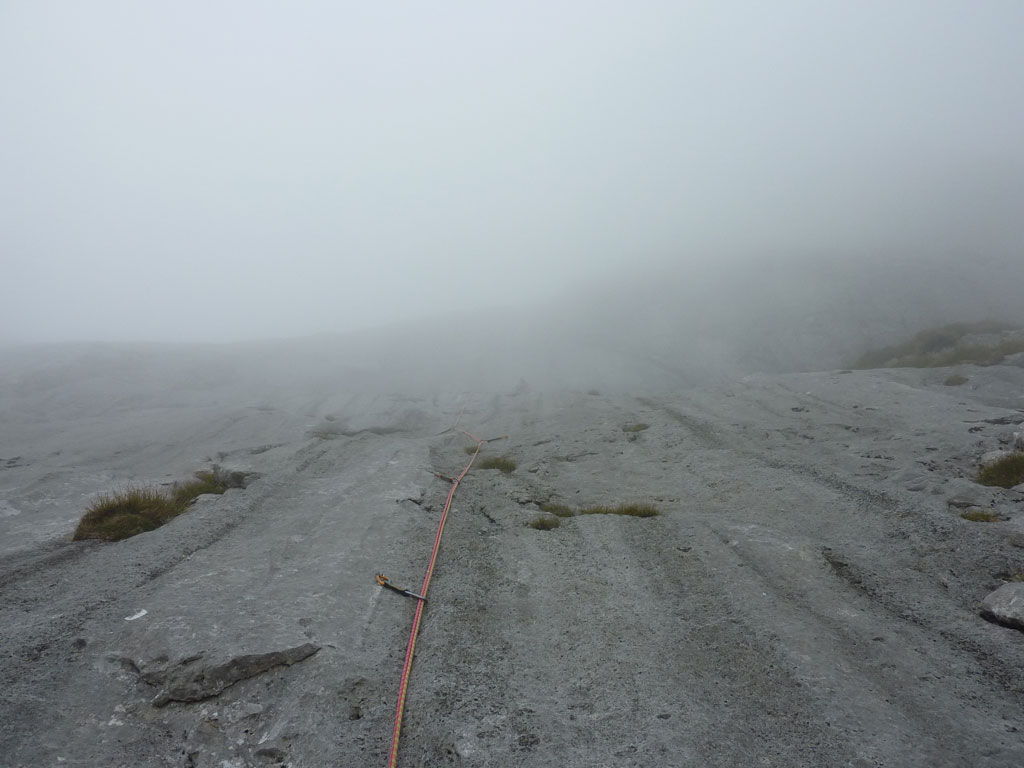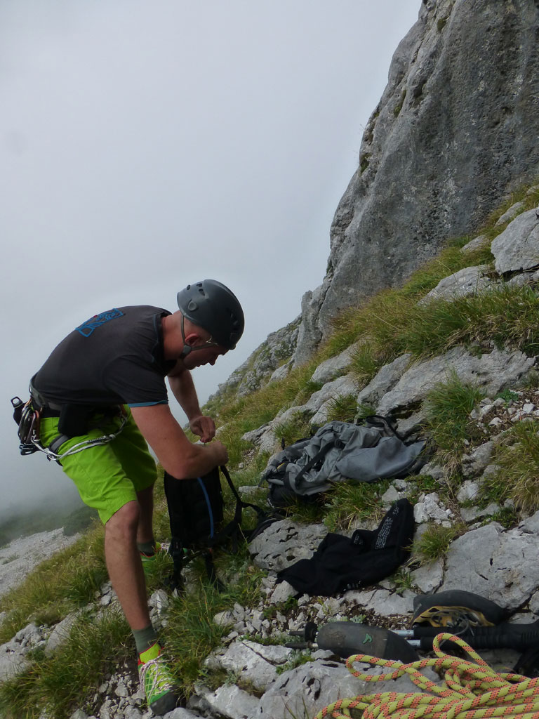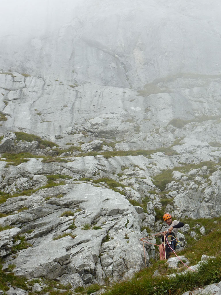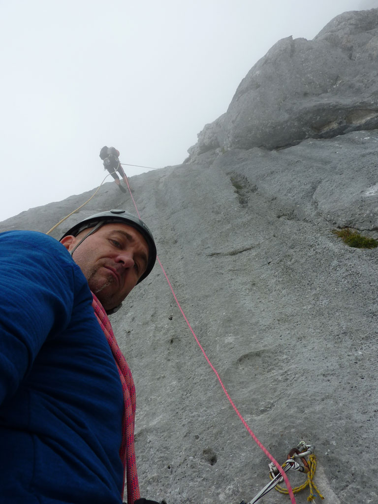Steil ist diesem Fall wirklich geil, aber dazu später mehr. Chris und ich wollten den (eigentlich) schönen Sonntag für eine kurze Kletterei am Brett nutzen. Doch am Zustieg via Mitterkaseralm war schon klar, dass die aufkommenden Wolken sich nicht mehr verziehen werden. Am Einstieg zur Route Steil ist geil (6+) war’s dann natürlich nicht sonderlich warm und keiner wusste mehr, was uns geritten hatte eine kurze Hose anzuziehen. Nach ein paar Bissen und den üblichen Vorbereitungen stiegen wir in die ersten beiden Seillängen ein, bevor die eigentliche Kletterei beginnt. Die dritte Seillänge ist zwar nicht schwer, aber man muss schon einen Gang raufschalten, bevor’s dann in der nächsten schon zur Sache geht. Chris hatte die Ehre und das Vergnügen zugleich diese Schlüsselseillänge vorzusteigen, und ja, steil ist geil! Durch den dichten Nebel in mystischer Umgebung wirkte das Ganze noch etwas kniffeliger, aber Chris meisterte die schwierigen Züge auf der kleingriffigen Platte. Nun war ich an der Reihe, was im Nachstieg stets keine so großer Herausforderung mehr ist. Trotzdem muss man die Züge auch auflösen und in der glatten Platte darauf vertrauen, dass die Reibung der Kletterschuhe bis zur nächsten größeren Leiste ausreicht. Aber alles hat gut geklappt, und nach zwei weiteren Seillängen machten wir uns ans Abseilen vom letzten Stand der Route. Die Route ist mit redundante Abseilständen eingerichtet und nach vier Abseilmanövern steht man wieder beim Einstieg.
