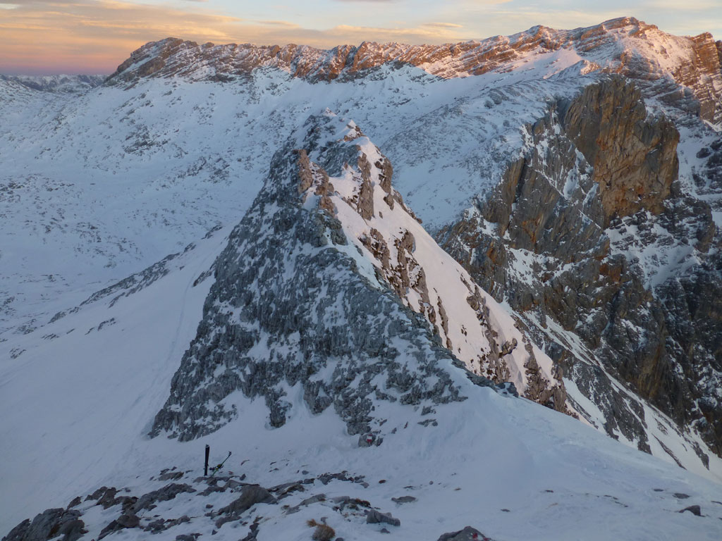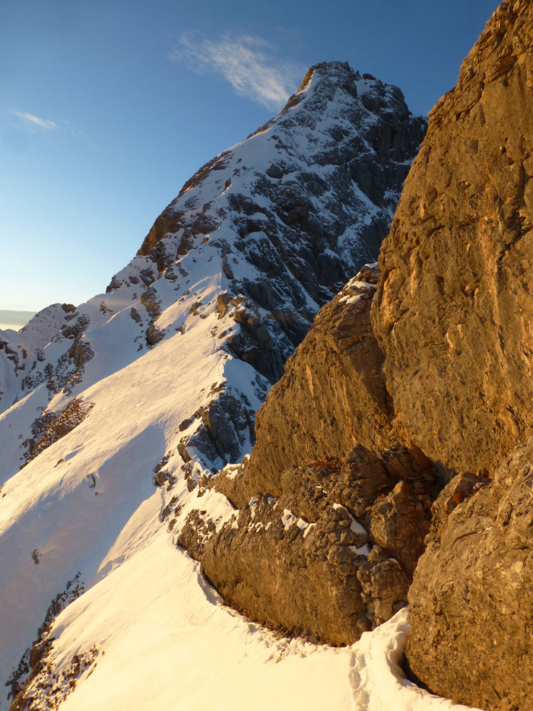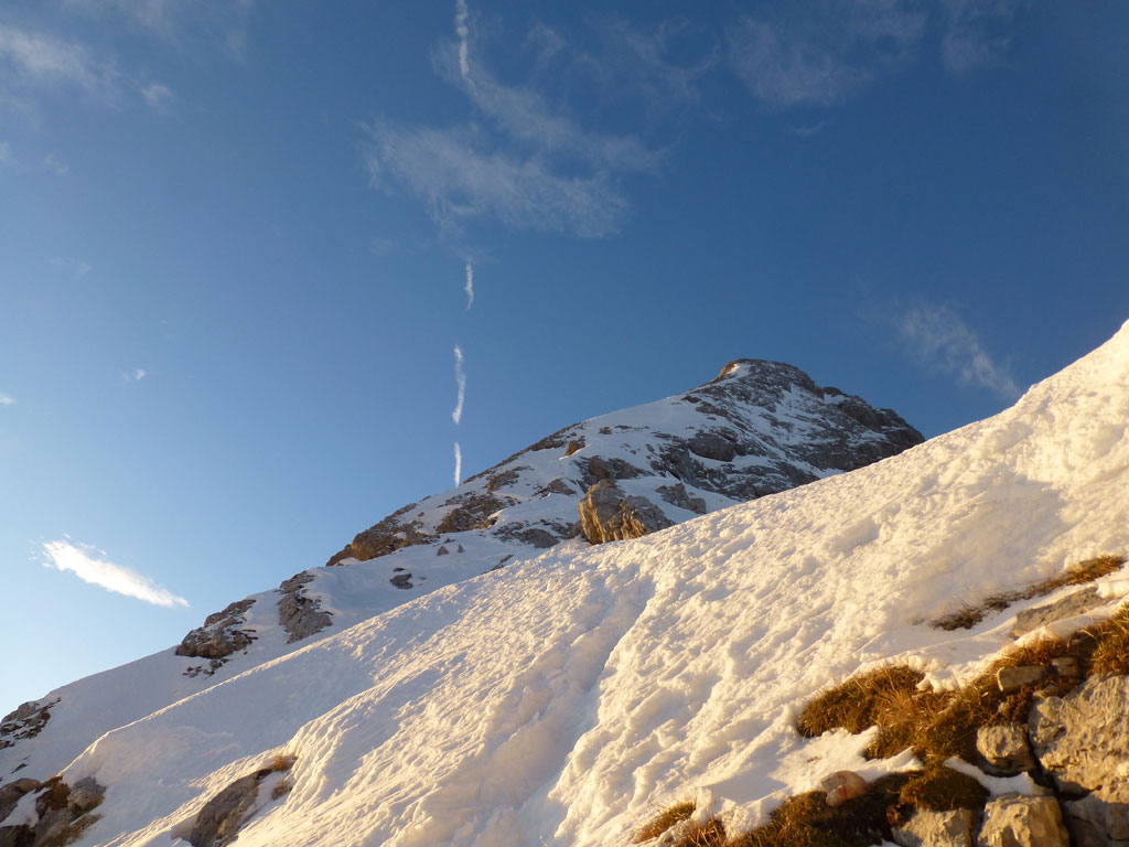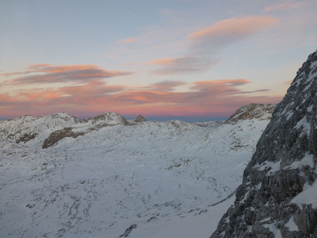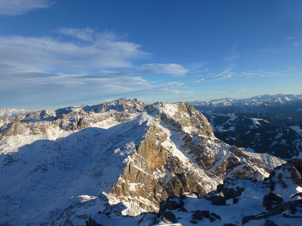 Schi- und Bergtour von Rohrmoos bei Maria Alm auf die Buchauer Scharte und weiter zur Schönfeldspitze. Die Tage sind im Hochwinter bekanntlich kurz, ich obligatorisch viel zu spät dran, also heisst die Devise vorerst in einer vernüftigen Zeit bis zur Scharte zu kommen. Nachdem in den letzten Tage noch immer kein großartiger Schneezuwachs zu verzeichnen war, bedeutet das vorerst über den Wanderweg an der Kasereggkapelle vorbei durch den Wald bis zum Forstweg in Richtung Schranbachalm zu stapfen. Auf und neben des Weges war dann genug Schnee für den Umstieg auf Schi vorhanden. In einer vertretbaren Zeit gelangte ich dann ohne Probleme bis zur Buchauer Scharte, und stieg von dieser mit Schi weiter in Richtung Schönfeldspitze auf. Nach einer Querung gelangte ich bis zum Grat, wo ich die Schi deponierte, auf Steigeisen und Pickel wechselte, und eine dringend nötige Pause einlegte. Entlang des Grates stapfte ich langsam aber stetig im teilweise kniehohen Schnee zum Gipfel empor. Zugegebenermaßen hatte ich bei der stellenweise ausgesetzten Querung ein mulmiges Gefühl und prüfte mehrmals, wie kompakt die Schneeauflage am Fels tatsächlich ist. Die letzten 150 Höhenmeter waren schließlich mehr als mühsam, ich musste mehrmals tief durchatmen und mich darauf besinnen, dass die Zeit langsam knapp wird. Trotz allem erreichte ich gegen 16:30 Uhr endlich den Gipfel und war überwältig vom Ausblick auf die umliegenden Gipfel. Nach einer kleinen Pause mit Müsliriegel und Wasser machte ich mich eiligst an den Abstieg. Das Abendlicht sorgte in diesem Ambiente für eine unvergleichliche Stimmung, und wieder beim Schidepot angekommen, war ich irgendwie erleichtert, dass ich den schwierigsten Teil der Tour noch bei Tageslicht hinter mich gebracht hatte. Die Abfahrt war dann zwar kein stilistischer Höhepunkt mehr, aber immerhin ein schöner Abschluss für diese gelungene Unternehmung.