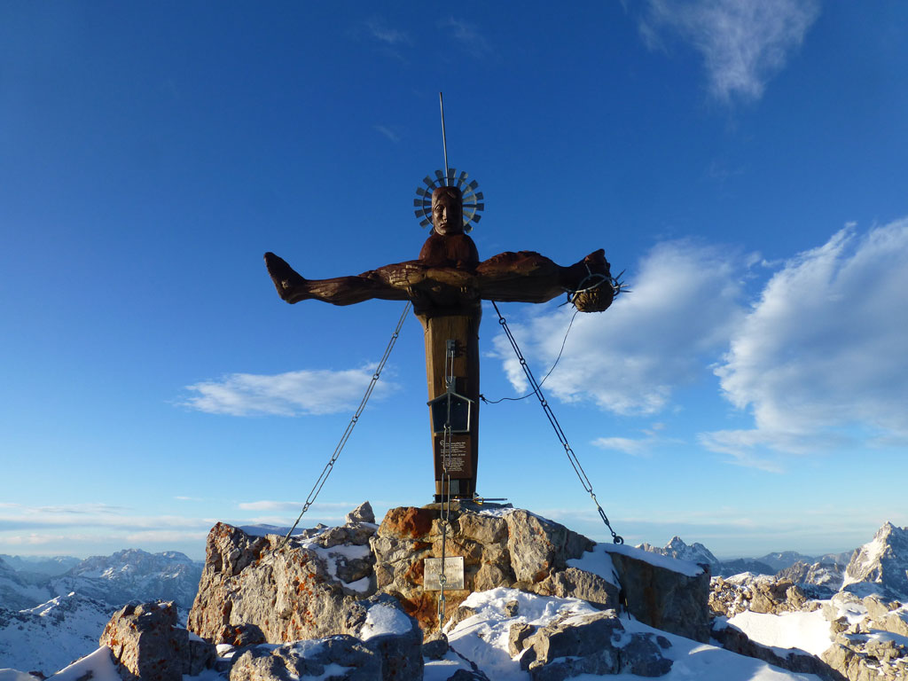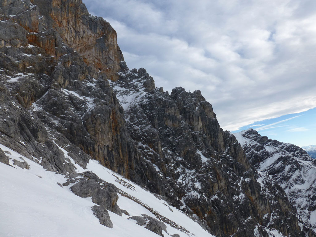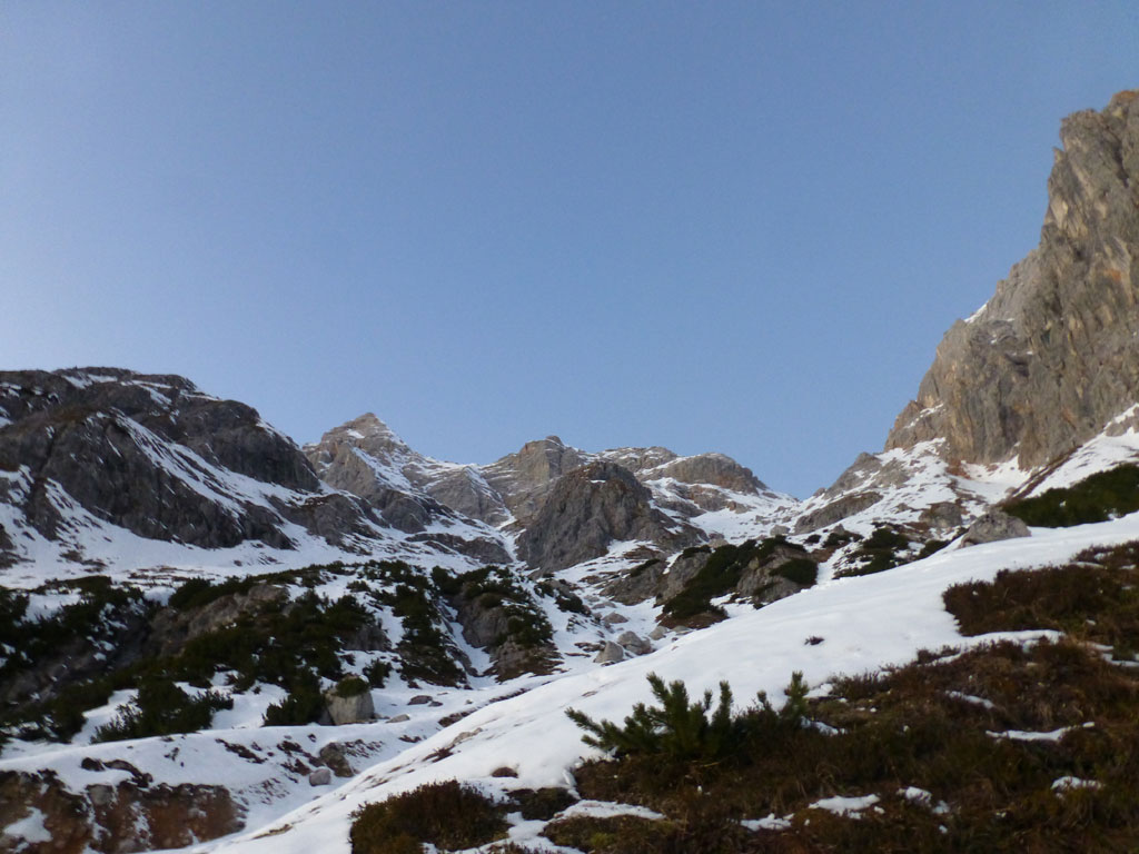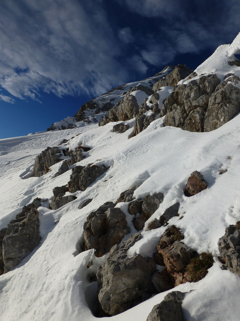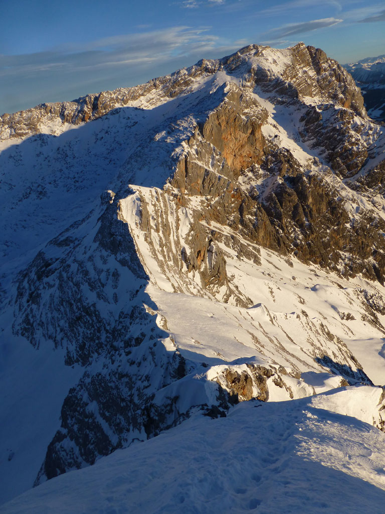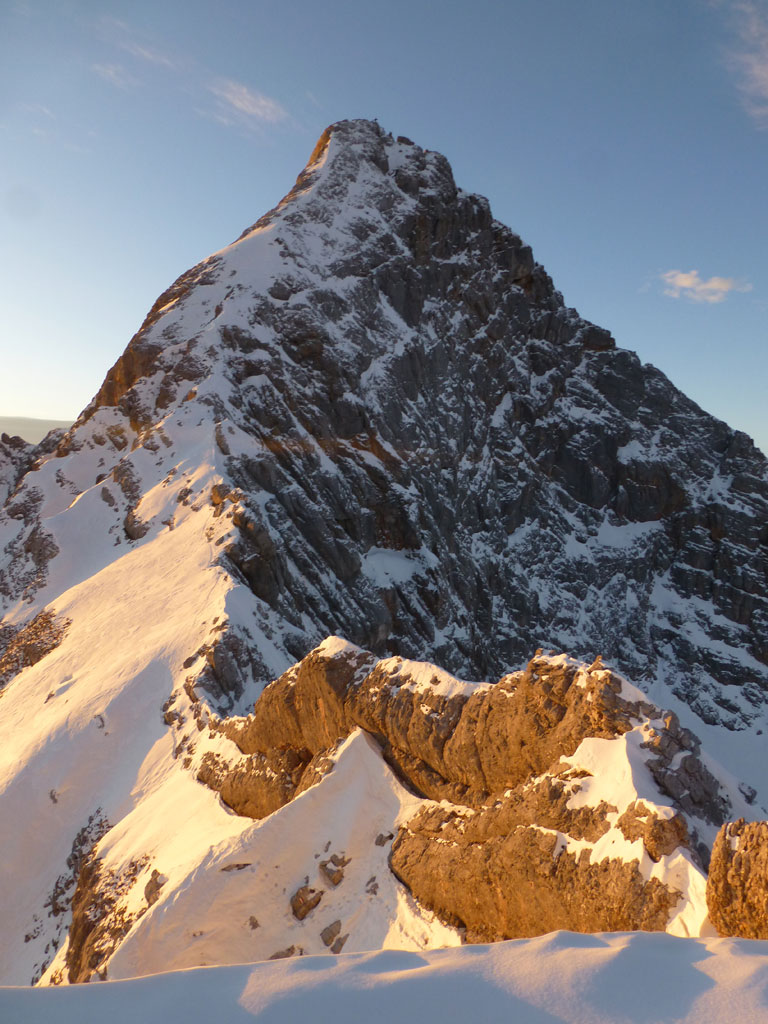 Schi- und Bergtour von Rohrmoos bei Maria Alm auf die Buchauer Scharte und weiter zur Schönfeldspitze. Die Tage sind im Hochwinter bekanntlich kurz, ich obligatorisch viel zu spät dran, also heisst die Devise vorerst in einer vernüftigen Zeit bis zur Scharte zu kommen. Nachdem in den letzten Tage noch immer kein großartiger Schneezuwachs zu verzeichnen war, bedeutet das vorerst über den Wanderweg an der Kasereggkapelle vorbei durch den Wald bis zum Forstweg in Richtung Schranbachalm zu stapfen. Auf und neben des Weges war dann genug Schnee für den Umstieg auf Schi vorhanden. In einer vertretbaren Zeit gelangte ich dann ohne Probleme bis zur Buchauer Scharte, und stieg von dieser mit Schi weiter in Richtung Schönfeldspitze auf. Nach einer Querung gelangte ich bis zum Grat, wo ich die Schi deponierte, auf Steigeisen und Pickel wechselte, und eine dringend nötige Pause einlegte. Entlang des Grates stapfte ich langsam aber stetig im teilweise kniehohen Schnee zum Gipfel empor. Zugegebenermaßen hatte ich bei der stellenweise ausgesetzten Querung ein mulmiges Gefühl und prüfte mehrmals, wie kompakt die Schneeauflage am Fels tatsächlich ist. Die letzten 150 Höhenmeter waren schließlich mehr als mühsam, ich musste mehrmals tief durchatmen und mich darauf besinnen, dass die Zeit langsam knapp wird. Trotz allem erreichte ich gegen 16:30 Uhr endlich den Gipfel und war überwältig vom Ausblick auf die umliegenden Gipfel. Nach einer kleinen Pause mit Müsliriegel und Wasser machte ich mich eiligst an den Abstieg. Das Abendlicht sorgte in diesem Ambiente für eine unvergleichliche Stimmung, und wieder beim Schidepot angekommen, war ich irgendwie erleichtert, dass ich den schwierigsten Teil der Tour noch bei Tageslicht hinter mich gebracht hatte. Die Abfahrt war dann zwar kein stilistischer Höhepunkt mehr, aber immerhin ein schöner Abschluss für diese gelungene Unternehmung.