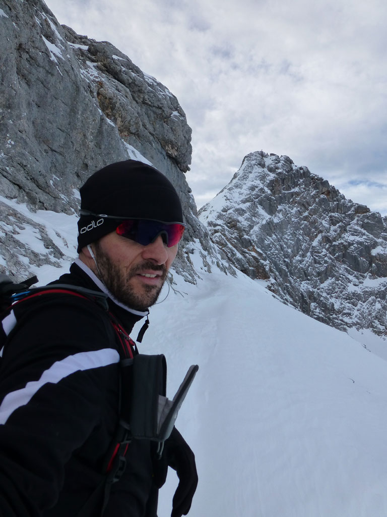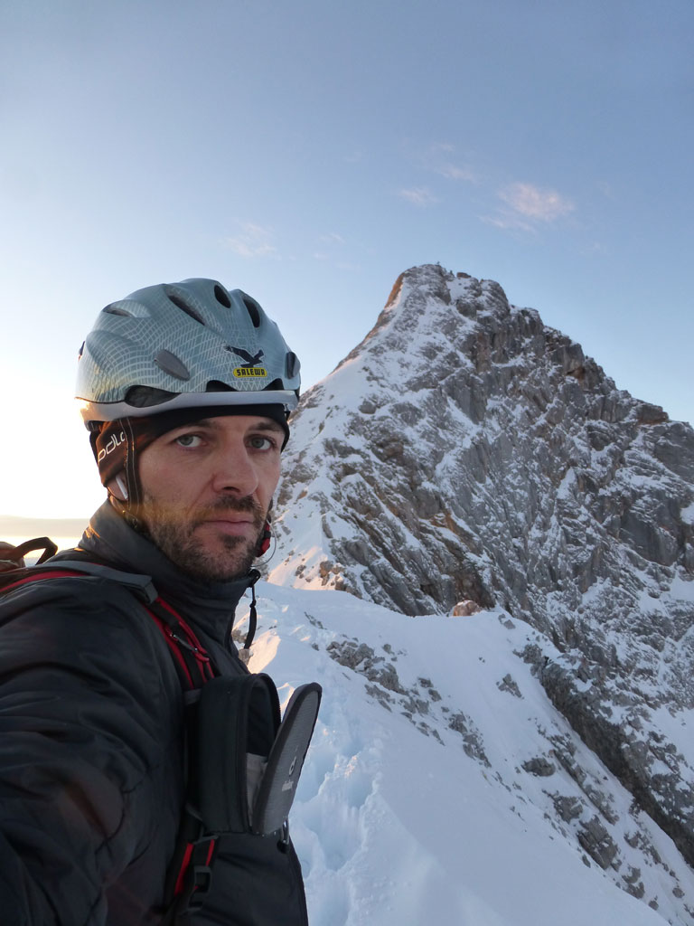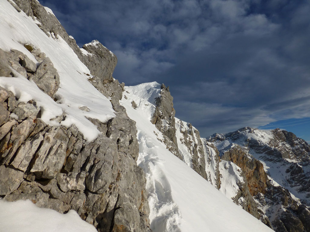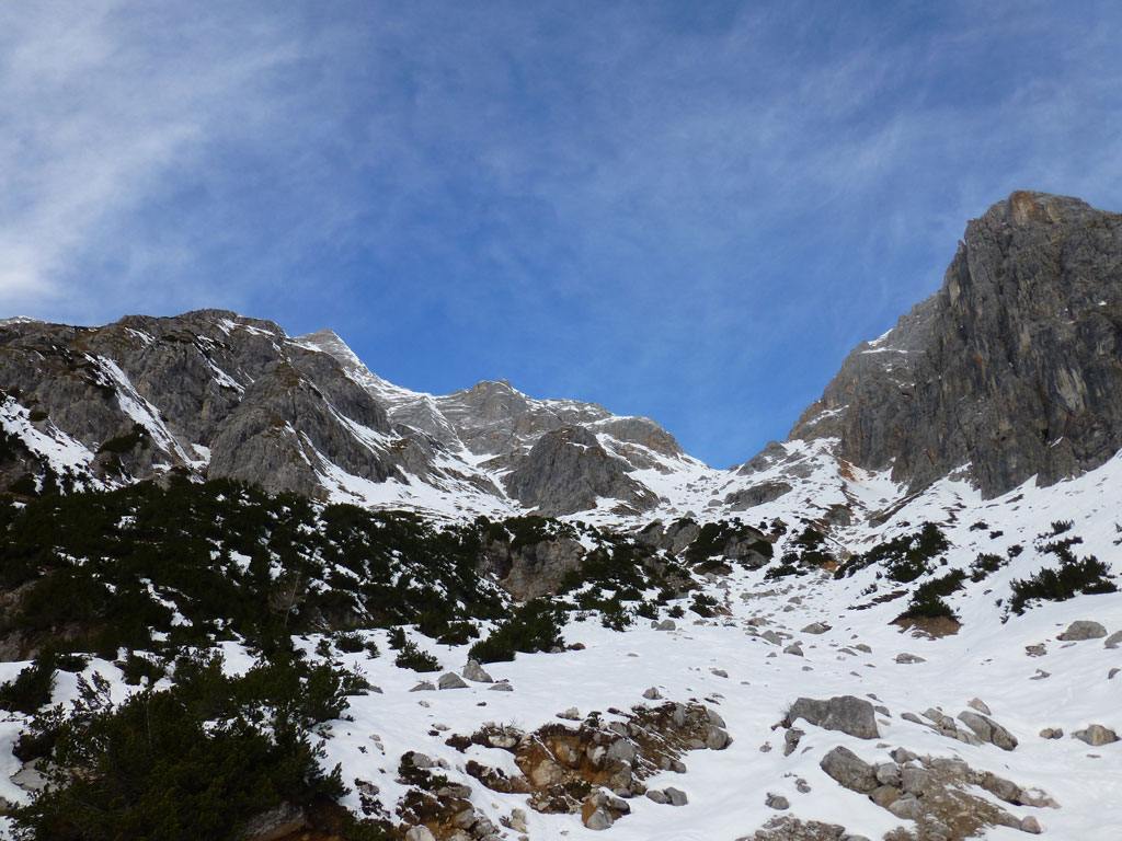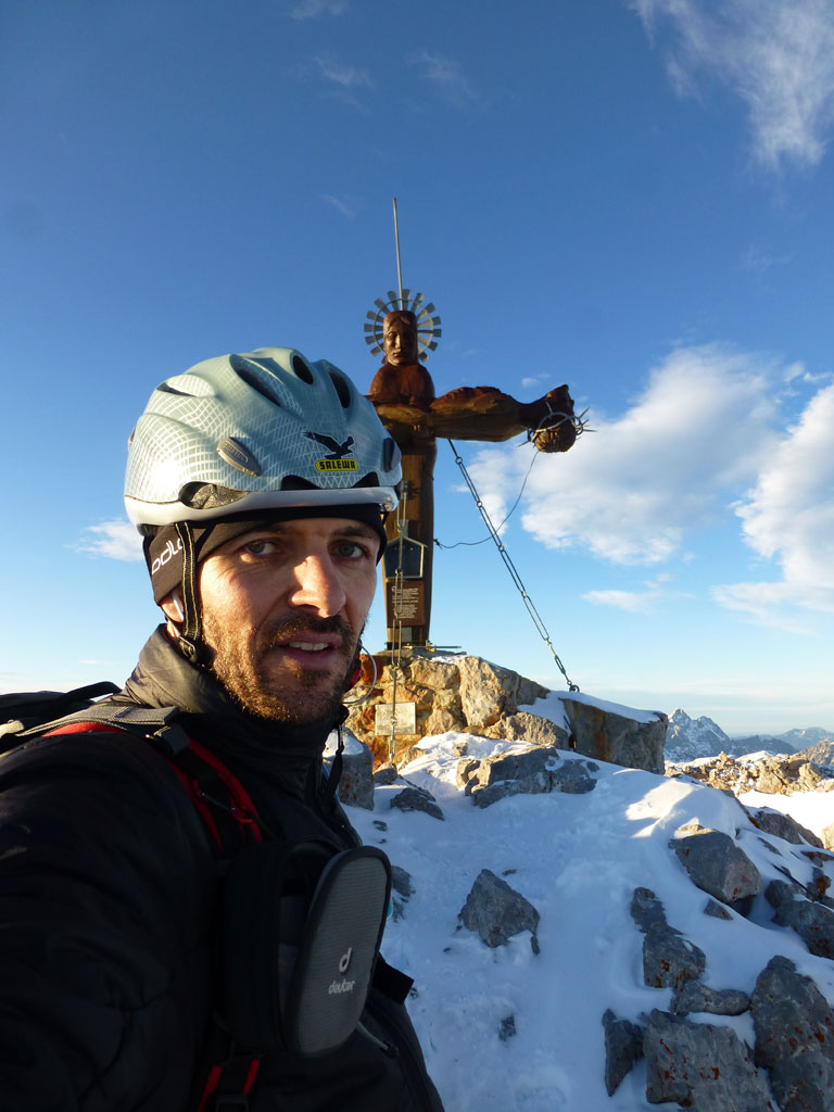 Schi- und Bergtour von Rohrmoos bei Maria Alm auf die Buchauer Scharte und weiter zur Schönfeldspitze. Die Tage sind im Hochwinter bekanntlich kurz, ich obligatorisch viel zu spät dran, also heisst die Devise vorerst in einer vernüftigen Zeit bis zur Scharte zu kommen. Nachdem in den letzten Tage noch immer kein großartiger Schneezuwachs zu verzeichnen war, bedeutet das vorerst über den Wanderweg an der Kasereggkapelle vorbei durch den Wald bis zum Forstweg in Richtung Schranbachalm zu stapfen. Auf und neben des Weges war dann genug Schnee für den Umstieg auf Schi vorhanden. In einer vertretbaren Zeit gelangte ich dann ohne Probleme bis zur Buchauer Scharte, und stieg von dieser mit Schi weiter in Richtung Schönfeldspitze auf. Nach einer Querung gelangte ich bis zum Grat, wo ich die Schi deponierte, auf Steigeisen und Pickel wechselte, und eine dringend nötige Pause einlegte. Entlang des Grates stapfte ich langsam aber stetig im teilweise kniehohen Schnee zum Gipfel empor. Zugegebenermaßen hatte ich bei der stellenweise ausgesetzten Querung ein mulmiges Gefühl und prüfte mehrmals, wie kompakt die Schneeauflage am Fels tatsächlich ist. Die letzten 150 Höhenmeter waren schließlich mehr als mühsam, ich musste mehrmals tief durchatmen und mich darauf besinnen, dass die Zeit langsam knapp wird. Trotz allem erreichte ich gegen 16:30 Uhr endlich den Gipfel und war überwältig vom Ausblick auf die umliegenden Gipfel. Nach einer kleinen Pause mit Müsliriegel und Wasser machte ich mich eiligst an den Abstieg. Das Abendlicht sorgte in diesem Ambiente für eine unvergleichliche Stimmung, und wieder beim Schidepot angekommen, war ich irgendwie erleichtert, dass ich den schwierigsten Teil der Tour noch bei Tageslicht hinter mich gebracht hatte. Die Abfahrt war dann zwar kein stilistischer Höhepunkt mehr, aber immerhin ein schöner Abschluss für diese gelungene Unternehmung.