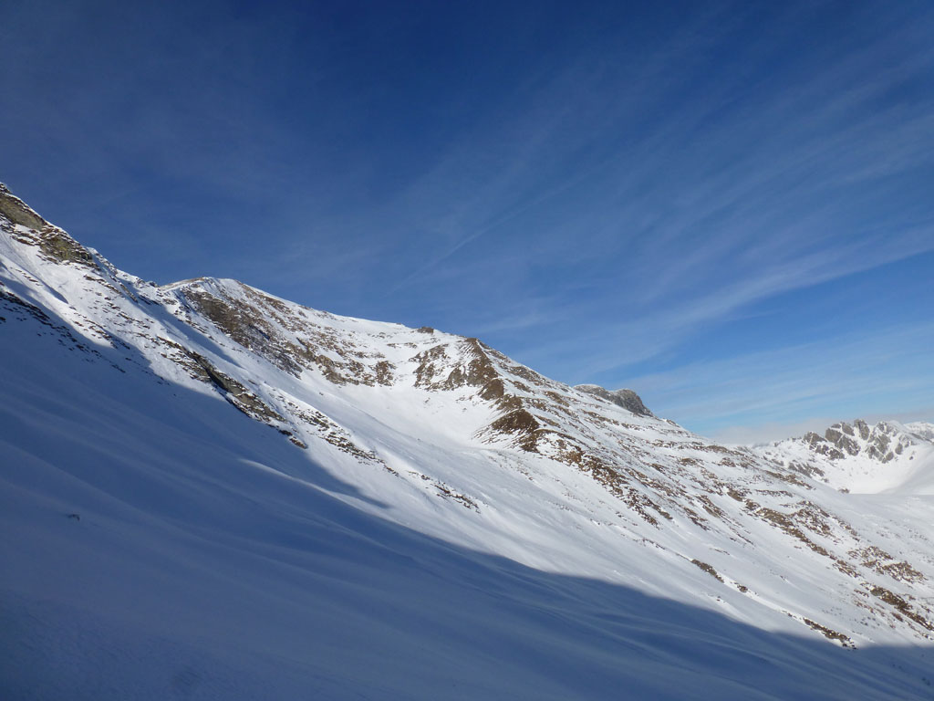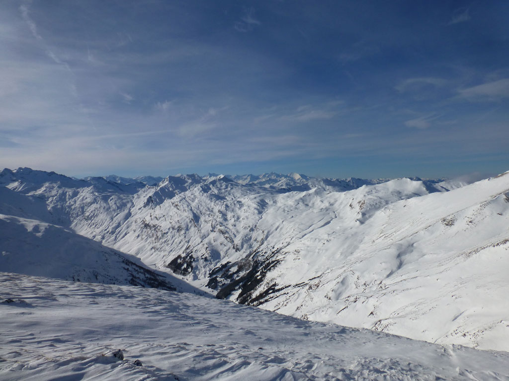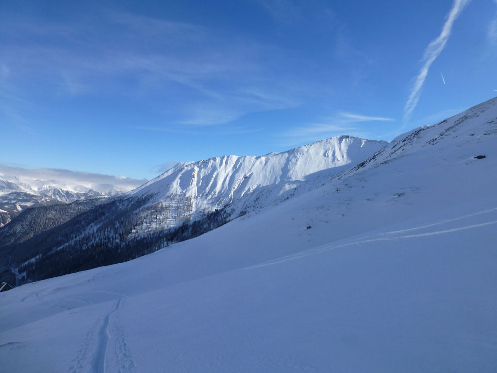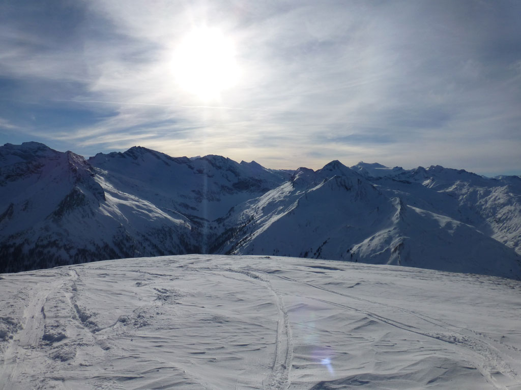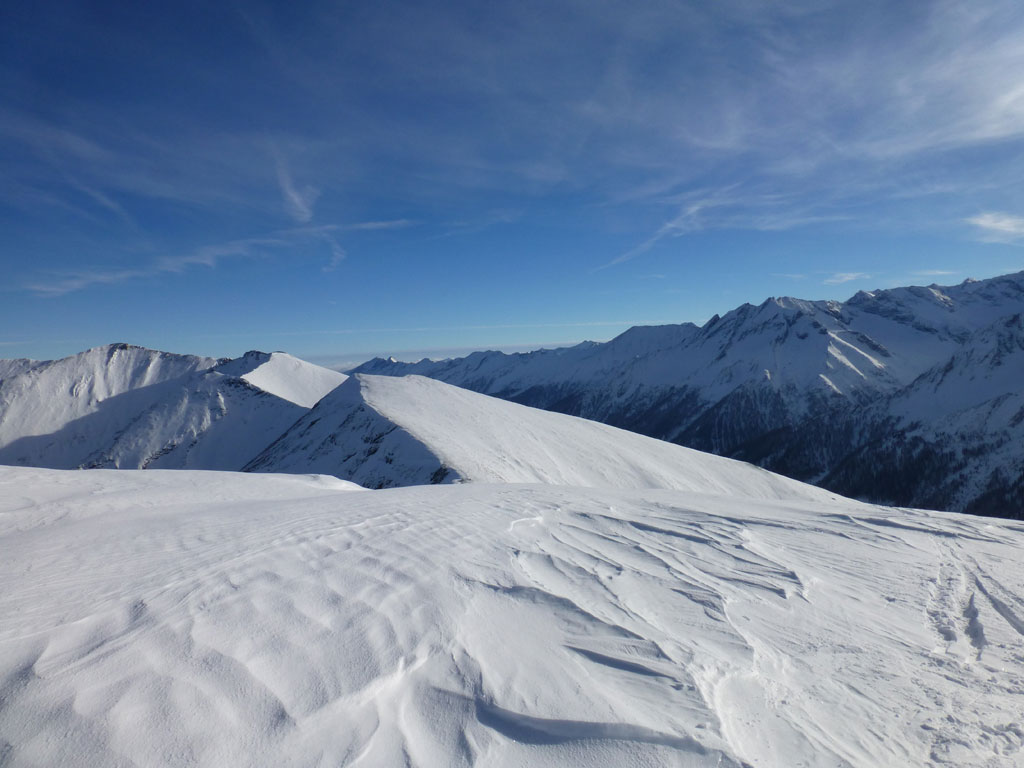 Die teilweise vorhandenen Spuren im Schnee führten direkt auf einen vor mir liegenden Grat, der gar nicht zu der von mir geplanten Route passte. Es wurde immer steiler, und nach mühevoll erarbeitete Höhenmeter stand ich endlich am Grat, wo die Sonne die merklich kalte Luft etwas erwärmte. Spätestens jetzt war mir klar, ich bin hier definitiv nicht im Riedingtal und keiner der sichtbaren Gipfel ist auch nur annähernd das Mosermandl. Entlang des Grates stieg ich noch auf eine unscheibare Erhöhung auf, die sich nach einer späteren Recherche als Barleitenkopf entpuppte. Mein Blick schweifte nun auf den dahinterliegenden Gipfel, den man über den abgeblasenen Grat erreichten sollte. Aber nach einer kurzen Pause und mit etwas Bedenken, weil ich keine Ahnung hatte, wo ich überhaupt bin, zog ich es vor den Rückweg anzutreten. Die Abfahrt vom Grat ins Tal war ohne Übertreibung Powder pur, und sicherlich ein würdiger Jahresausklang.