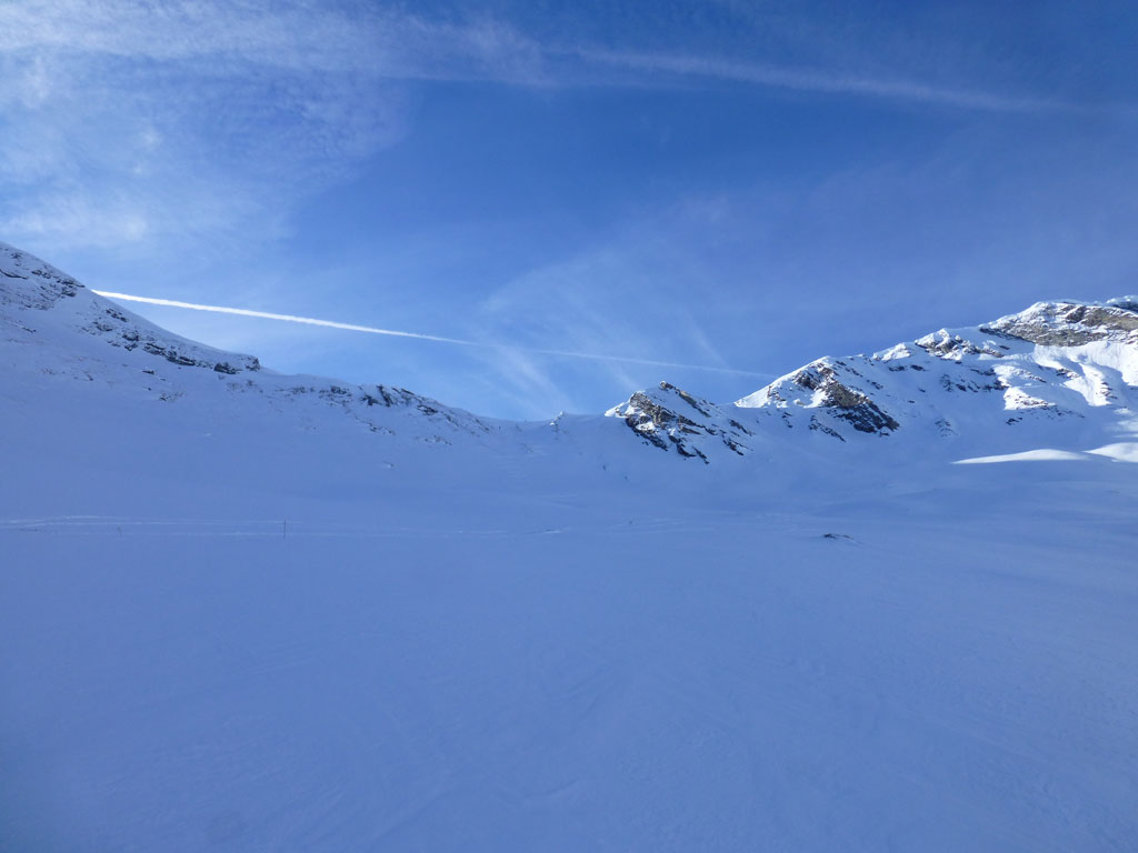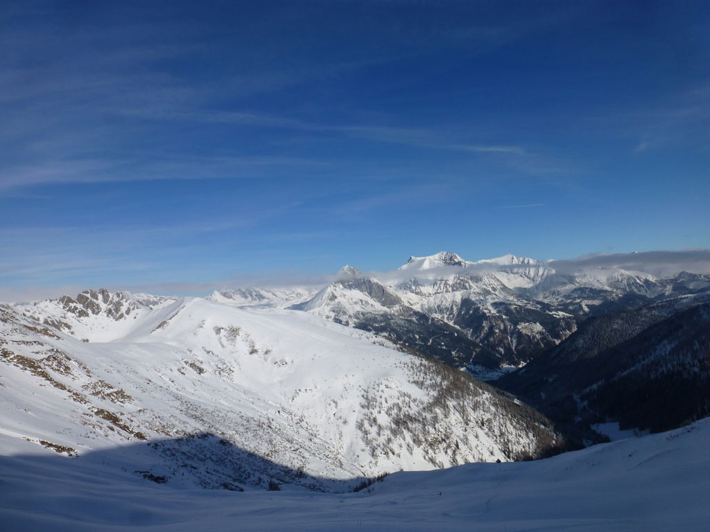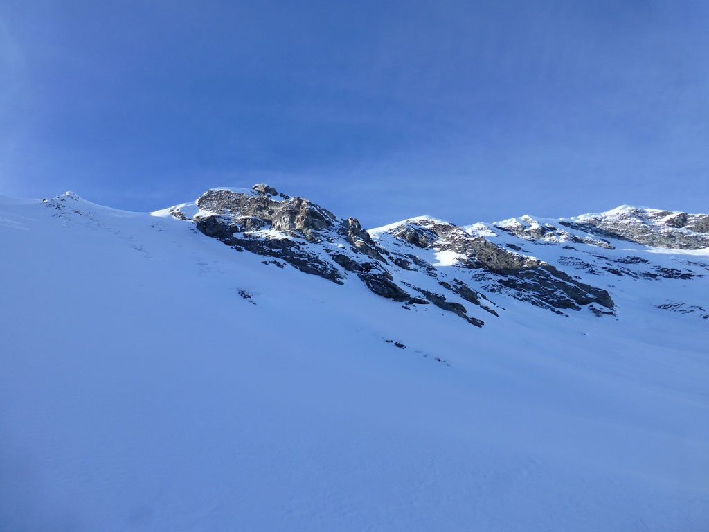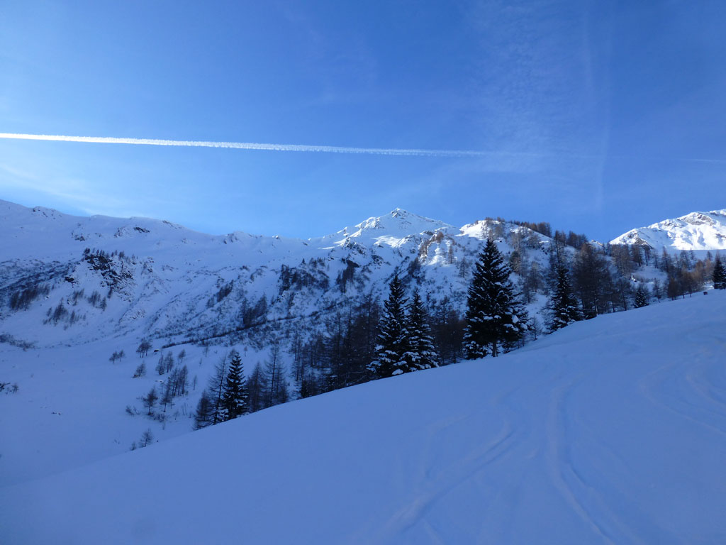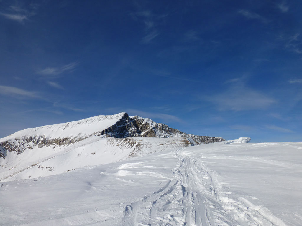 Die teilweise vorhandenen Spuren im Schnee führten direkt auf einen vor mir liegenden Grat, der gar nicht zu der von mir geplanten Route passte. Es wurde immer steiler, und nach mühevoll erarbeitete Höhenmeter stand ich endlich am Grat, wo die Sonne die merklich kalte Luft etwas erwärmte. Spätestens jetzt war mir klar, ich bin hier definitiv nicht im Riedingtal und keiner der sichtbaren Gipfel ist auch nur annähernd das Mosermandl. Entlang des Grates stieg ich noch auf eine unscheibare Erhöhung auf, die sich nach einer späteren Recherche als Barleitenkopf entpuppte. Mein Blick schweifte nun auf den dahinterliegenden Gipfel, den man über den abgeblasenen Grat erreichten sollte. Aber nach einer kurzen Pause und mit etwas Bedenken, weil ich keine Ahnung hatte, wo ich überhaupt bin, zog ich es vor den Rückweg anzutreten. Die Abfahrt vom Grat ins Tal war ohne Übertreibung Powder pur, und sicherlich ein würdiger Jahresausklang.
