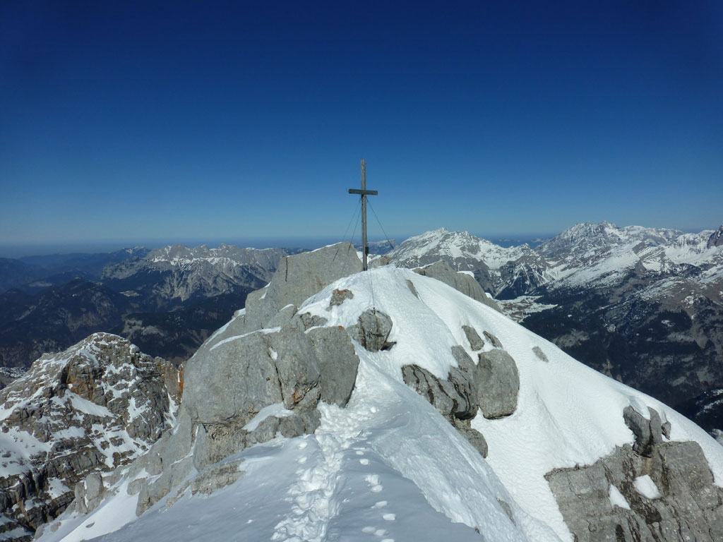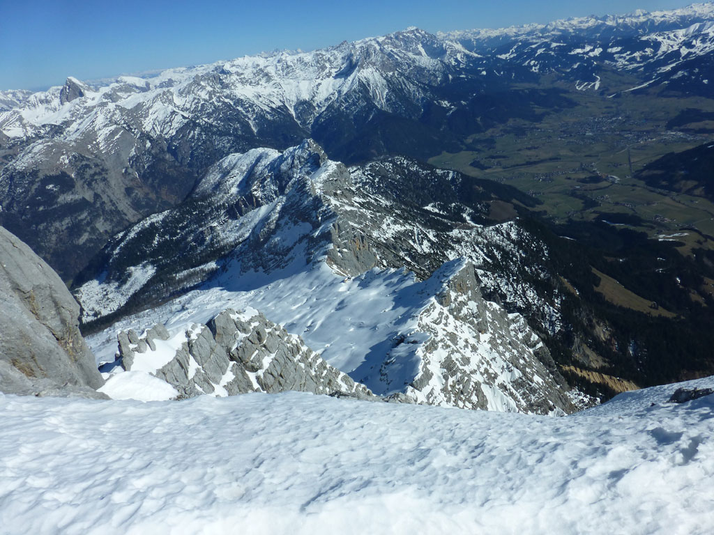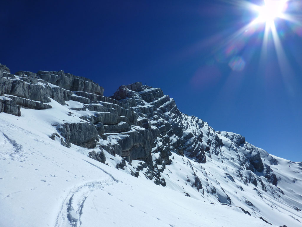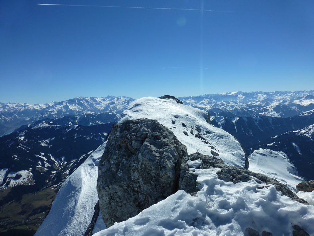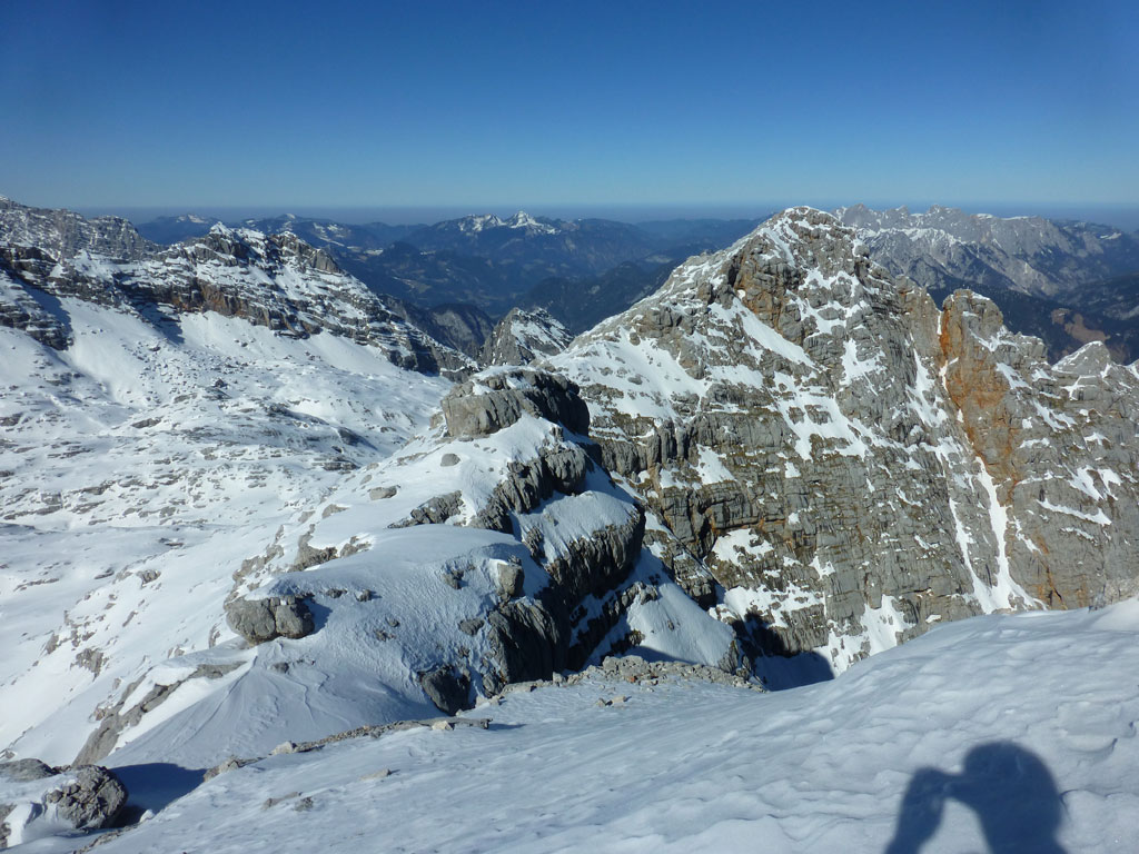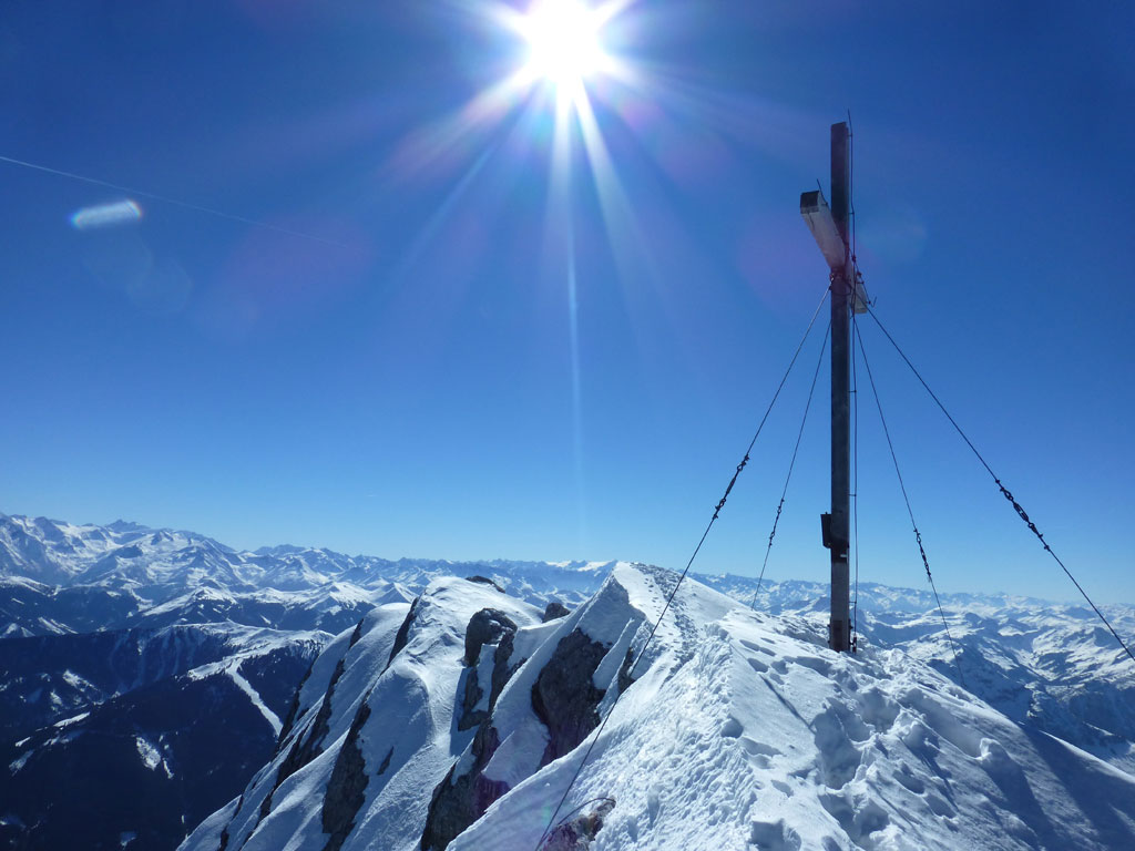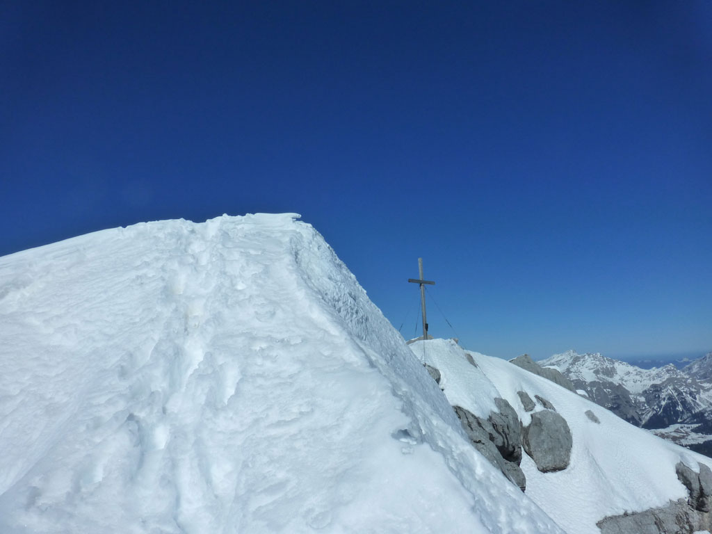 Schitour bei perfektem Wetter über das Ebersbergkar und Kuchelnieder auf das Birnhorn. Schön, wenn man wochentags kurzfristig Urlaub bekommnt, und nachdem ich mir diese Tour jedes (Früh-)Jahr aufs Neue vornehme, war es heute endlich soweit. Morgens noch schnell das Auto bei der Kfz-Werkstätte meines Vertrauens abgeliefert, und dann mit dem Leihwagen ab nach Weißbach bei Lofer. Vom Parkplatz beim Hackerbauer ging es vorerst viele Höhenmeter zu Fuß in Richtung Ebersberg-Jagdhütte, und dann stetig aufwärts durch das Ebersbergkar zum Kuchelnieder. Dort deponierte ich die Schi und machte mich bei strahlendem Sonnenschein und recht ordentlichen Temperaturen auf zum Gipfel. Die letzten Höhenmeter waren doch noch recht fordernd, jedoch entschädigte mich der grandiose Ausblick und die himmlische Ruhe vollends für die Mühen und den Schweiß. Nach einer für meine Verhältnisse längeren Pause trat ich den Rückweg zum Schidepot an. Vom Kuchelnieder startete dann die lange Abfahrt bis zum letzten Schneefleck unterhalb der Jagdhütte. Anfangs gestaltete sich das Ganze noch mehr oder minder elegant, mit abnehmender Schneequalität dann schon etwas wackeliger, zwischenzeitlich durfte auch ein akrobatischen Vorwärtssalto nicht fehlen, bis ich schließlich mit letzter Kraft erleichtert und müde die Schi abschnallte. Eine Supertour an einem perfektem Tag, die im nächsten Jahr wieder fix am Programm steht 🙂 !