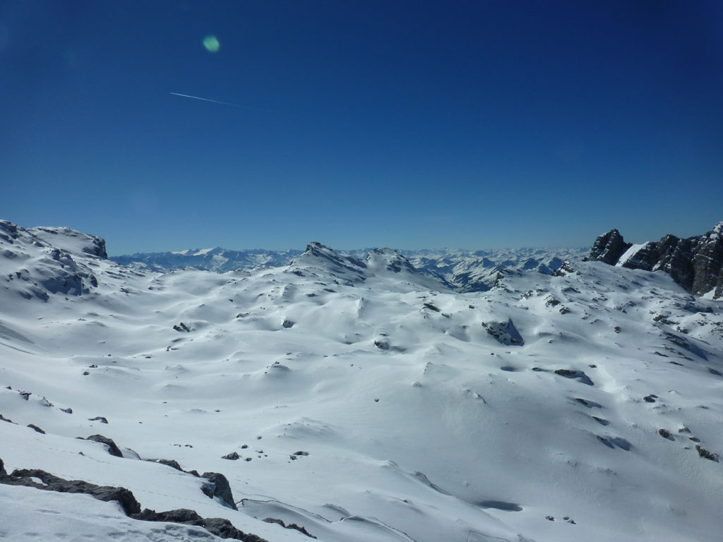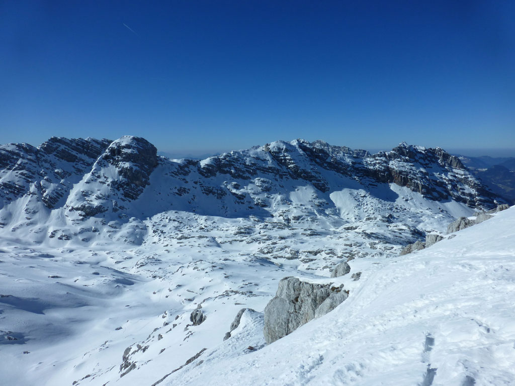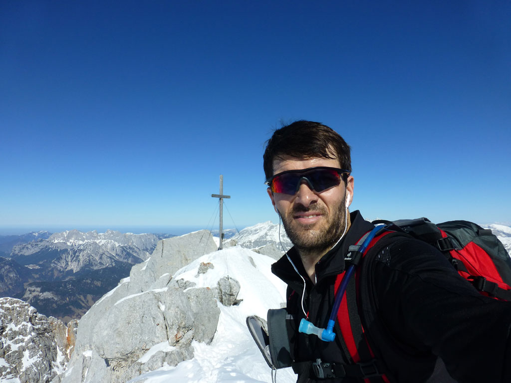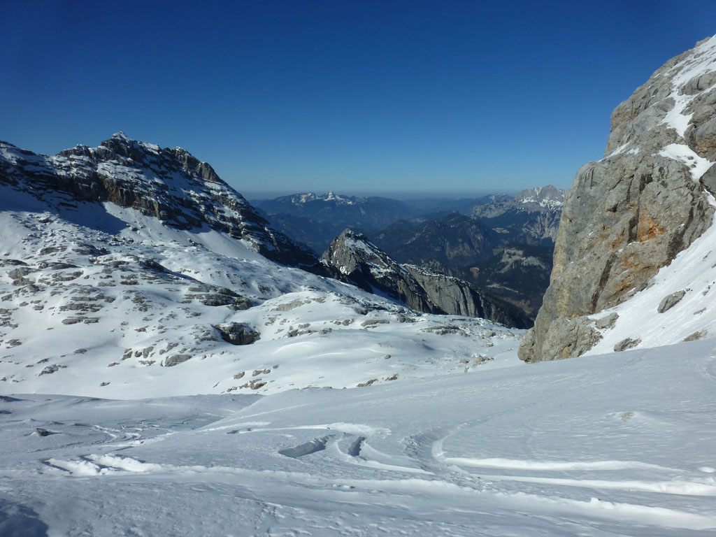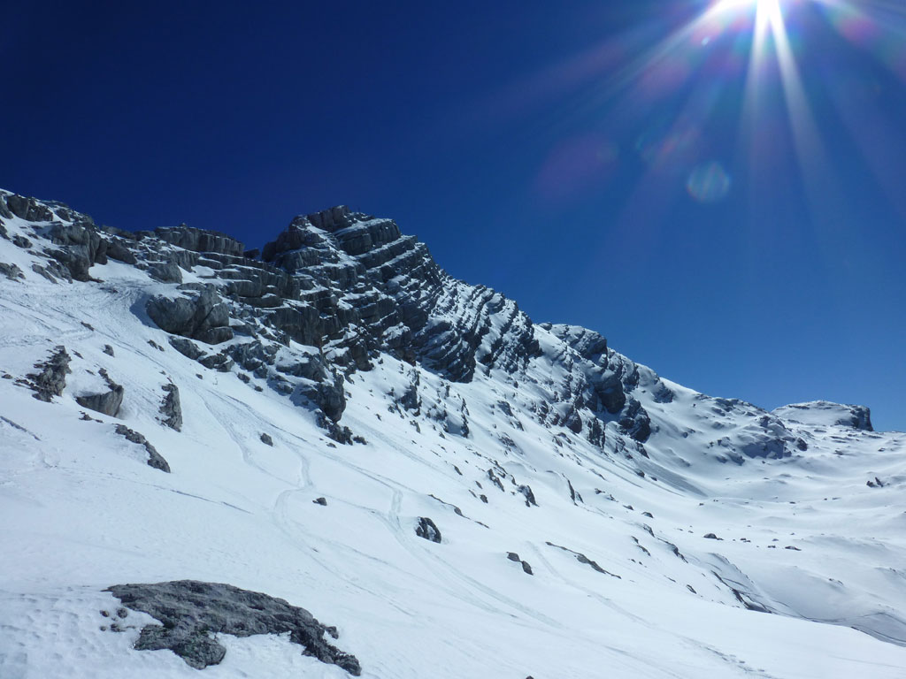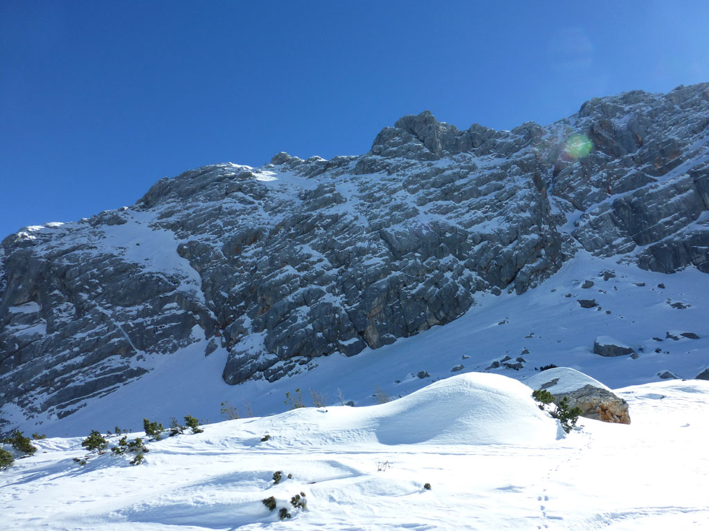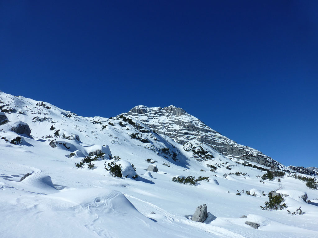 Schitour bei perfektem Wetter über das Ebersbergkar und Kuchelnieder auf das Birnhorn. Schön, wenn man wochentags kurzfristig Urlaub bekommnt, und nachdem ich mir diese Tour jedes (Früh-)Jahr aufs Neue vornehme, war es heute endlich soweit. Morgens noch schnell das Auto bei der Kfz-Werkstätte meines Vertrauens abgeliefert, und dann mit dem Leihwagen ab nach Weißbach bei Lofer. Vom Parkplatz beim Hackerbauer ging es vorerst viele Höhenmeter zu Fuß in Richtung Ebersberg-Jagdhütte, und dann stetig aufwärts durch das Ebersbergkar zum Kuchelnieder. Dort deponierte ich die Schi und machte mich bei strahlendem Sonnenschein und recht ordentlichen Temperaturen auf zum Gipfel. Die letzten Höhenmeter waren doch noch recht fordernd, jedoch entschädigte mich der grandiose Ausblick und die himmlische Ruhe vollends für die Mühen und den Schweiß. Nach einer für meine Verhältnisse längeren Pause trat ich den Rückweg zum Schidepot an. Vom Kuchelnieder startete dann die lange Abfahrt bis zum letzten Schneefleck unterhalb der Jagdhütte. Anfangs gestaltete sich das Ganze noch mehr oder minder elegant, mit abnehmender Schneequalität dann schon etwas wackeliger, zwischenzeitlich durfte auch ein akrobatischen Vorwärtssalto nicht fehlen, bis ich schließlich mit letzter Kraft erleichtert und müde die Schi abschnallte. Eine Supertour an einem perfektem Tag, die im nächsten Jahr wieder fix am Programm steht 🙂 !