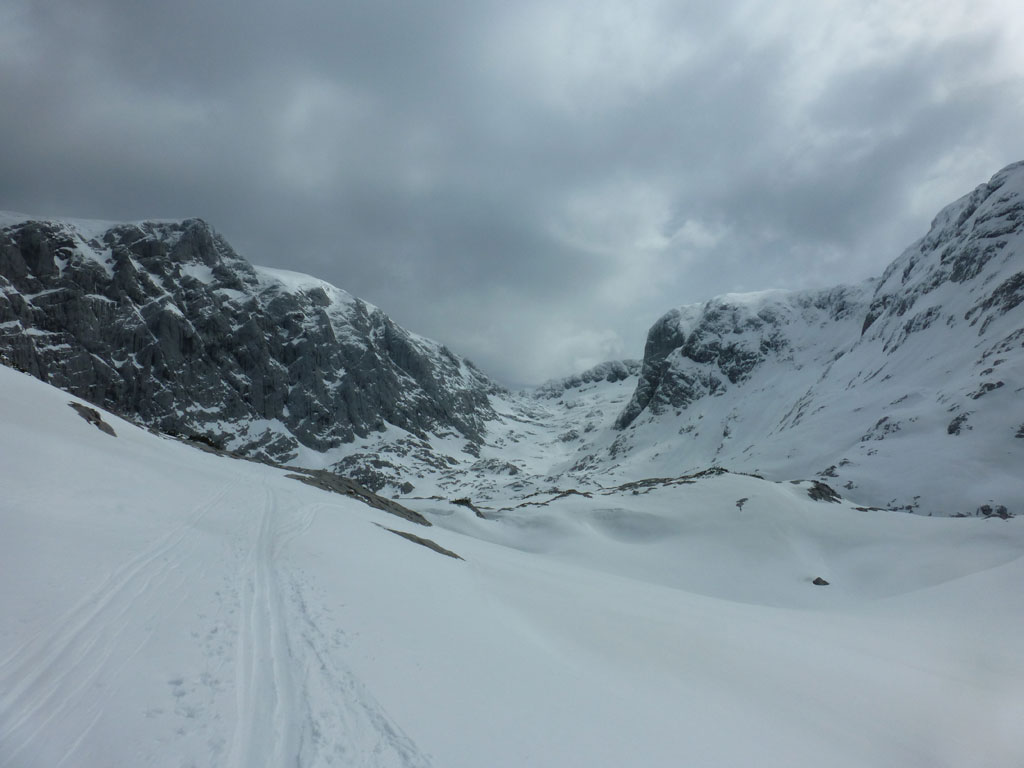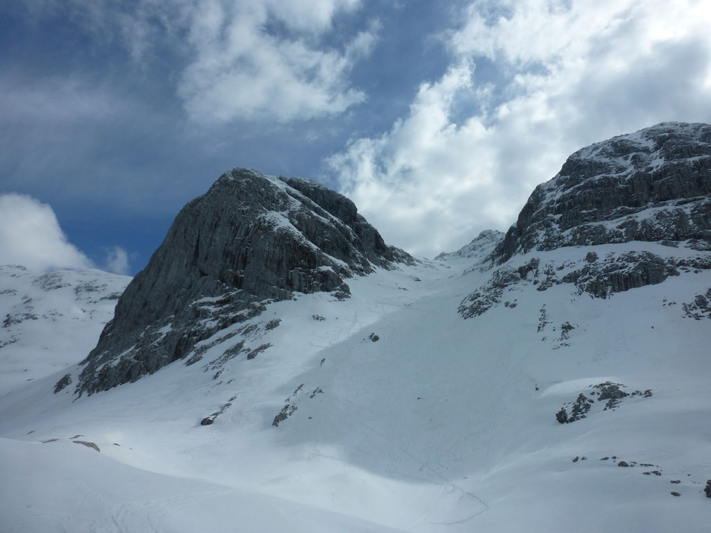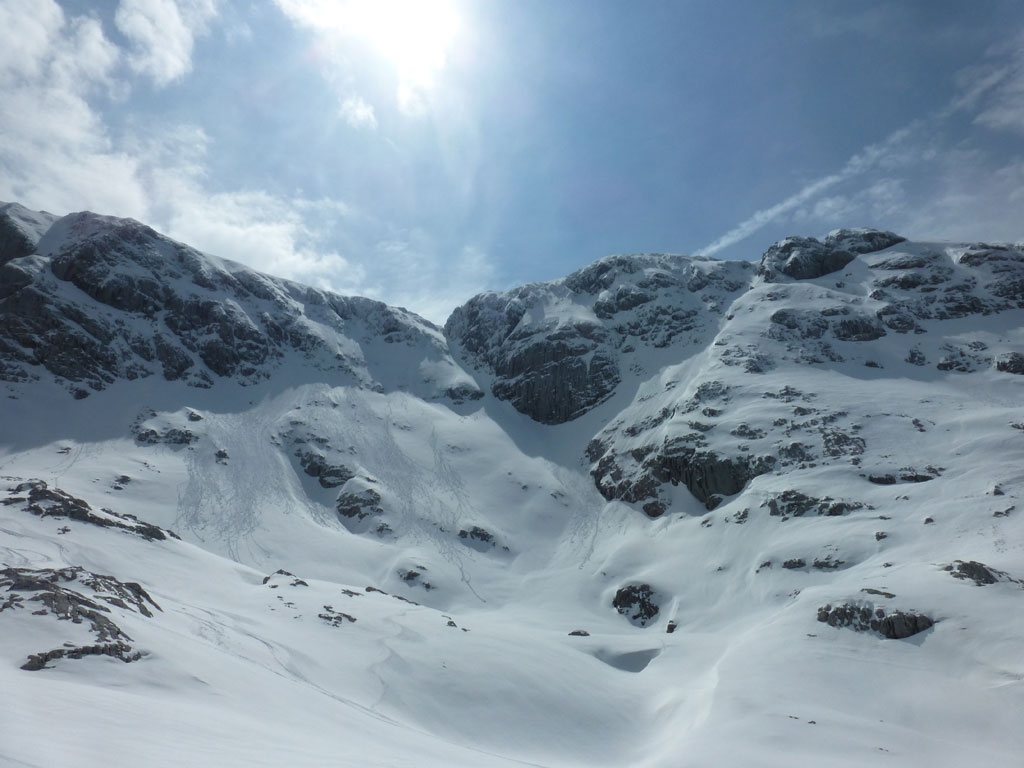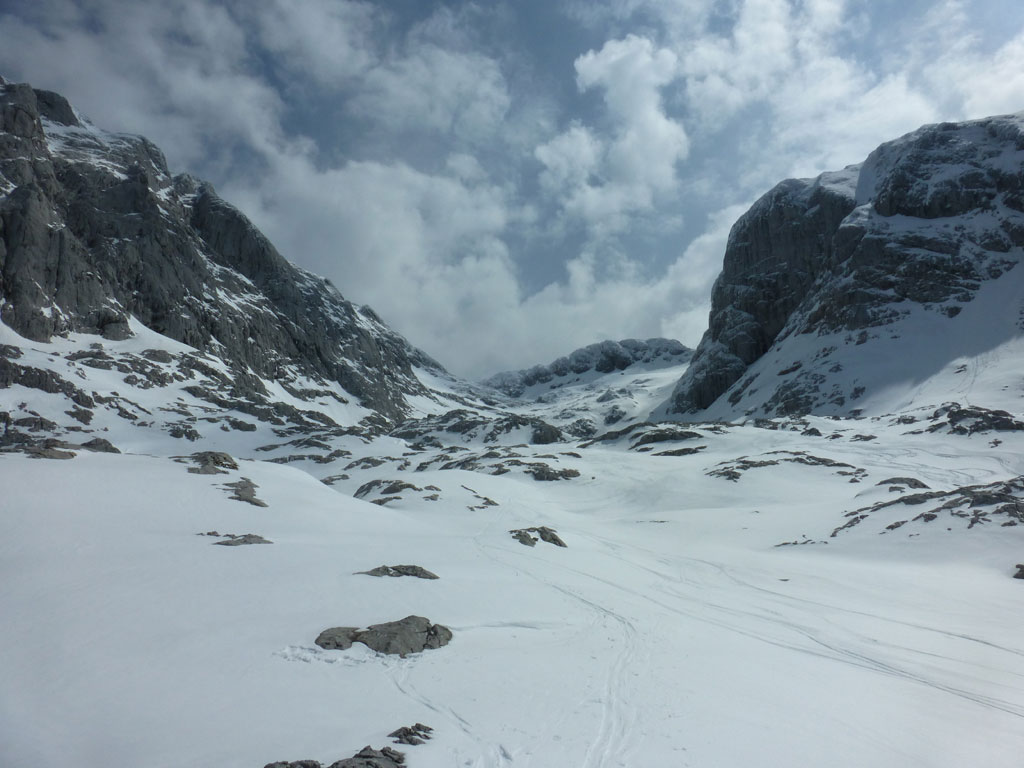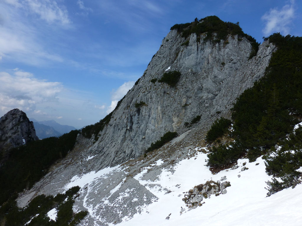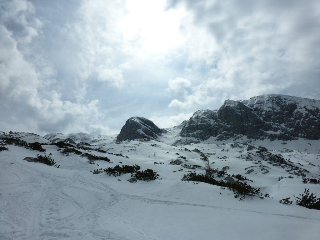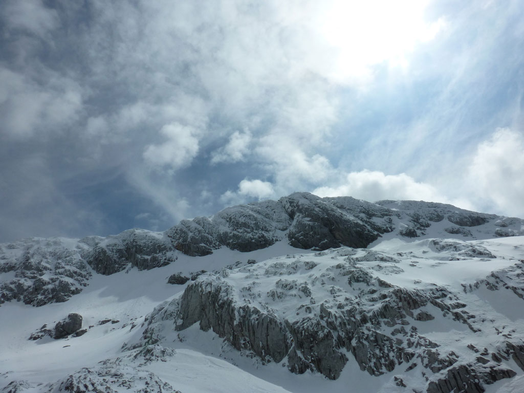 Frühjahrs-Schitour vom Parkplatz Hinterbrand über den Alpeltalsteig und die Umgäng auf den Hohen Göll. Im Tal und unteren Teil des Alpeltalsteigs war nicht viel mit Schnee, aber ab etwa 1500 Meter Höhe eröffnete sich eine herrliche Winterlandschaft mit einer tragenden und dichten Schneedecke durch die Umgäng bis auf den Gipfel, den ich für meine Verhältnisse überaus früh erreichte. Es war gerade einmal Mittag, also nutzte ich nach einem kurzem Rundblick und einer Trinkpause am Hohen Göll die Zeit für einen Lokalaugenschein der Einfahrt zur Ostwand. Wirkt sehr steil und schlecht einsehbar, aber wenn man den Aufstiegsspuren folgt, ist das sicherlich ohne Probleme zu meistern. Ein Projekt, das auf meiner Projektliste ganz oben steht und bald einmal umgesetz werden sollte…