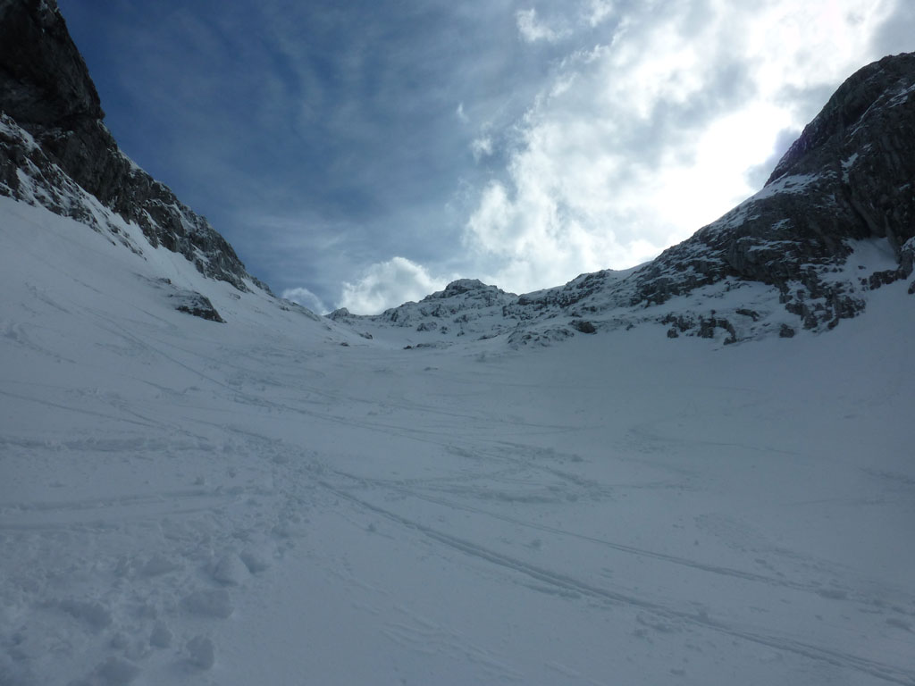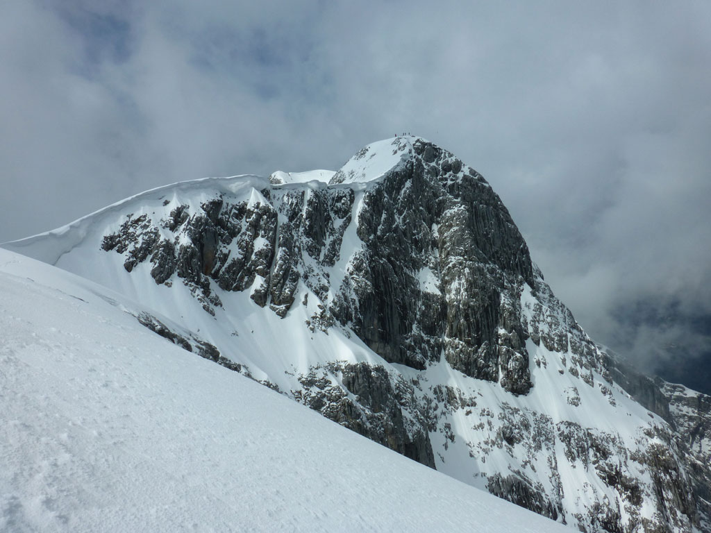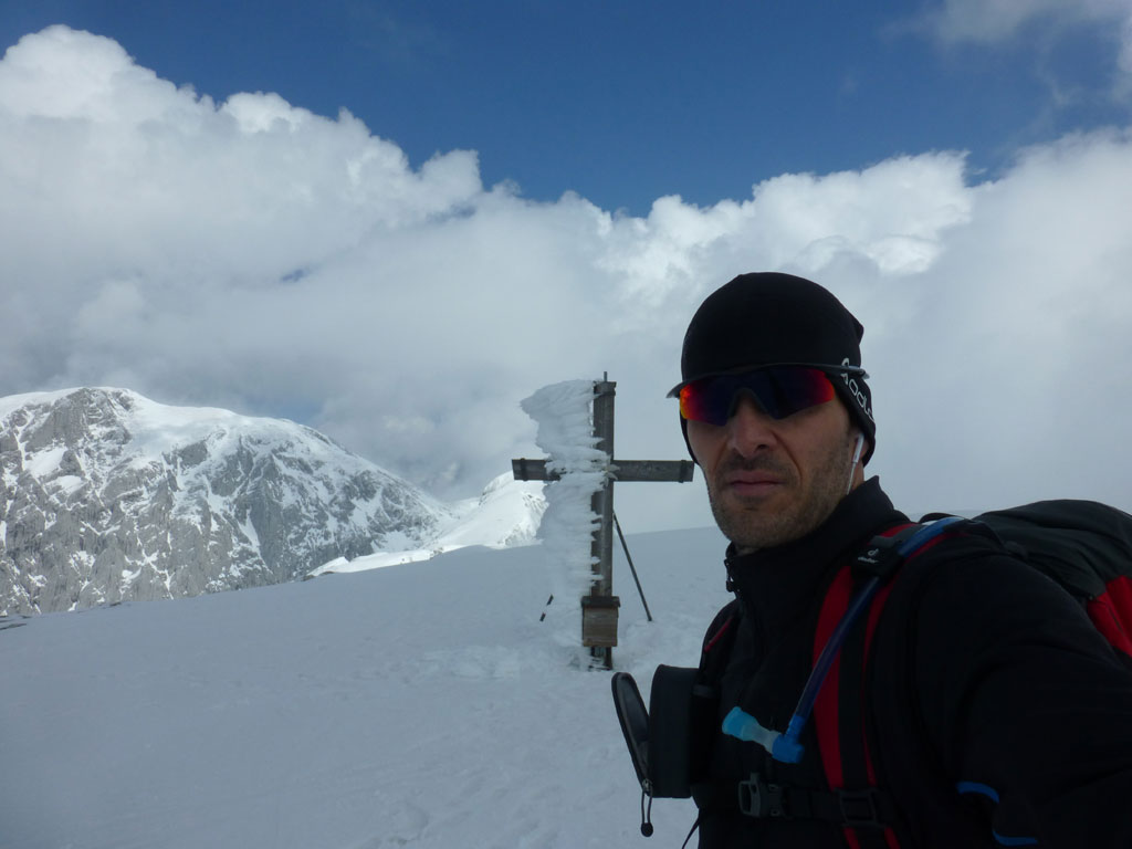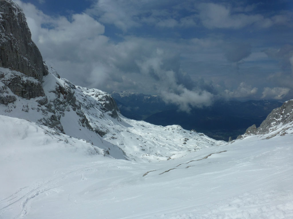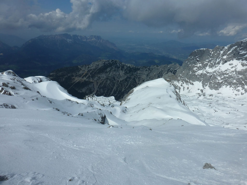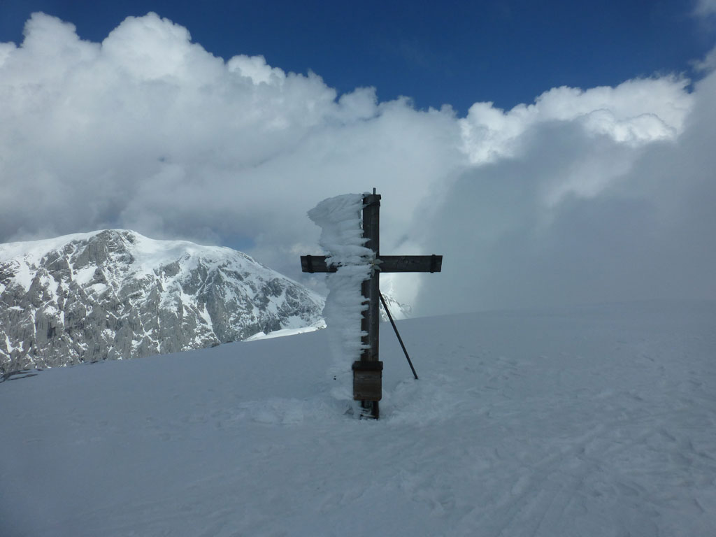 Als ich bei der Abfahrt durch die Umgäng unterhalb der breiten Rinne in Richtung Hohes Brett ankam, entschied ich mich kurzerhand für den erneuten Aufstieg. Die Bedingungen waren noch immer tadellos, und nach einer knappen Stunde schweißtreibendem Spuren stand ich vor dem Gipfelkreuz des Hohen Bretts mit Blick auf die Göll-Westwand. Abermals nach einer kleinen Pause trat ich zufrieden mit diesem gelungenen Tourentag die äußerst genussvolle Abfahrt bis zum letzten Fleckchen Schnee an.