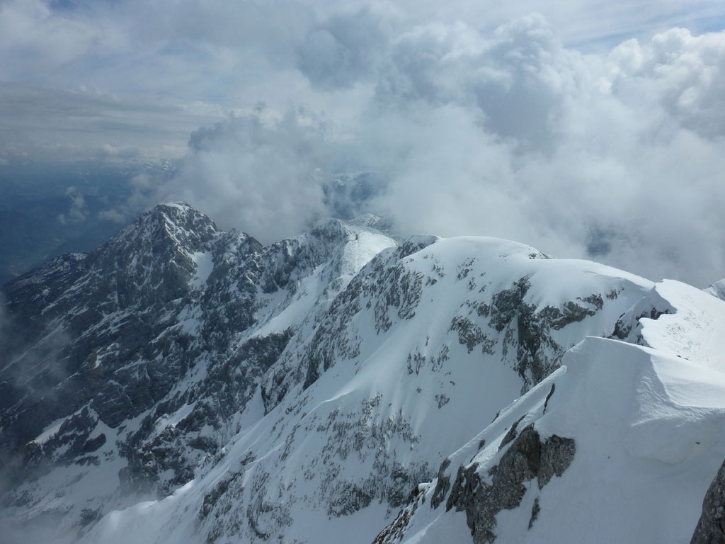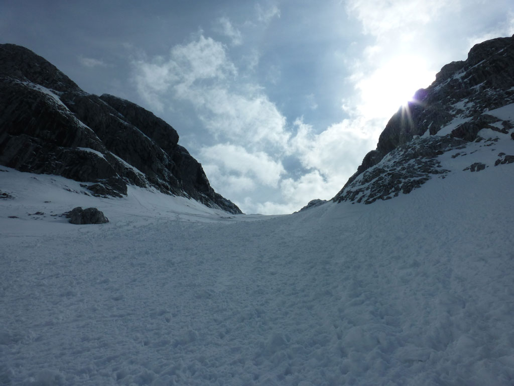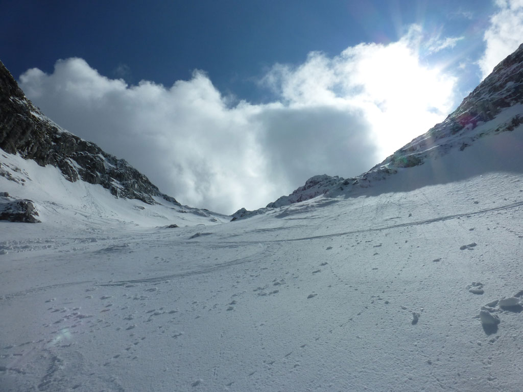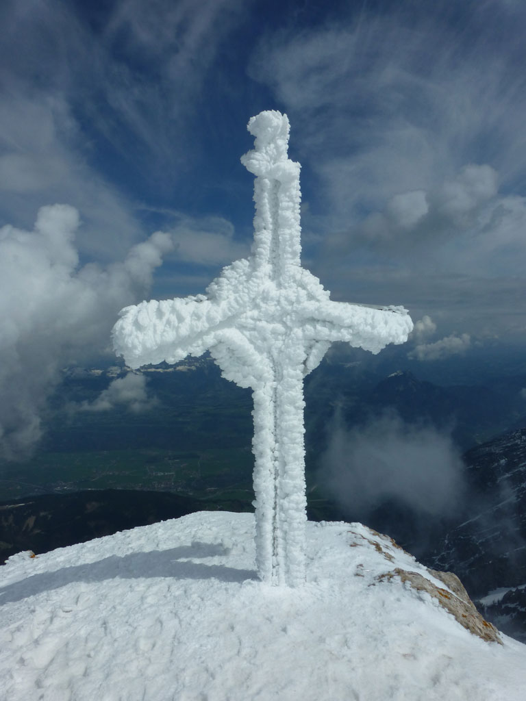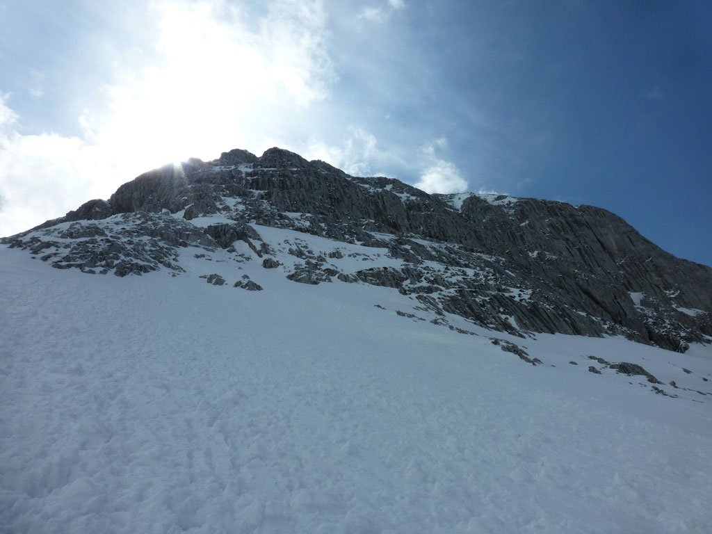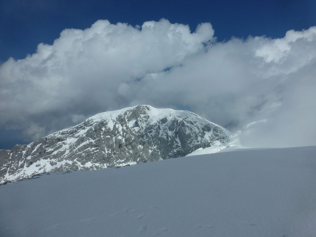 Als ich bei der Abfahrt durch die Umgäng unterhalb der breiten Rinne in Richtung Hohes Brett ankam, entschied ich mich kurzerhand für den erneuten Aufstieg. Die Bedingungen waren noch immer tadellos, und nach einer knappen Stunde schweißtreibendem Spuren stand ich vor dem Gipfelkreuz des Hohen Bretts mit Blick auf die Göll-Westwand. Abermals nach einer kleinen Pause trat ich zufrieden mit diesem gelungenen Tourentag die äußerst genussvolle Abfahrt bis zum letzten Fleckchen Schnee an.